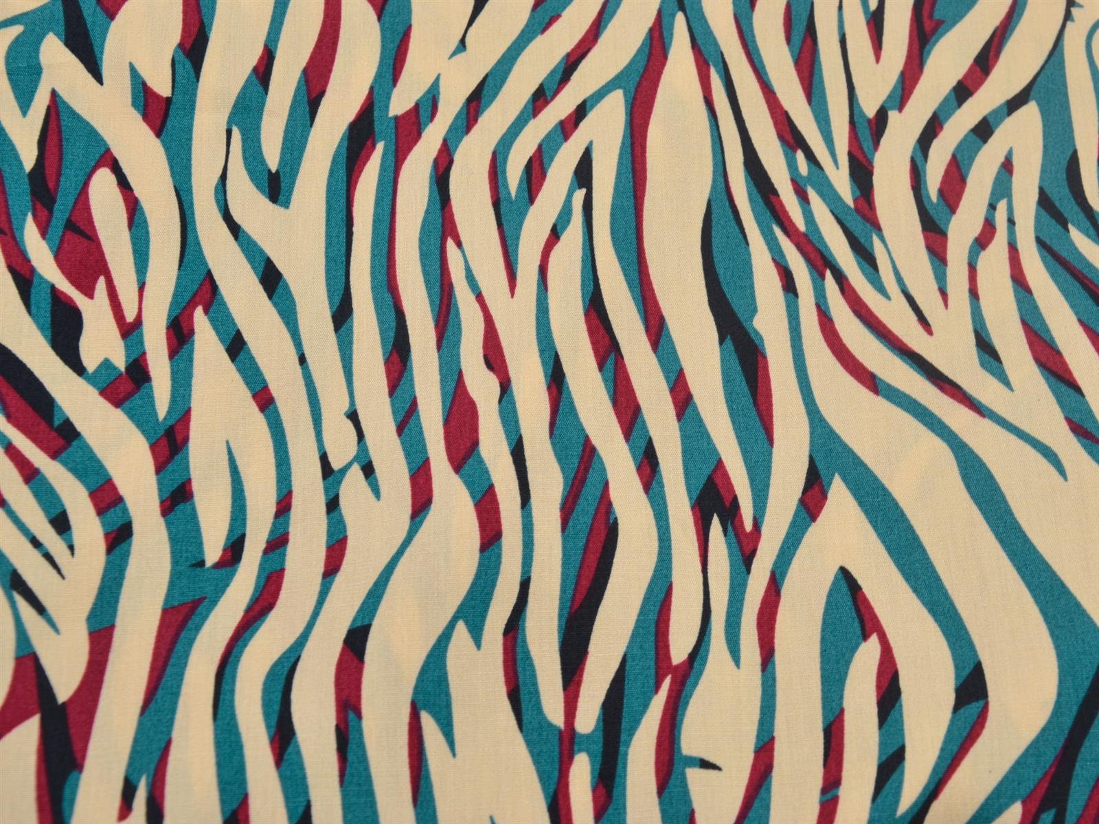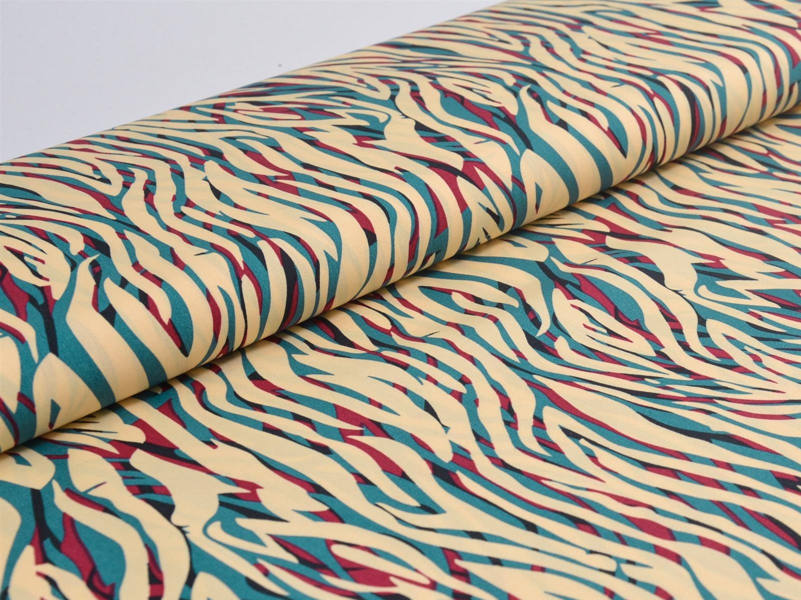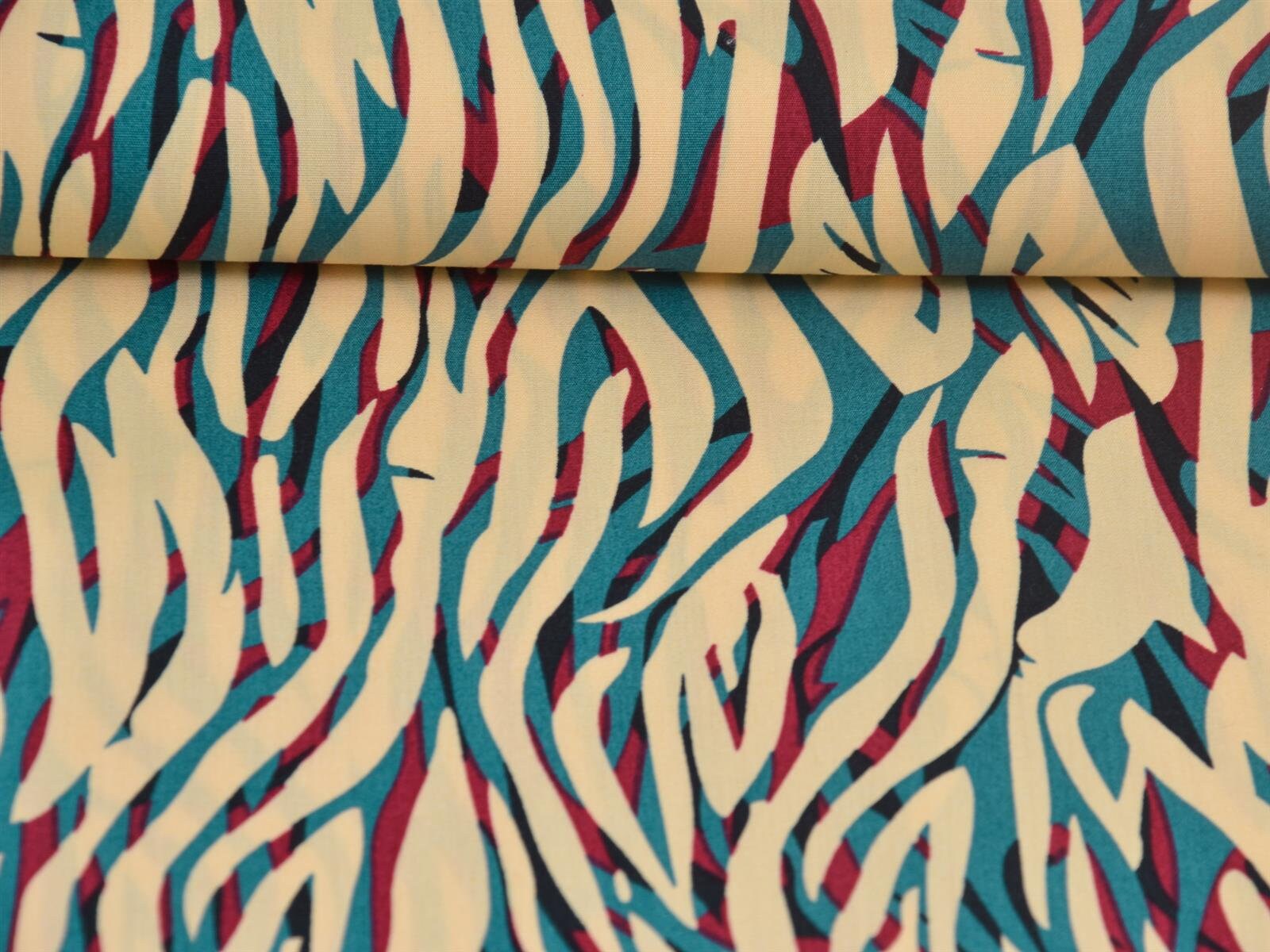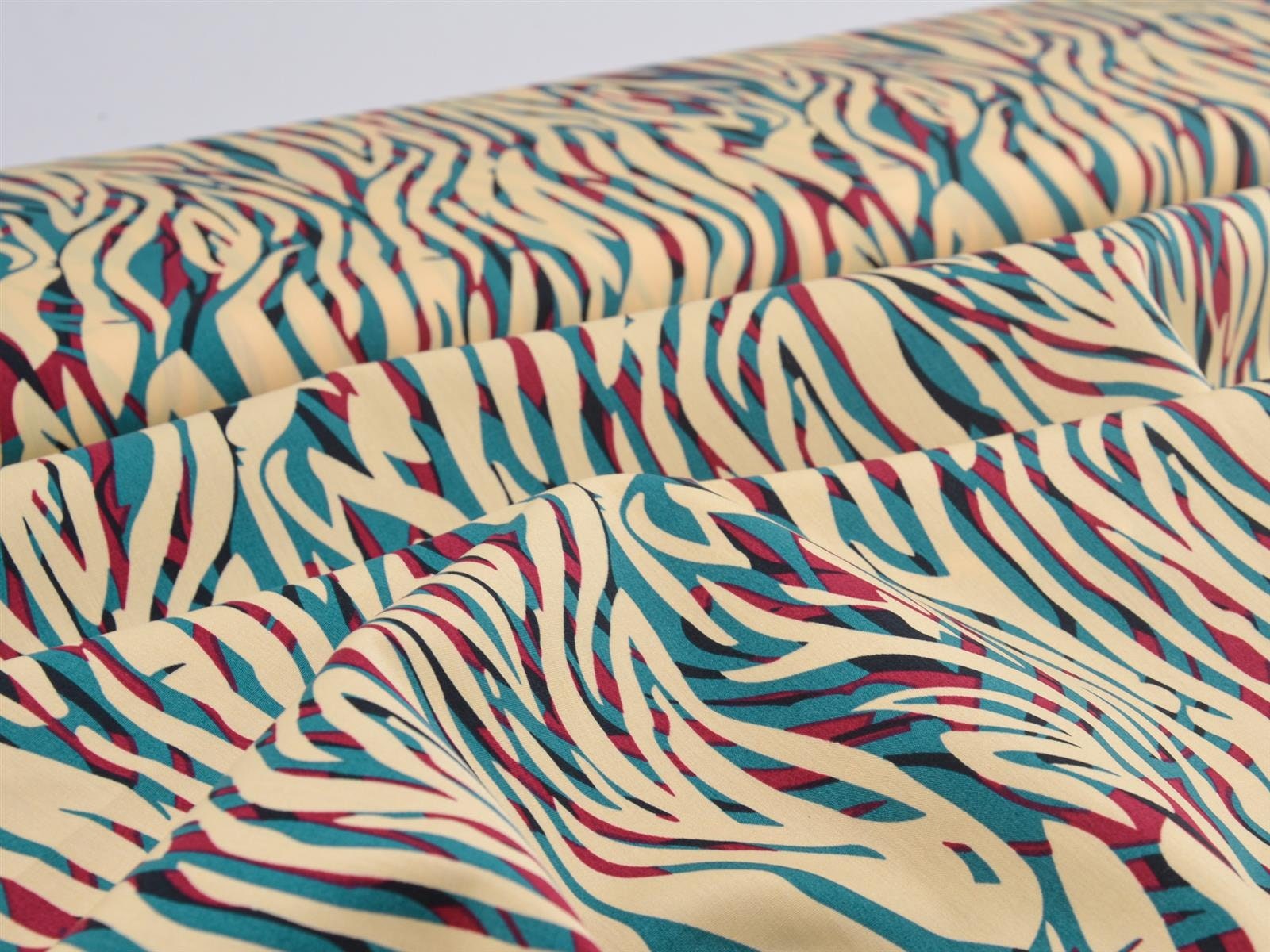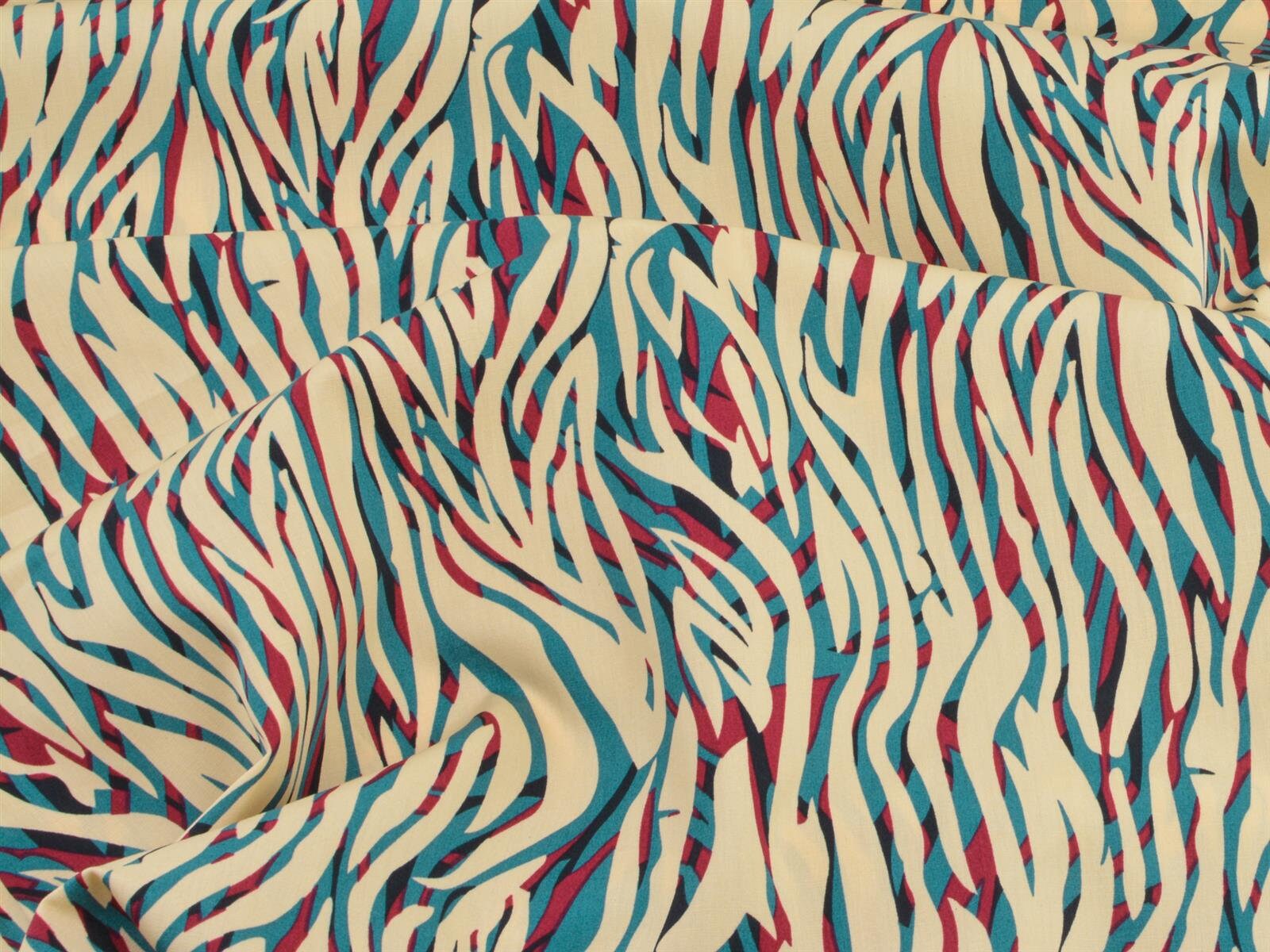 Blusenstoff aus Baumwolle von Fibre Mood. Der Tierprint ist in hellgelb/vanille, petrol und kirschrot gehalten. Es setzt sich aus verschiedenen überlagernden Zebrasteifen zusammen. Der Stoff hat eine matte Optik. Er ist ein wunderbar leichter Blusenstoff, locker luftig und eignet sich deshalb auch für lange Röcke, Kleider, Blusenkleider, fließende Hosen etc. Fibre Mood Modell Josephine.