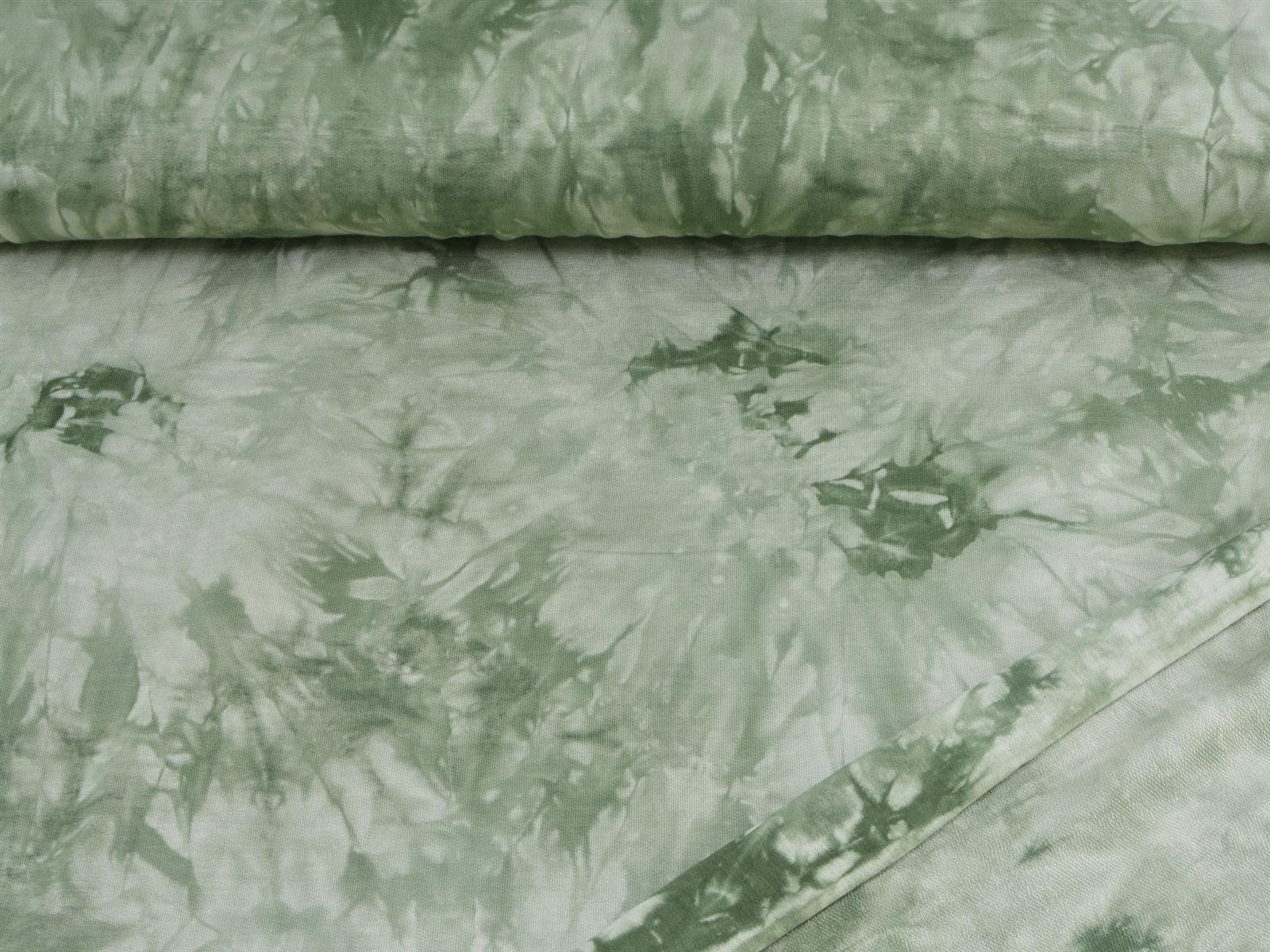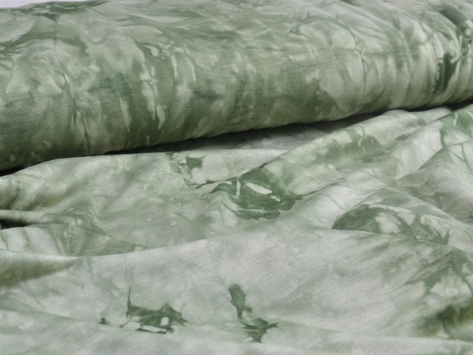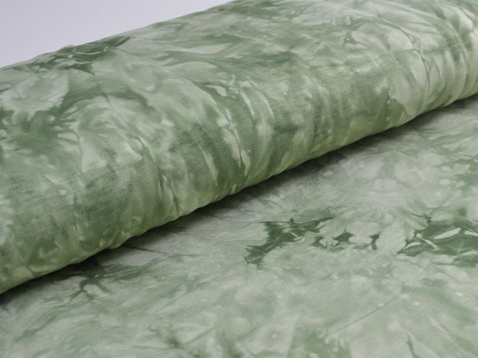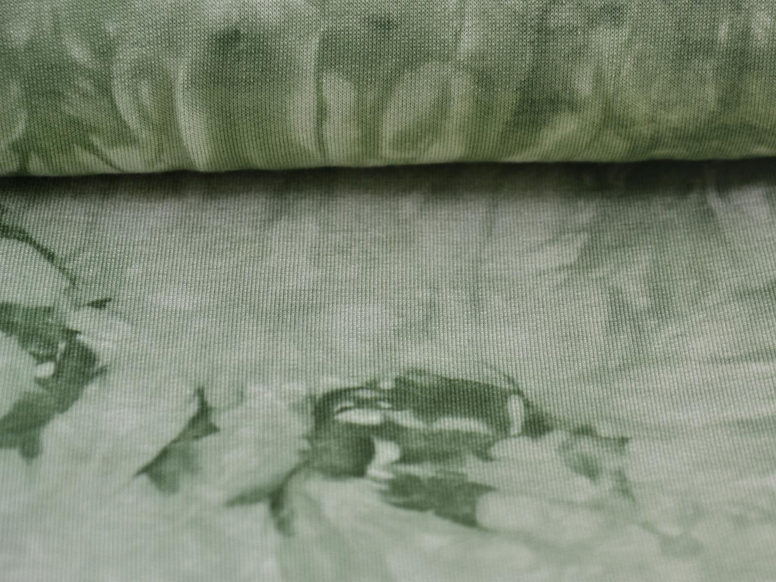 Jersey aus Baumwolle und Elasthan mit grünem Batikmuster. Ganz weicher, fließender Viskose Jersey mit angerauter linken Seite. Der Stoff hat eine matte Optik, einen weichen Griff. Er eignet sich wunderbar für Shirts, Kleider, Röcke, als Futter für warme Mäntel, etc.