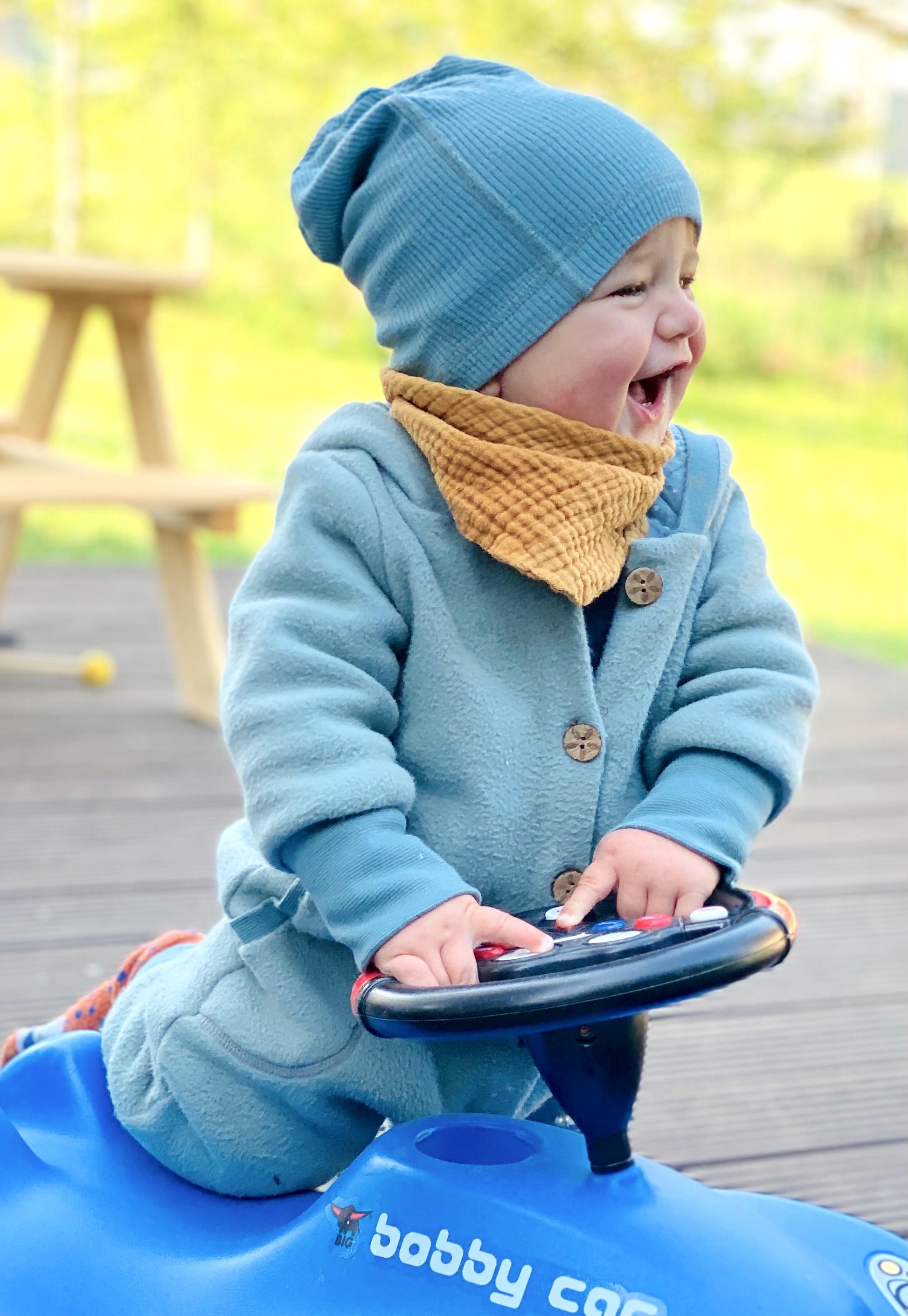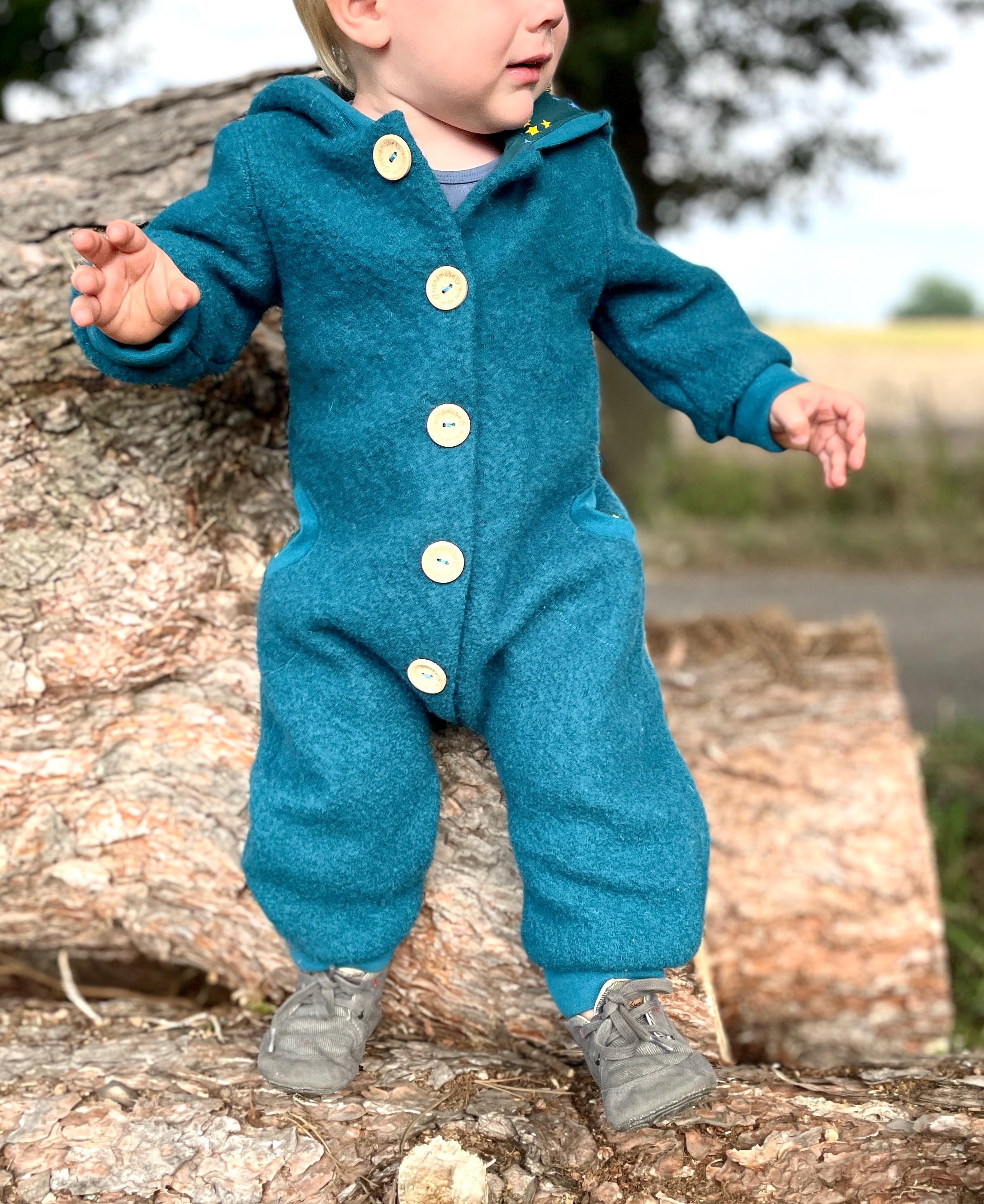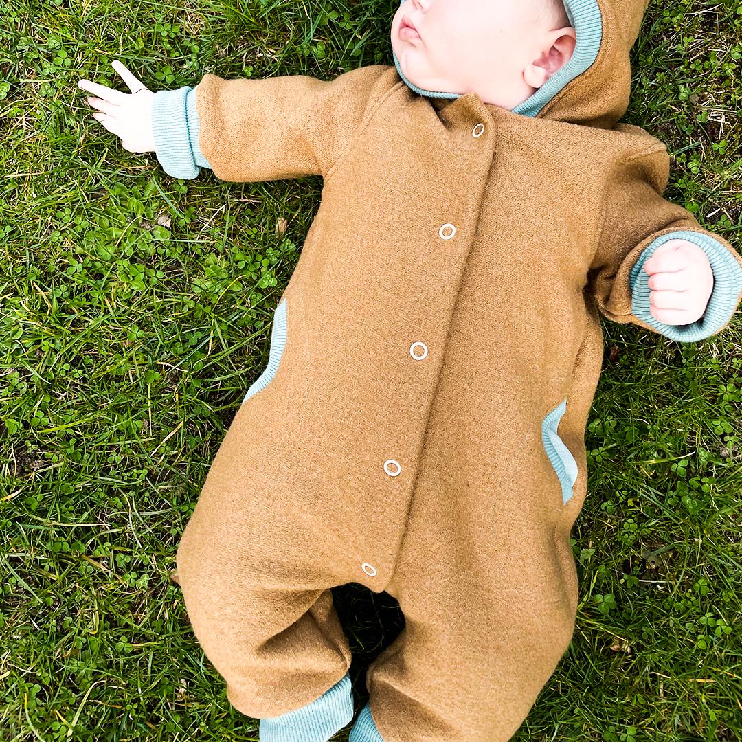 The Jolly Jumper is a lined outdoor suit with a button placket. The pattern can also be sewn from non-stretch fabrics. It is now also suitable for thick fabrics such as boiled wool or coat fabrics. The cuffs on the arms and legs are made of ribbing.