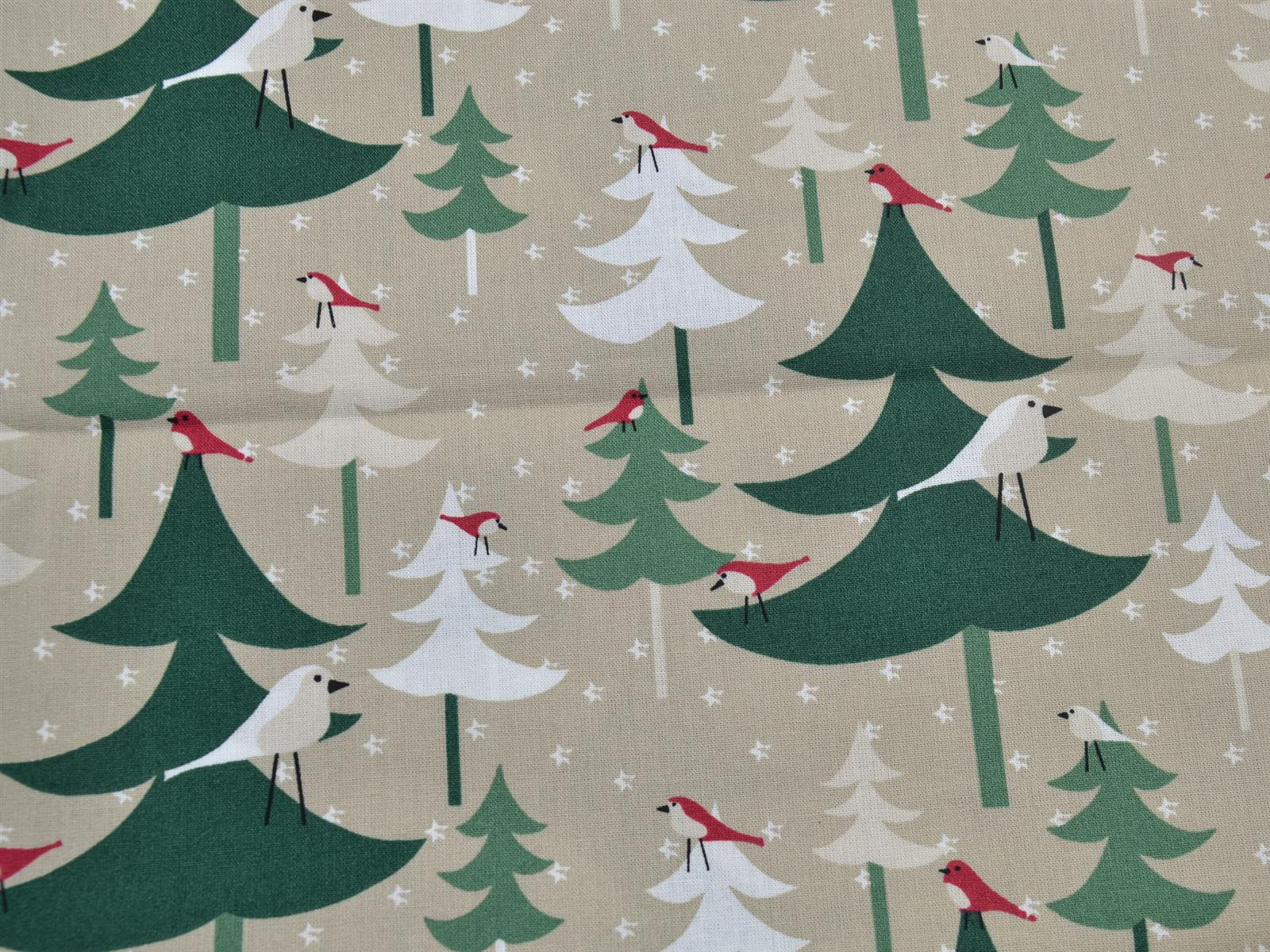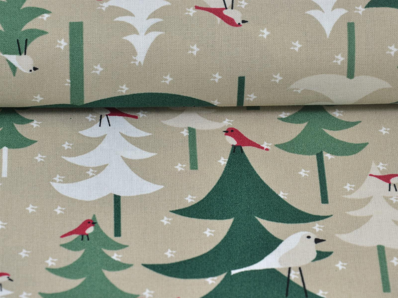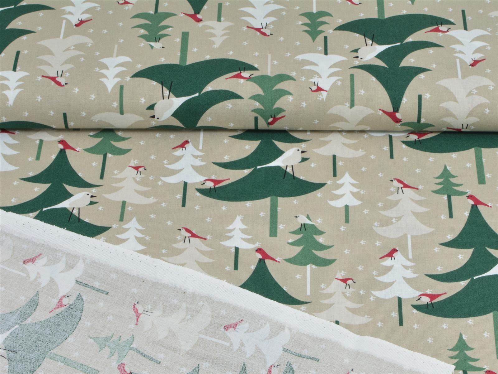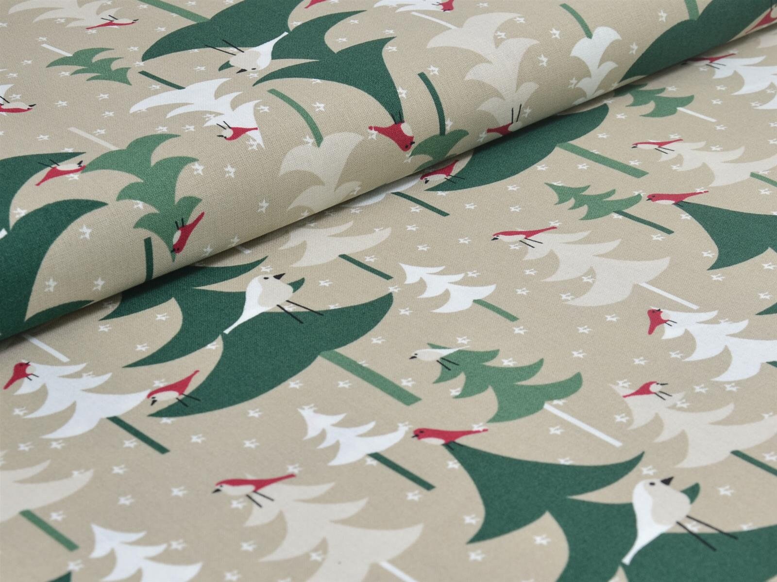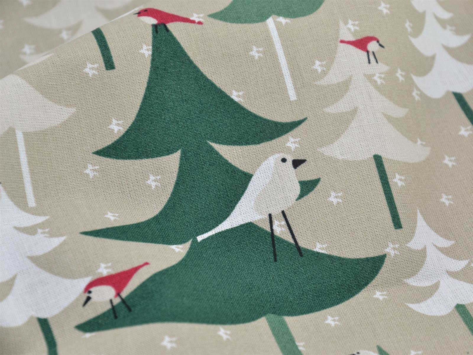 Hochwertiger Baumwollstoff von Westfalenstoffe. Glatter Stoff mit Bäumen, Vögeln und Schnee. Für Taschen, Kissen, Schürzen und vieles mehr.