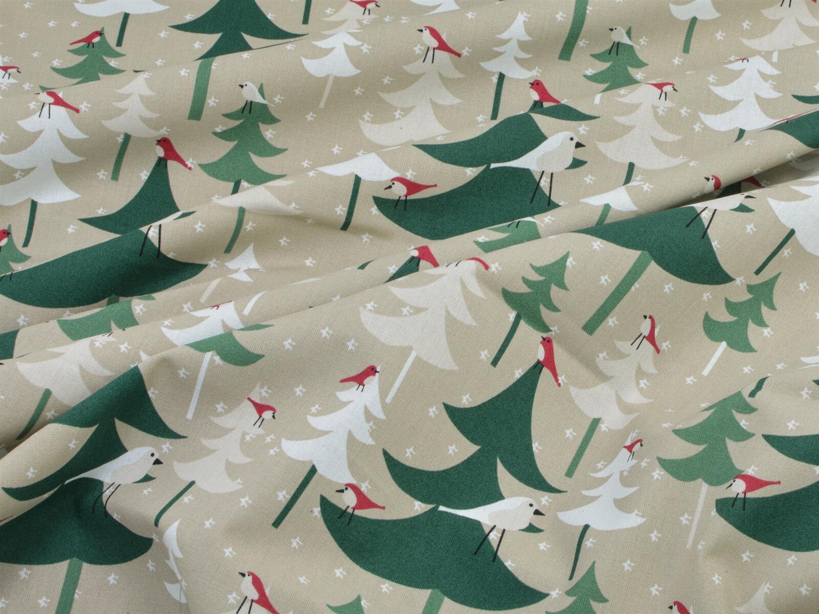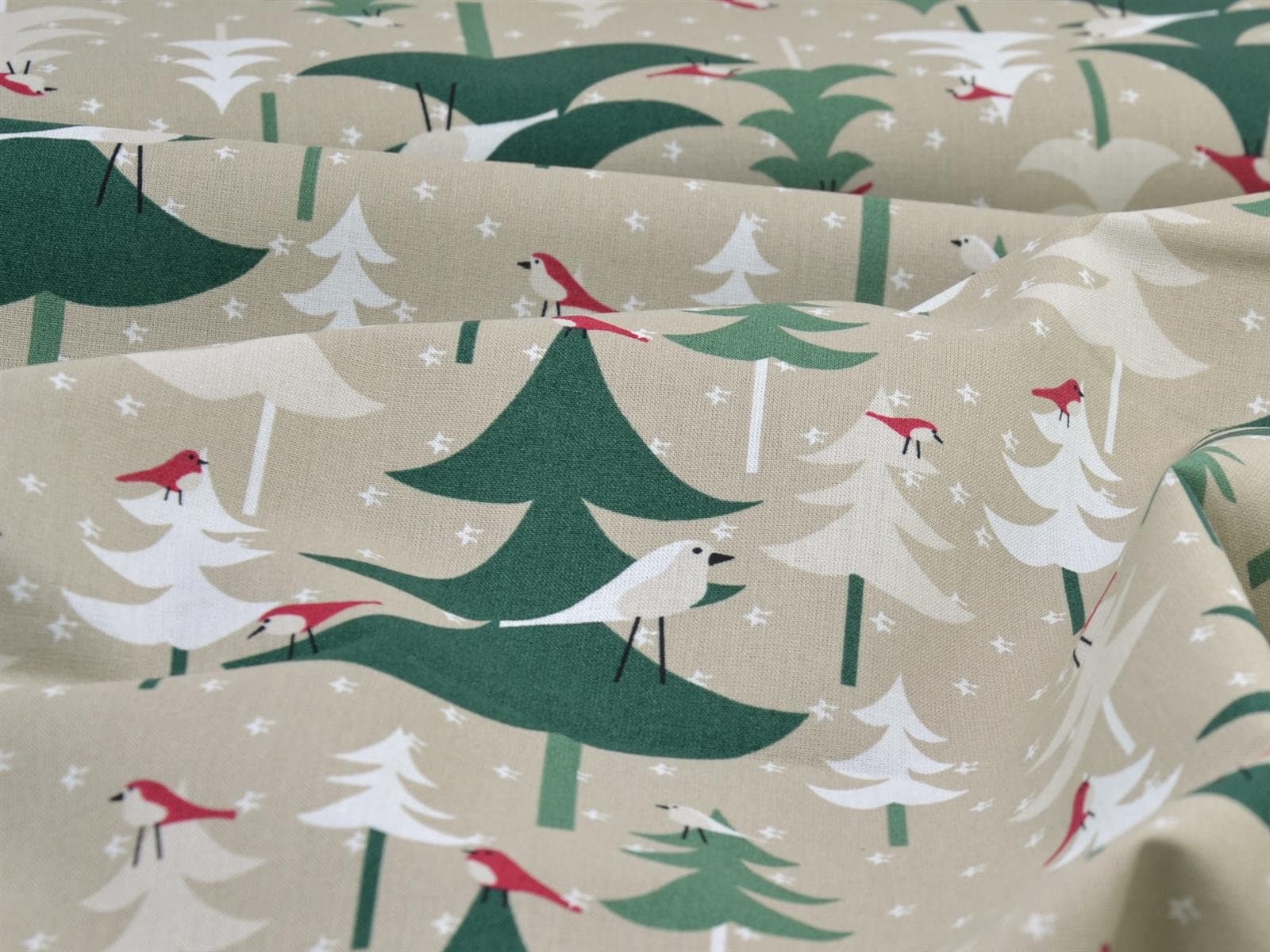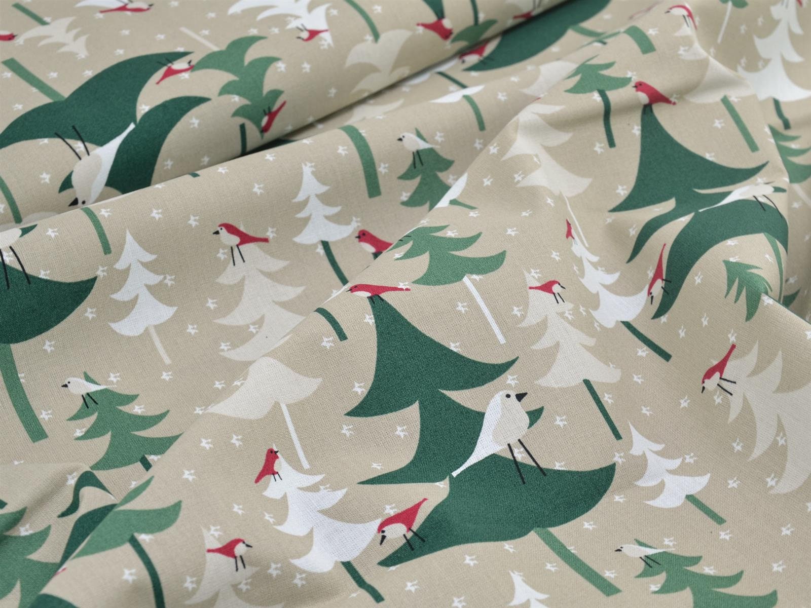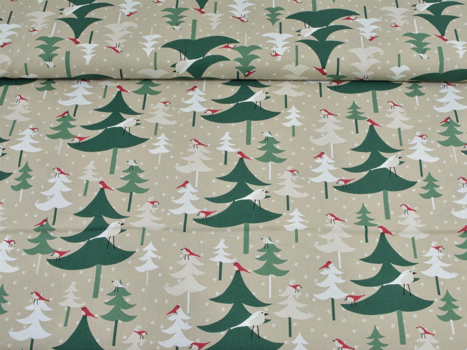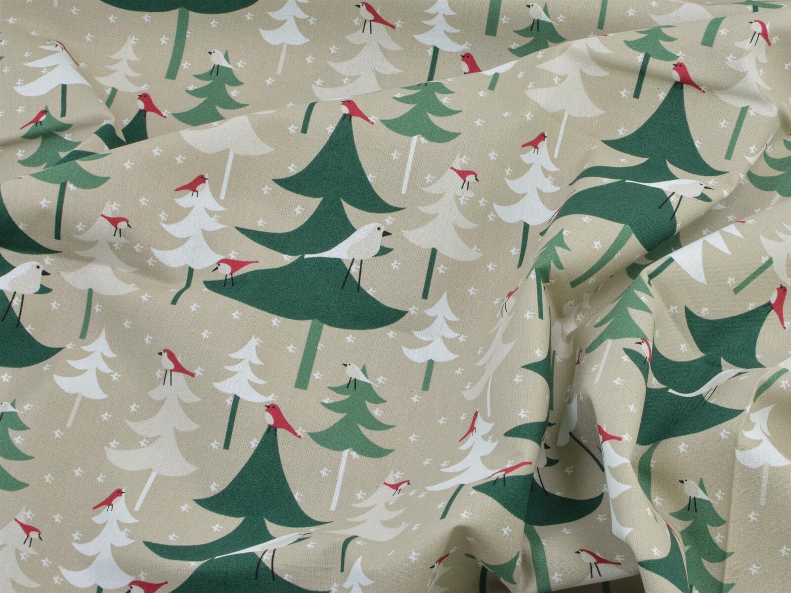 Hochwertiger Baumwollstoff von Westfalenstoffe. Glatter Stoff mit Bäumen, Vögeln und Schnee. Für Taschen, Kissen, Schürzen und vieles mehr.