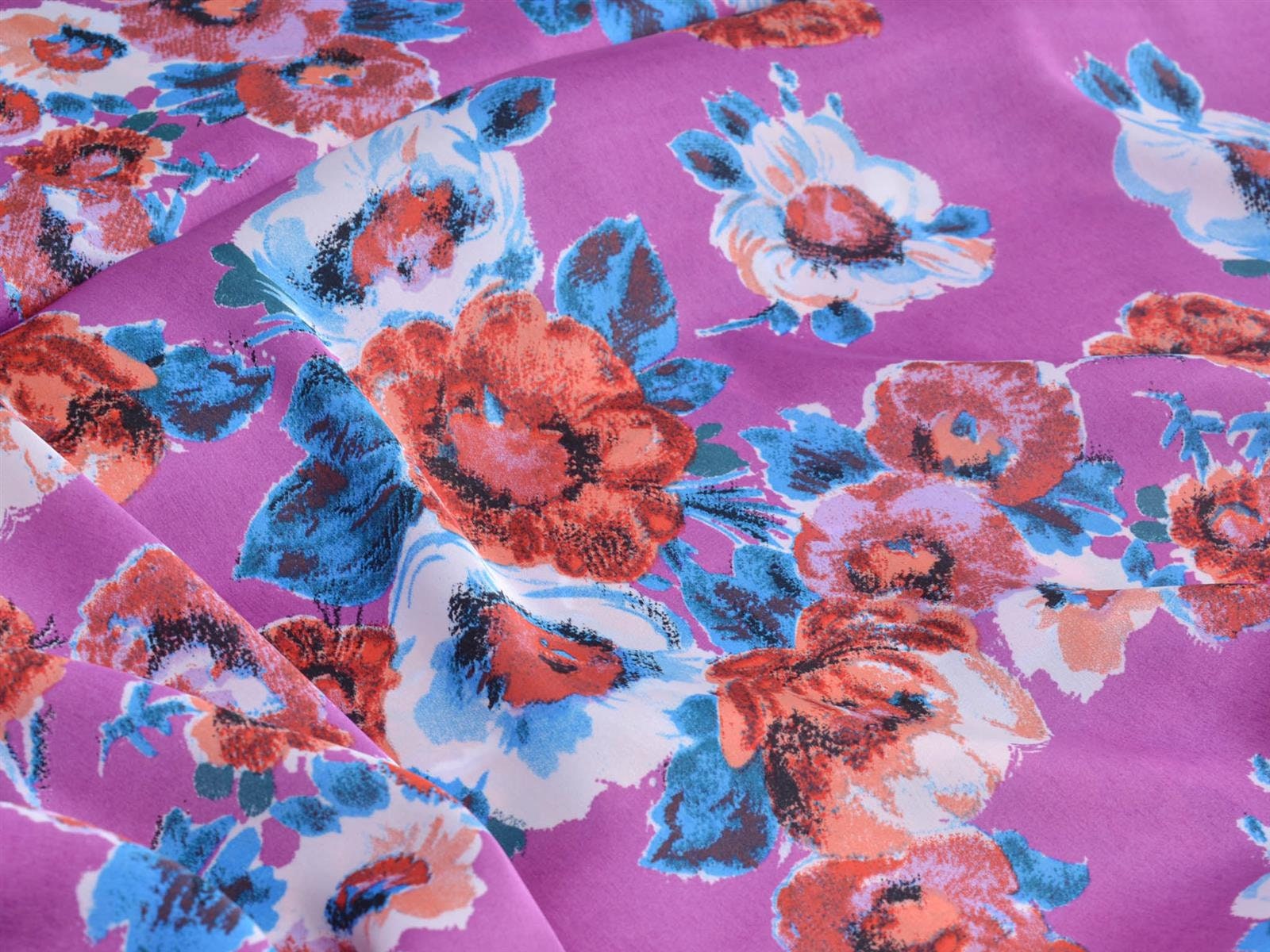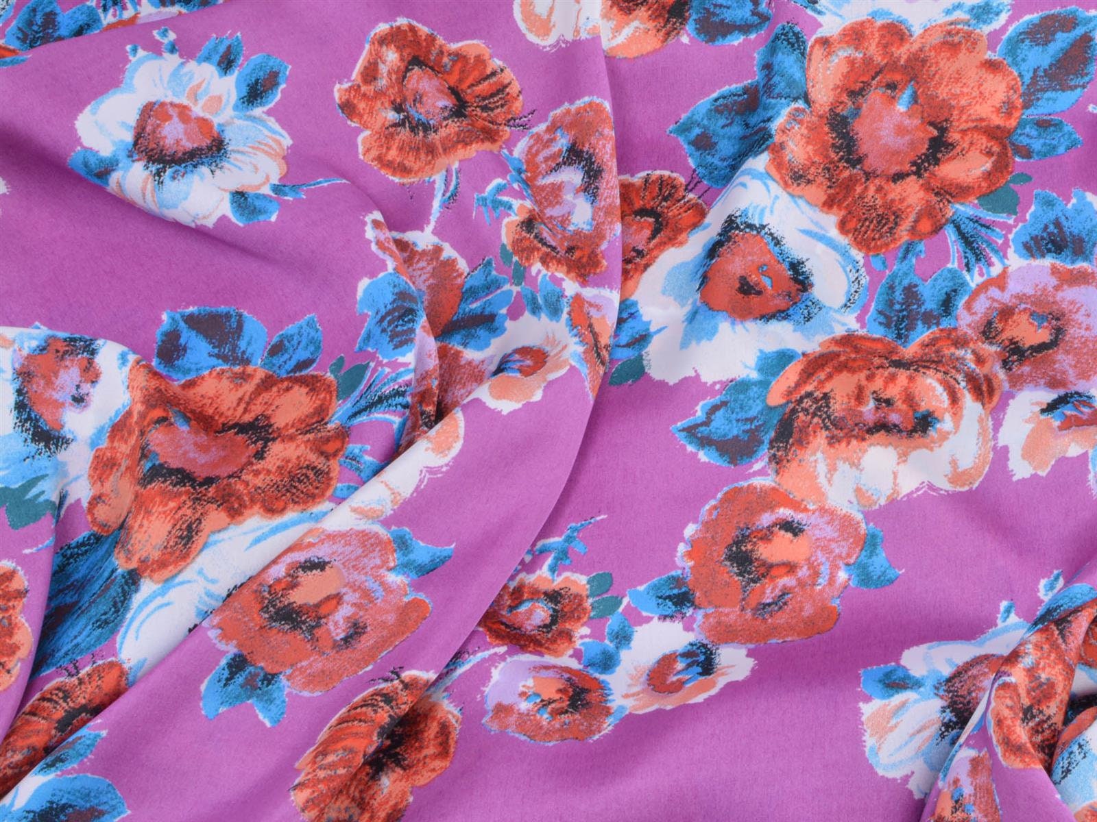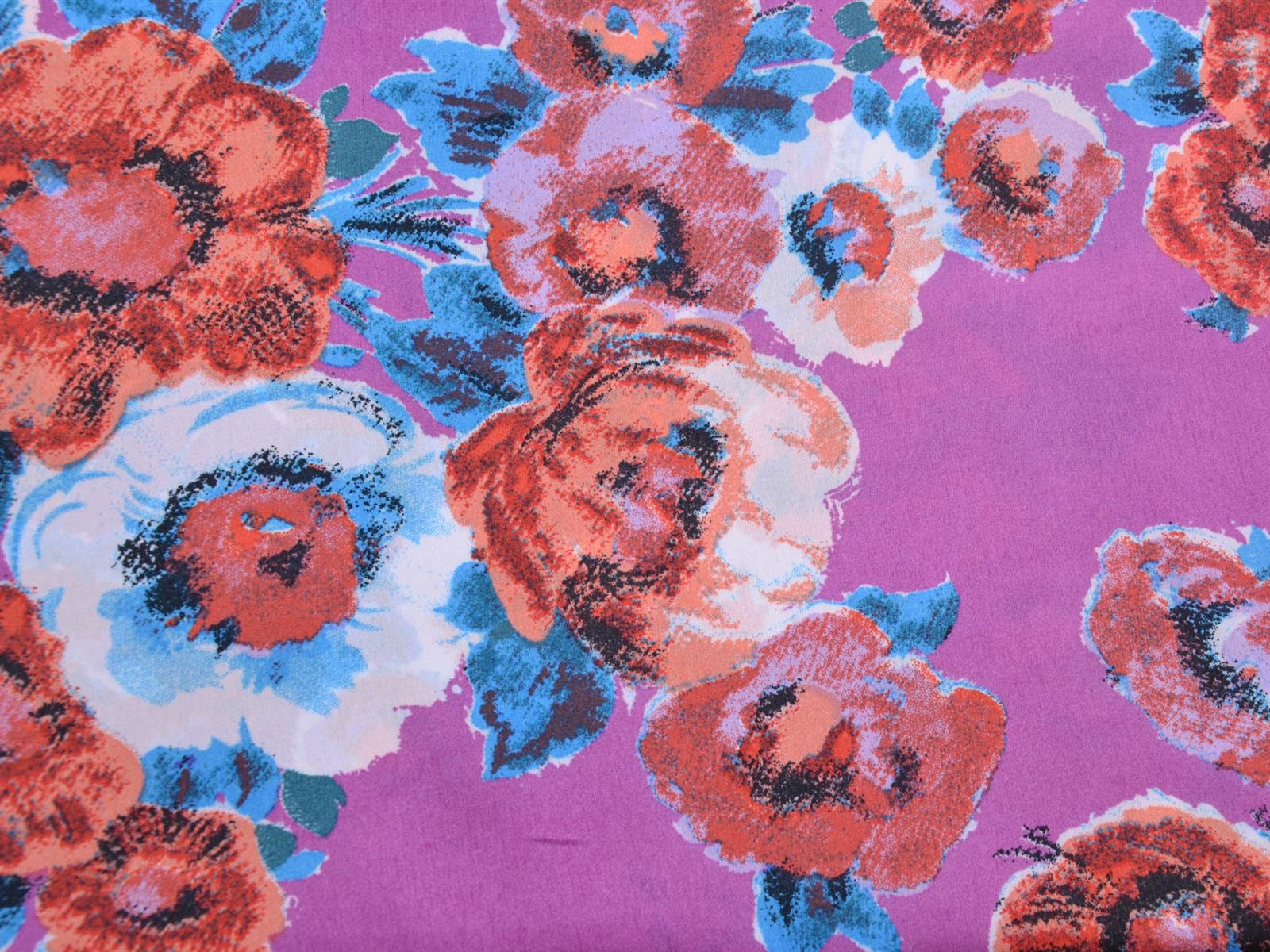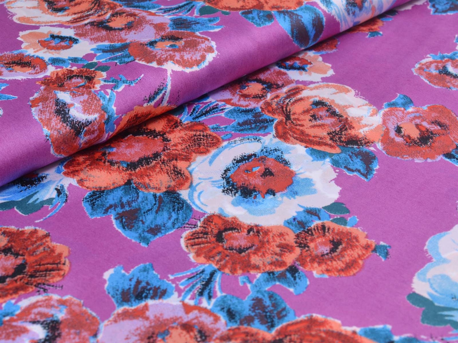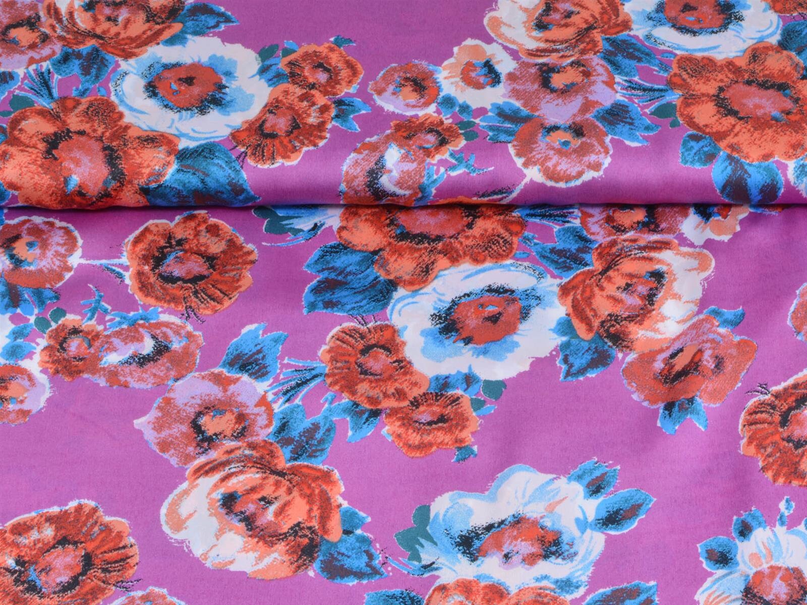 Glänzender Blusenstoff mit großen Blumen. Der Stoff fällt fließend und hat einen glatten, glänzenden Griff. Er eignet sich für Blusen, leichte Kleider und Röcke.