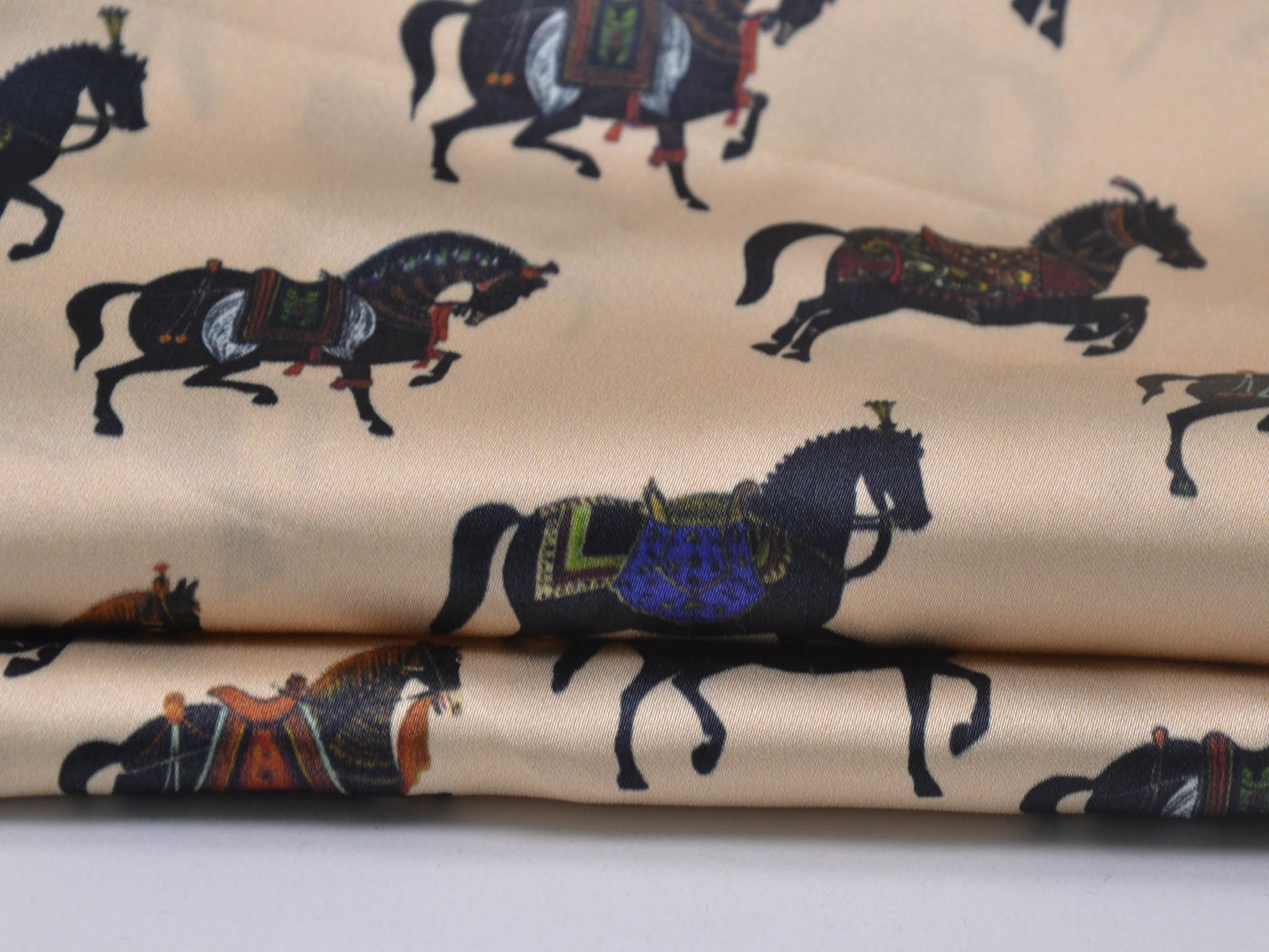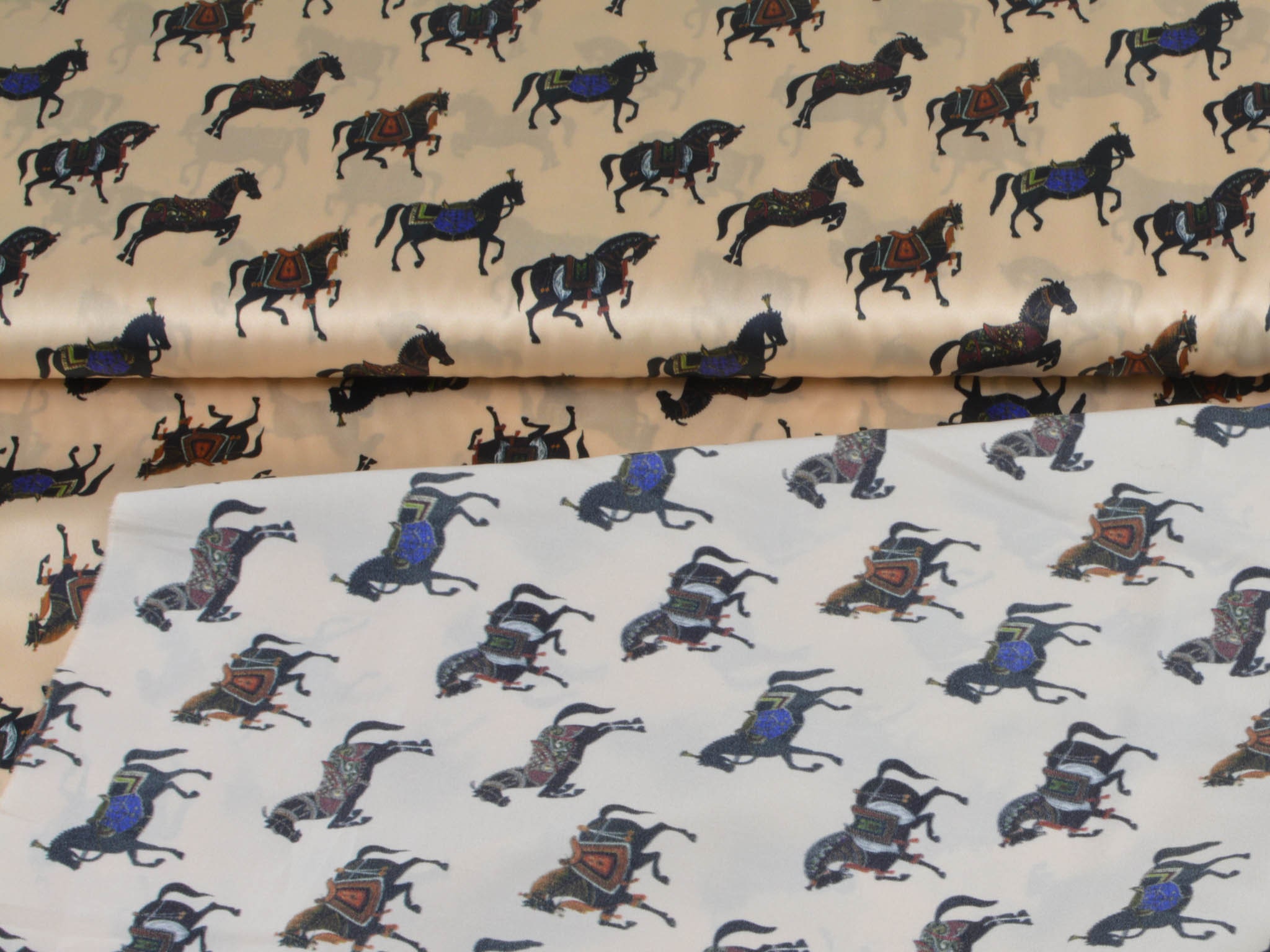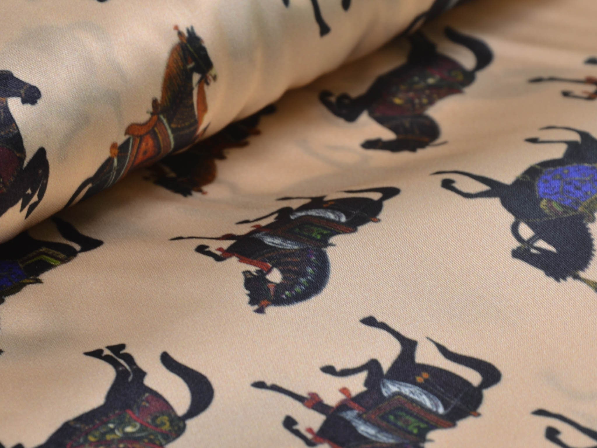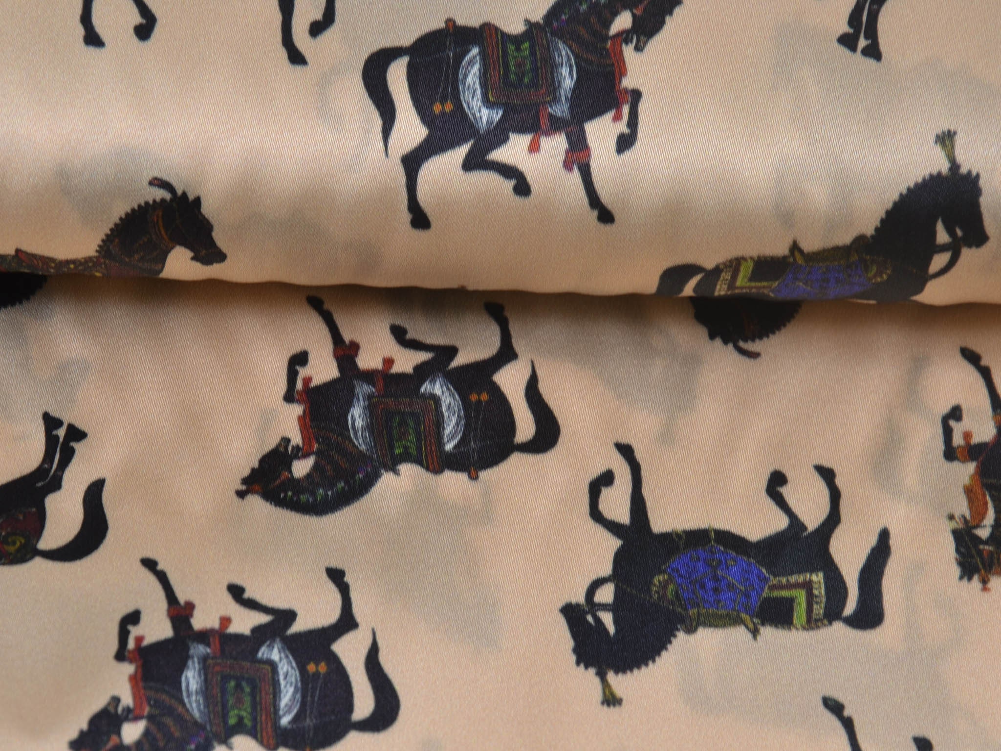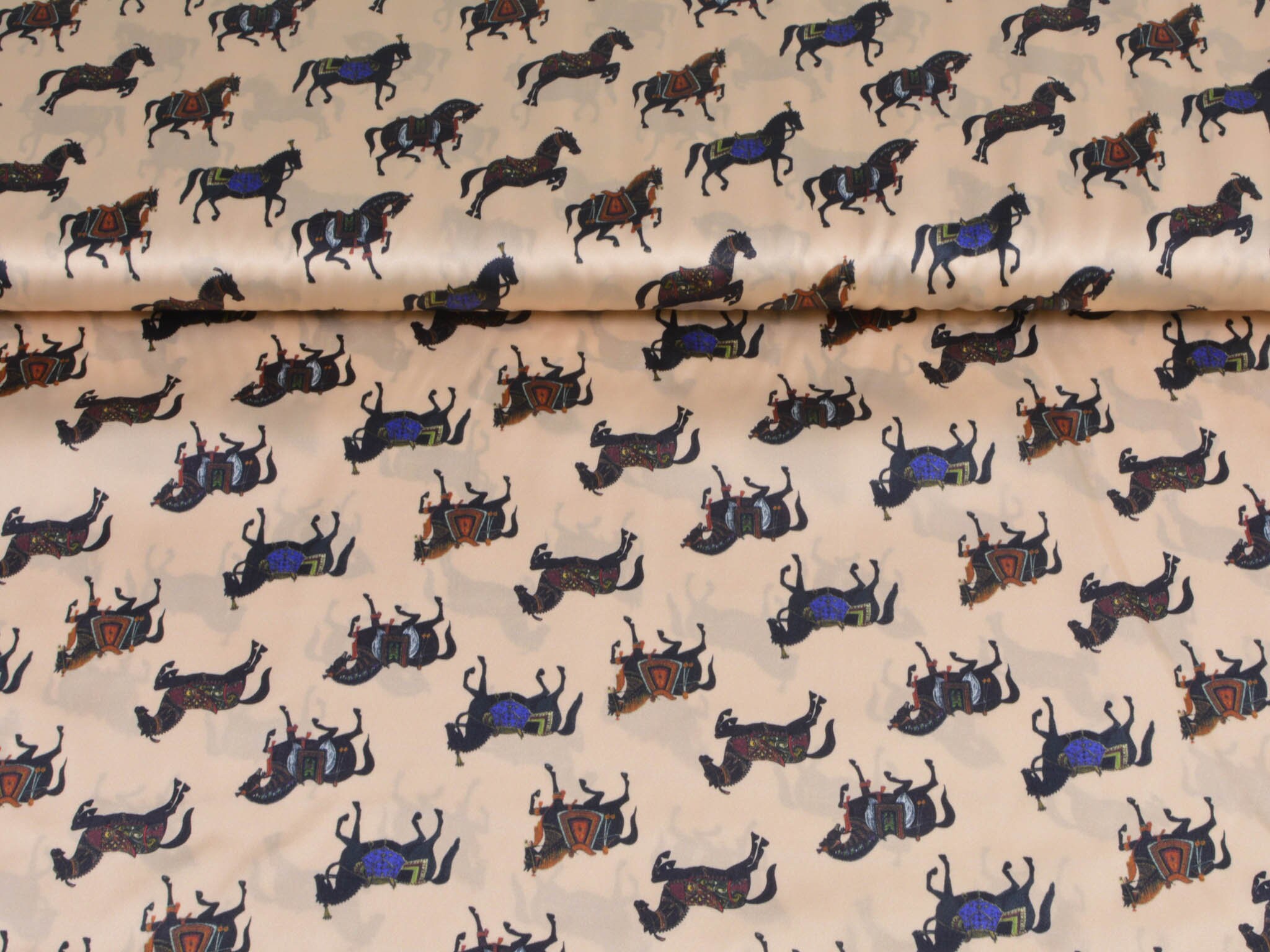 Satinstoff mit Stretch. Zeigt schwarze Pferde mit bunten Sätteln. Super für Blusen, Kleider oder auch zum Füttern von Mänteln und Jacken.