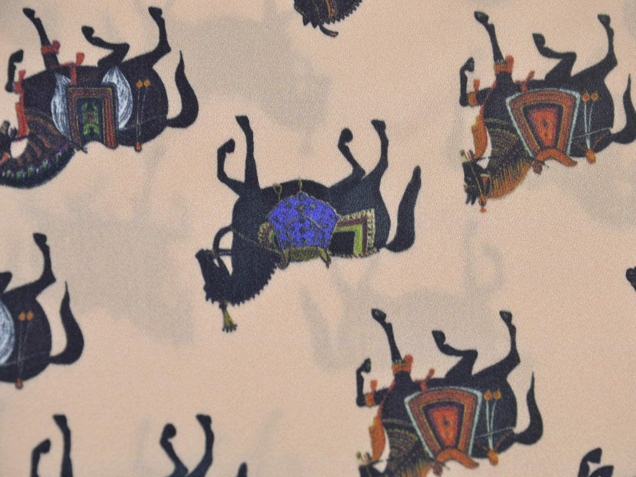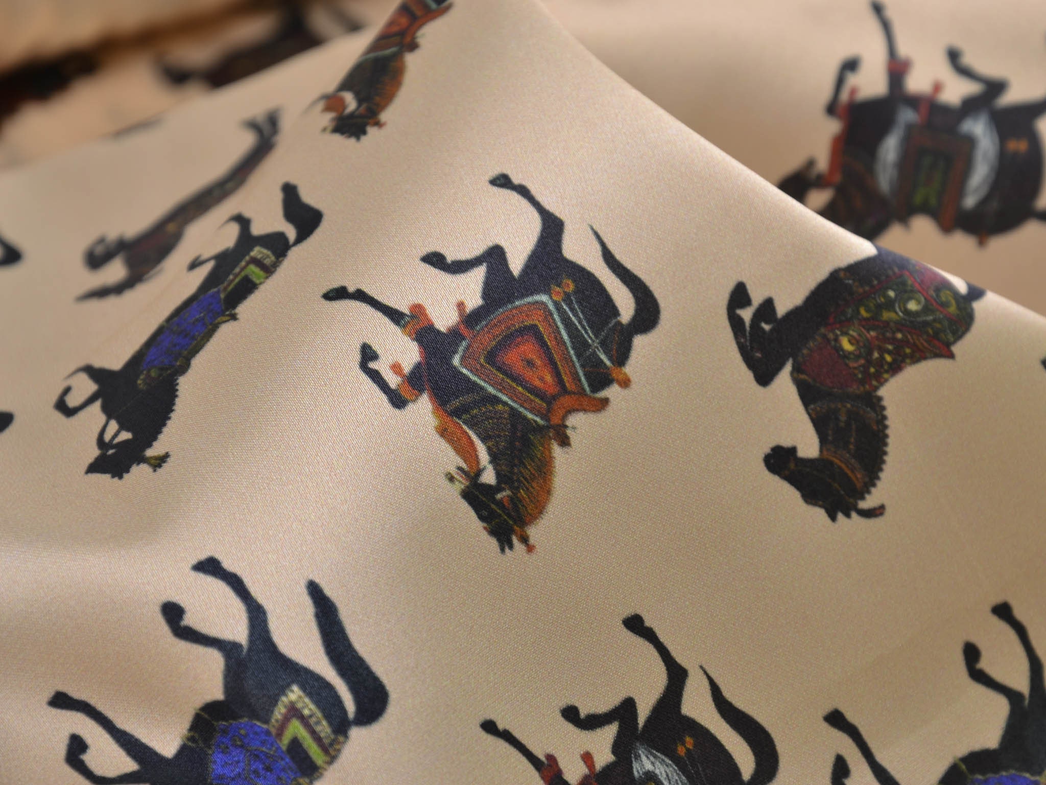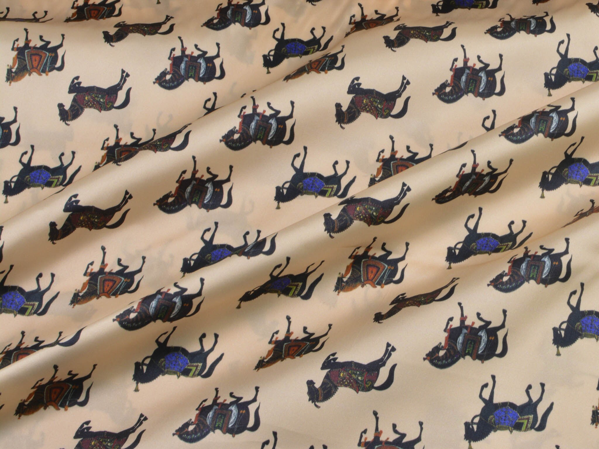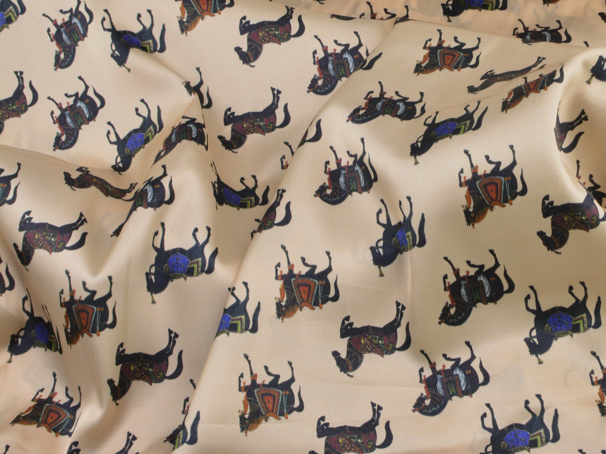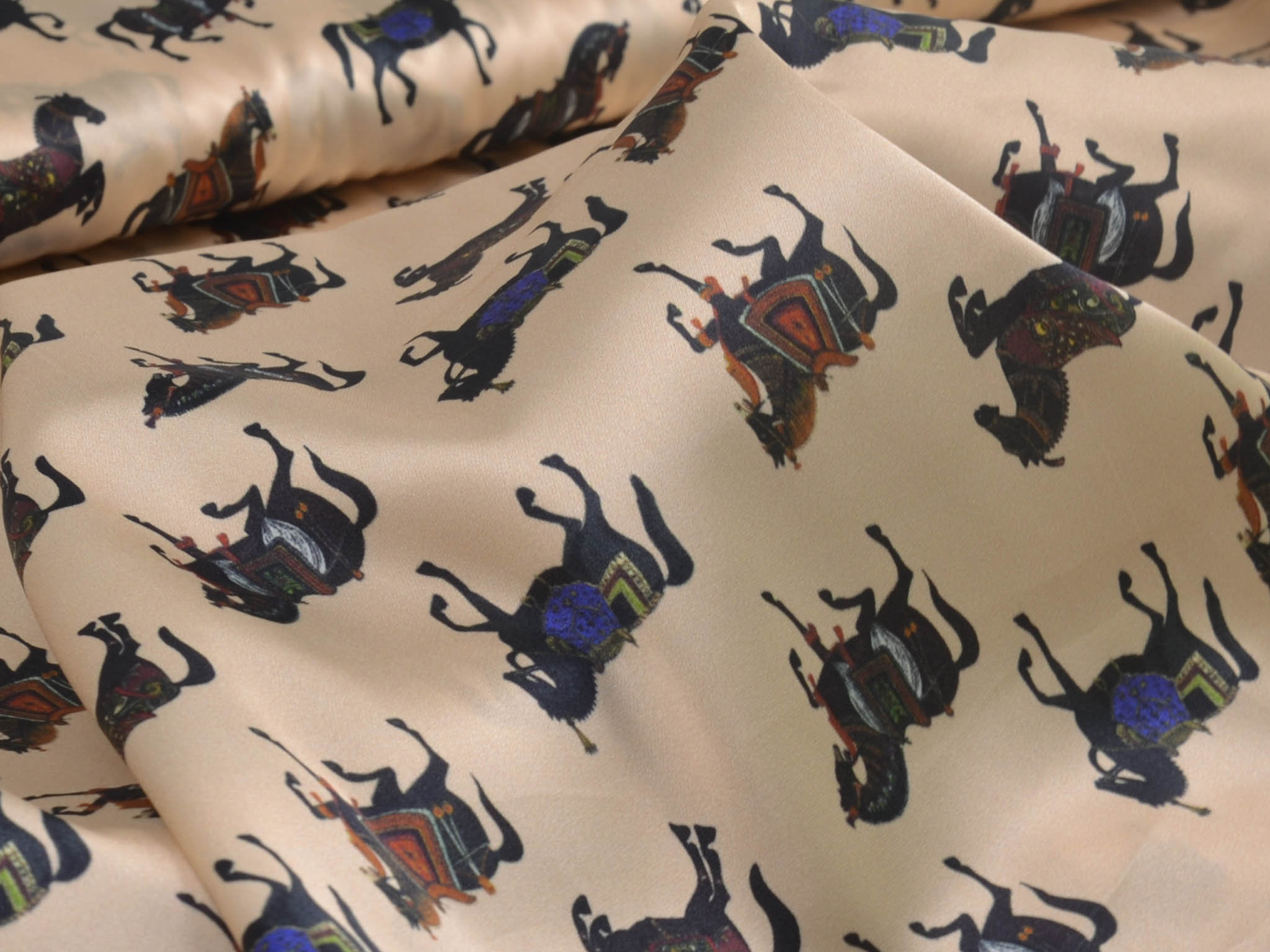 Satinstoff mit Stretch. Zeigt schwarze Pferde mit bunten Sätteln. Super für Blusen, Kleider oder auch zum Füttern von Mänteln und Jacken.