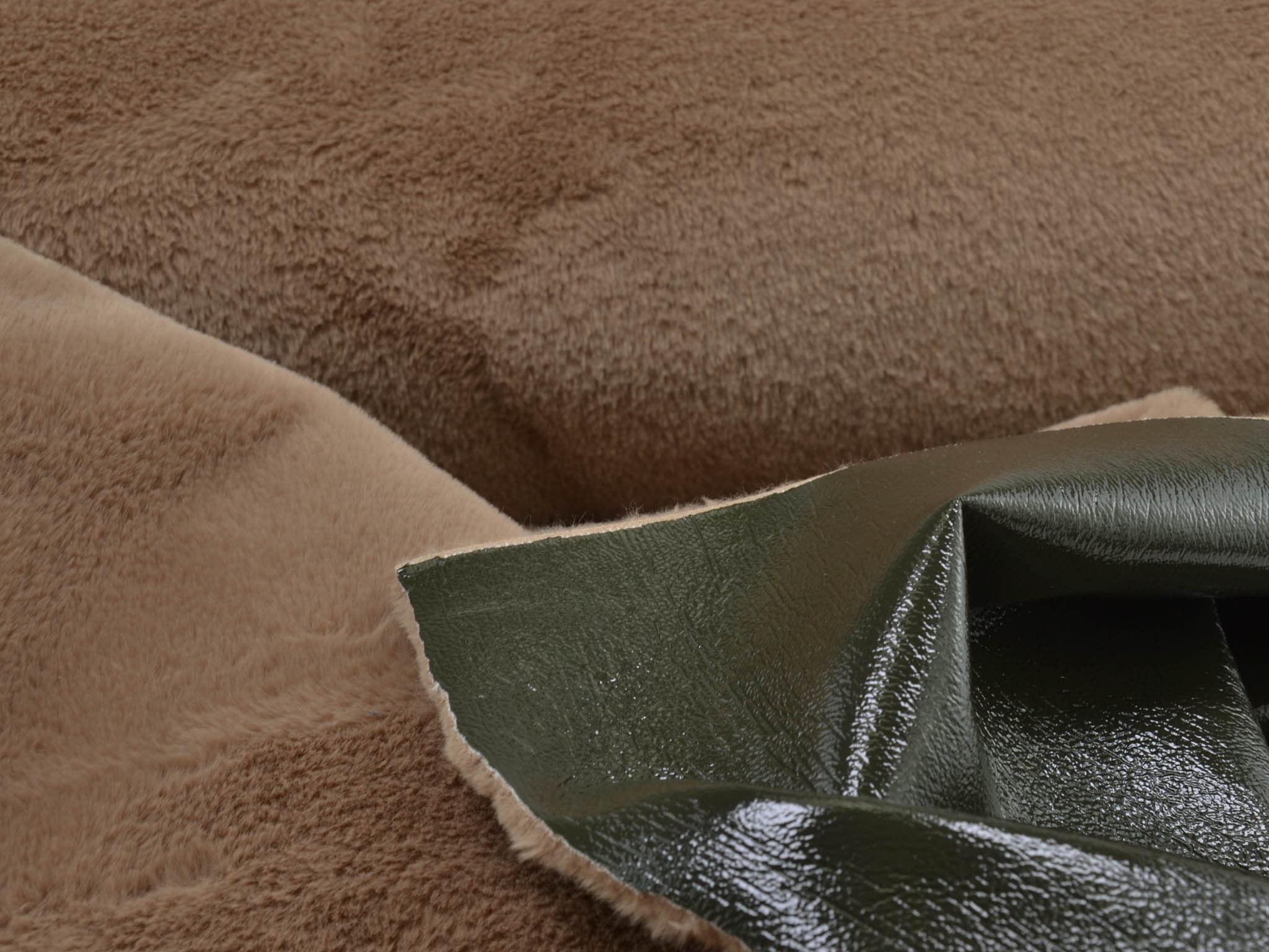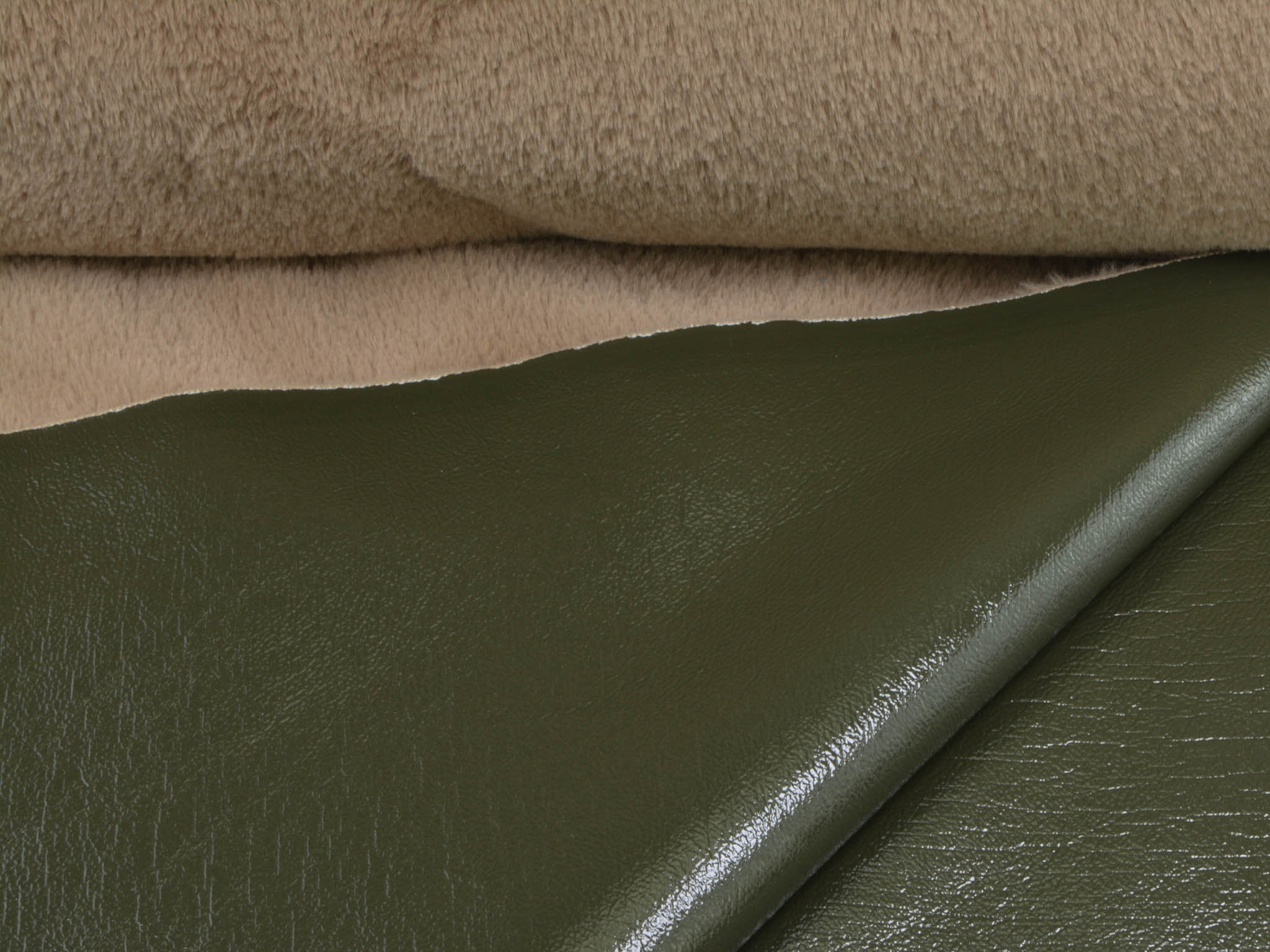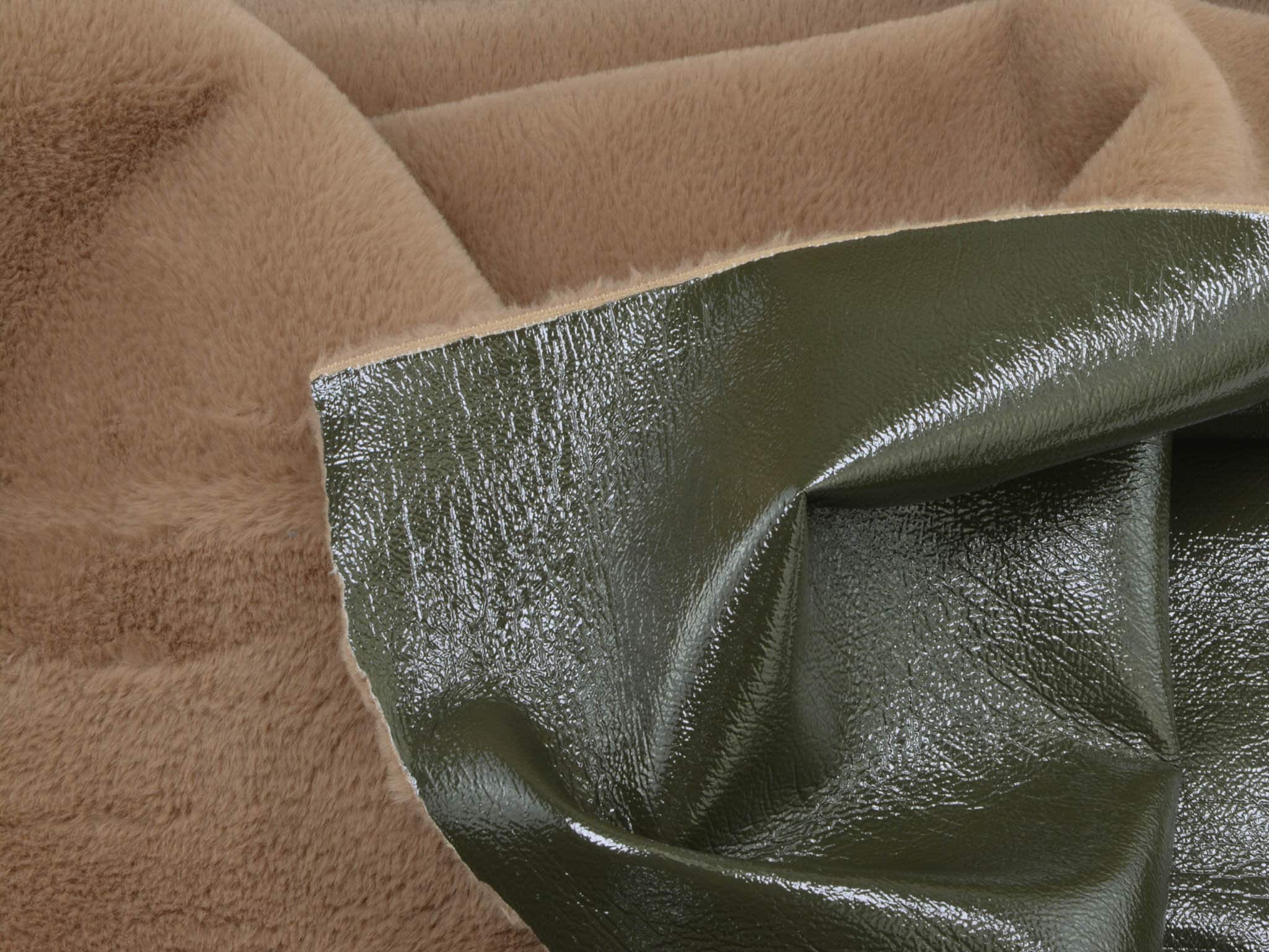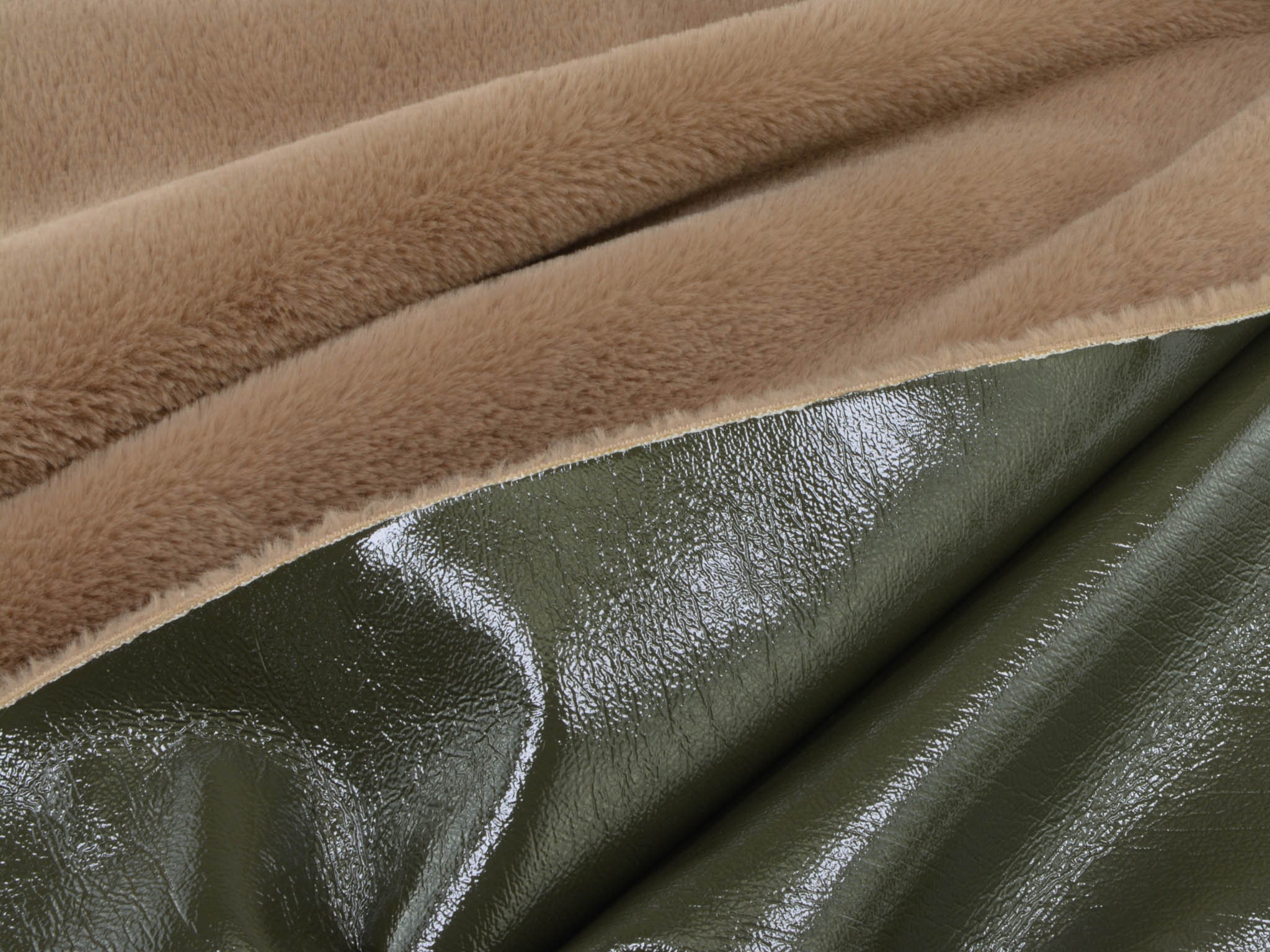 Einzigartiger Doubleface Stoff. Auf der einen Seite ist ein beiger, kuscheliger Teddystoff. Auf der anderen Seite ein glattes, glänzendes Kunstleder in oliv-grün. Der Stoff eignet sich für Jacken, Mäntel und Westen. Das Tolle an dem Stoff ist, dass er kein Futter benötigt, denn er hat ja bereits die Fellseite. Diese empfehlen wir nach Innen zu nähen.