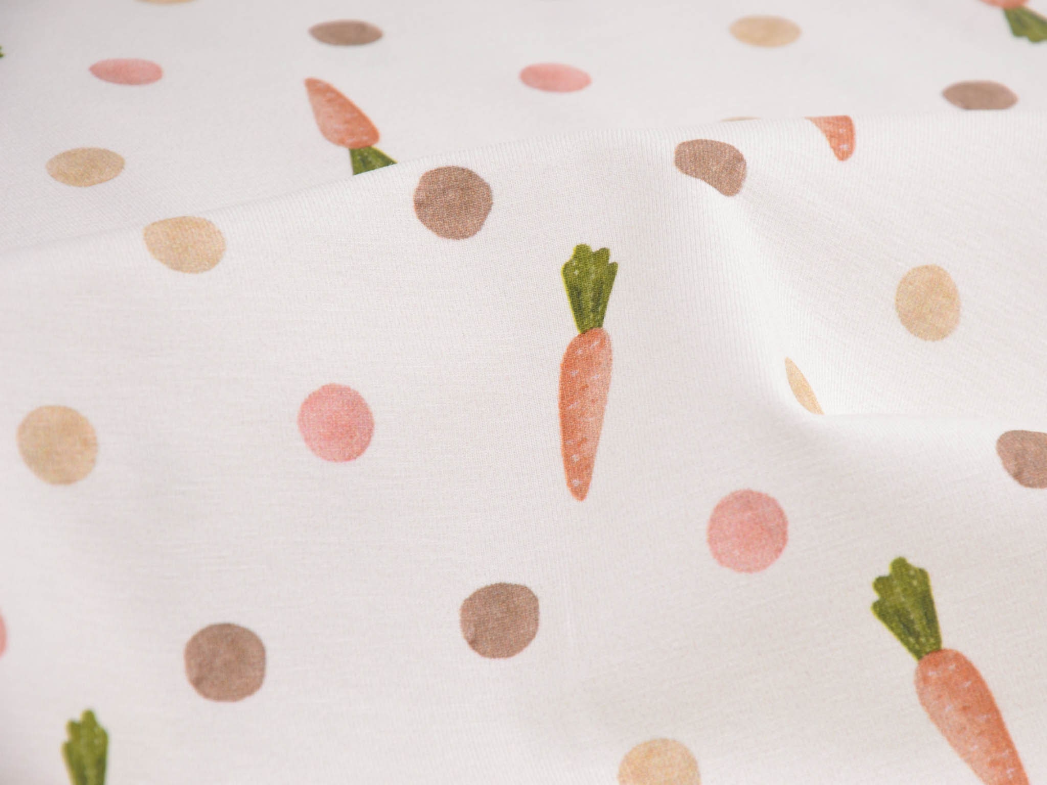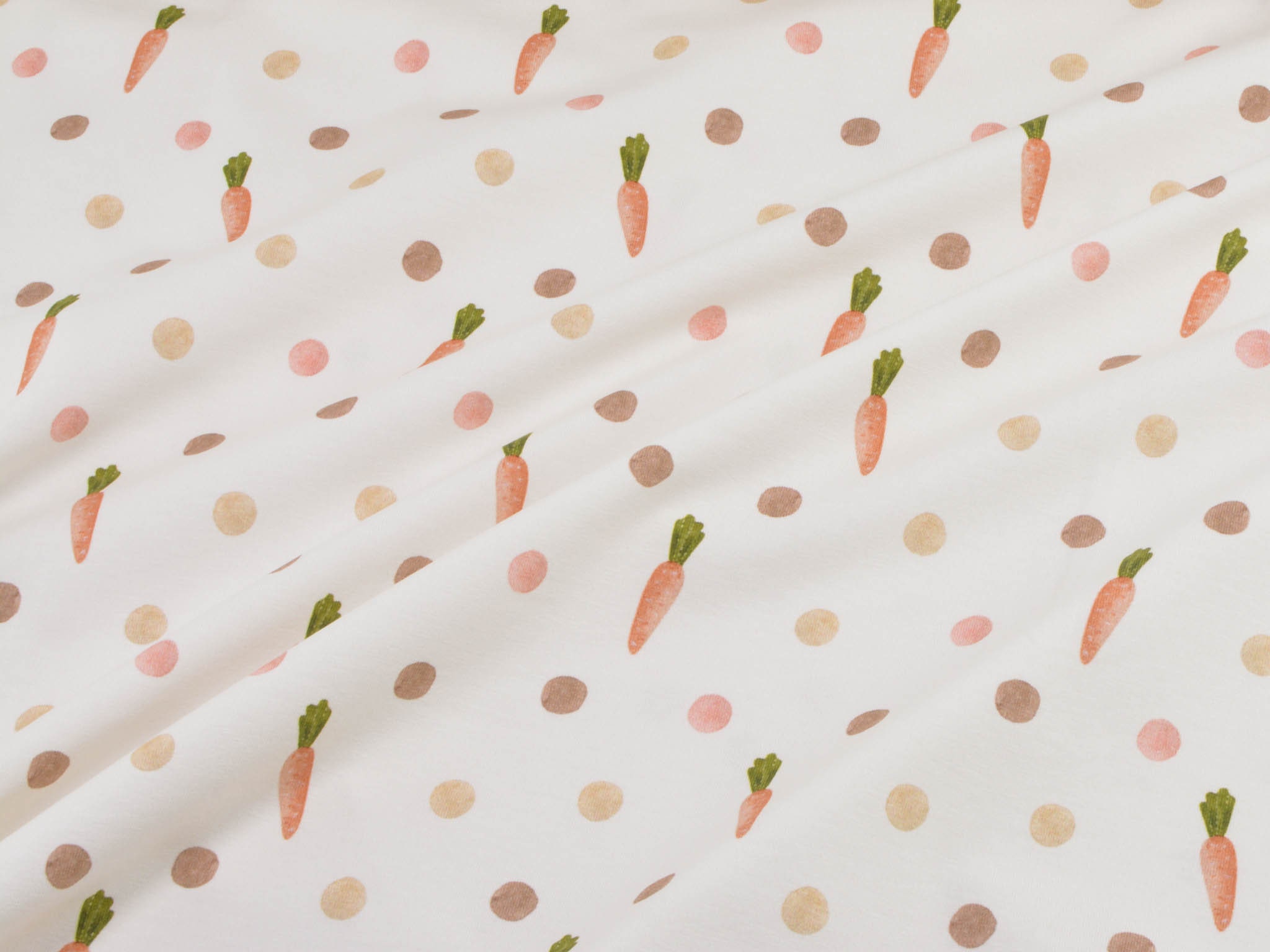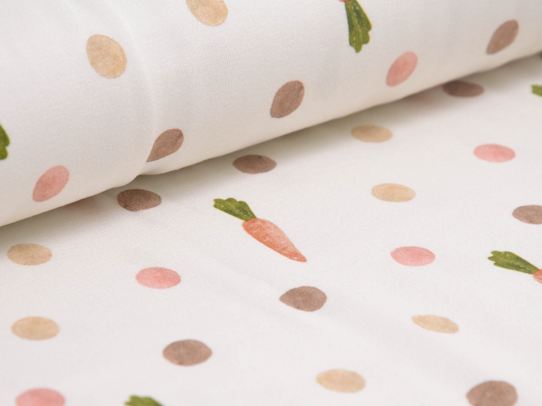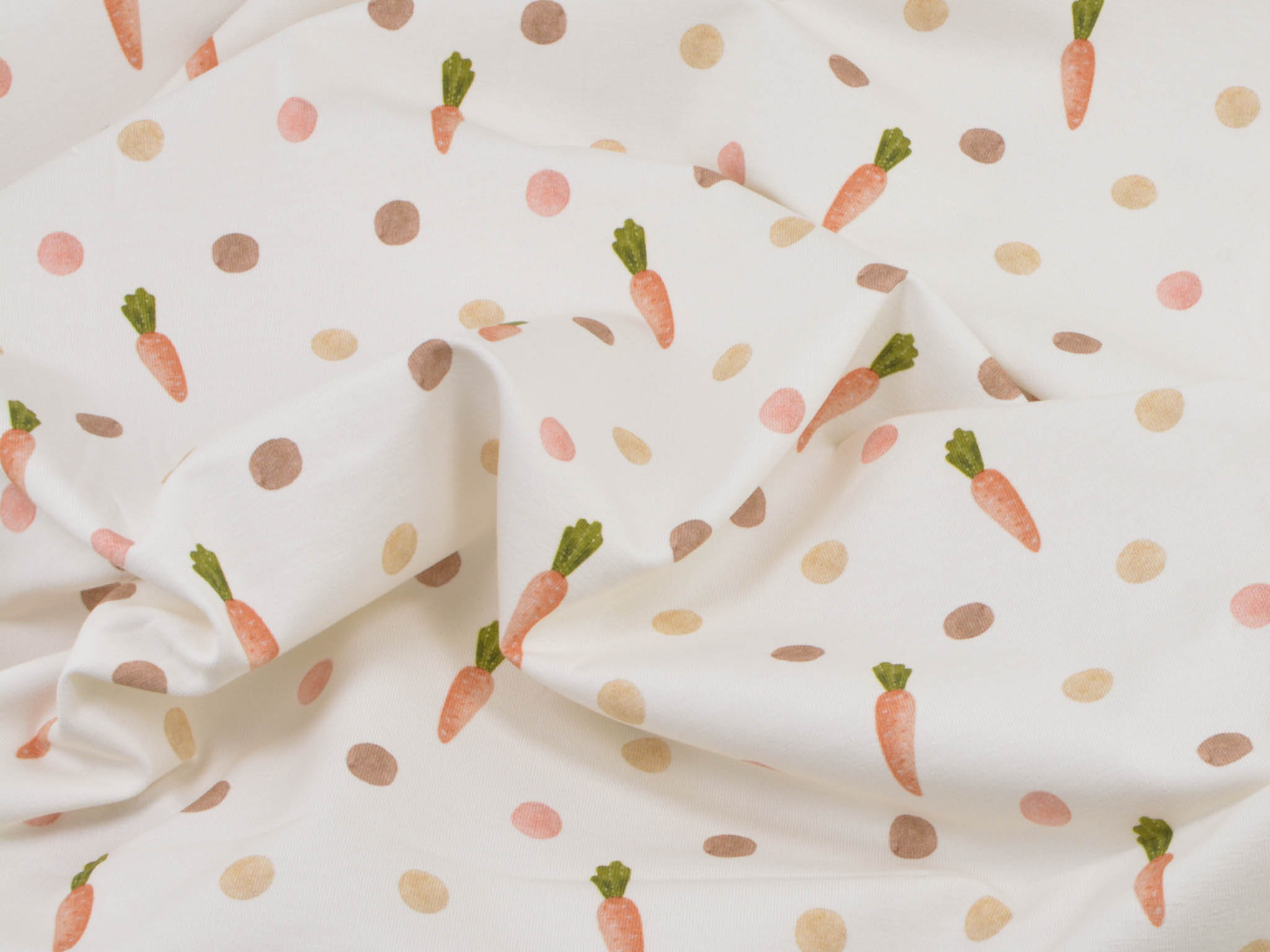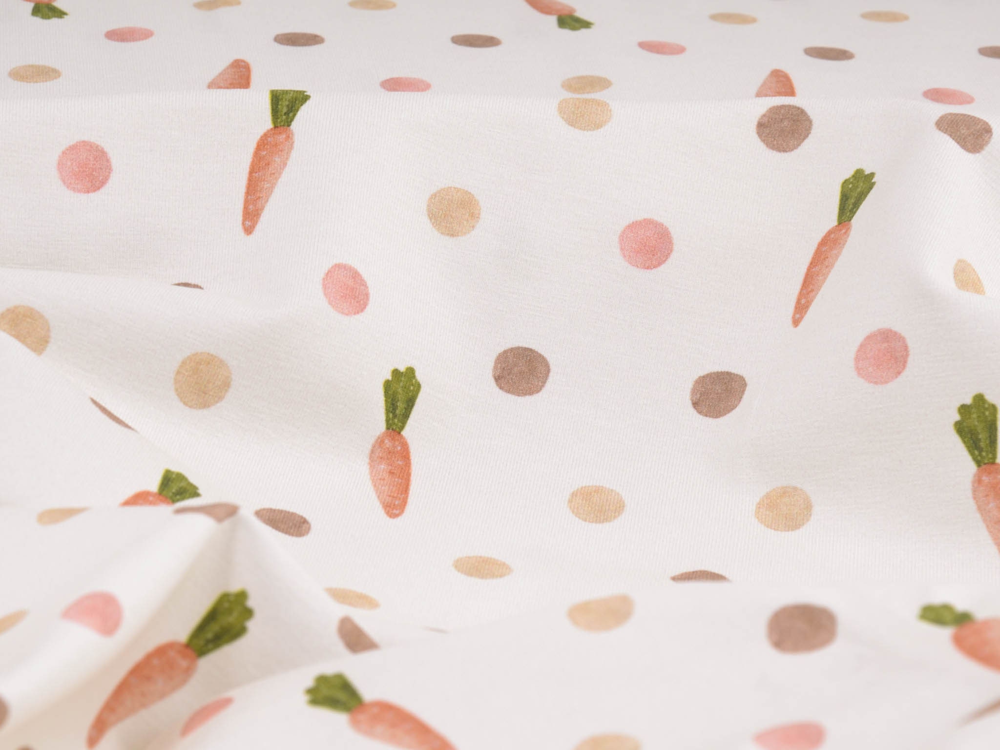 High-quality jersey made of cotton with elastane. The jersey is cream-white with orange carrots and pale beige and pink dots. It's suitable for sewing sweatpants, T-shirts, hats, scarves, and much more.