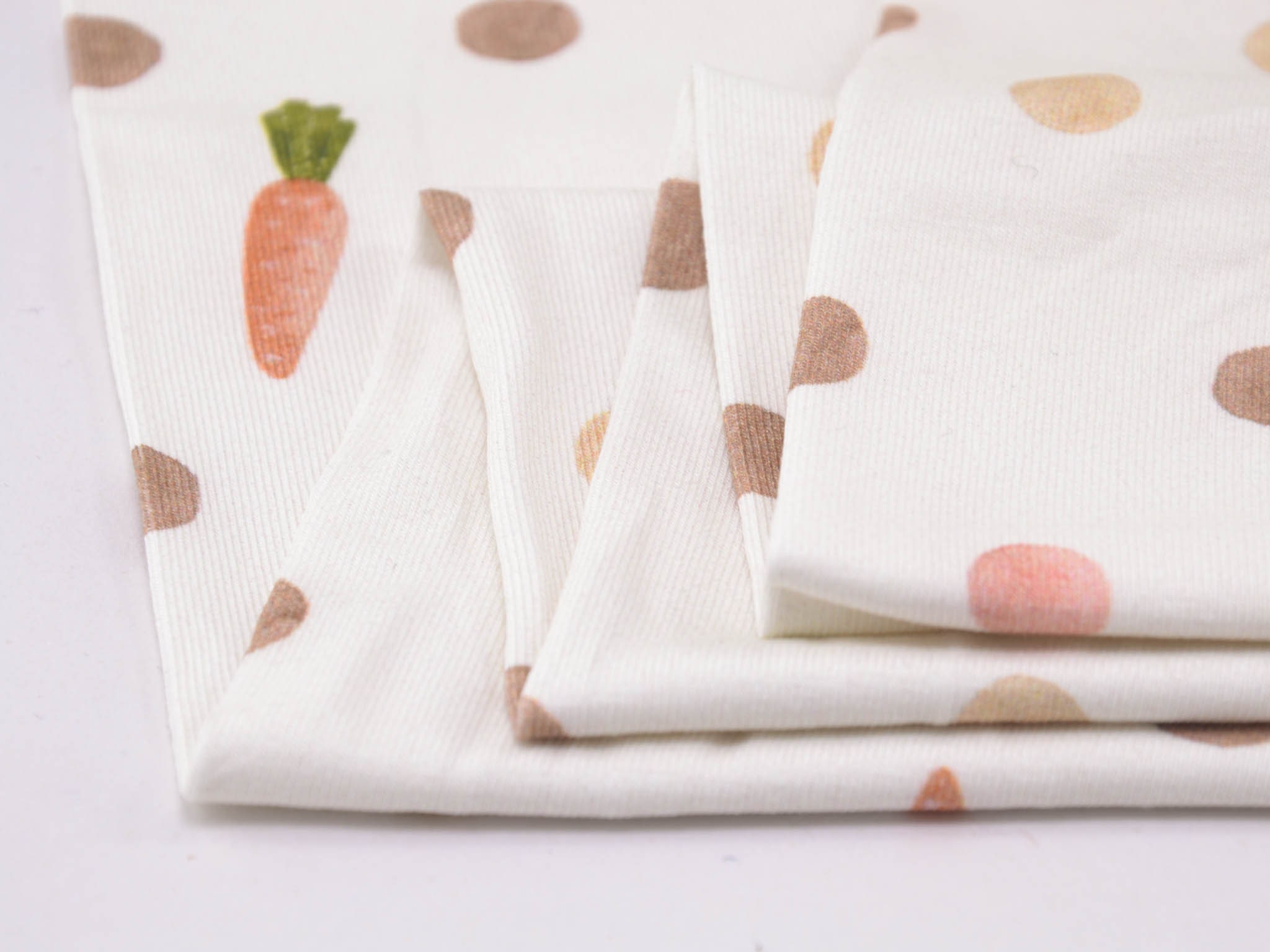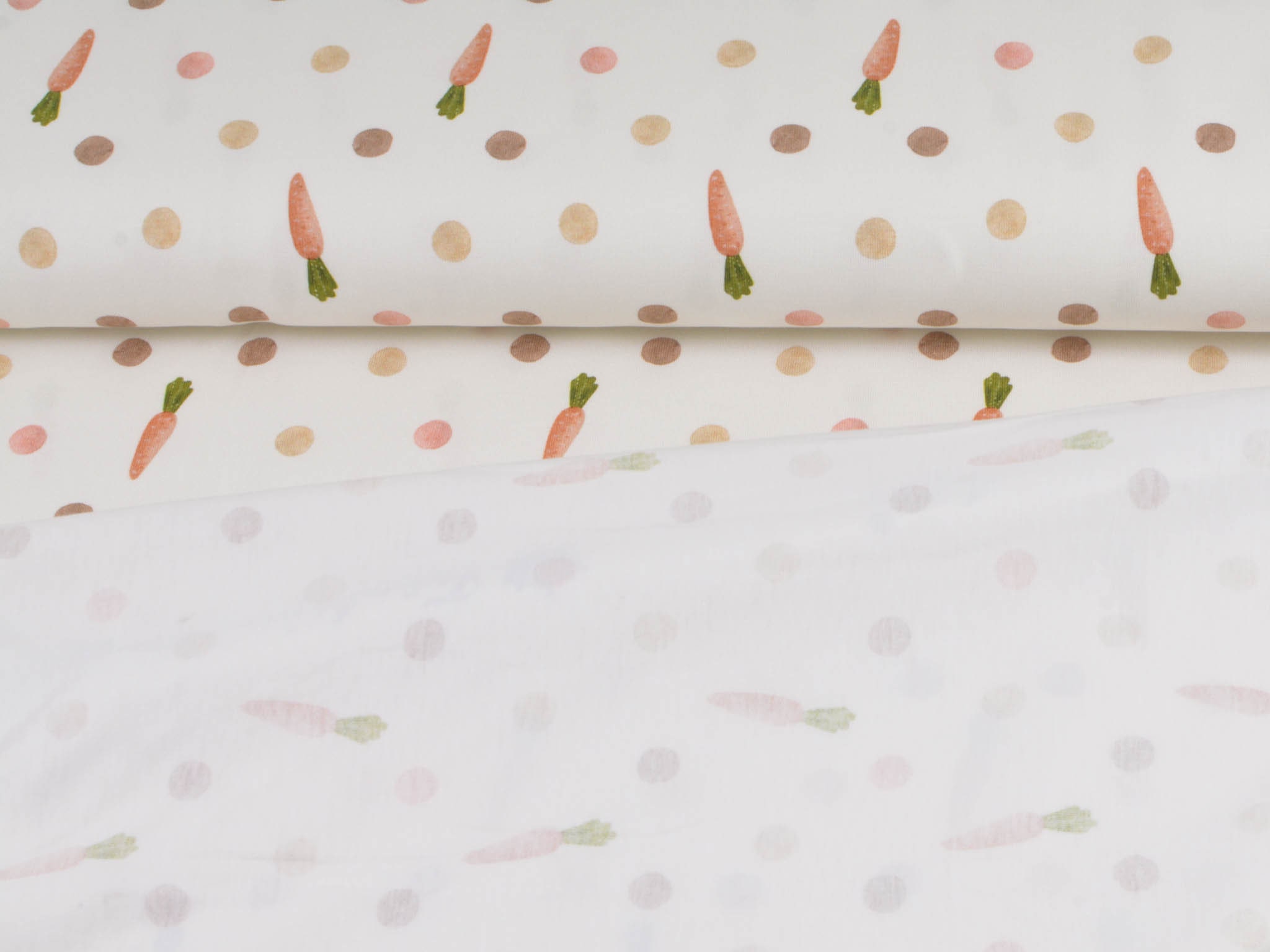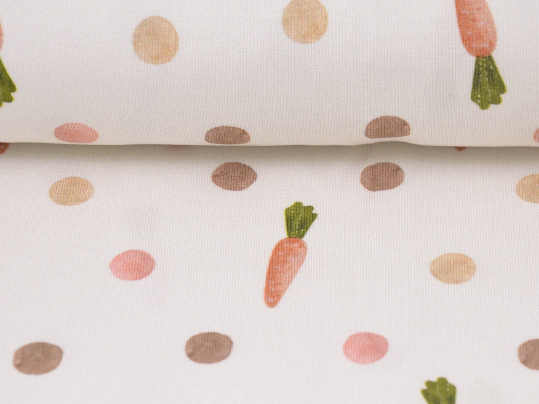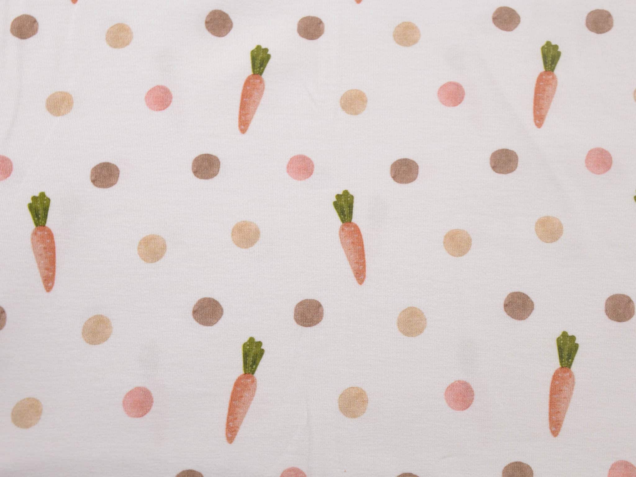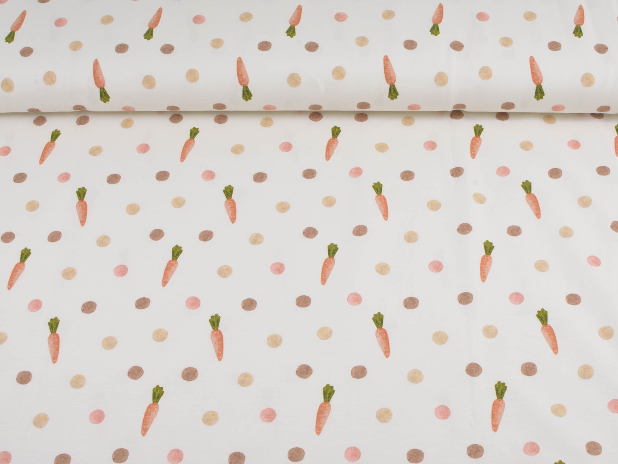 High-quality jersey made of cotton with elastane. The jersey is cream-white with orange carrots and pale beige and pink dots. It's suitable for sewing sweatpants, T-shirts, hats, scarves, and much more.