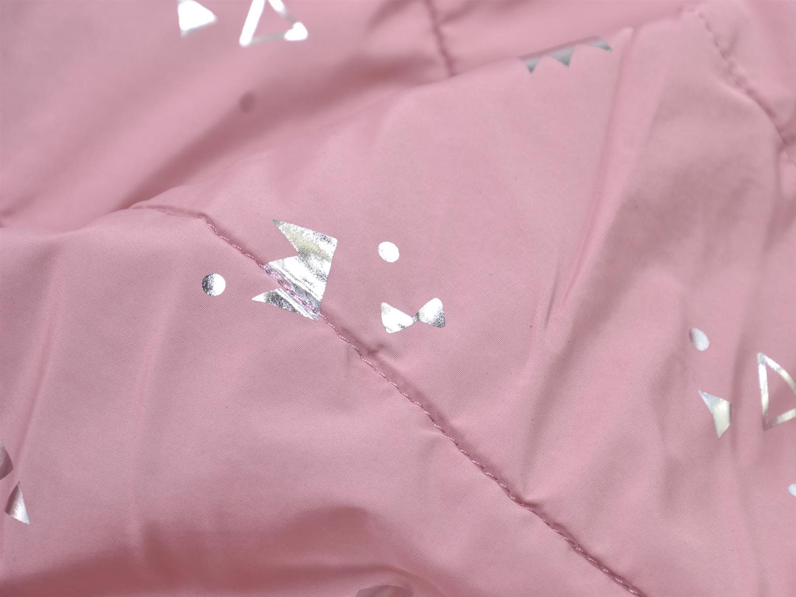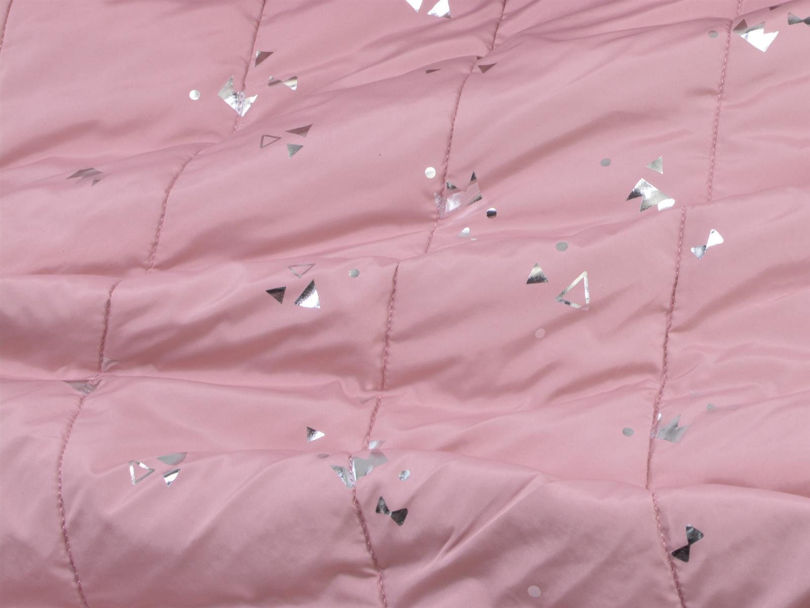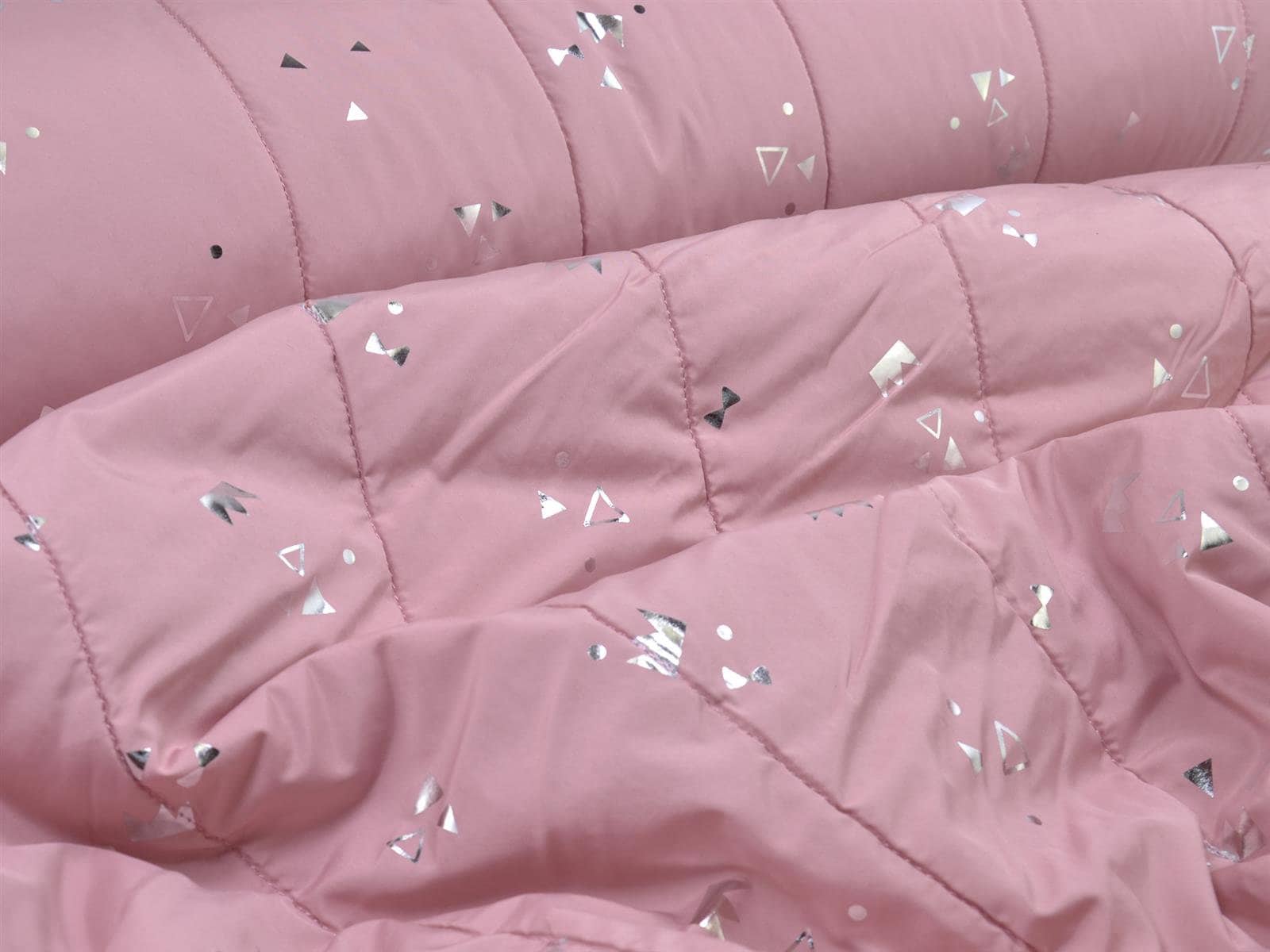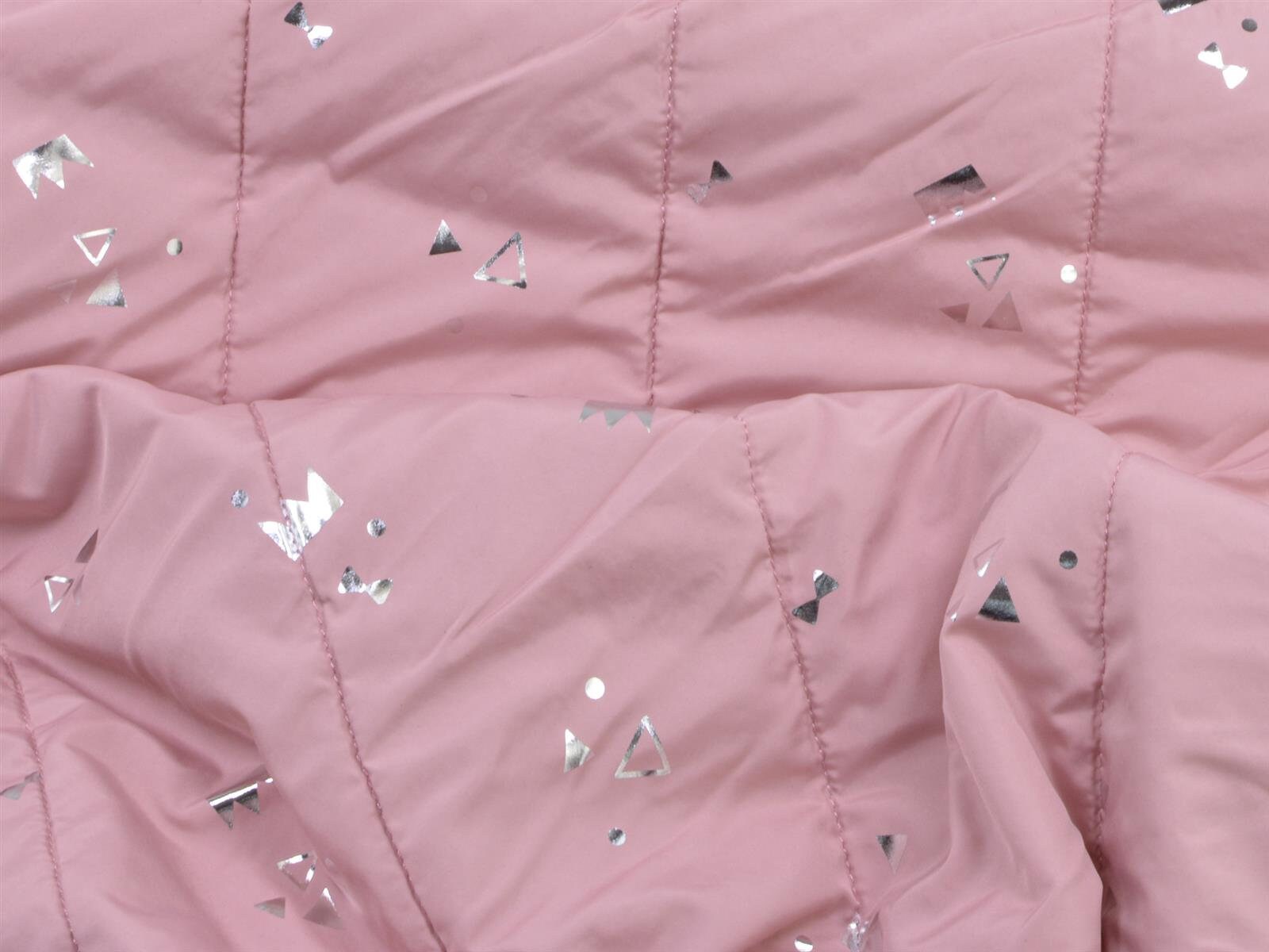 Sehr hübscher leichter pastell-rosa Stoff mit ganz dünnem verstepptem Vlies auf der Rückseite der demzufolge zwingend mit irgend einem Innenfutter weiterverarbeitet werden muss. Hoffentlich reiben sich die aufgebrachten silbernen Motive nicht bei Gebrauch ab und halten vielen Wäschen stand. Schnell geliefert, danke!