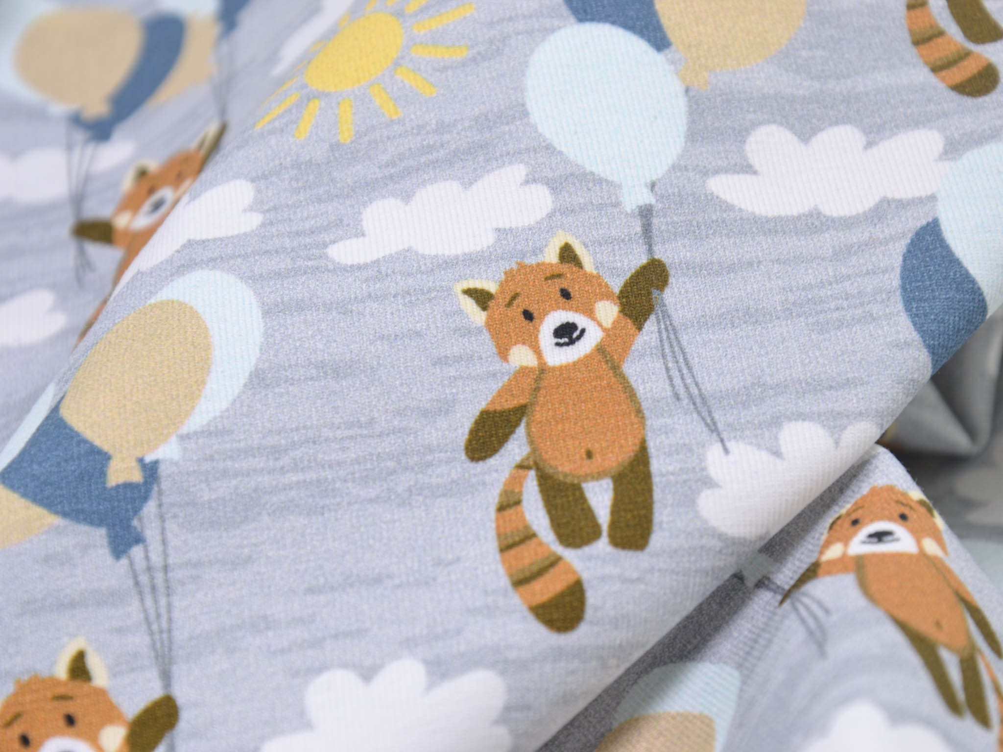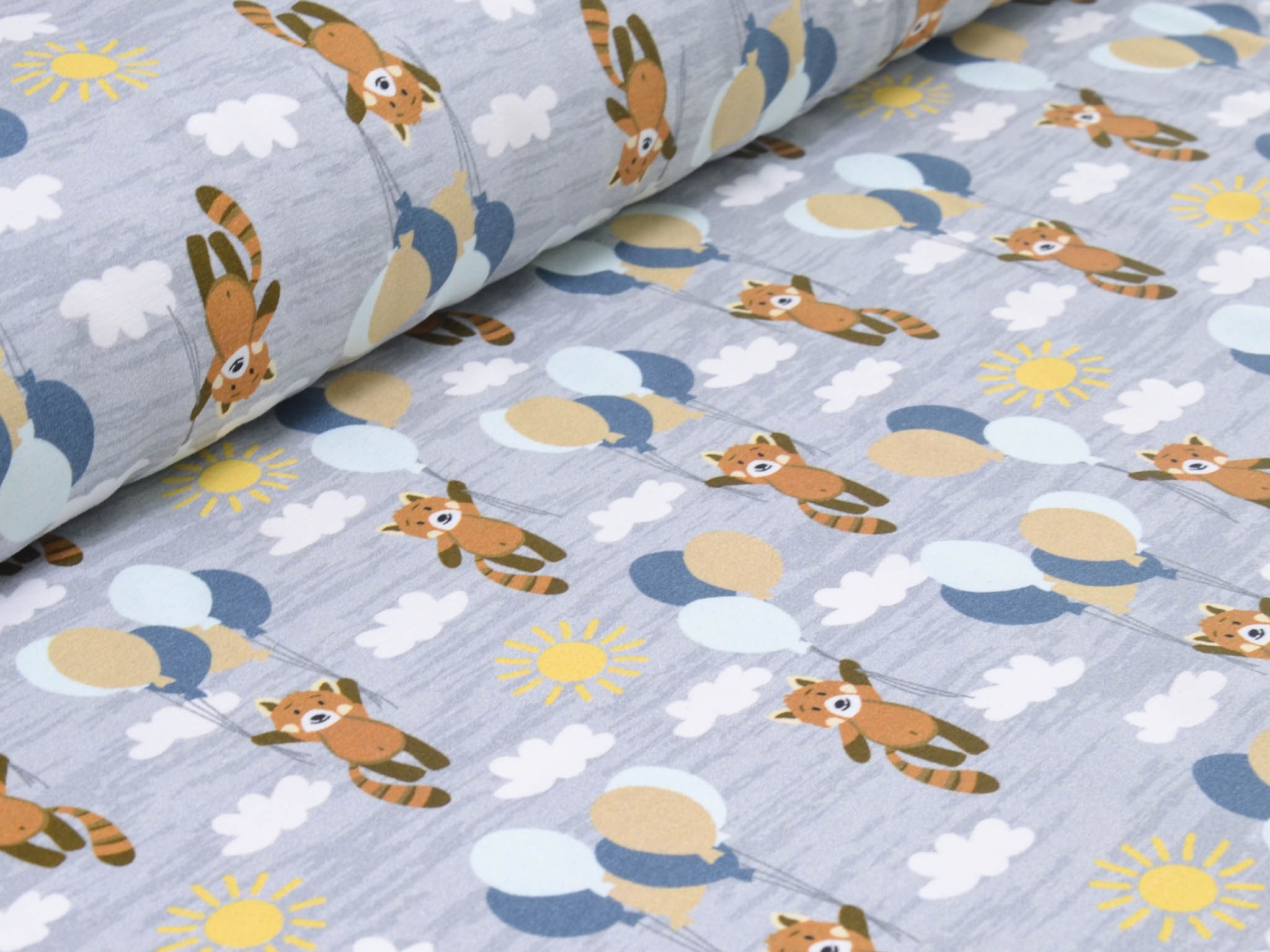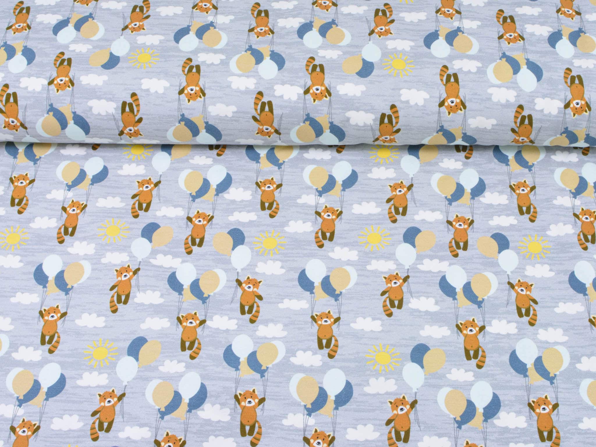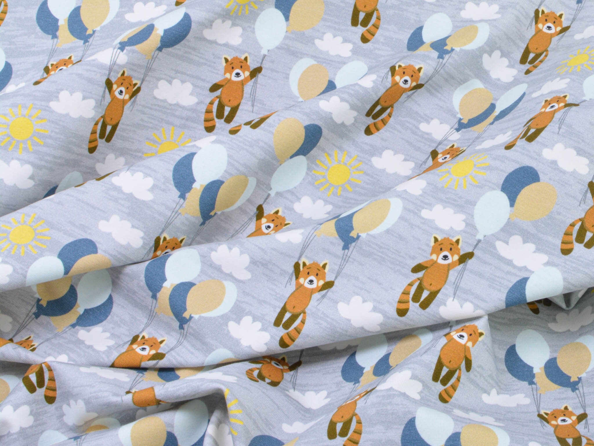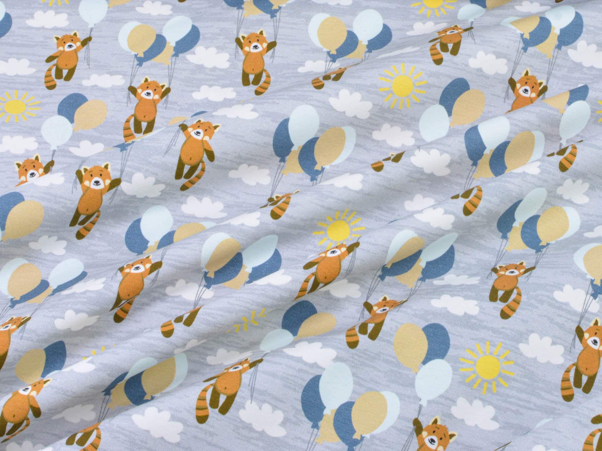 Hochwertiger Baumwolljersey aus dem Hause Hilco. Der grau-merlierte Jersey zeigt kleine Bären die an Luftballons im Wolken-Himmel fliegen. Der Stoff eignet sich perfekt zum Nähen von Röcken, Kleidern, T-Shirts, Pumphosen und vielem mehr.