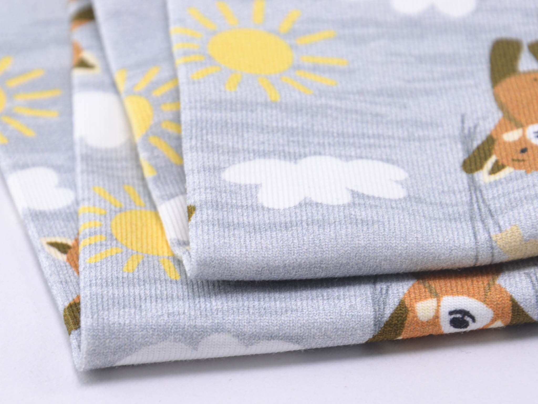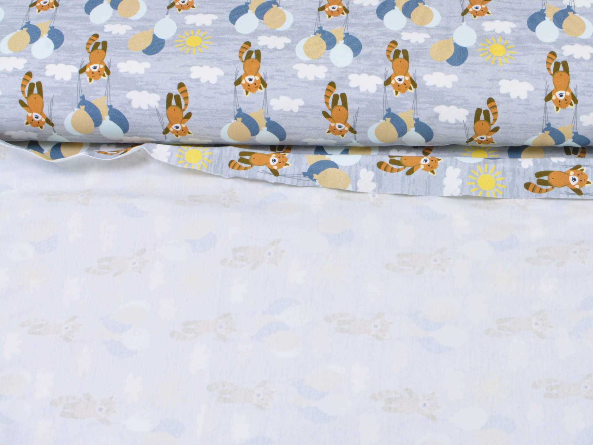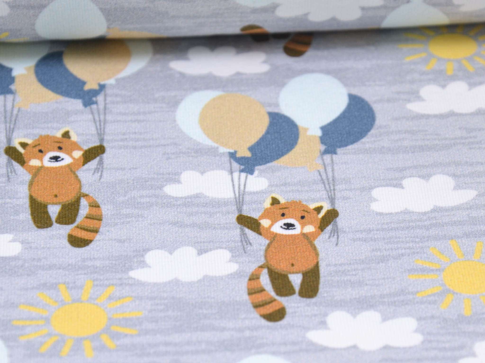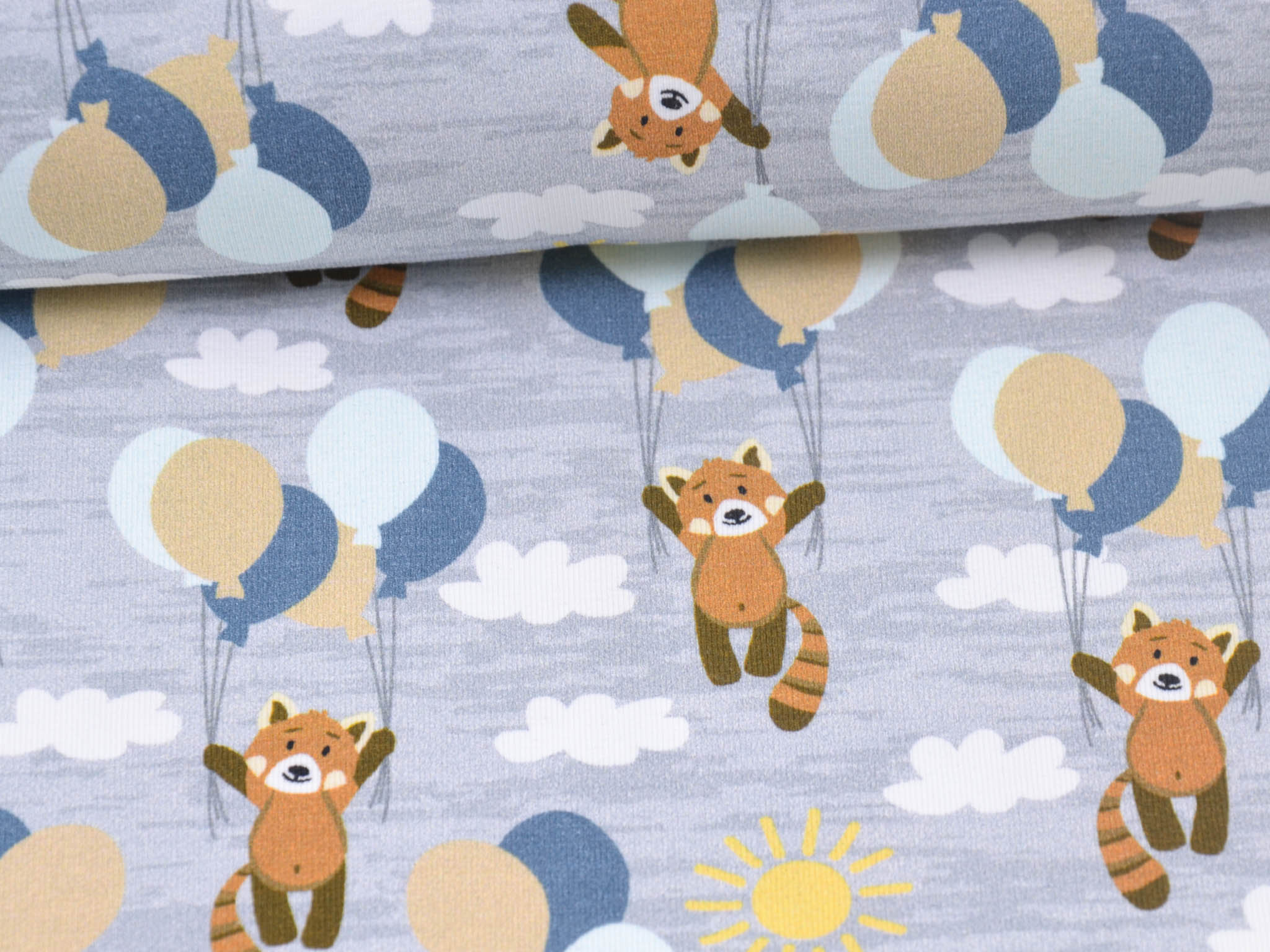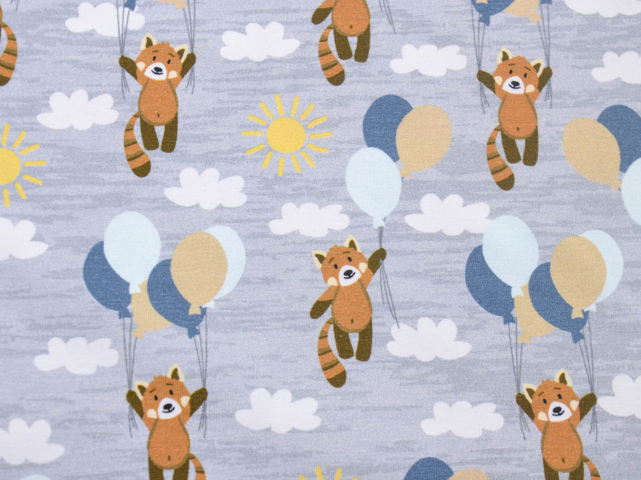 Hochwertiger Baumwolljersey aus dem Hause Hilco. Der grau-merlierte Jersey zeigt kleine Bären die an Luftballons im Wolken-Himmel fliegen. Der Stoff eignet sich perfekt zum Nähen von Röcken, Kleidern, T-Shirts, Pumphosen und vielem mehr.