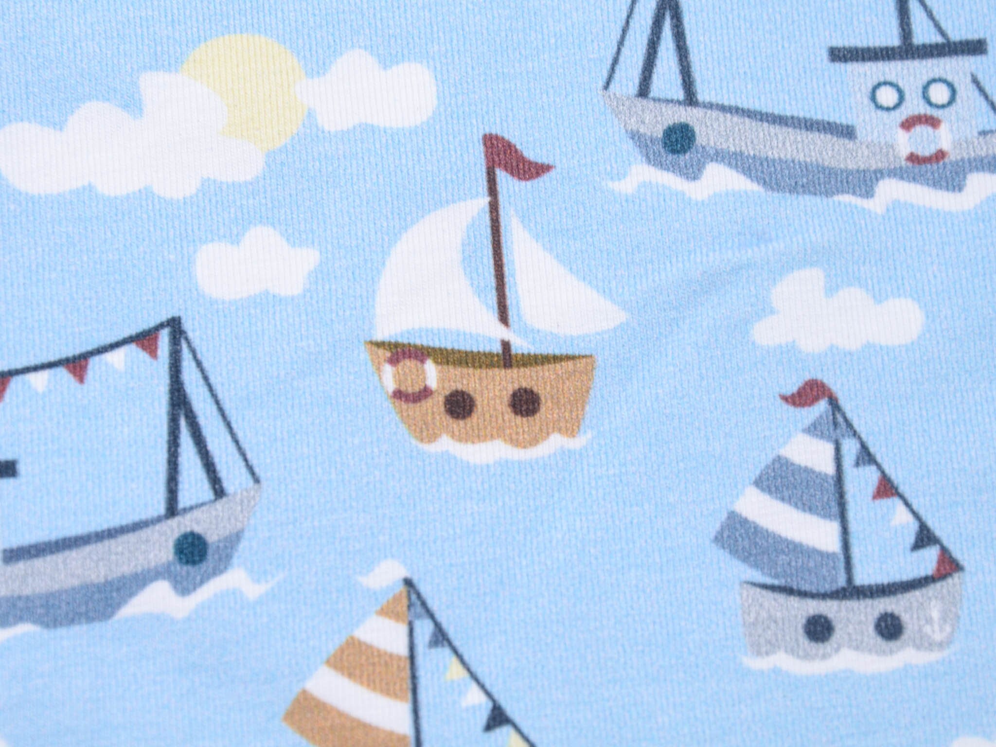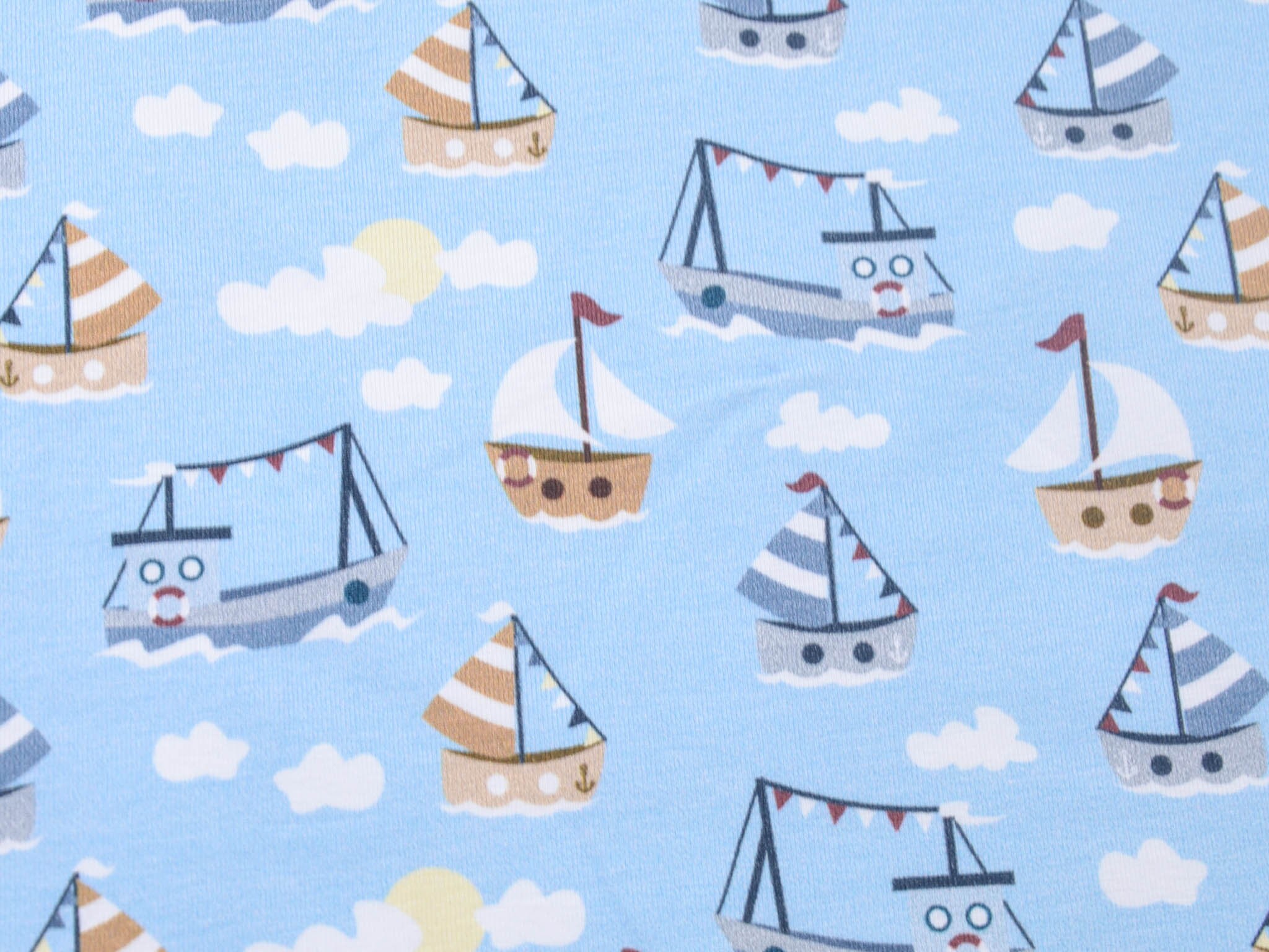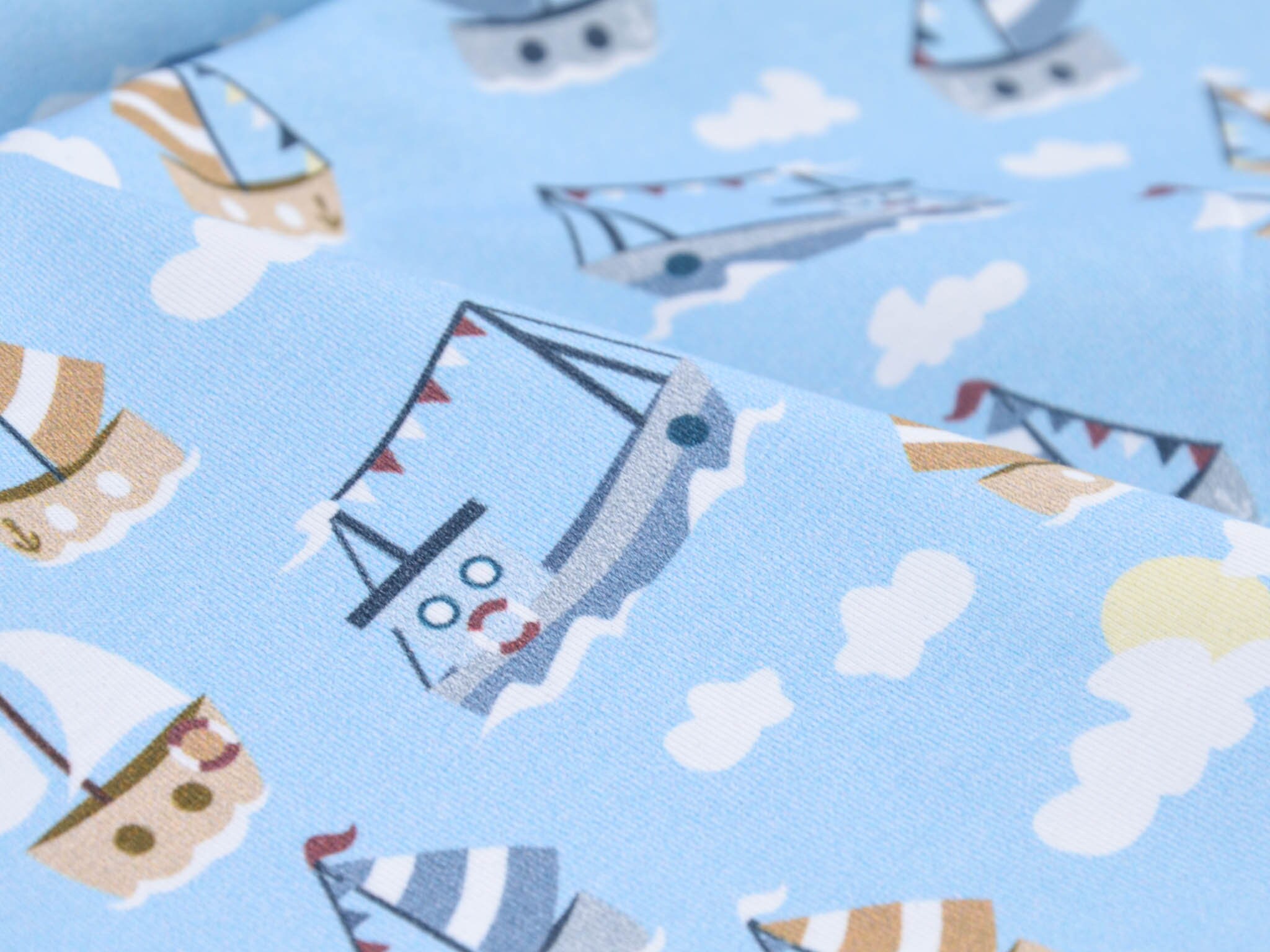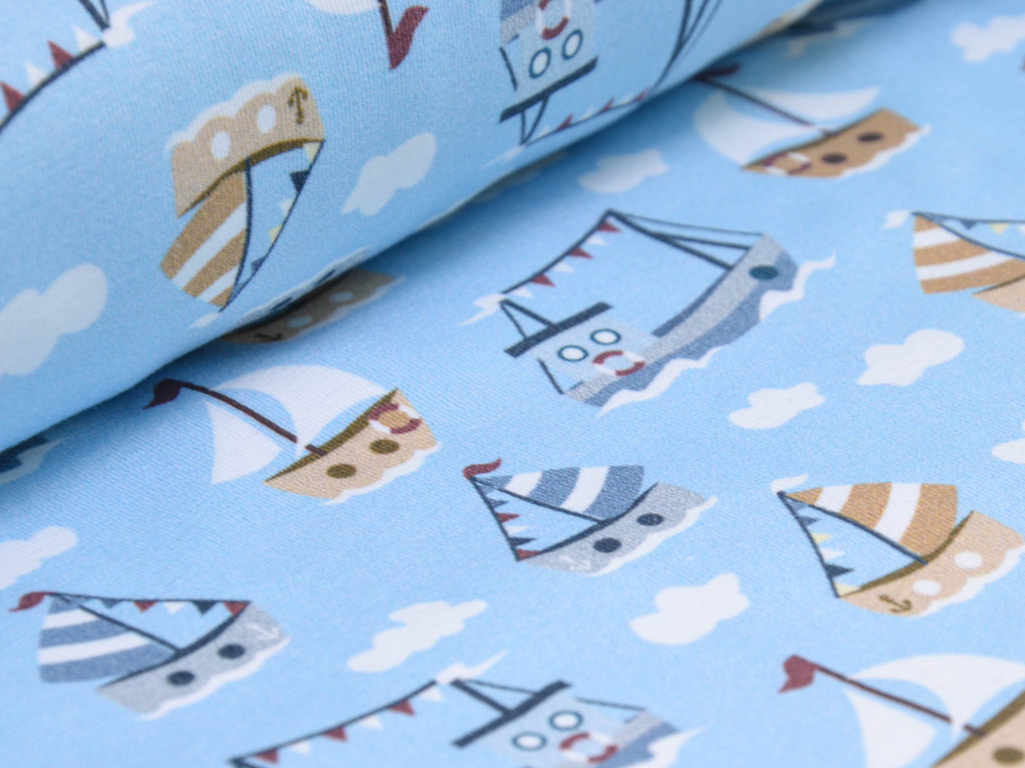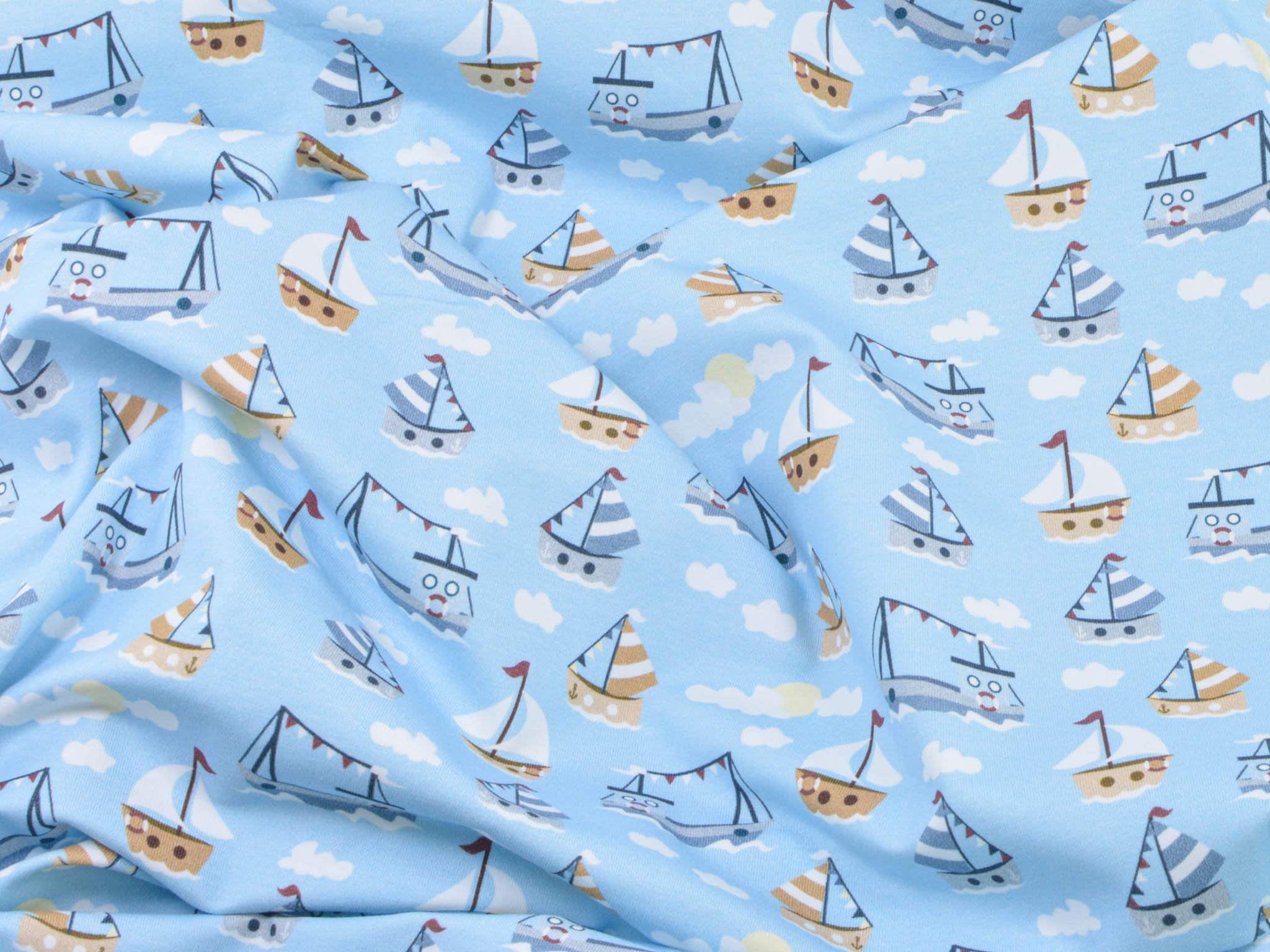 Hochwertiger Baumwolljersey aus dem Hause Hilco. Der maritime Jersey zeigt verschiedene, kleine Schiffe und Wolken. Der Stoff eignet sich perfekt zum Nähen von Röcken, Kleidern, T-Shirts, Pumphosen und vielem mehr.