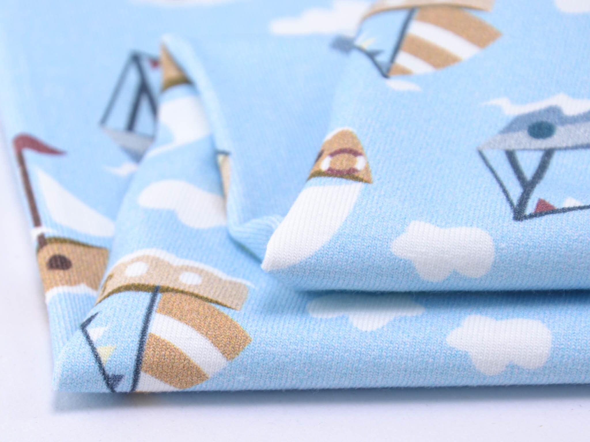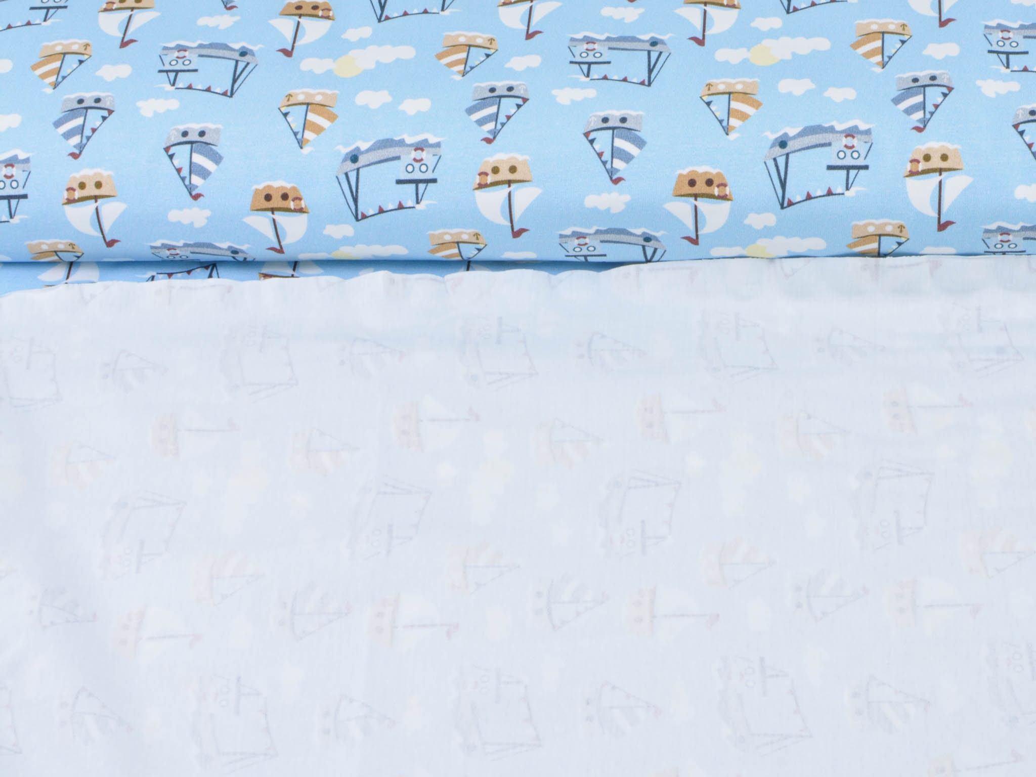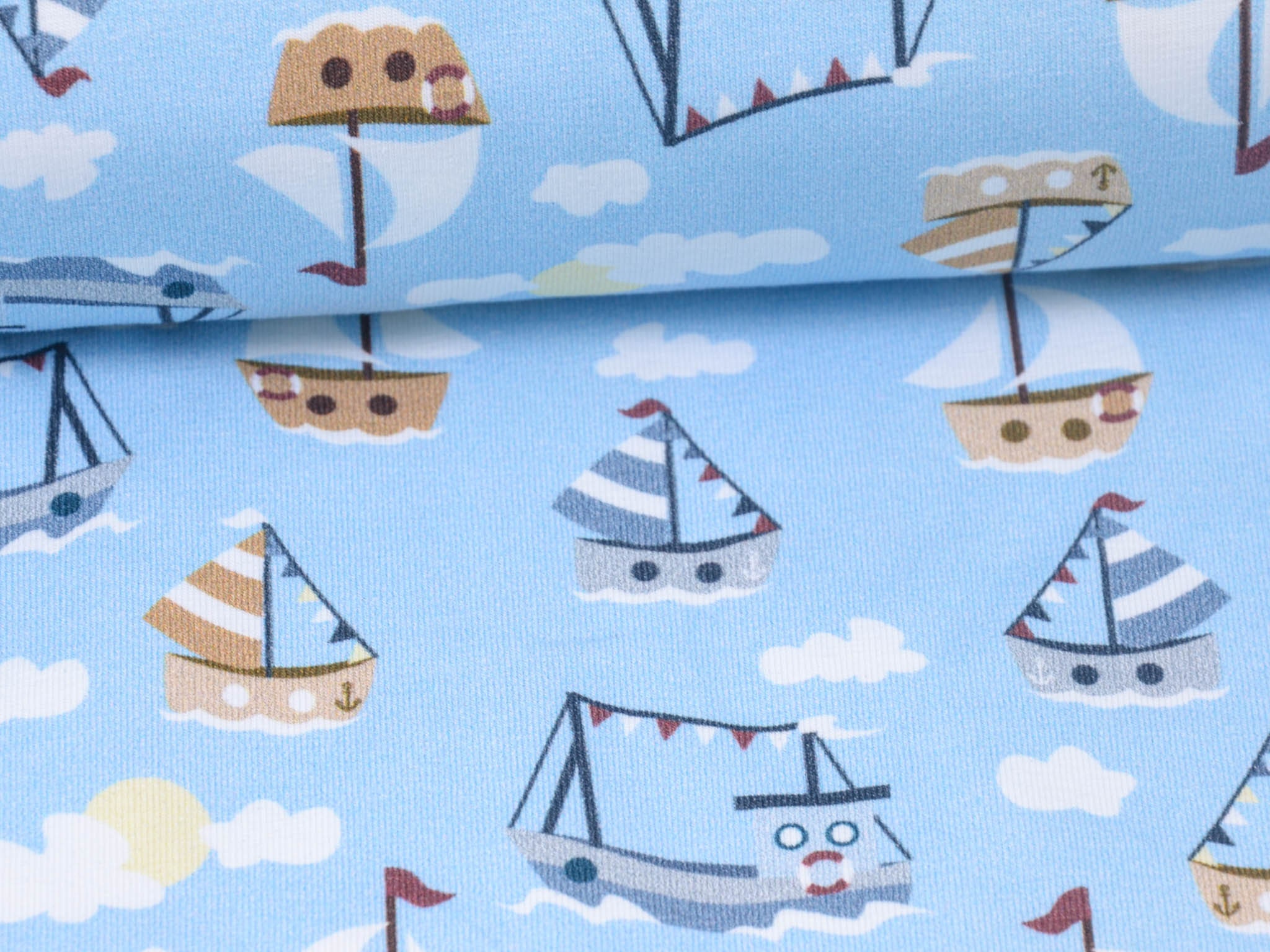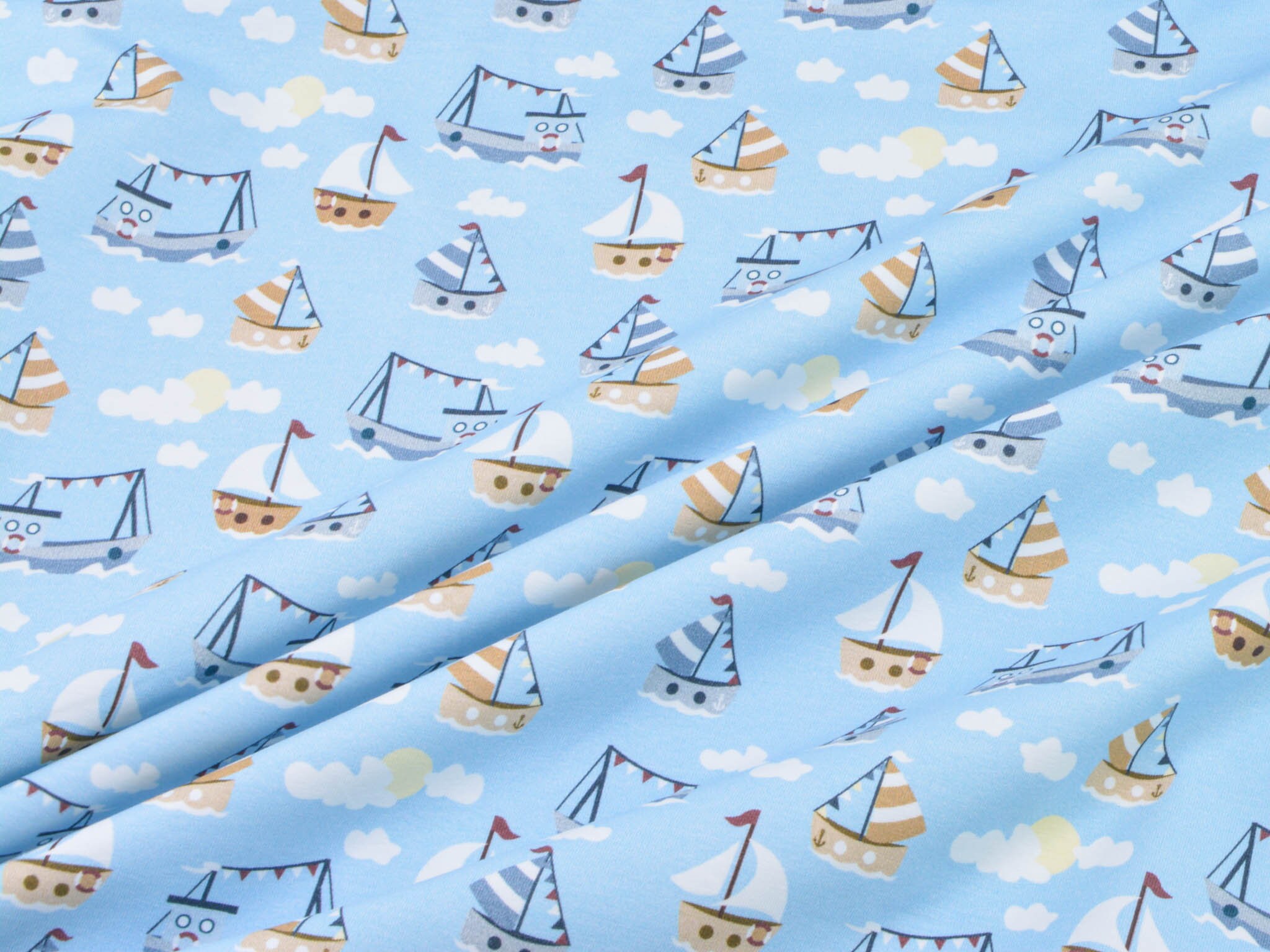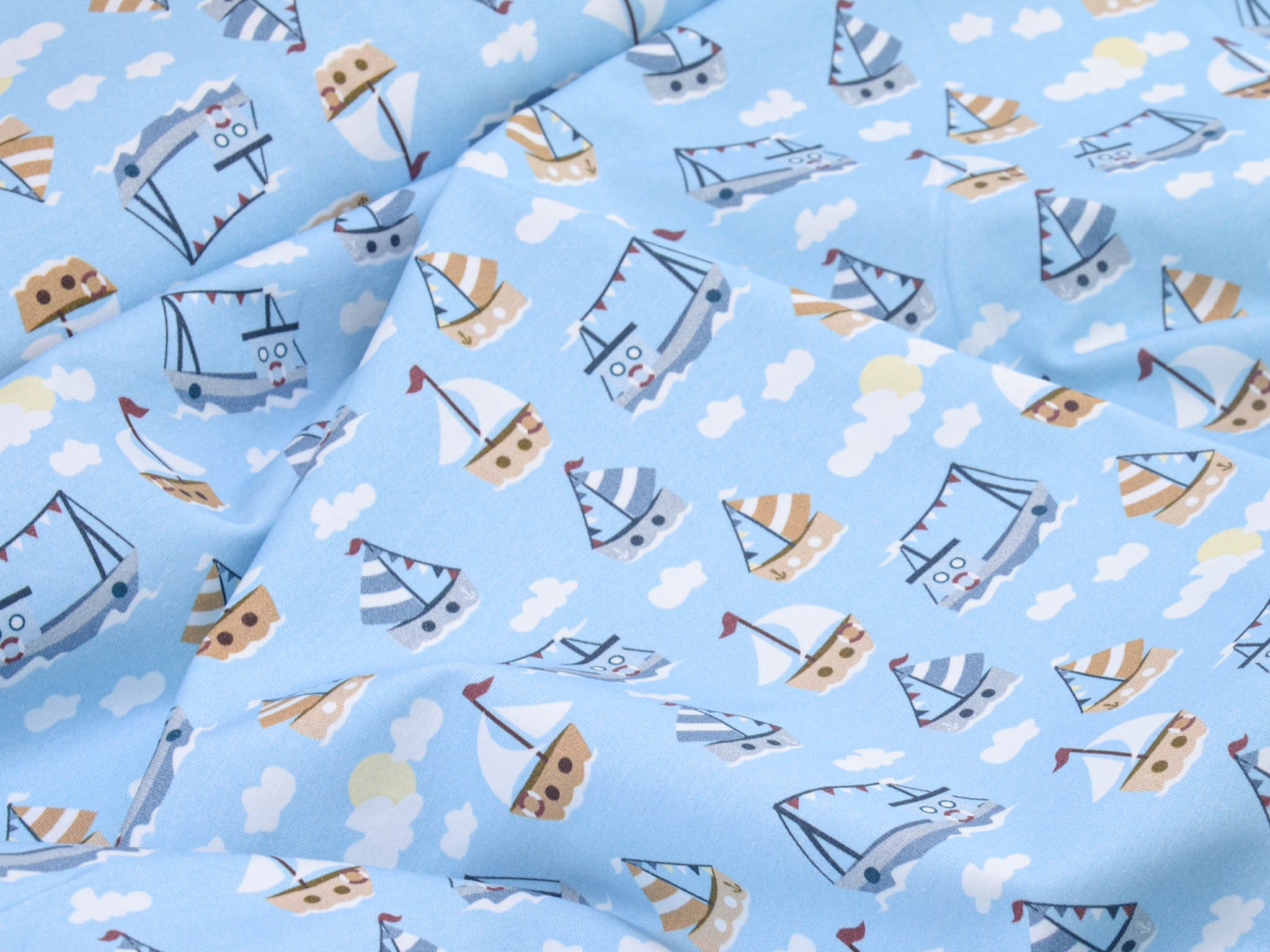 Hochwertiger Baumwolljersey aus dem Hause Hilco. Der maritime Jersey zeigt verschiedene, kleine Schiffe und Wolken. Der Stoff eignet sich perfekt zum Nähen von Röcken, Kleidern, T-Shirts, Pumphosen und vielem mehr.