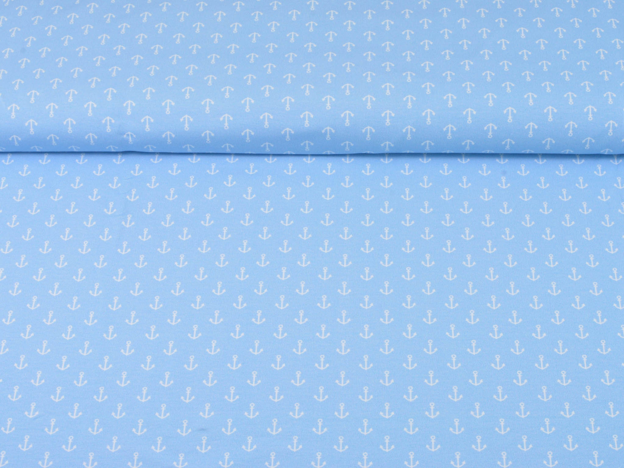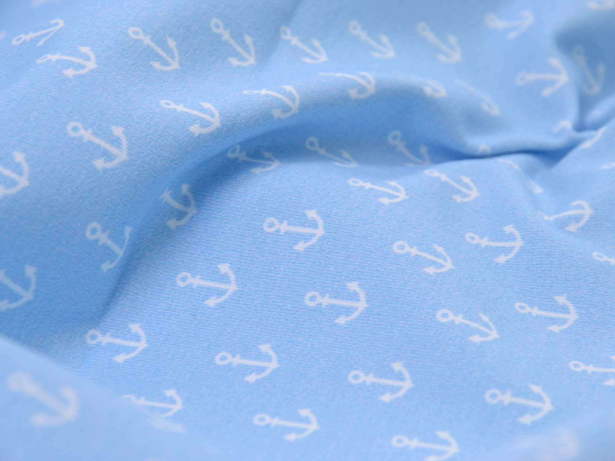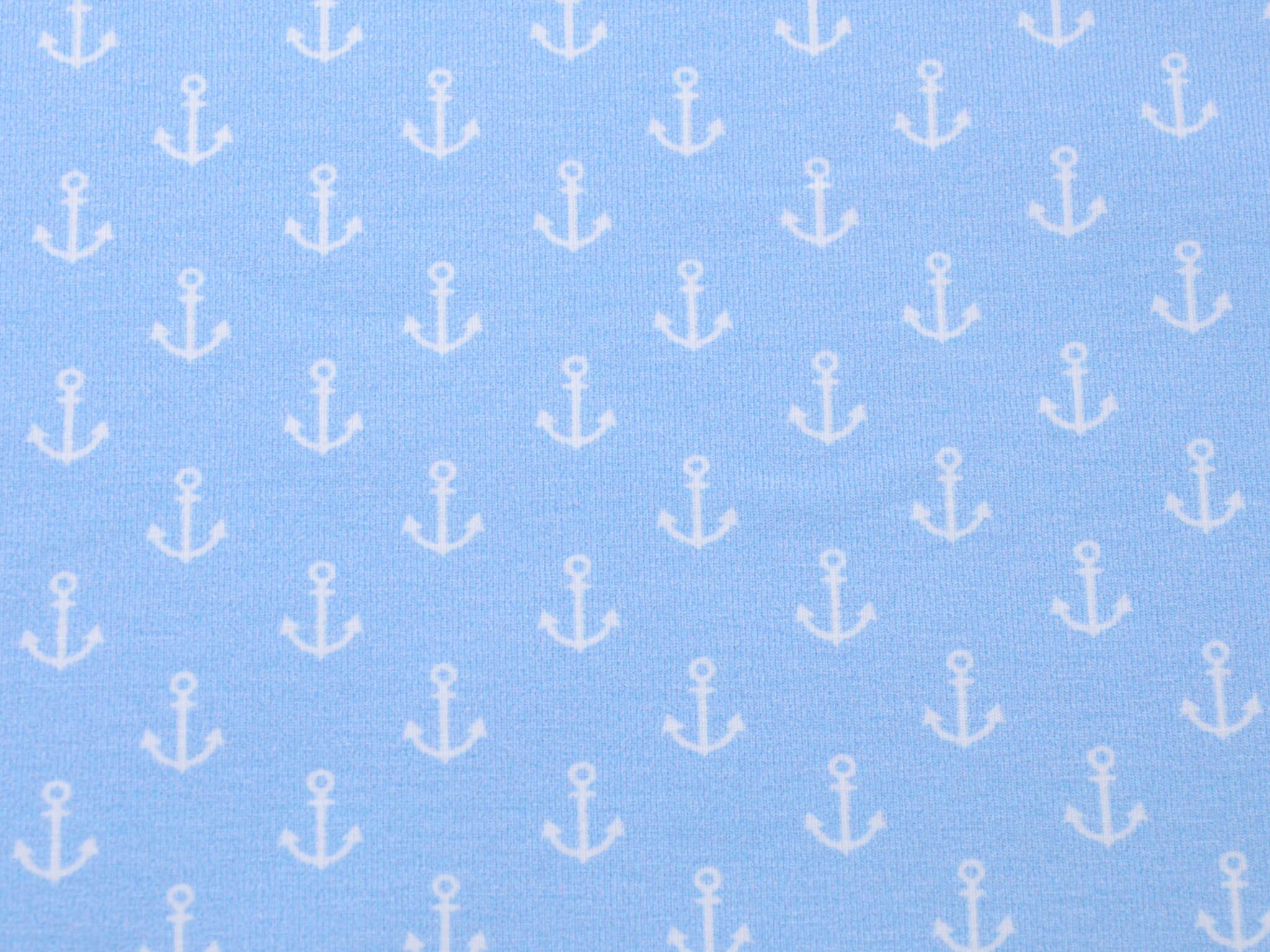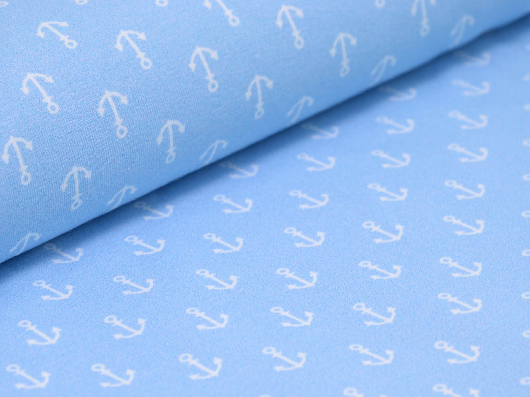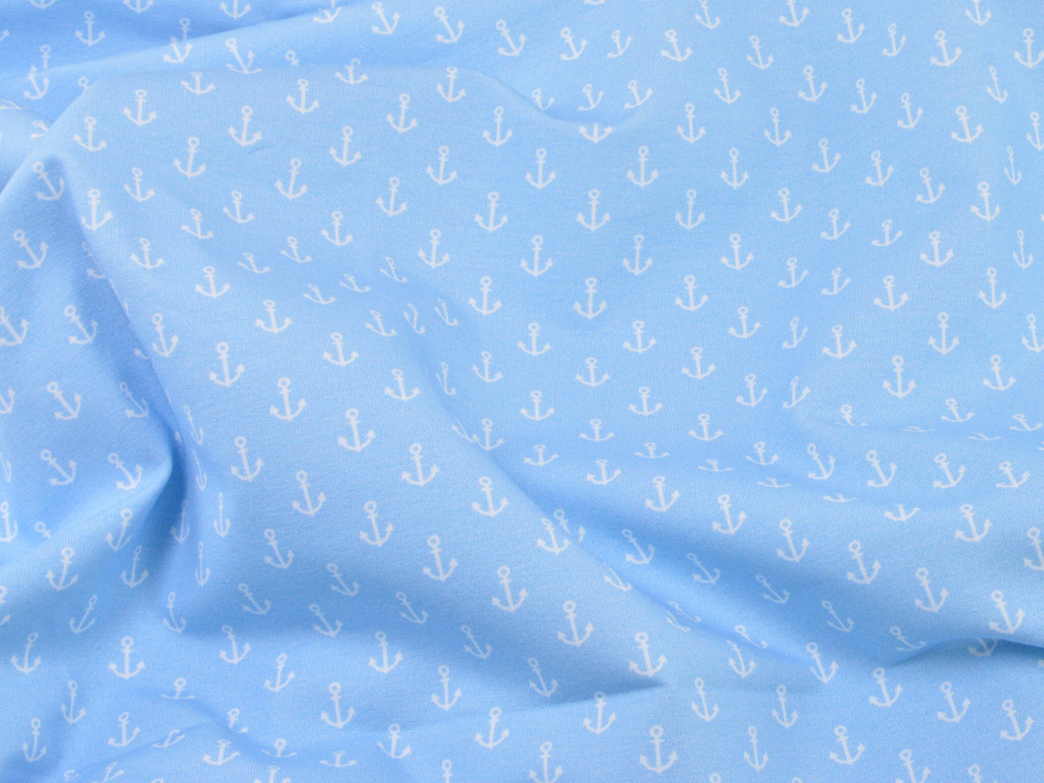 Hochwertiger, maritimer Jersey aus Baumwolle von Hilco. Hellblauer Jersey mit weißen Ankern. Super geeignet zum Nähen von T-Shirts, Röcken, Kleidern, Jumpsuits und vielem mehr.