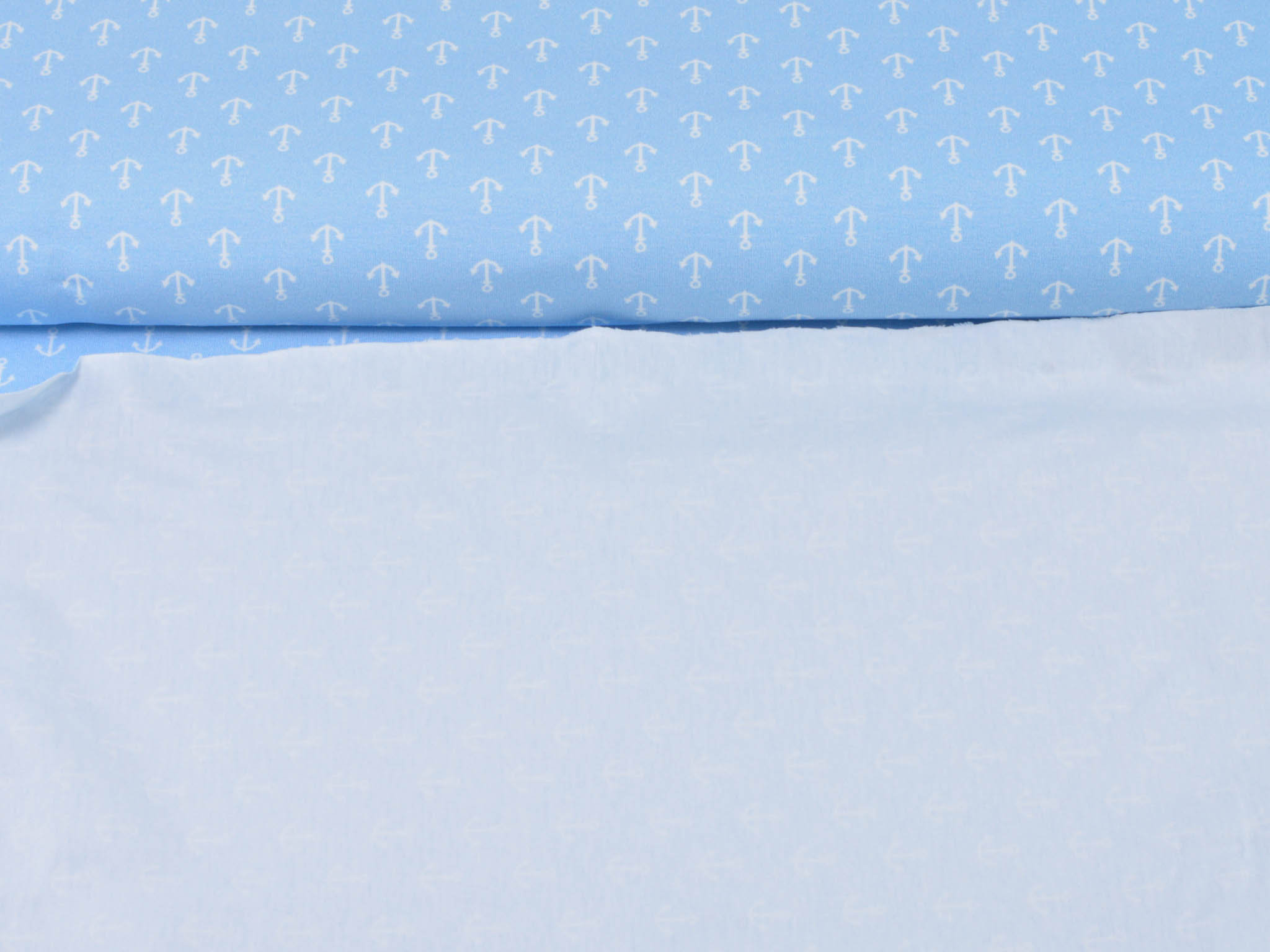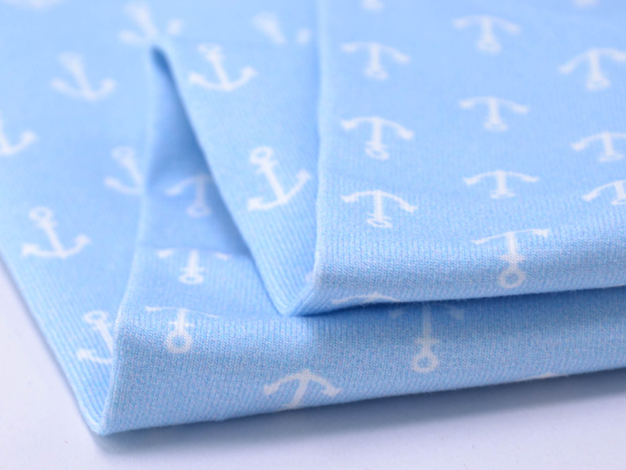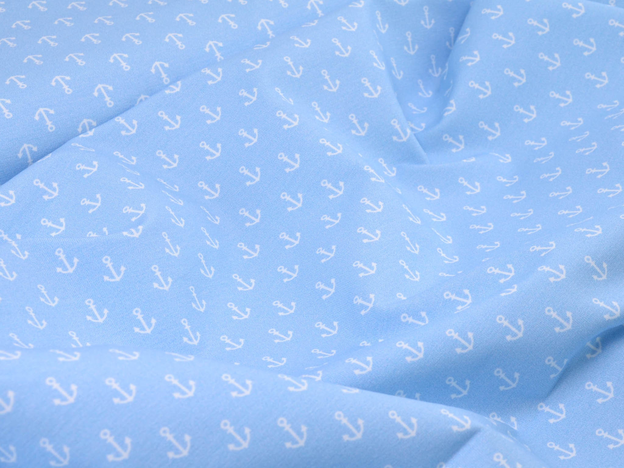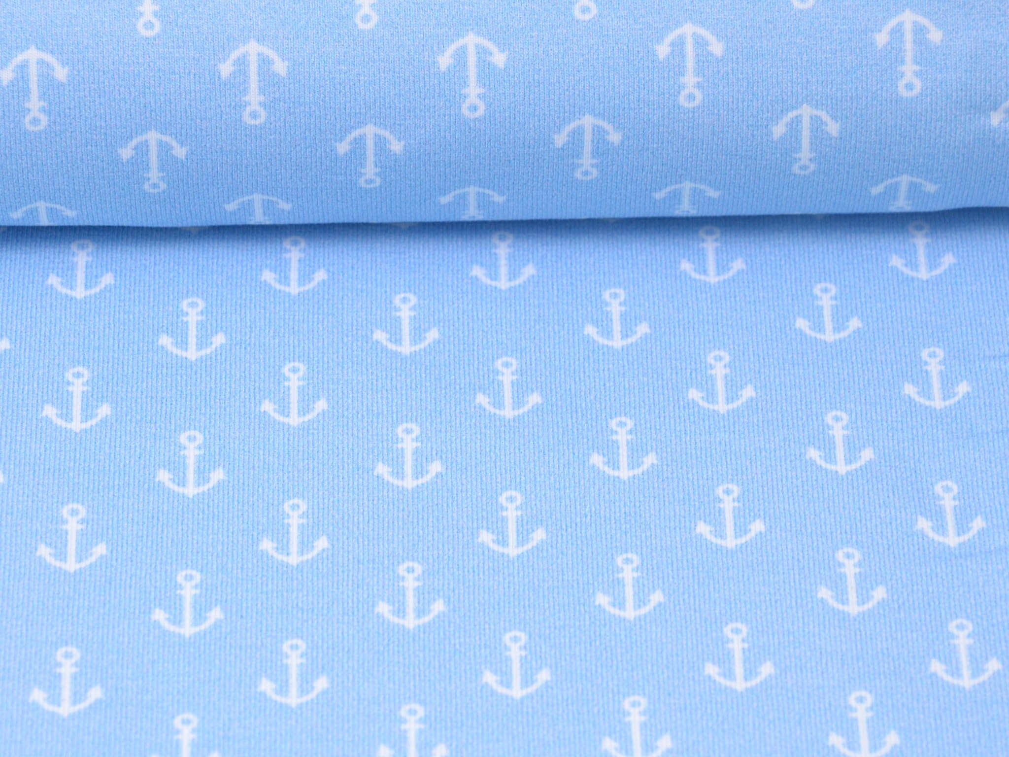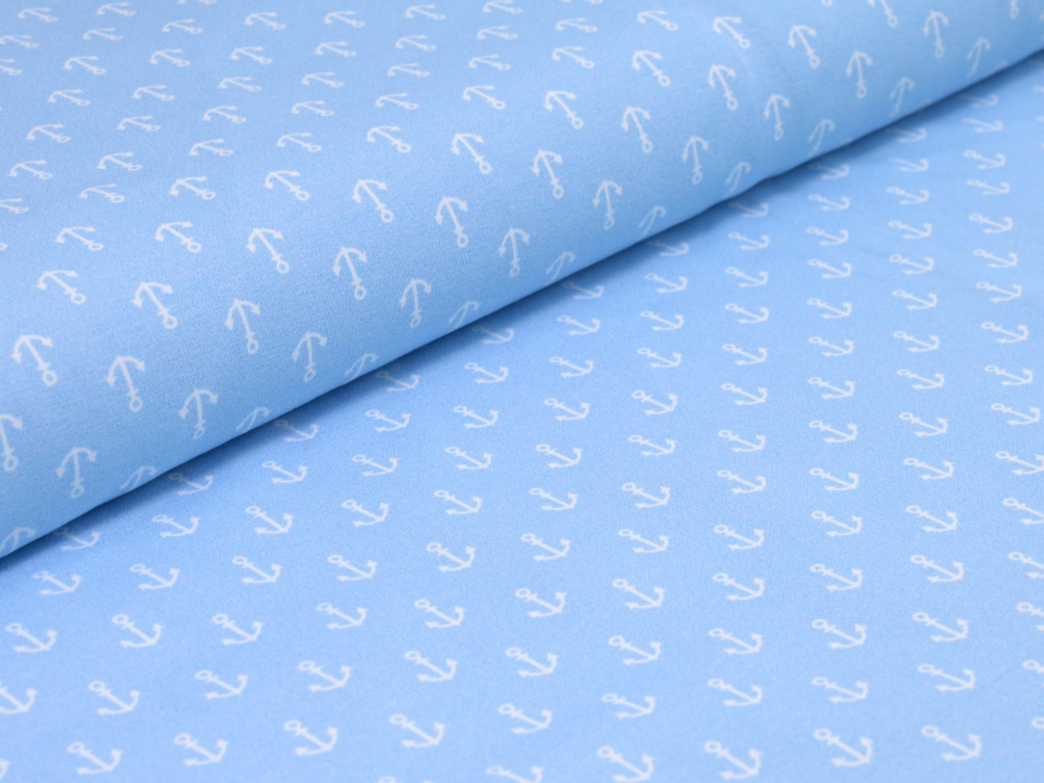 Hochwertiger, maritimer Jersey aus Baumwolle von Hilco. Hellblauer Jersey mit weißen Ankern. Super geeignet zum Nähen von T-Shirts, Röcken, Kleidern, Jumpsuits und vielem mehr.