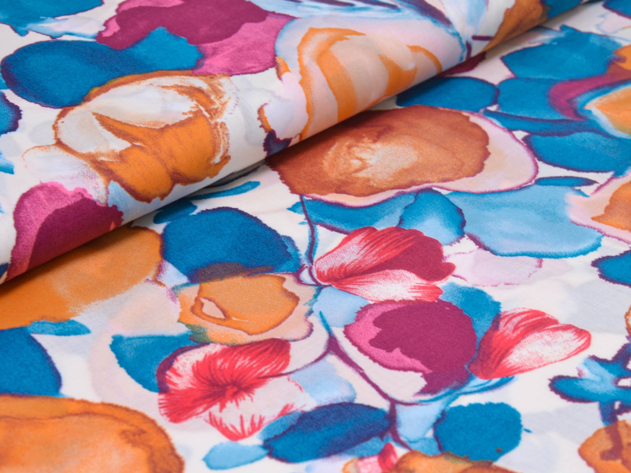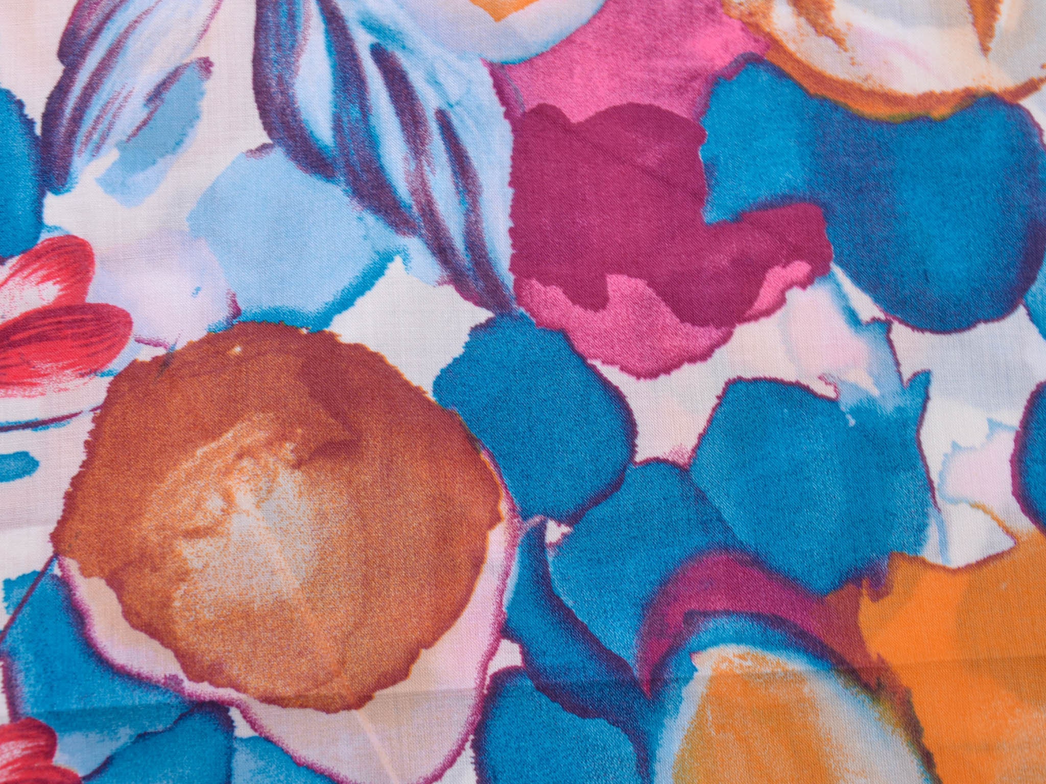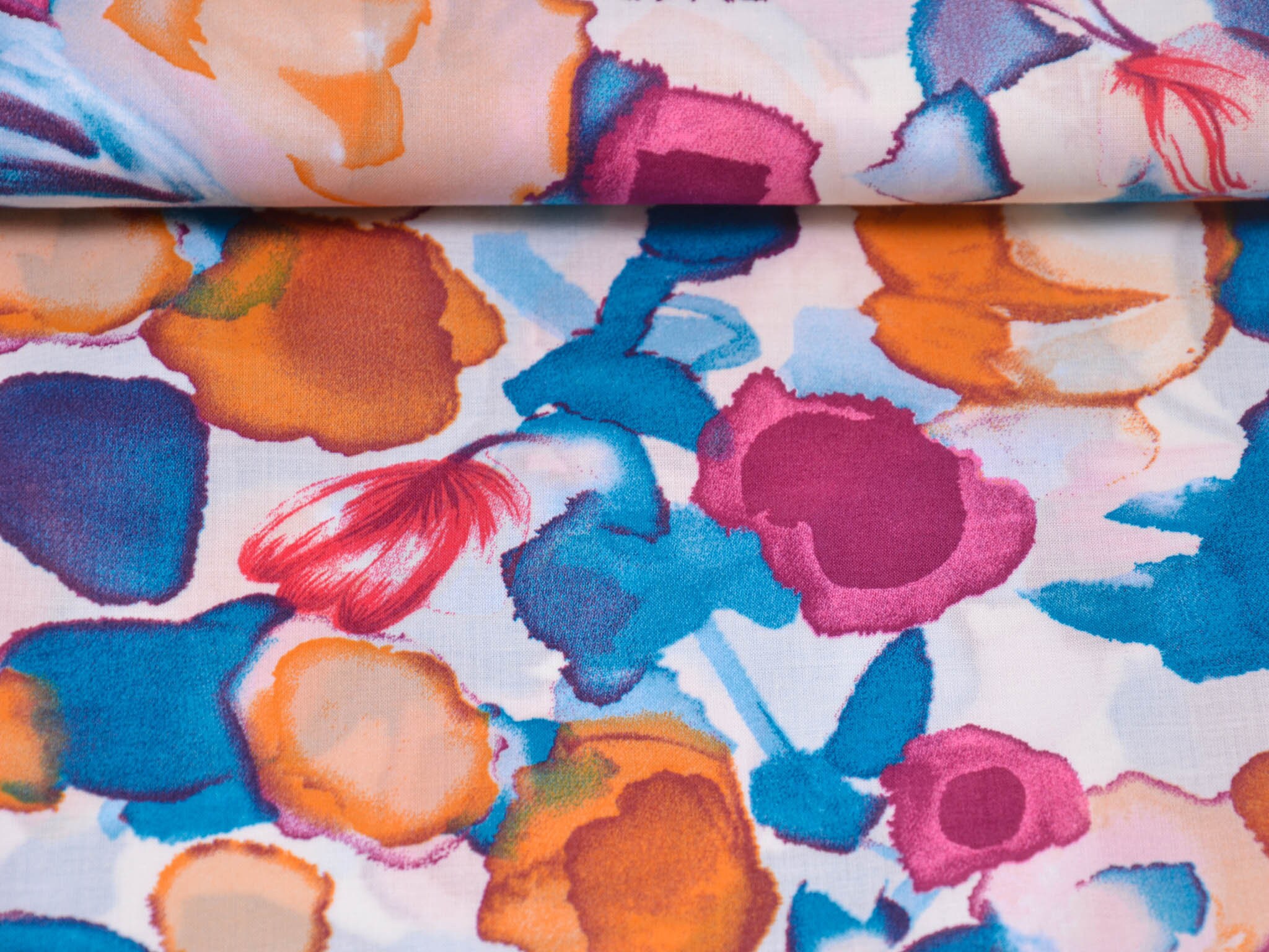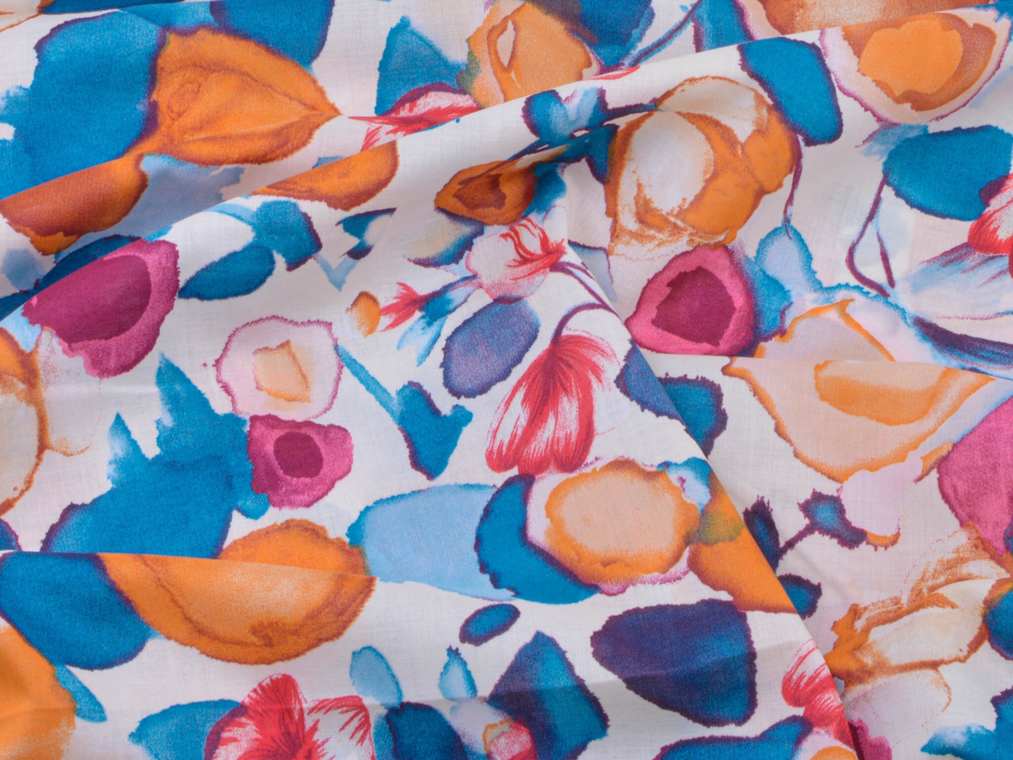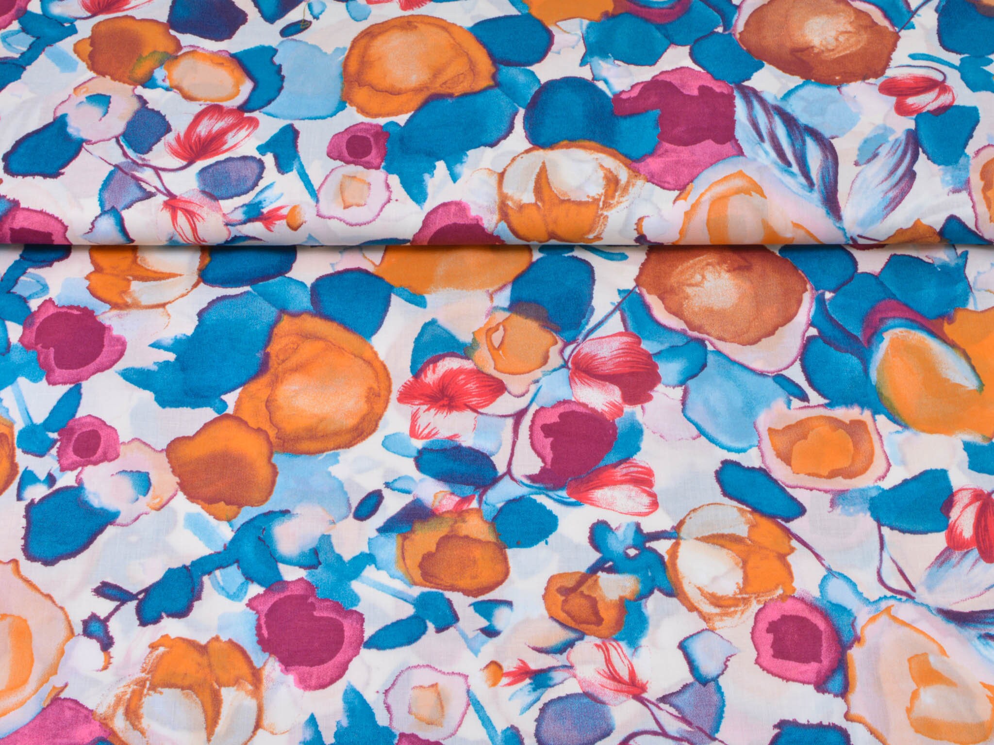 Hochwertiger Blusenstoff mit aus Italien. Weißer Stoff mit pinken Blumen und Kreisen in petrol und orange. Der Stoff ist perfekt für Sommerblusen, Röcke, Kleider und vieles mehr.