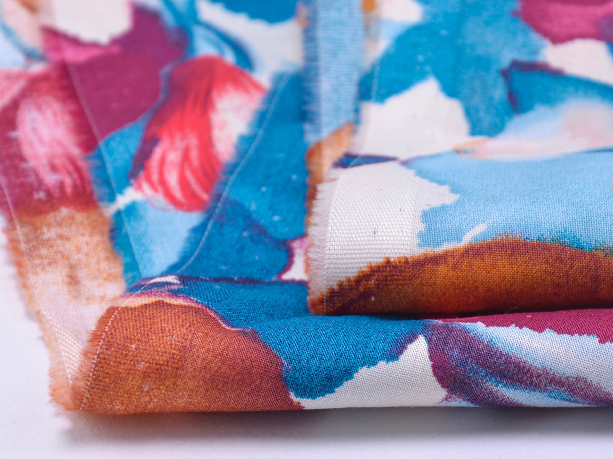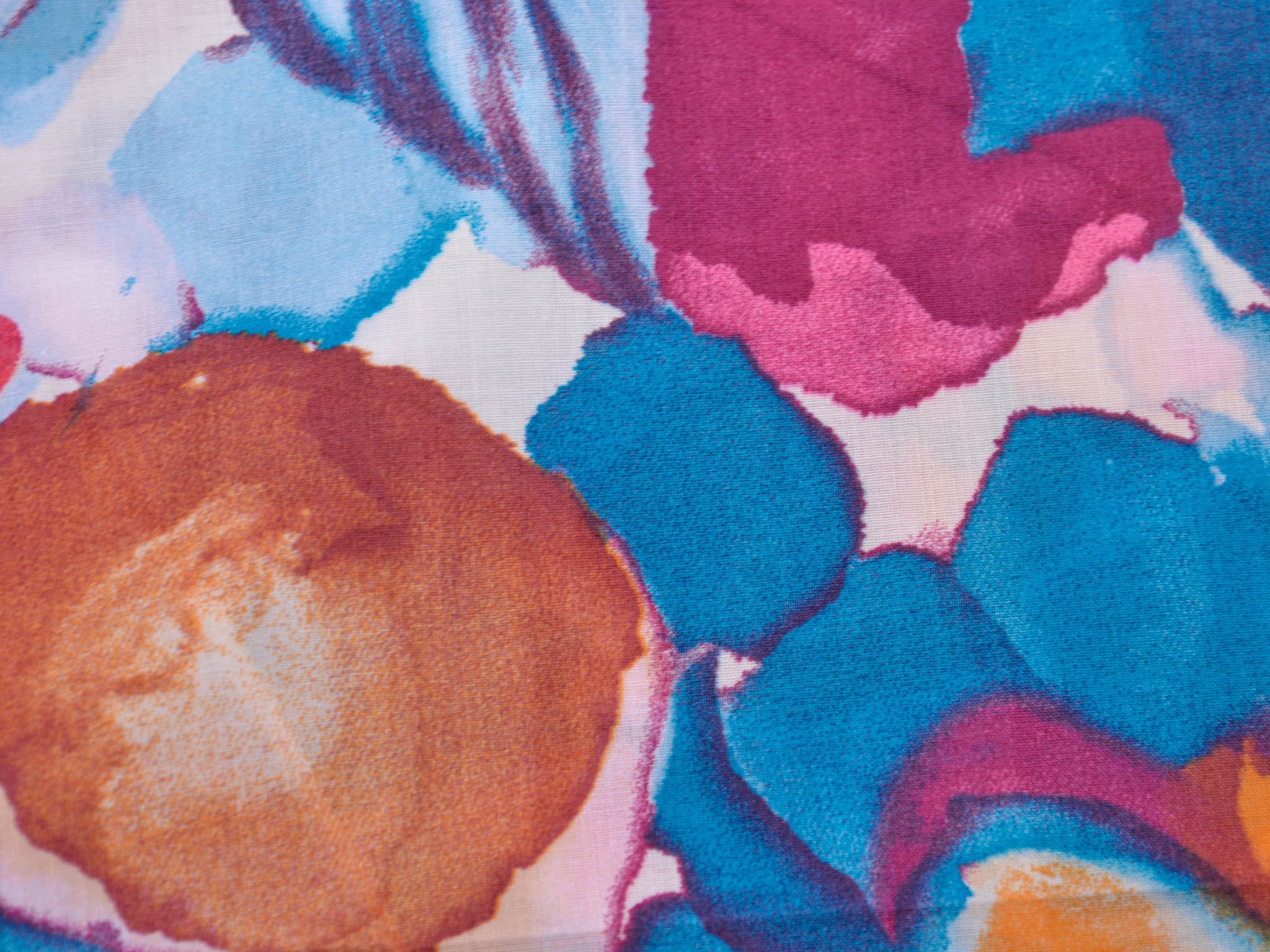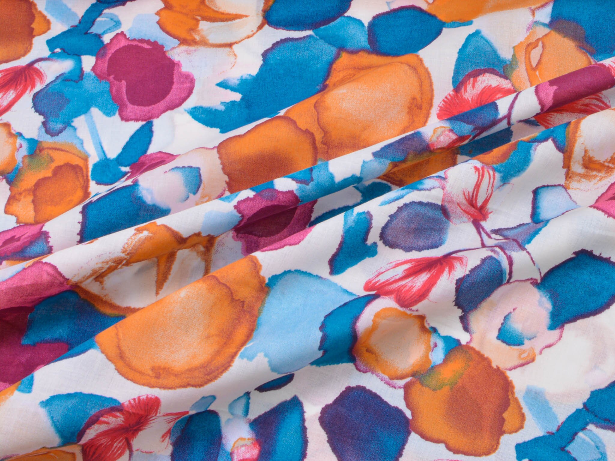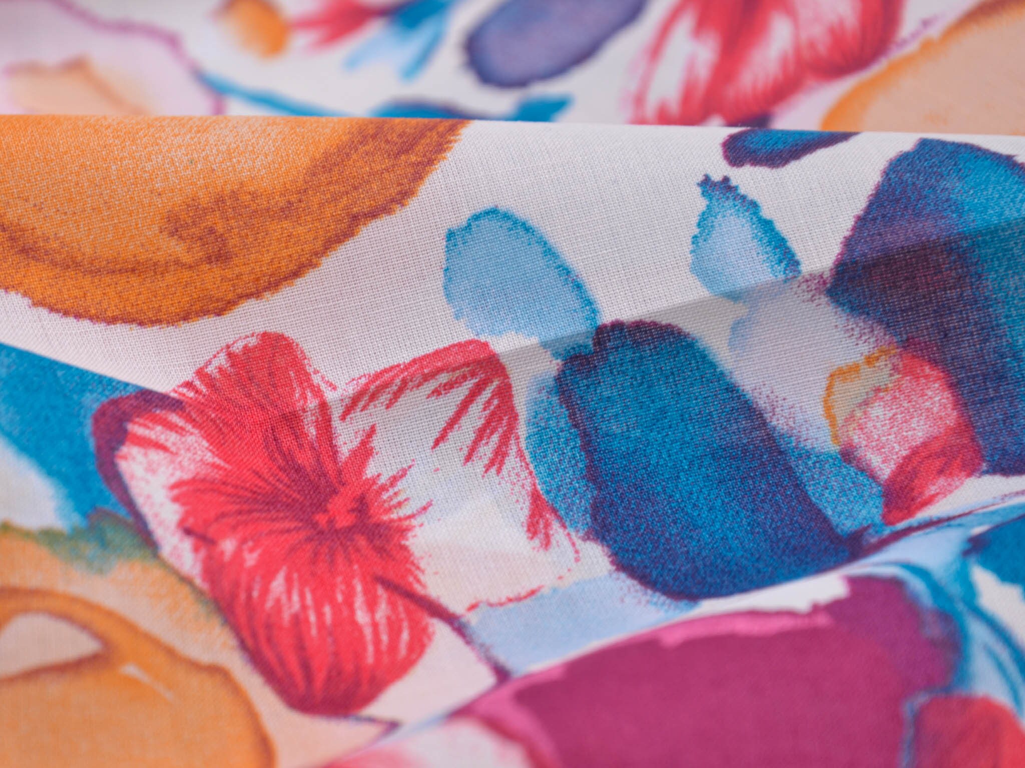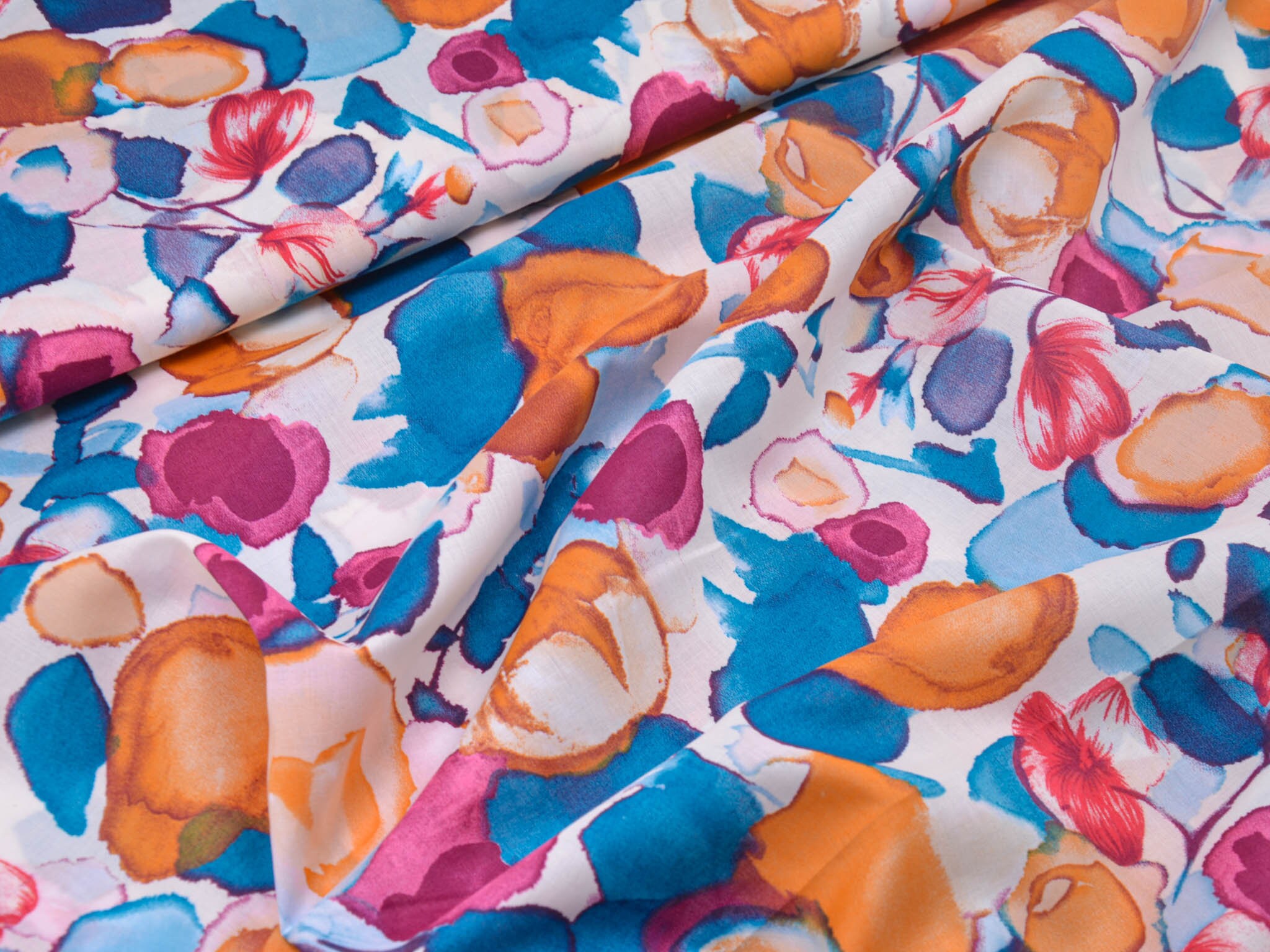 Hochwertiger Blusenstoff mit aus Italien. Weißer Stoff mit pinken Blumen und Kreisen in petrol und orange. Der Stoff ist perfekt für Sommerblusen, Röcke, Kleider und vieles mehr.