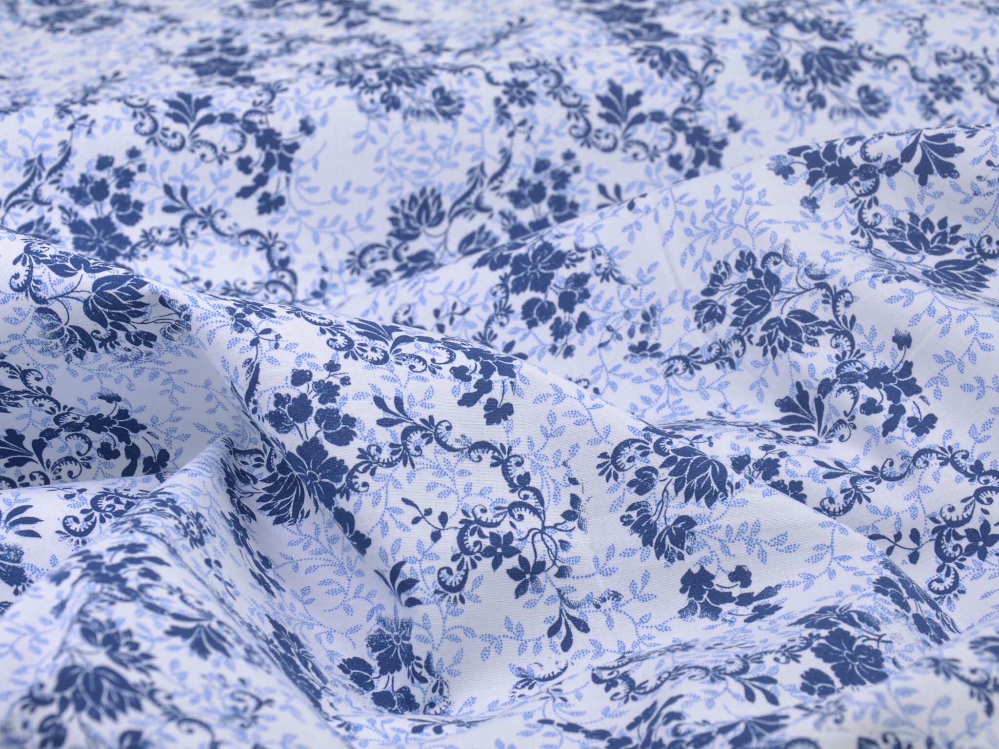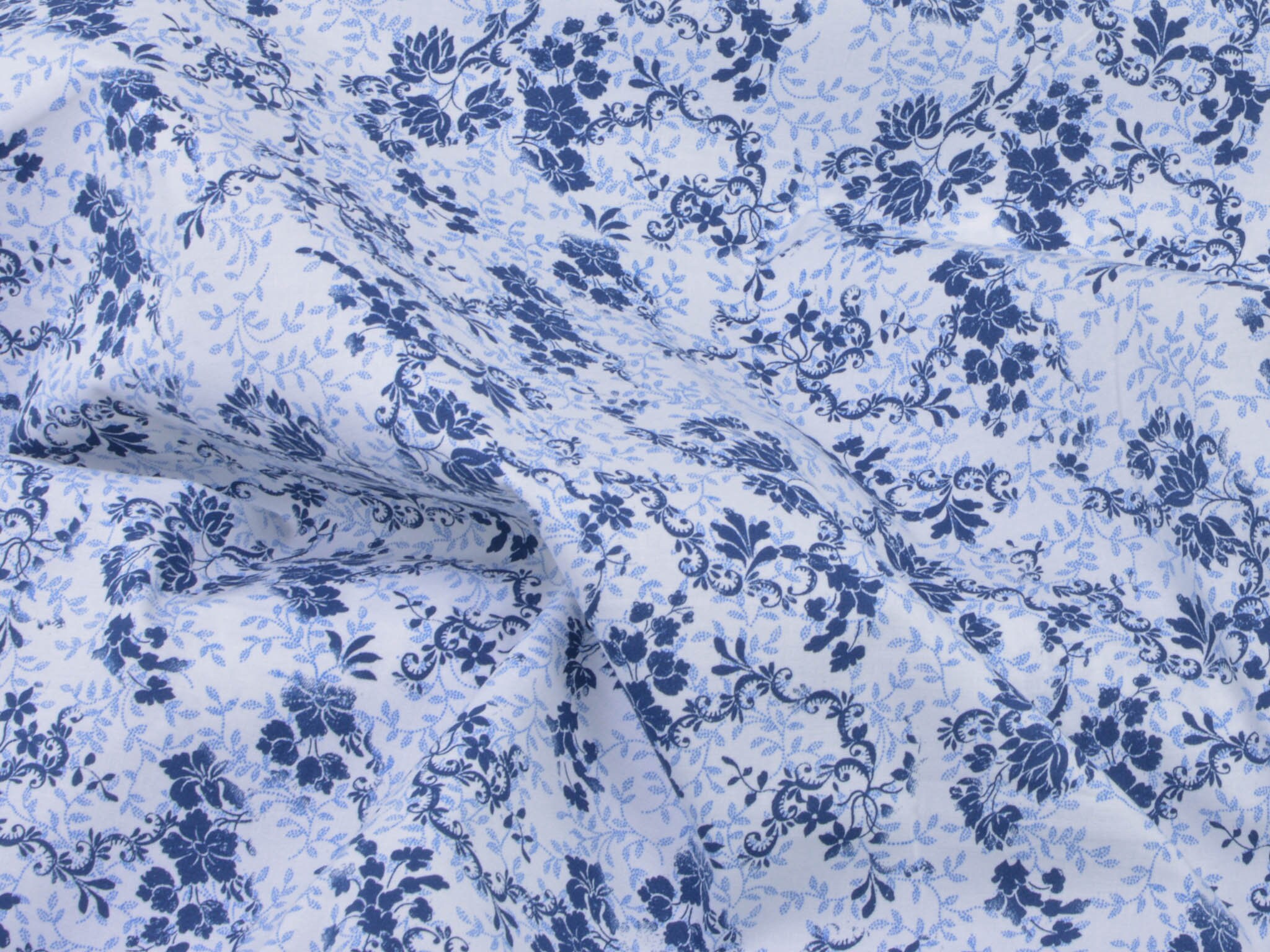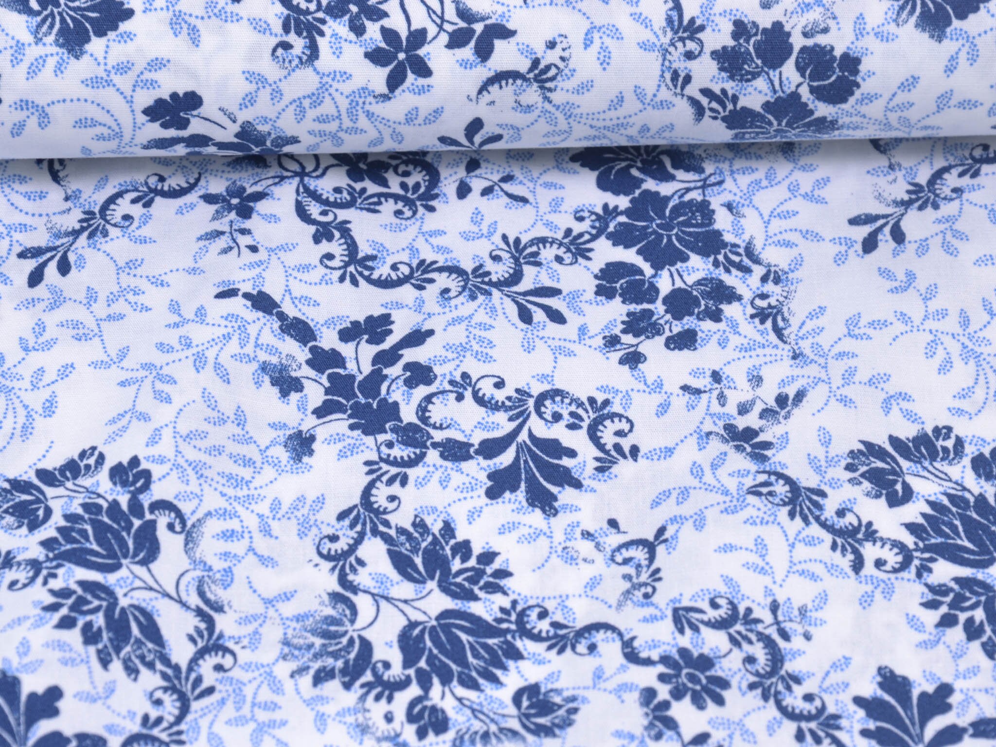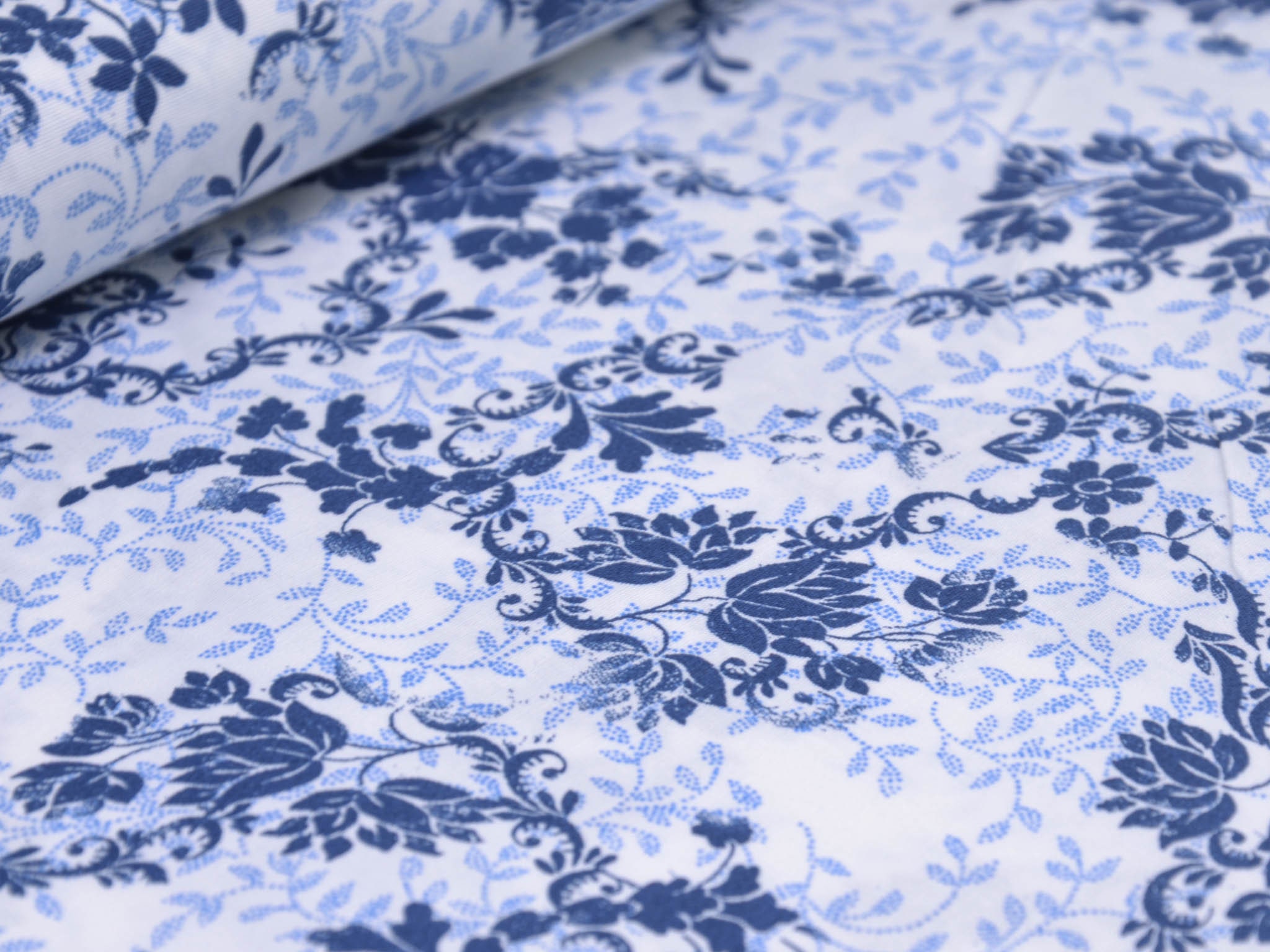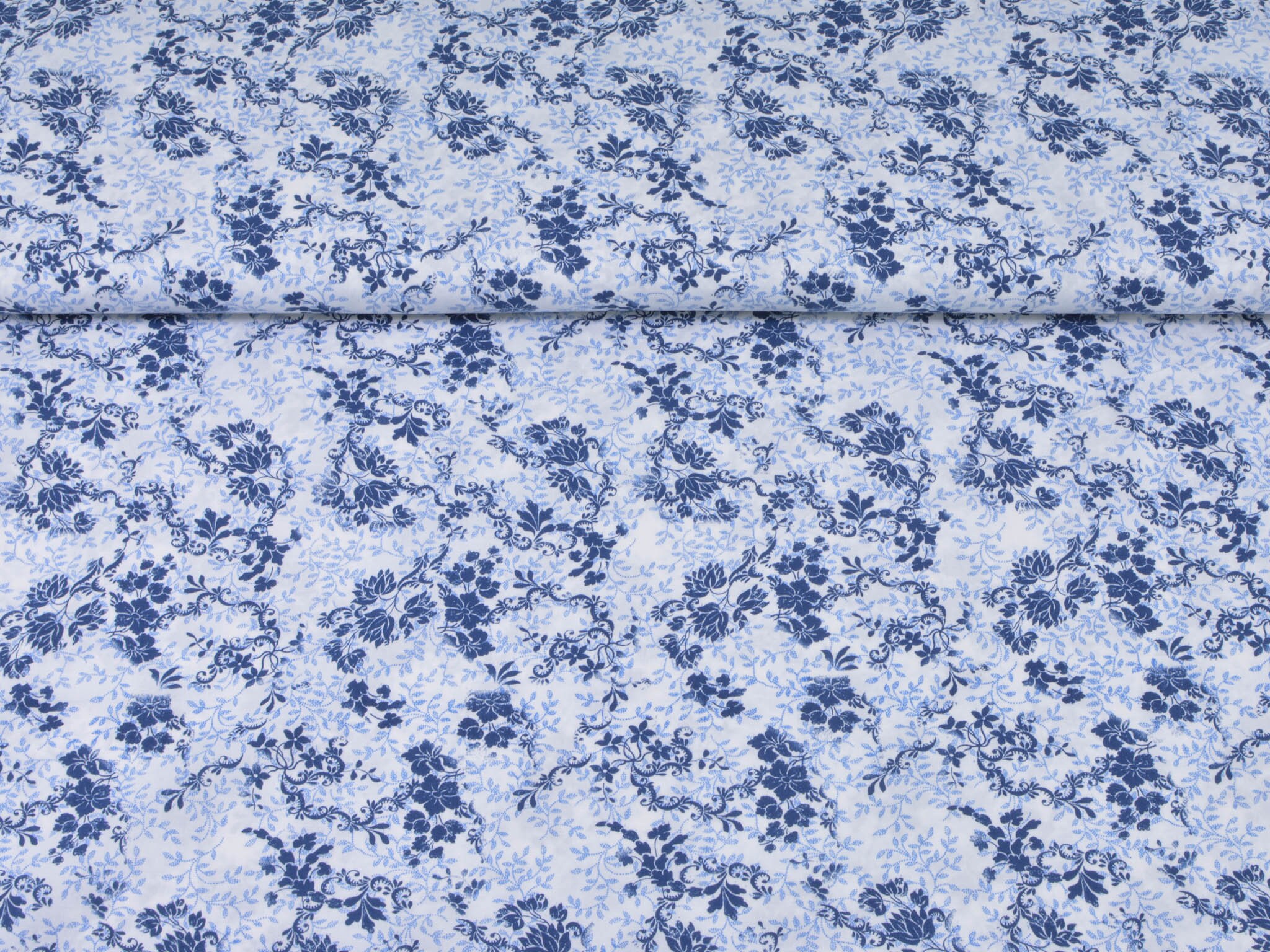 Hochwertiger Blusenstoff mit Elastan aus Italien. Weißer Stoff mit kleinen dunkelblauen Blumen und hellblauen, kleinen Blättern. Der Stoff ist perfekt für Sommerblusen, Röcke, Kleider und vieles mehr.