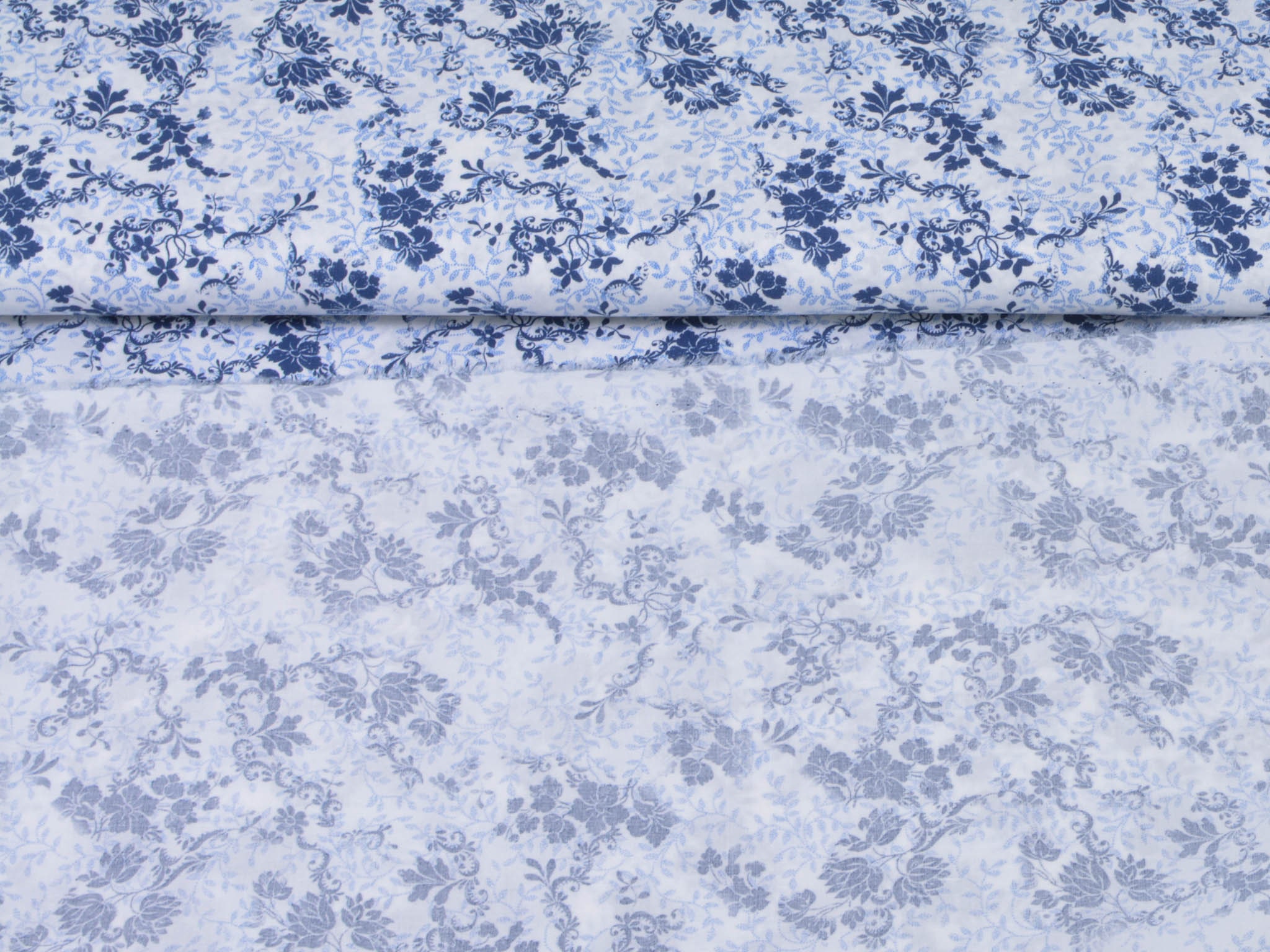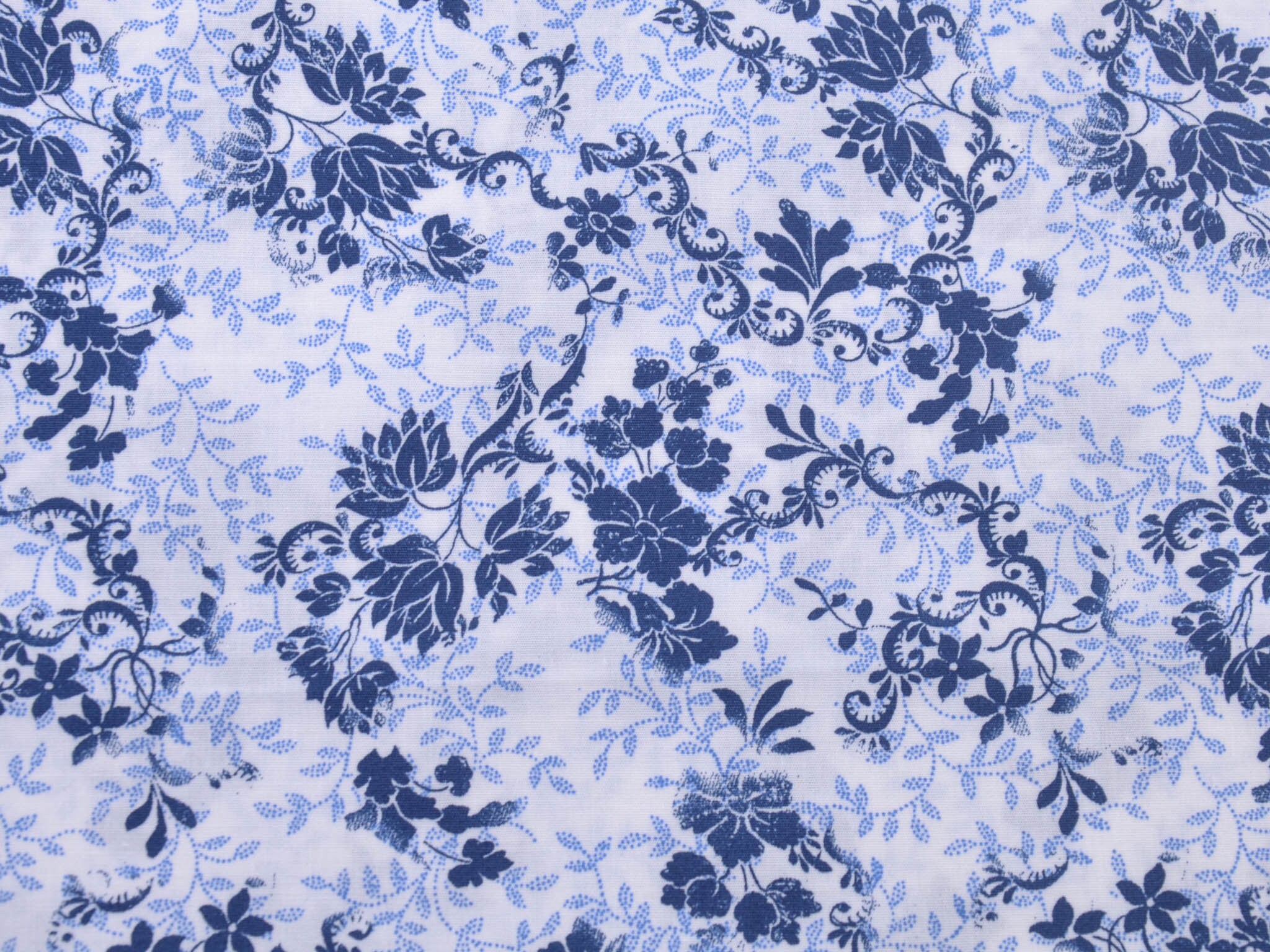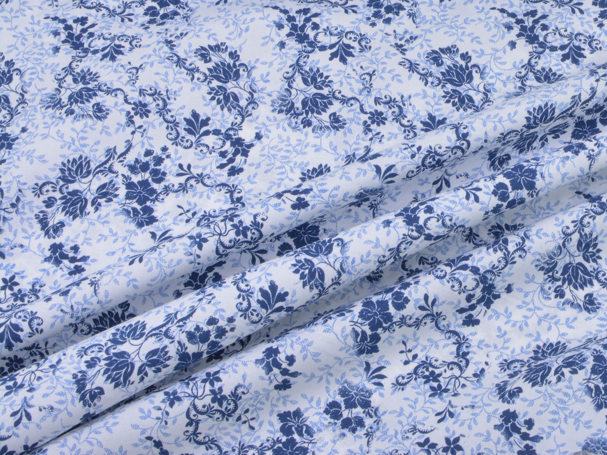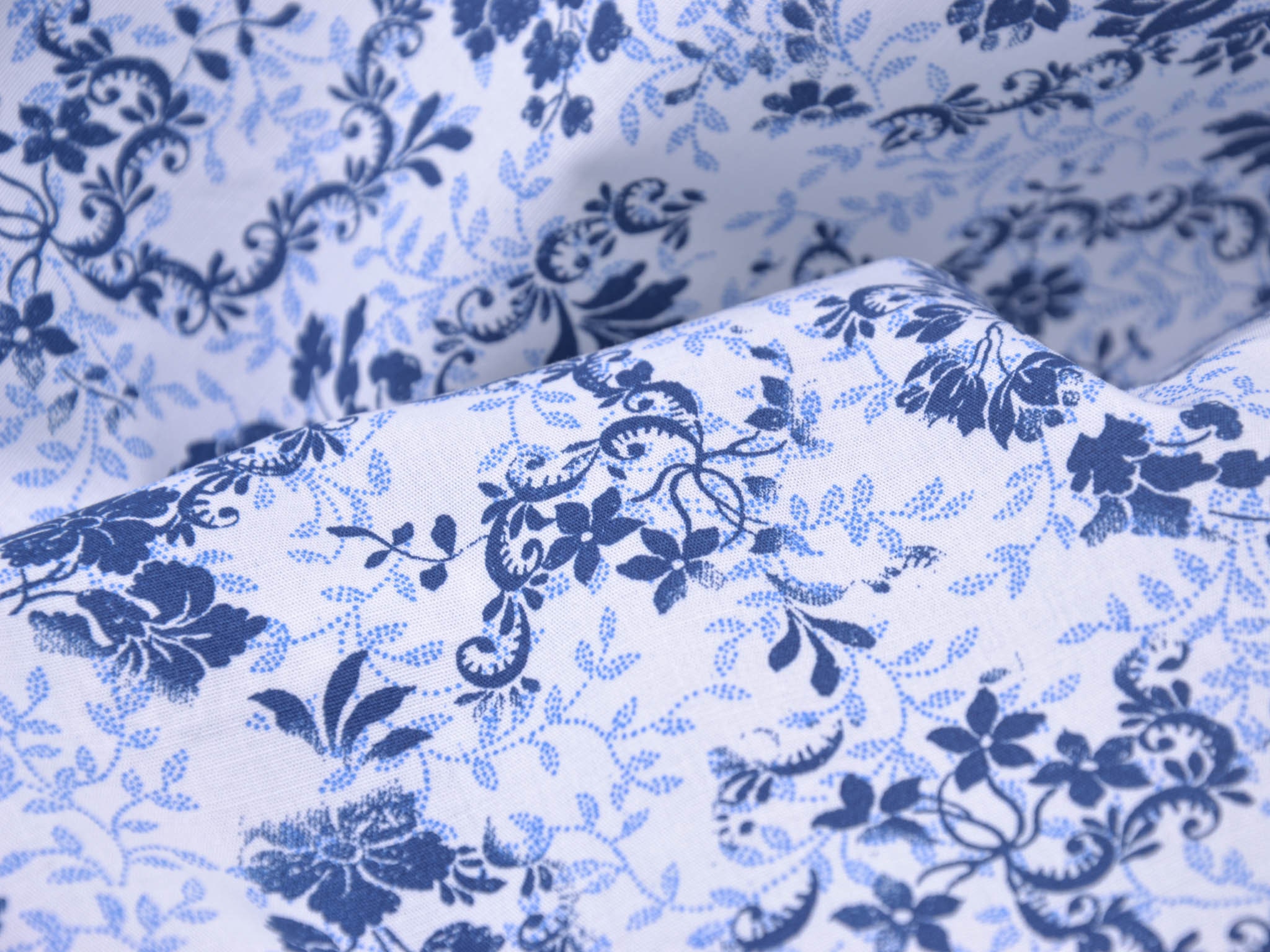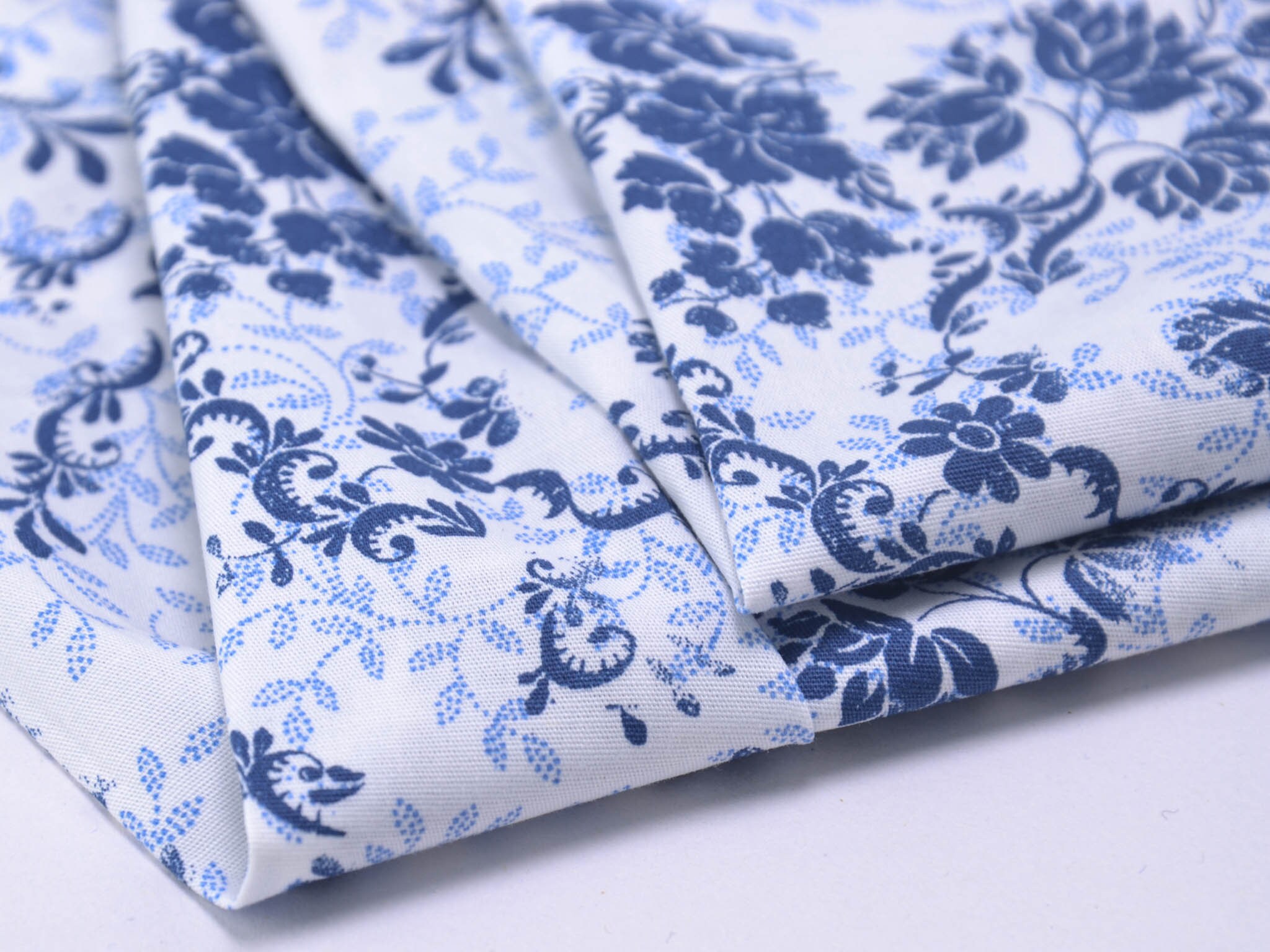 Hochwertiger Blusenstoff mit Elastan aus Italien. Weißer Stoff mit kleinen dunkelblauen Blumen und hellblauen, kleinen Blättern. Der Stoff ist perfekt für Sommerblusen, Röcke, Kleider und vieles mehr.