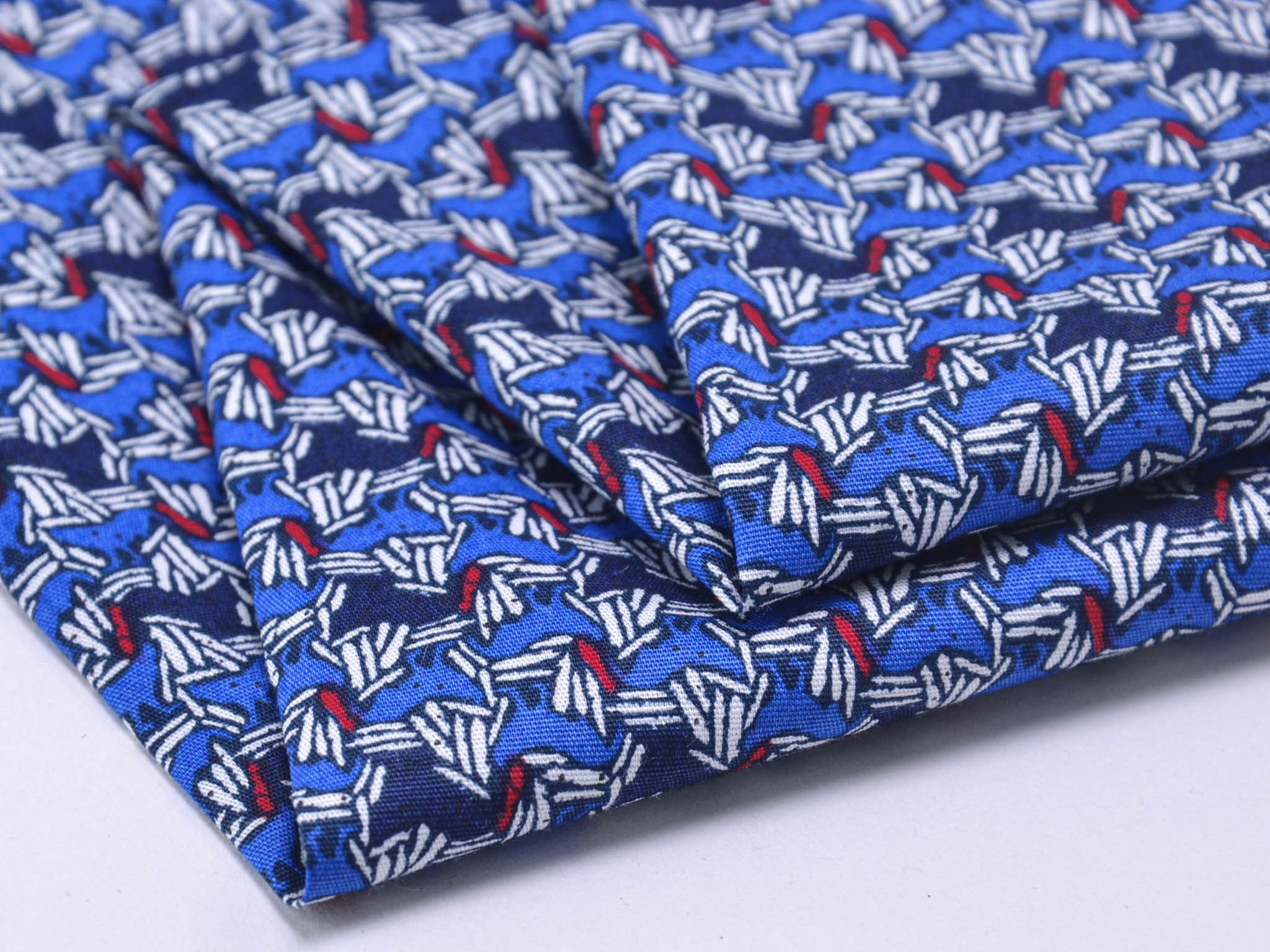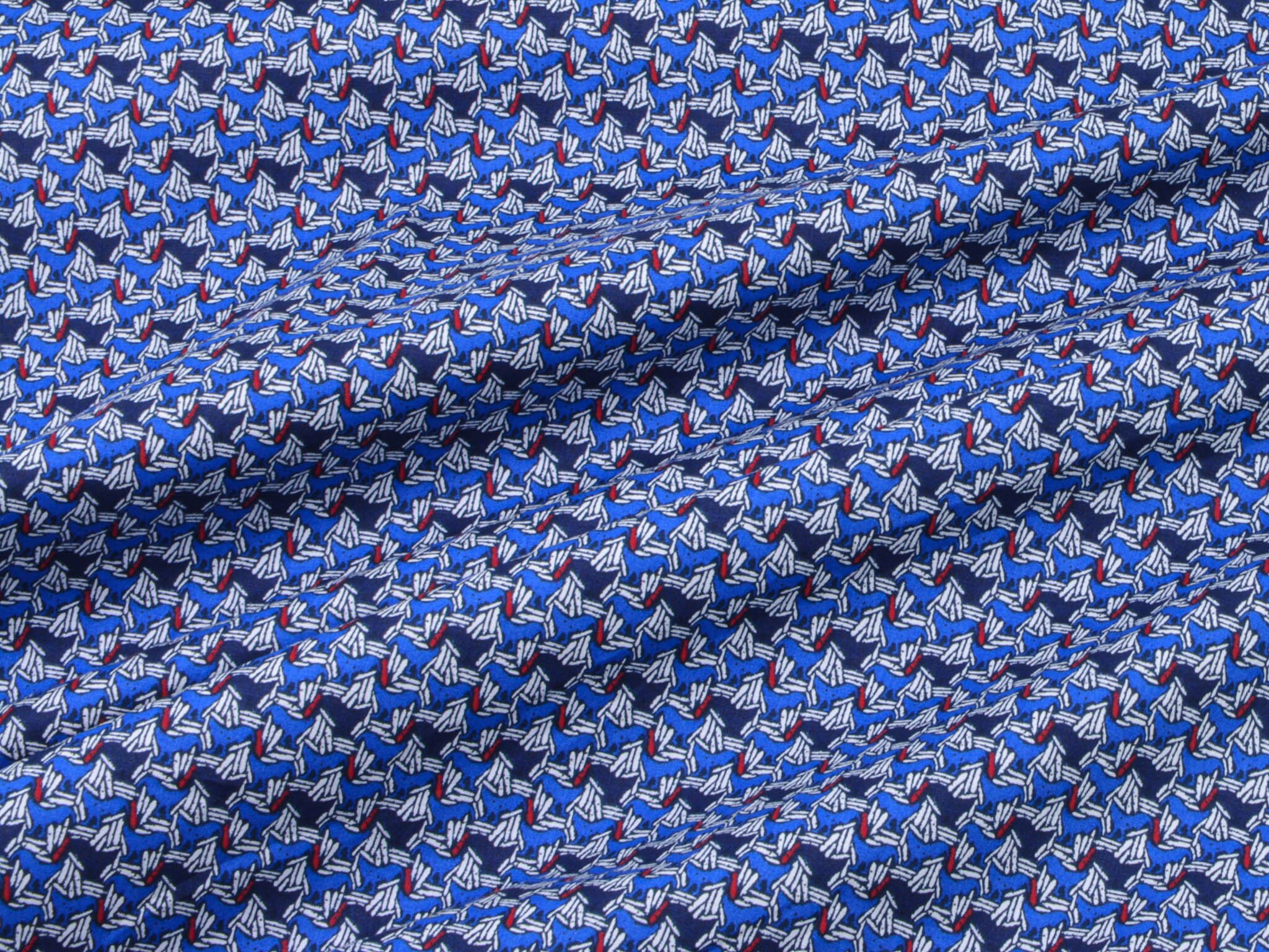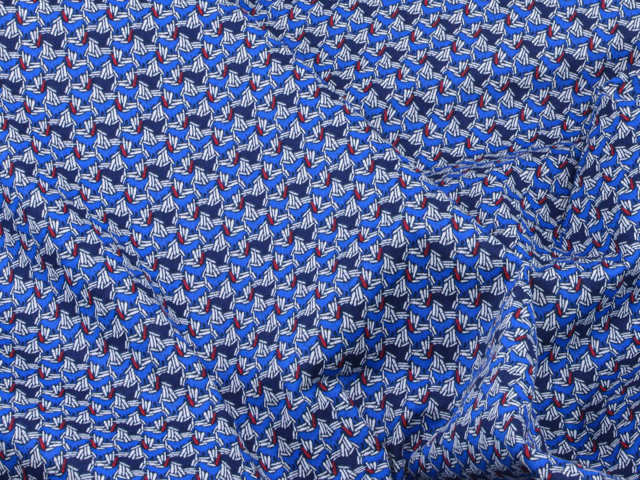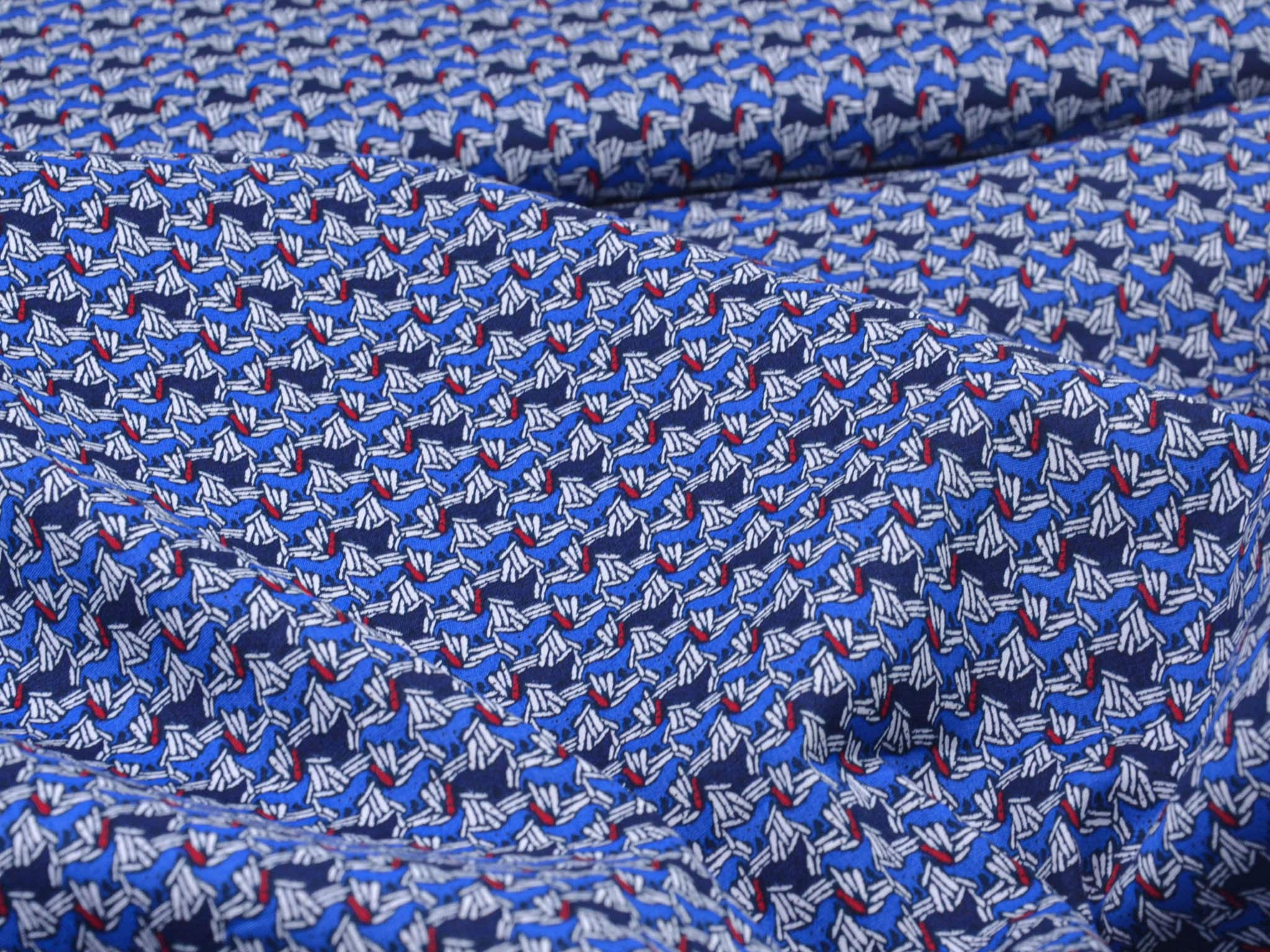 Hochwertiger Blusenstoff mit Elastan aus Italien. Blauer Stoff mit abstraktem Muster in dunkelblau, weiß, rot. Der Stoff ist perfekt für Sommerblusen, Röcke, Kleider und vieles mehr.