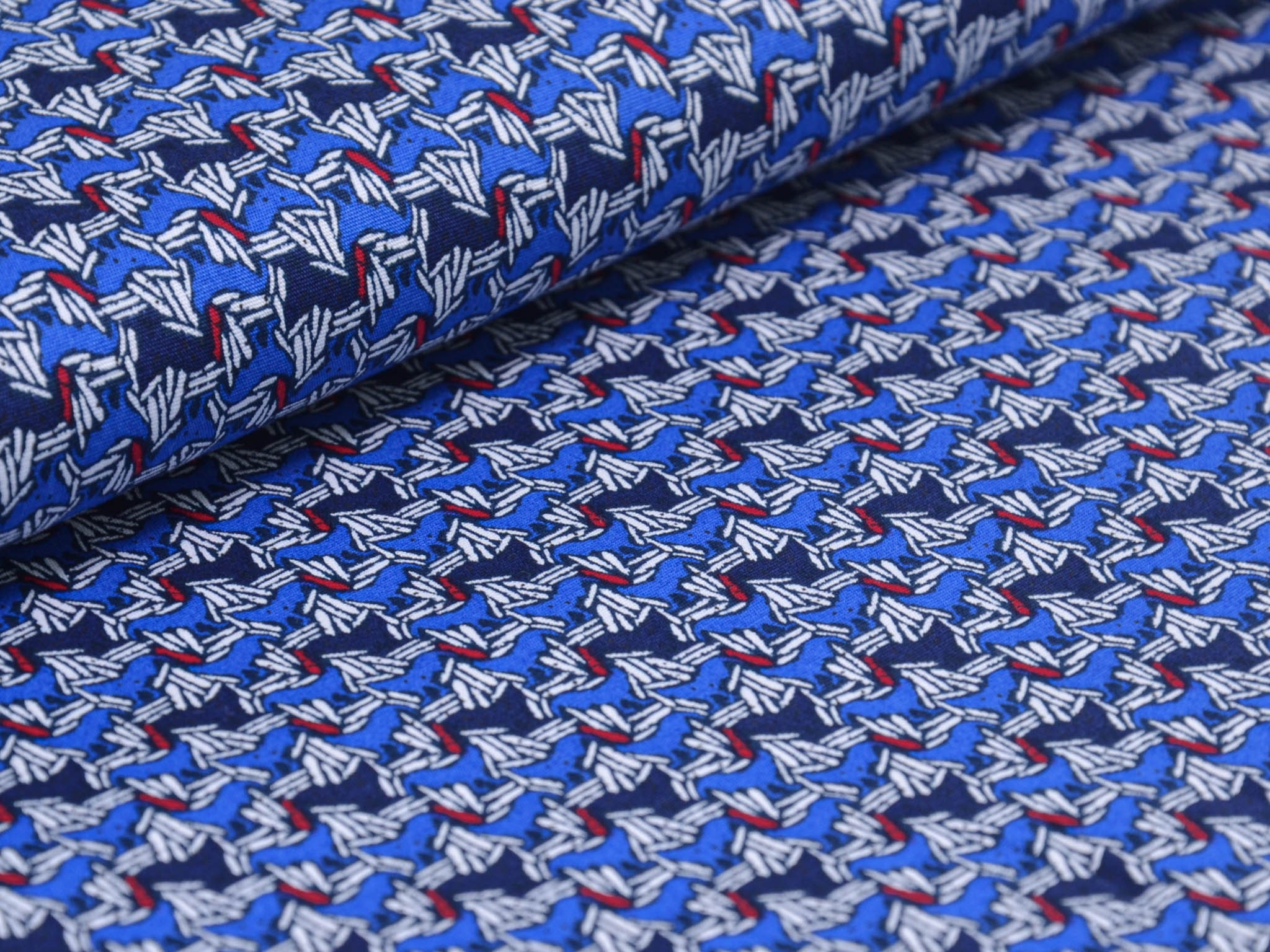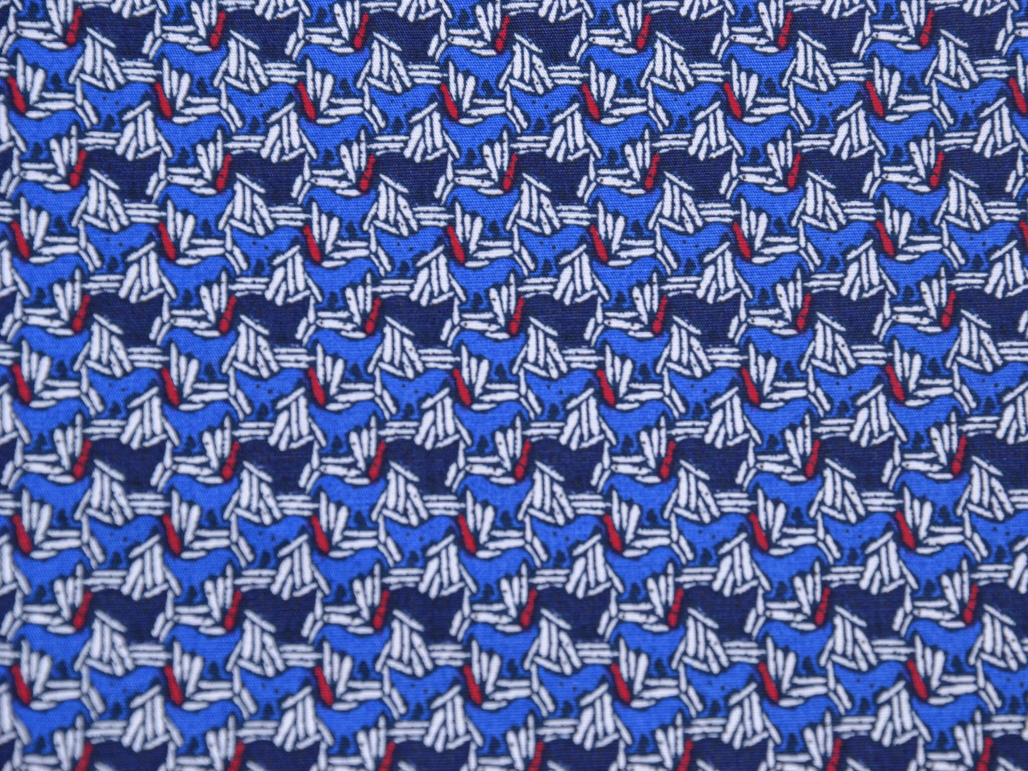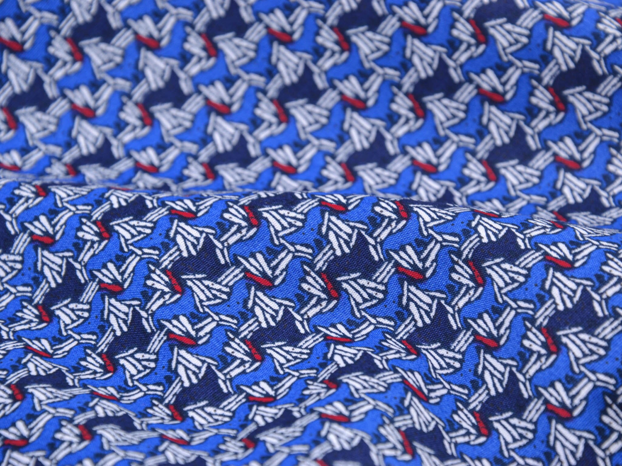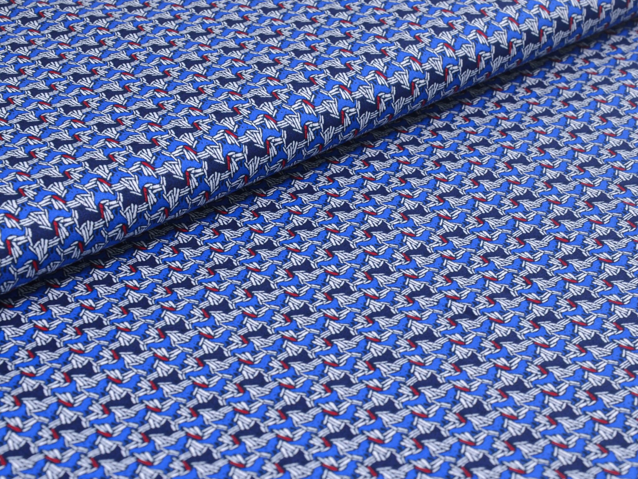Hochwertiger Blusenstoff mit Elastan aus Italien. Blauer Stoff mit abstraktem Muster in dunkelblau, weiß, rot. Der Stoff ist perfekt für Sommerblusen, Röcke, Kleider und vieles mehr.