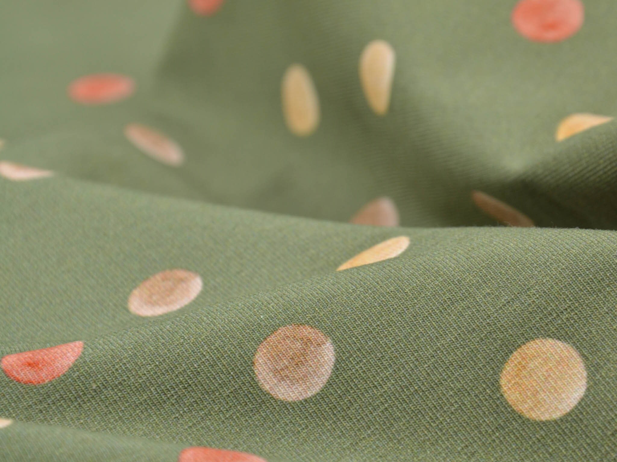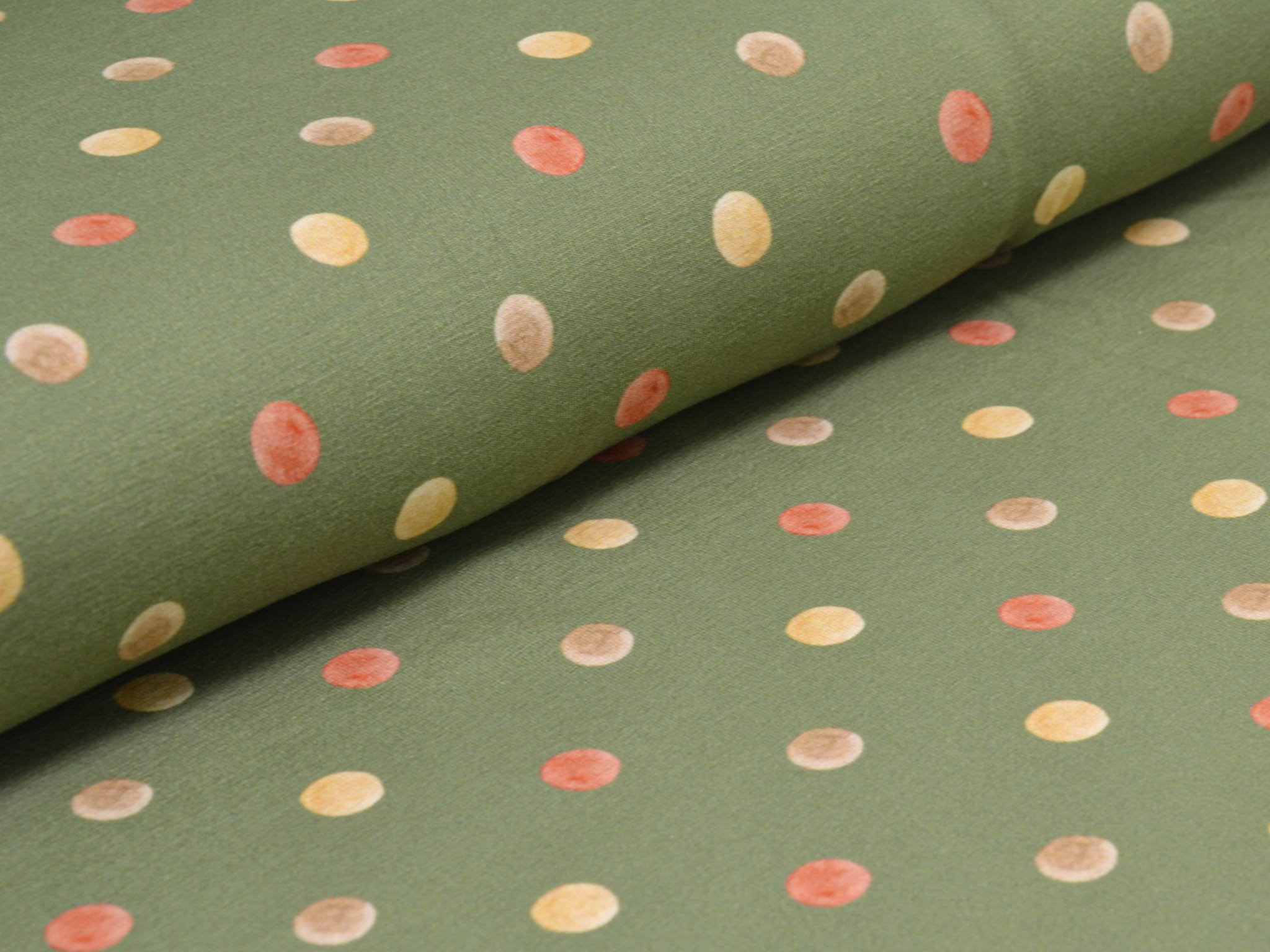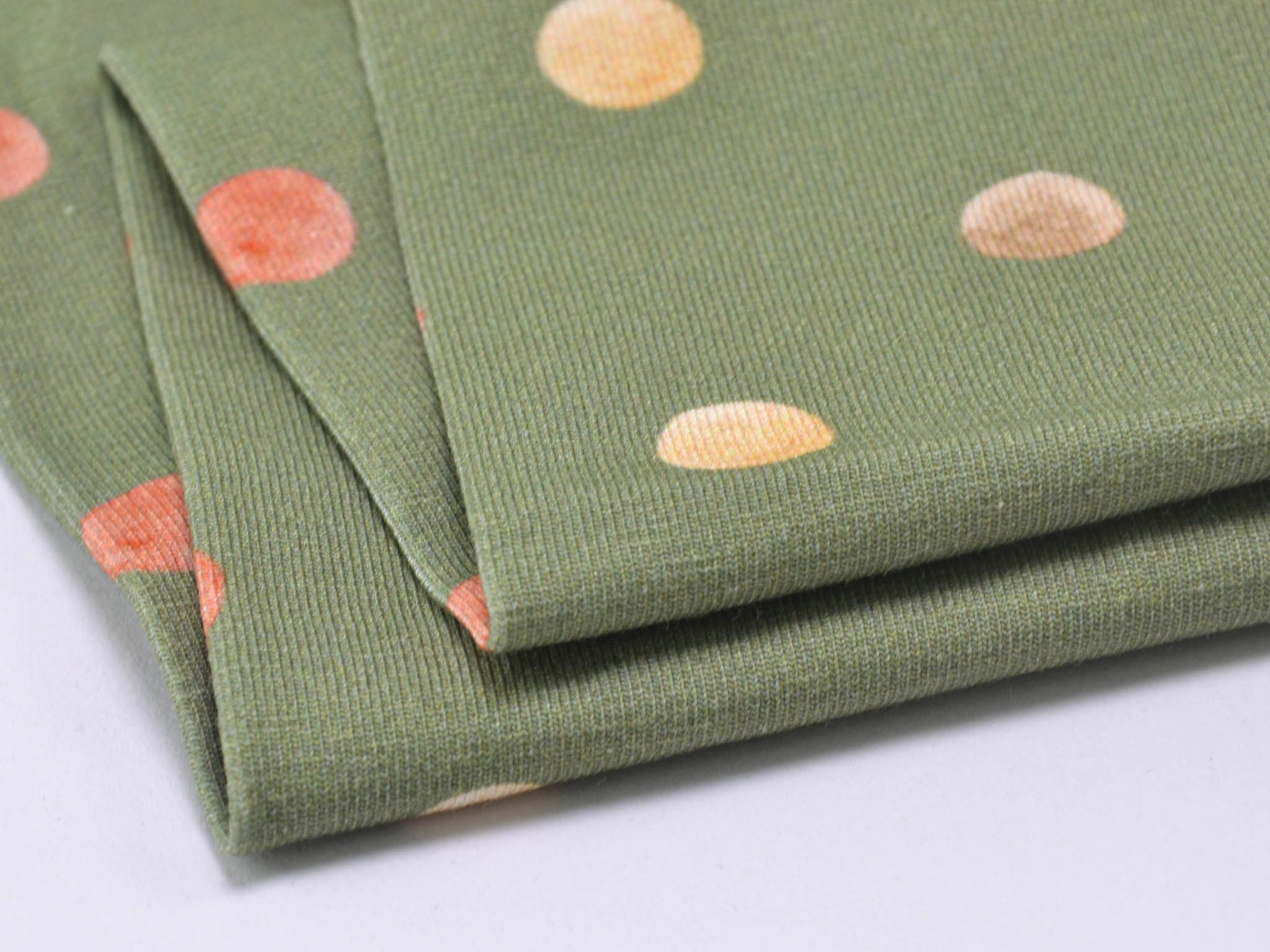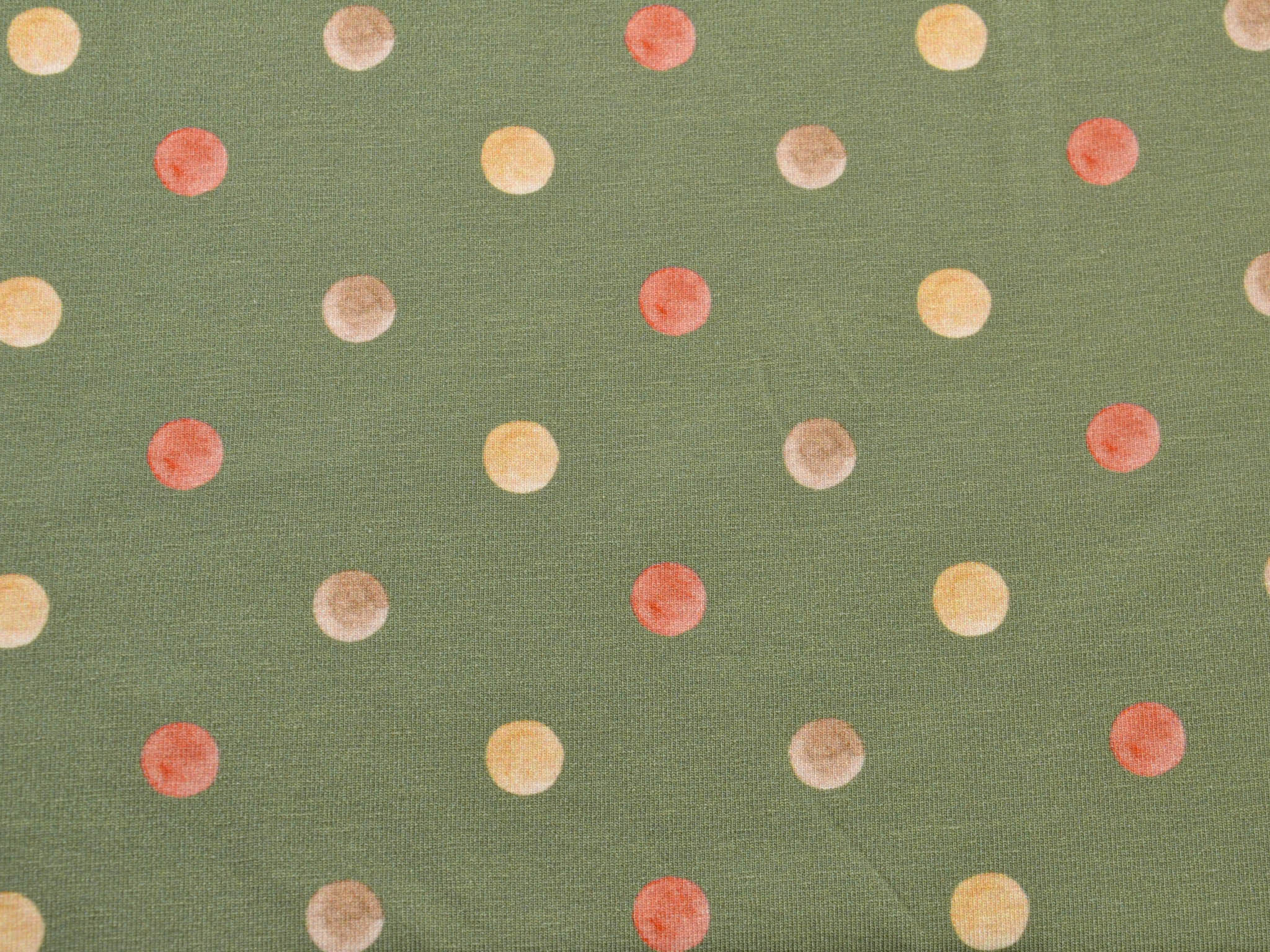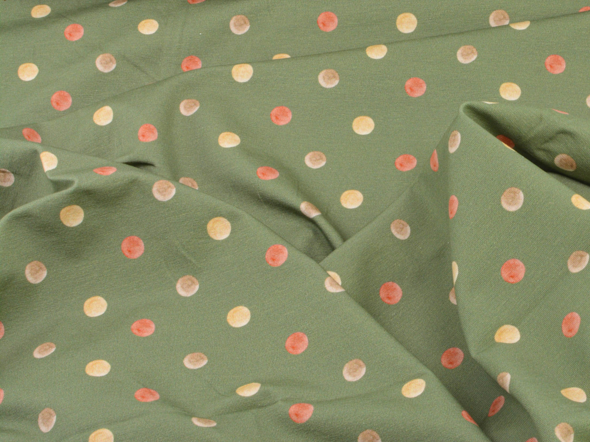 Grüner Baumwolljersey mit Punkten in orange und gelb. Ein Punkt ist etwa 1,2 cm groß. Der Stoff ist glatt und dünn. Er eignet sich wunderbar zum Nähen von T-Shirts, Kleidern, Röcken, Pumphosen, Bodys und vielem mehr.