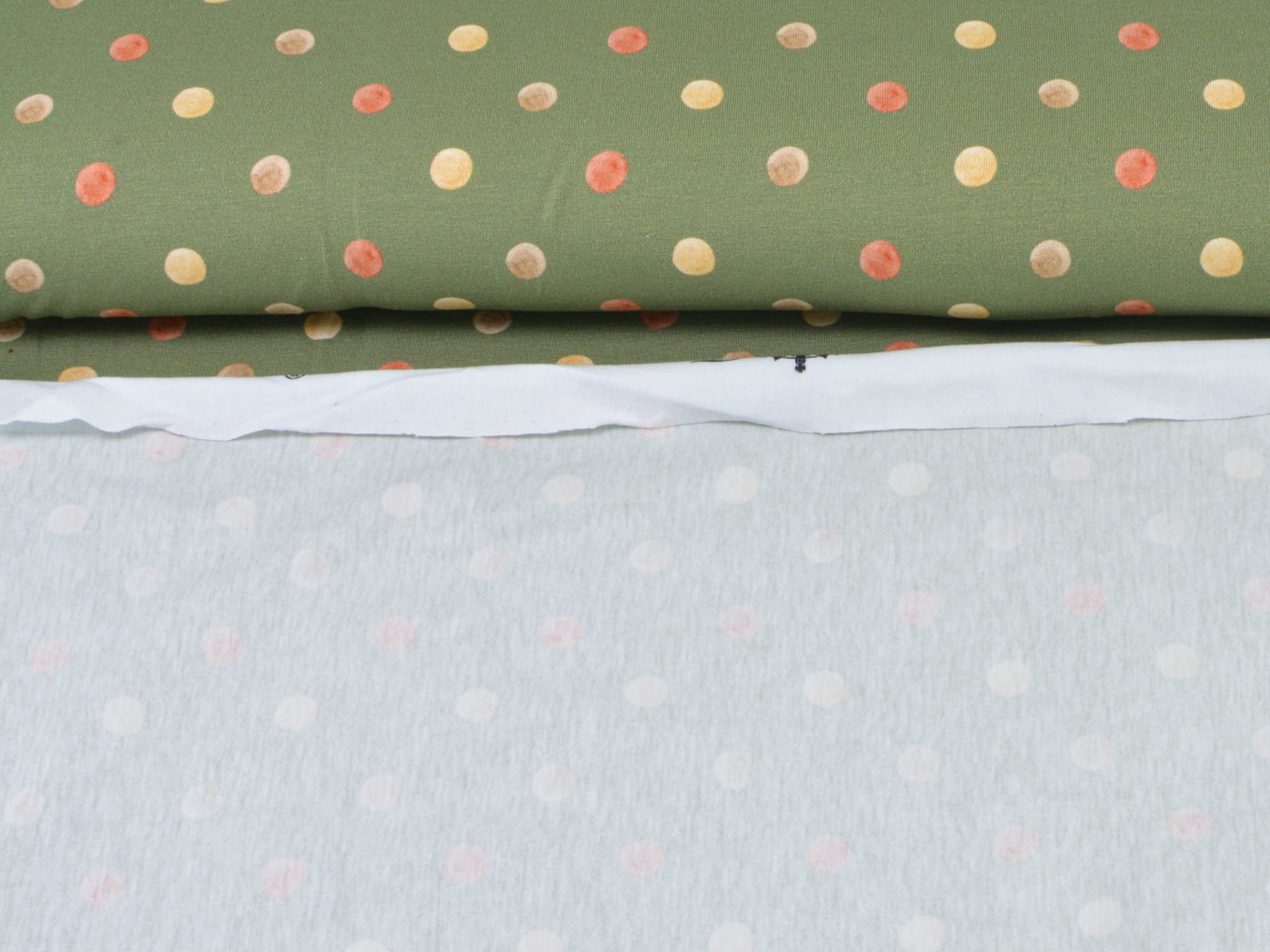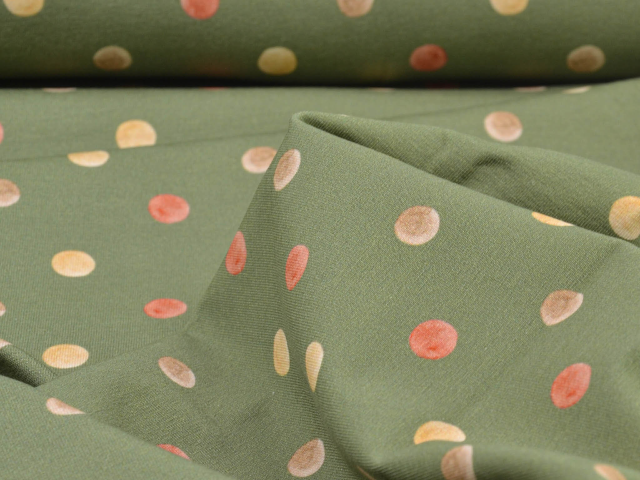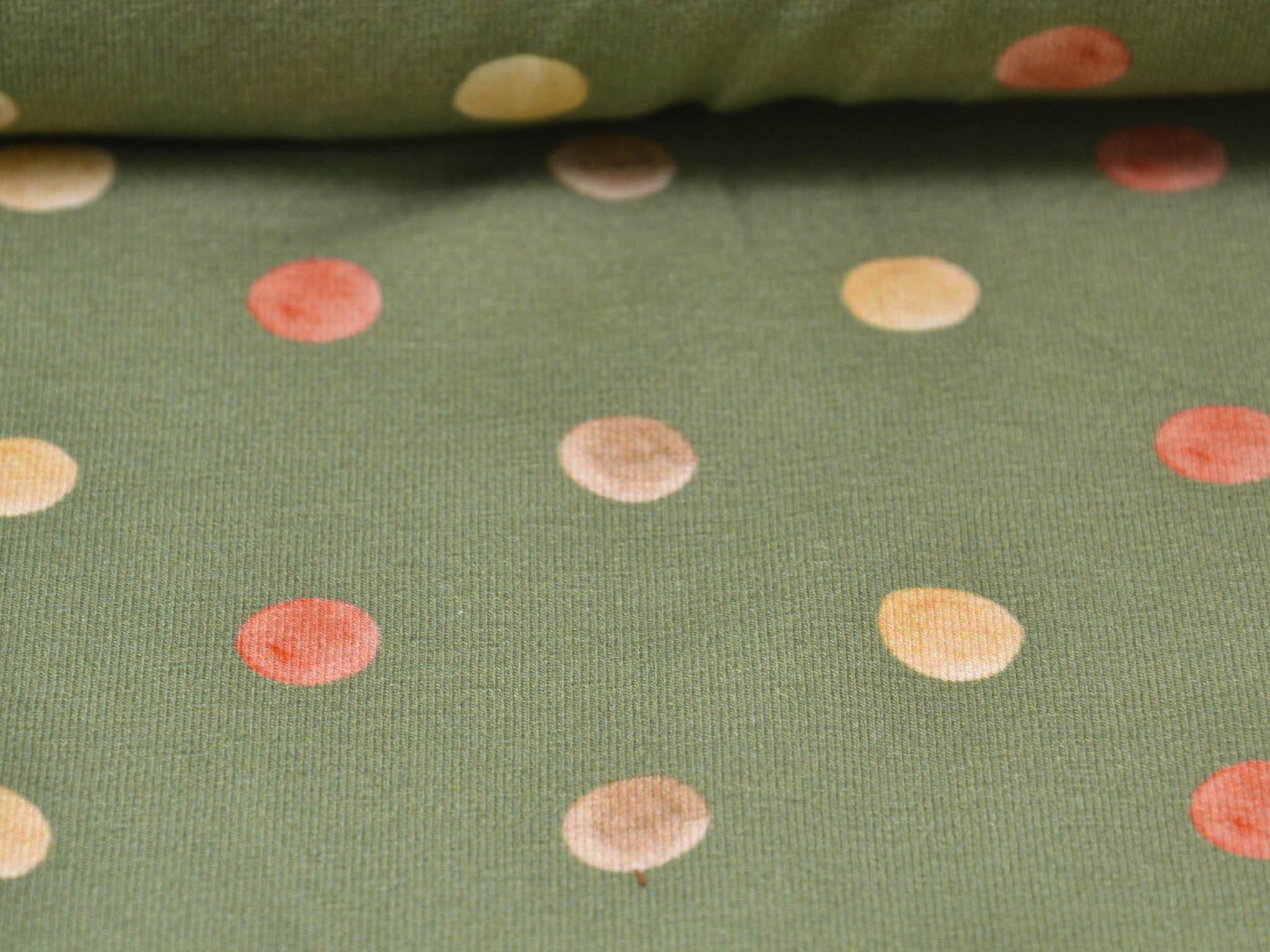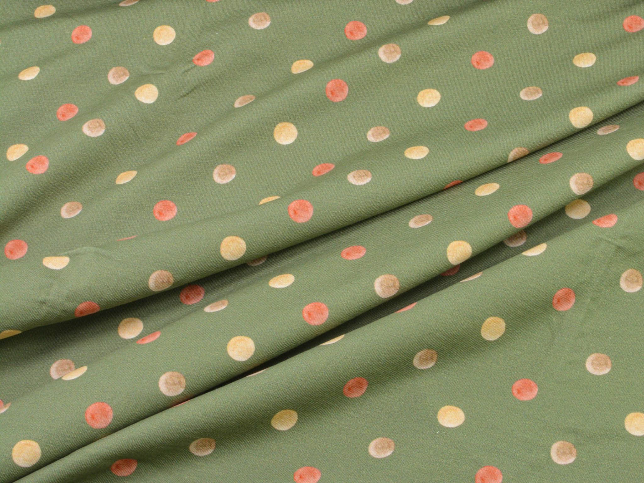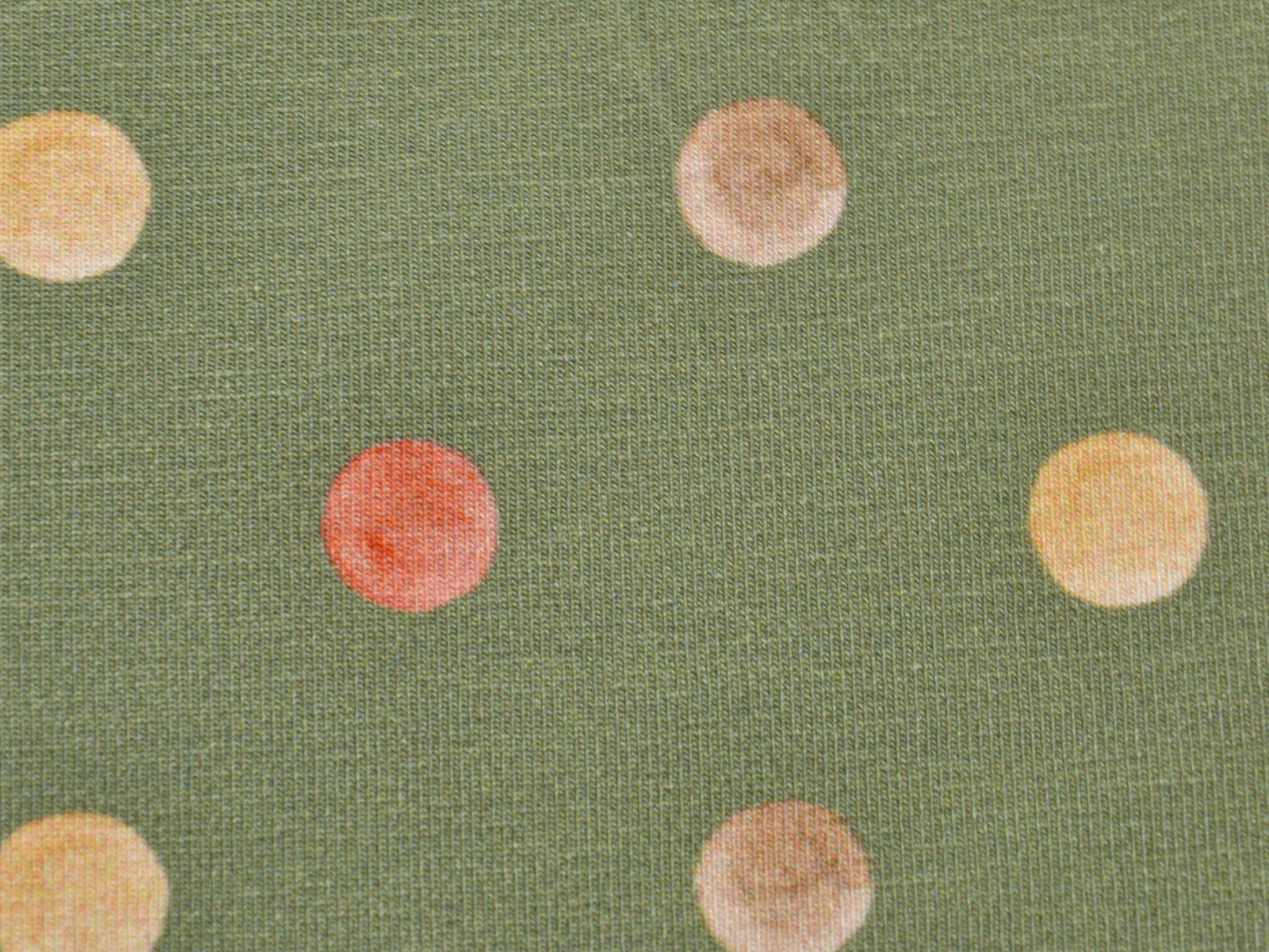 Grüner Baumwolljersey mit Punkten in orange und gelb. Ein Punkt ist etwa 1,2 cm groß. Der Stoff ist glatt und dünn. Er eignet sich wunderbar zum Nähen von T-Shirts, Kleidern, Röcken, Pumphosen, Bodys und vielem mehr.