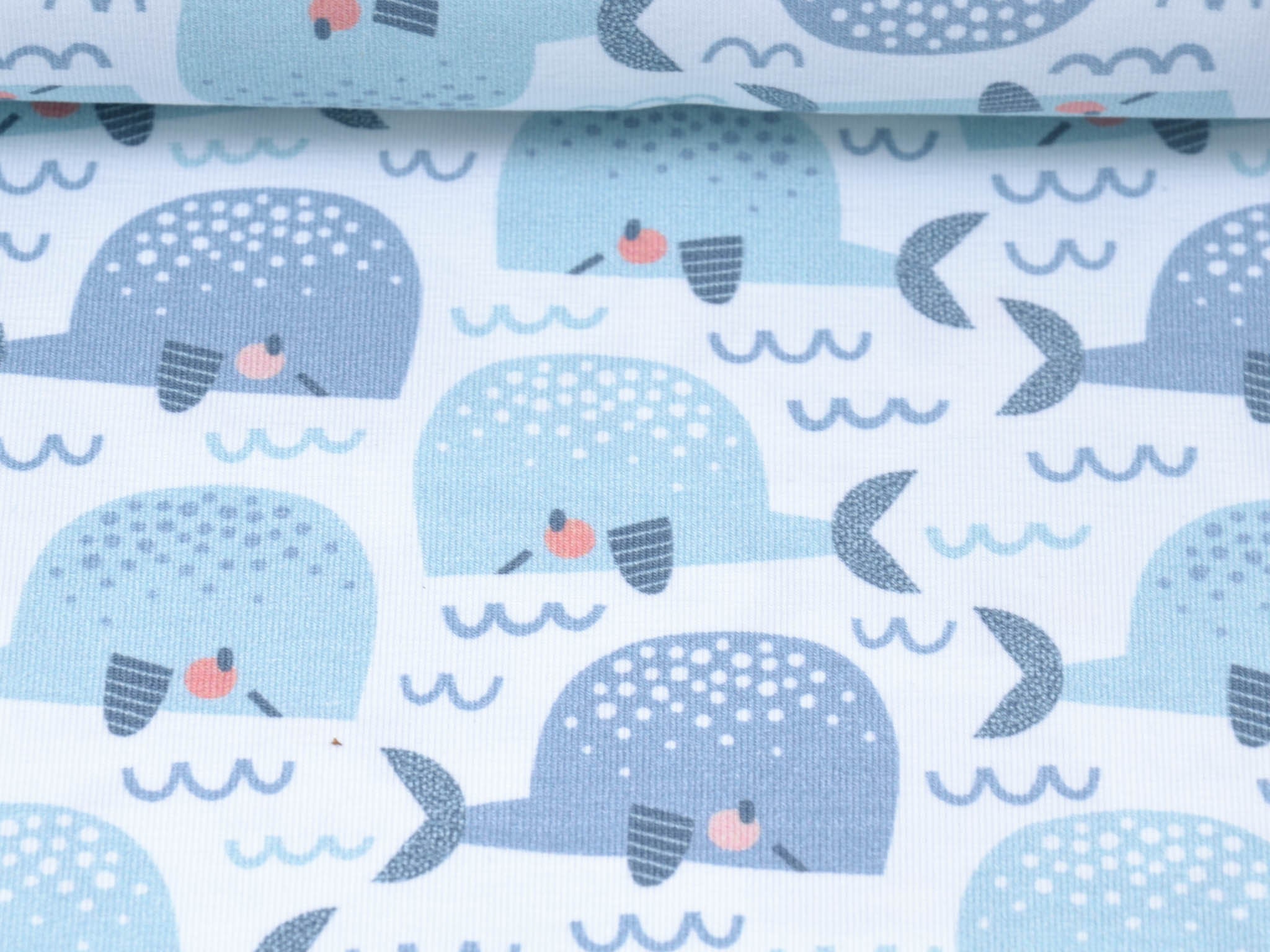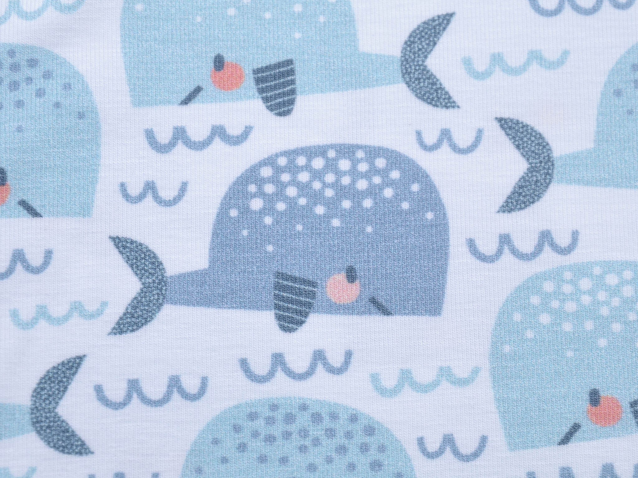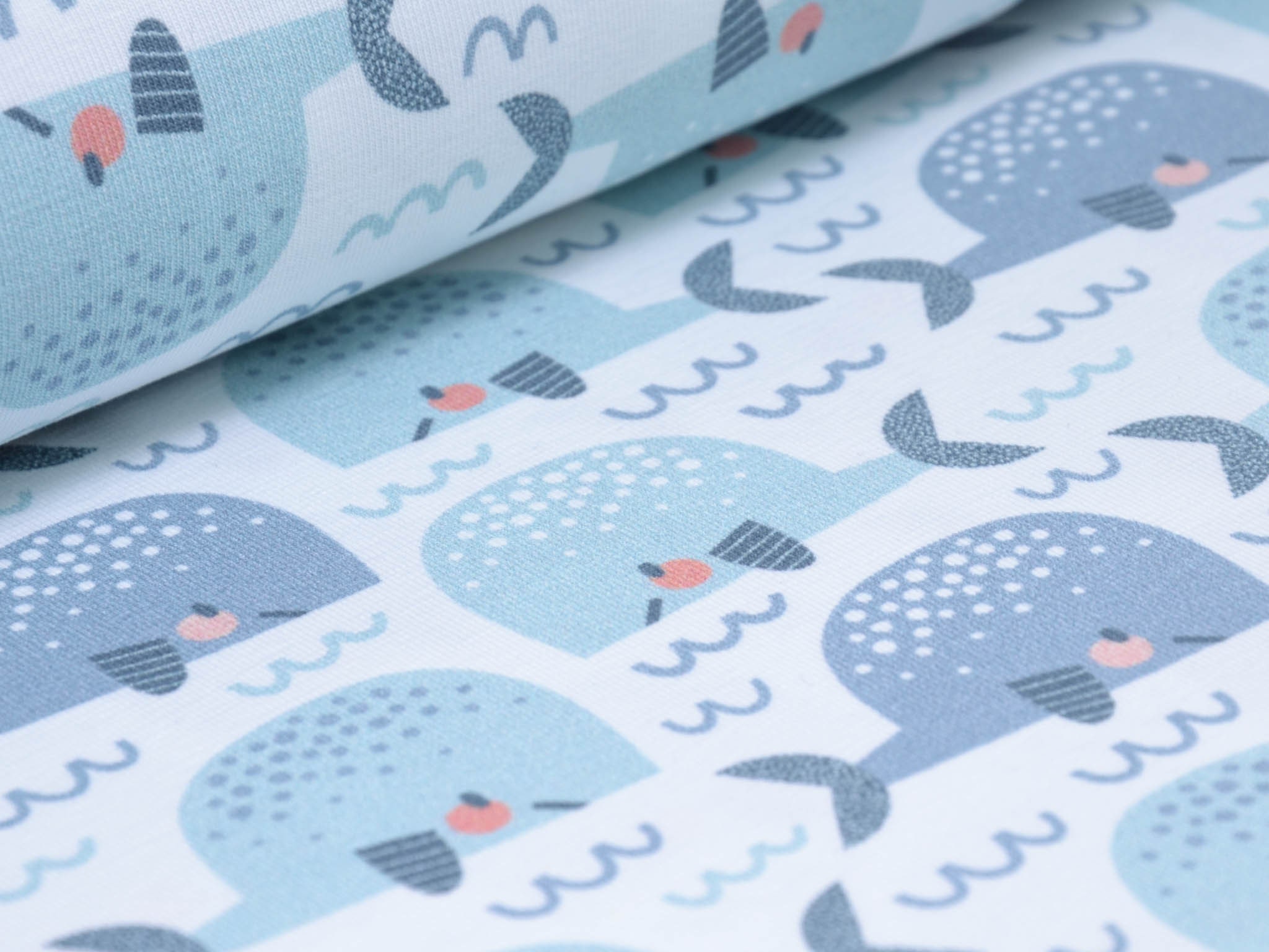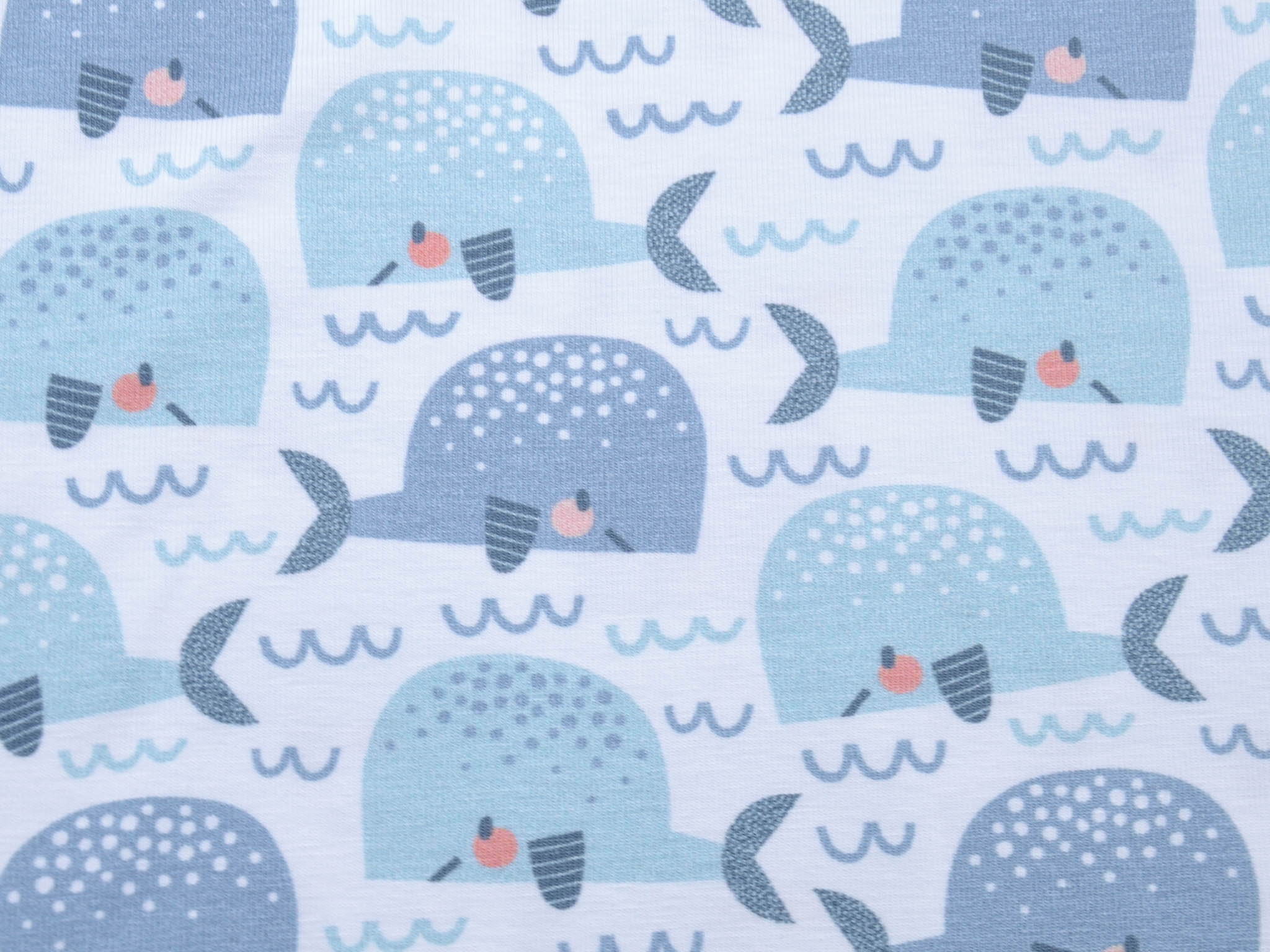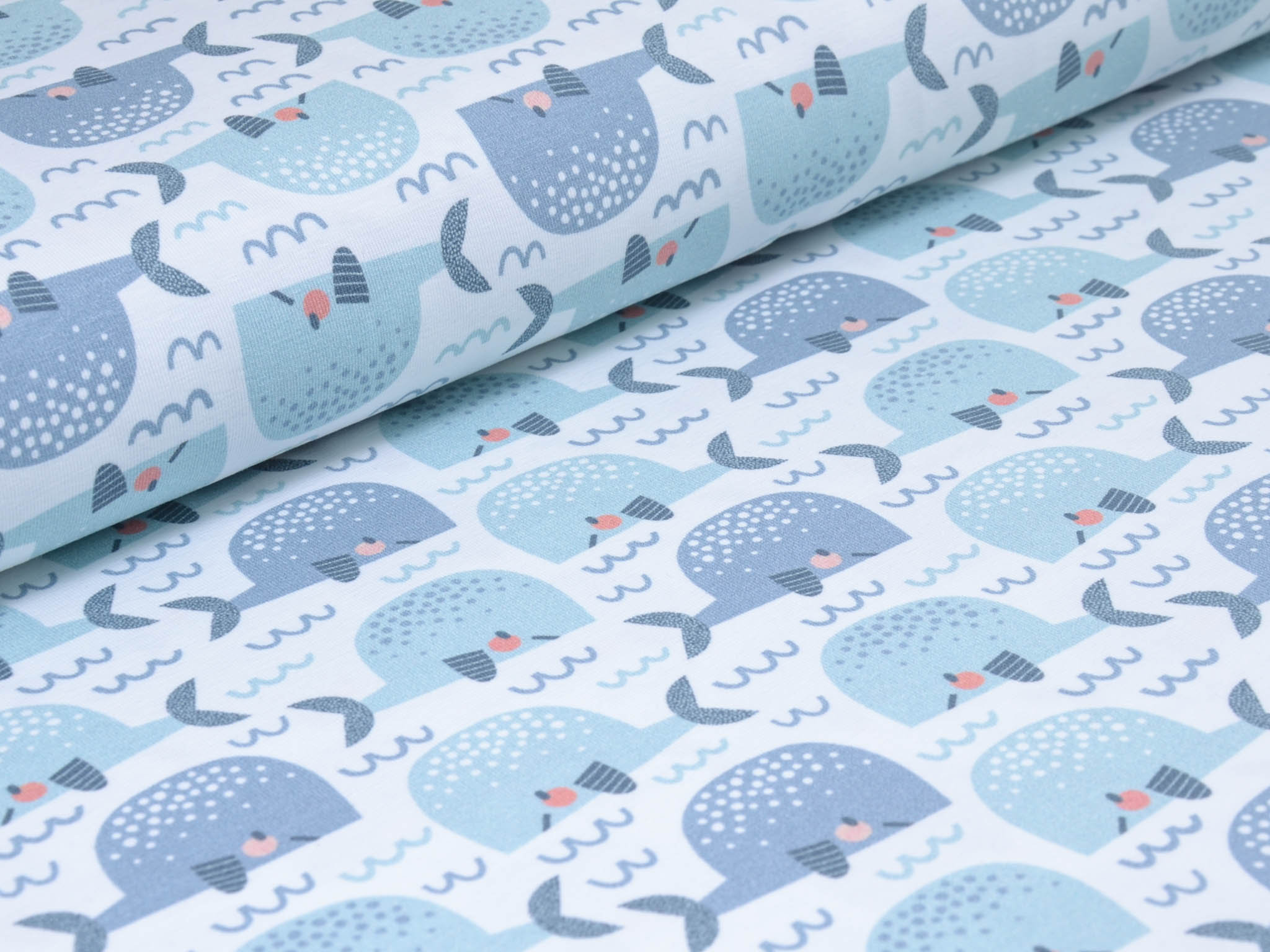 Weißer Baumwolljersey mit blauen Walen. Der Jersey eignet sich wunderbar zum Nähen von Kleidern, Röcken, T-Shirts, Pumphosen und vielem mehr.