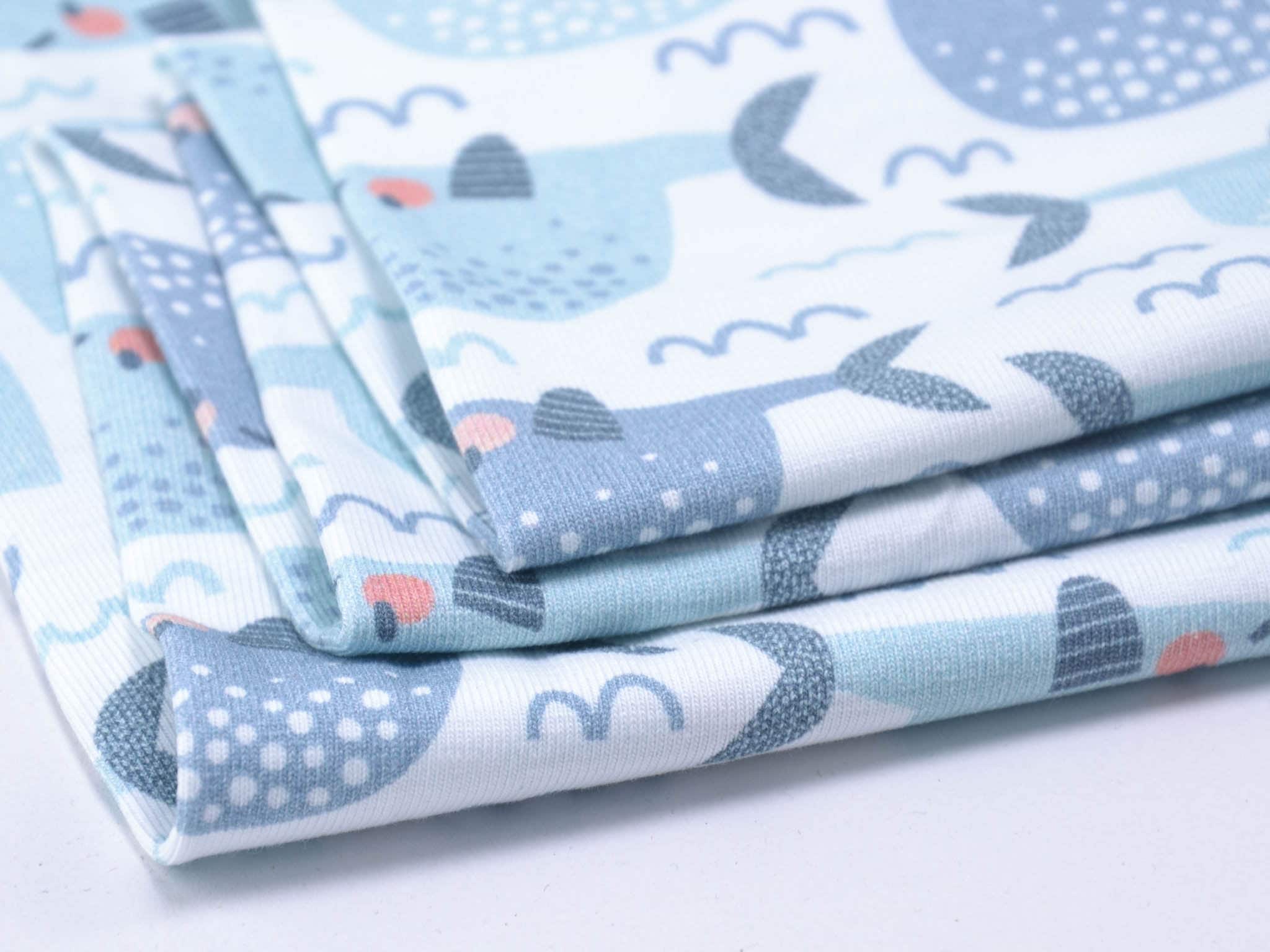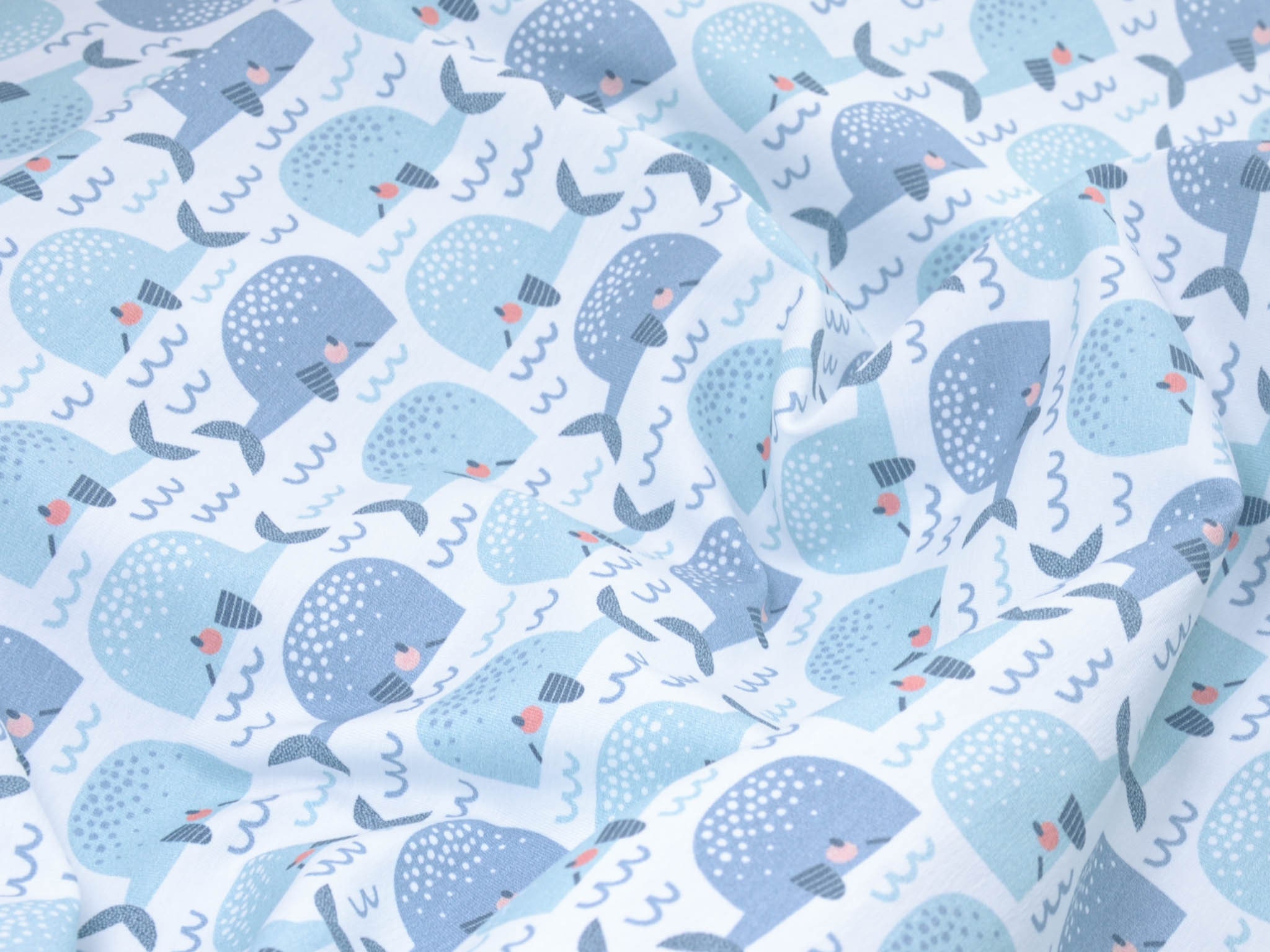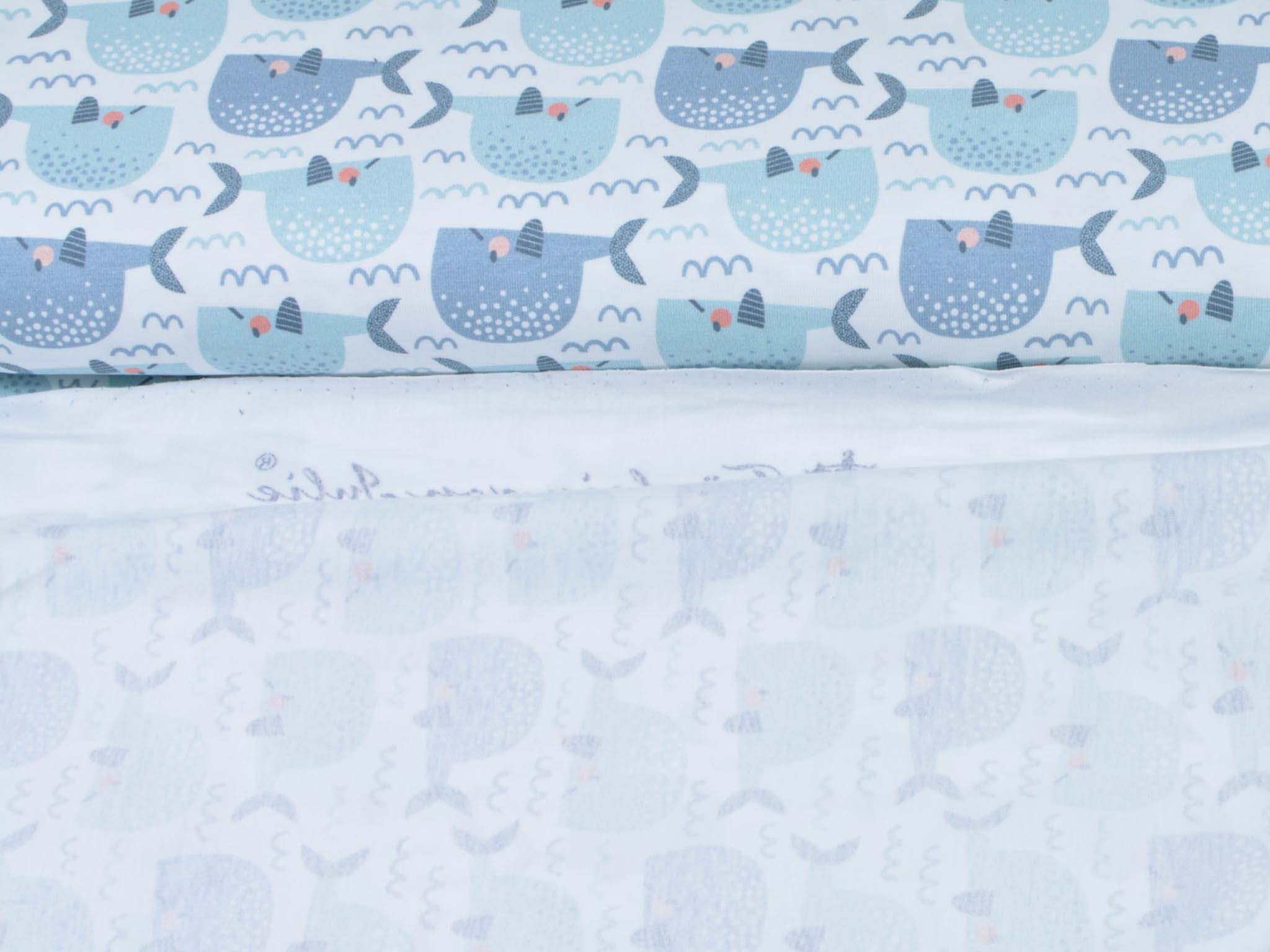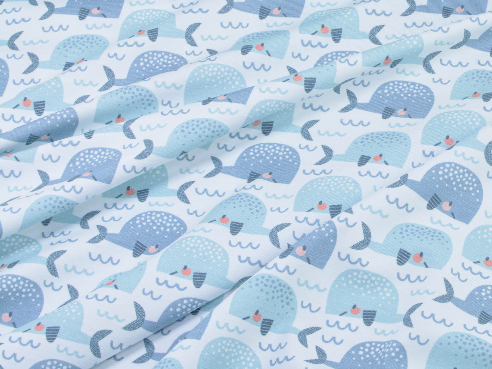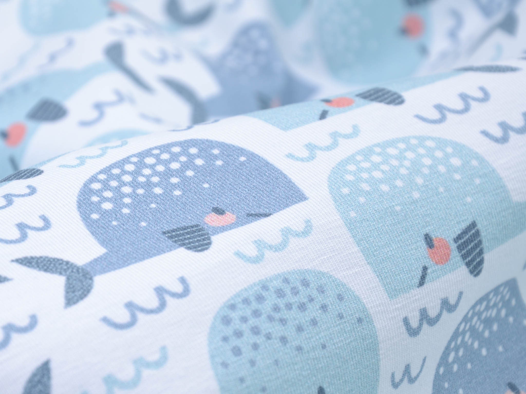 Weißer Baumwolljersey mit blauen Walen. Der Jersey eignet sich wunderbar zum Nähen von Kleidern, Röcken, T-Shirts, Pumphosen und vielem mehr.