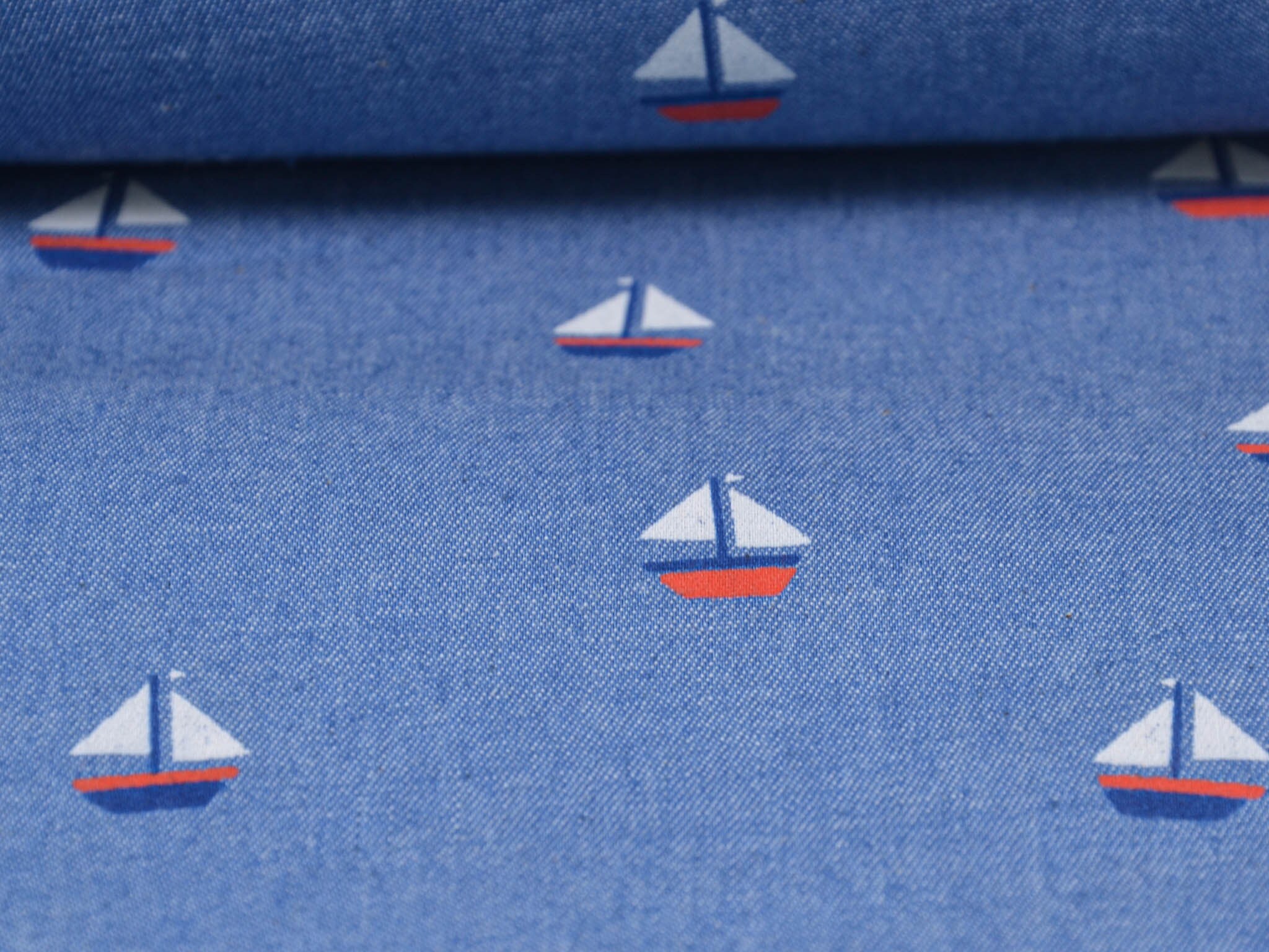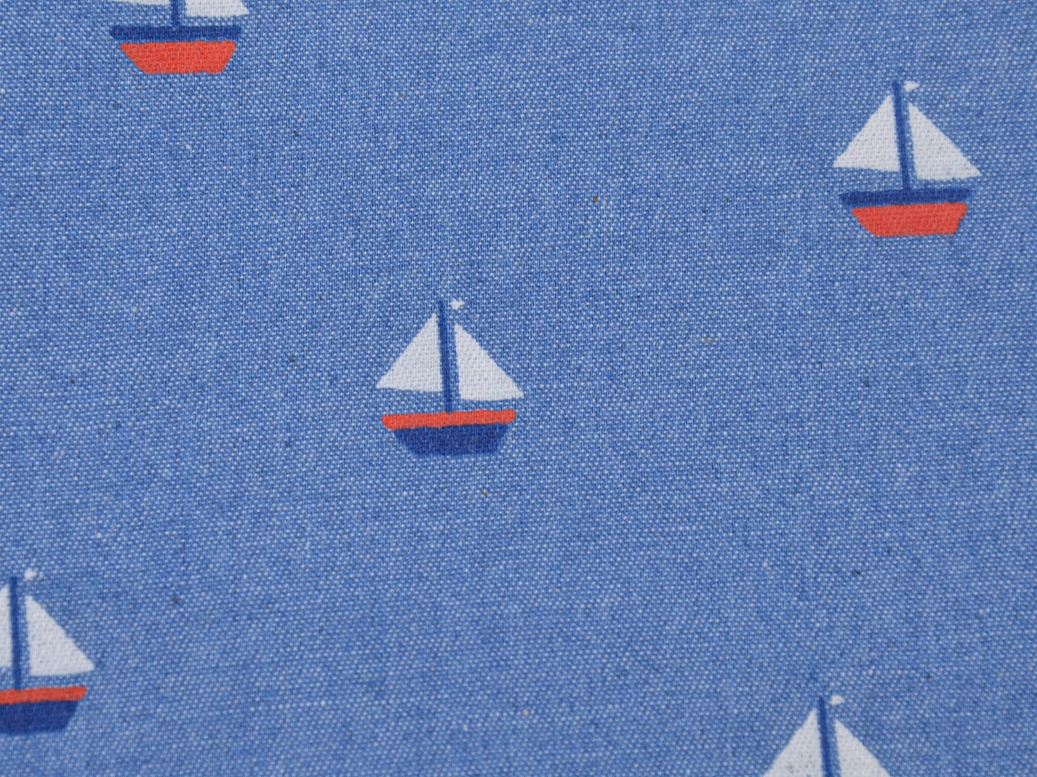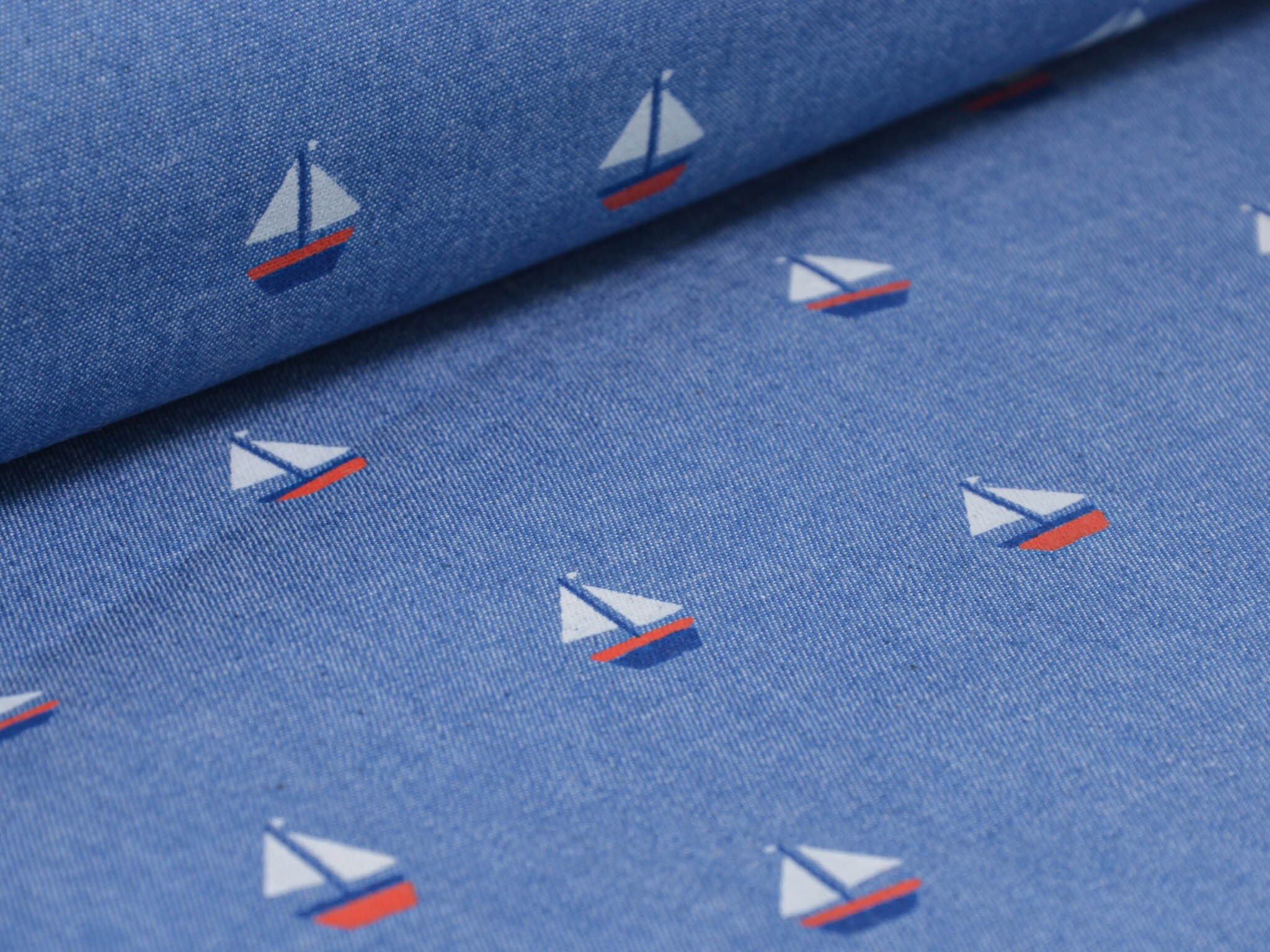 Denim Stoff in jeansblau aus 100% Baumwolle. Der Stoff zeigt kleine Segelboote. Der dünne Stoff lässt sich leicht zu Blusen, Röcken und Kleidern verarbeiten.