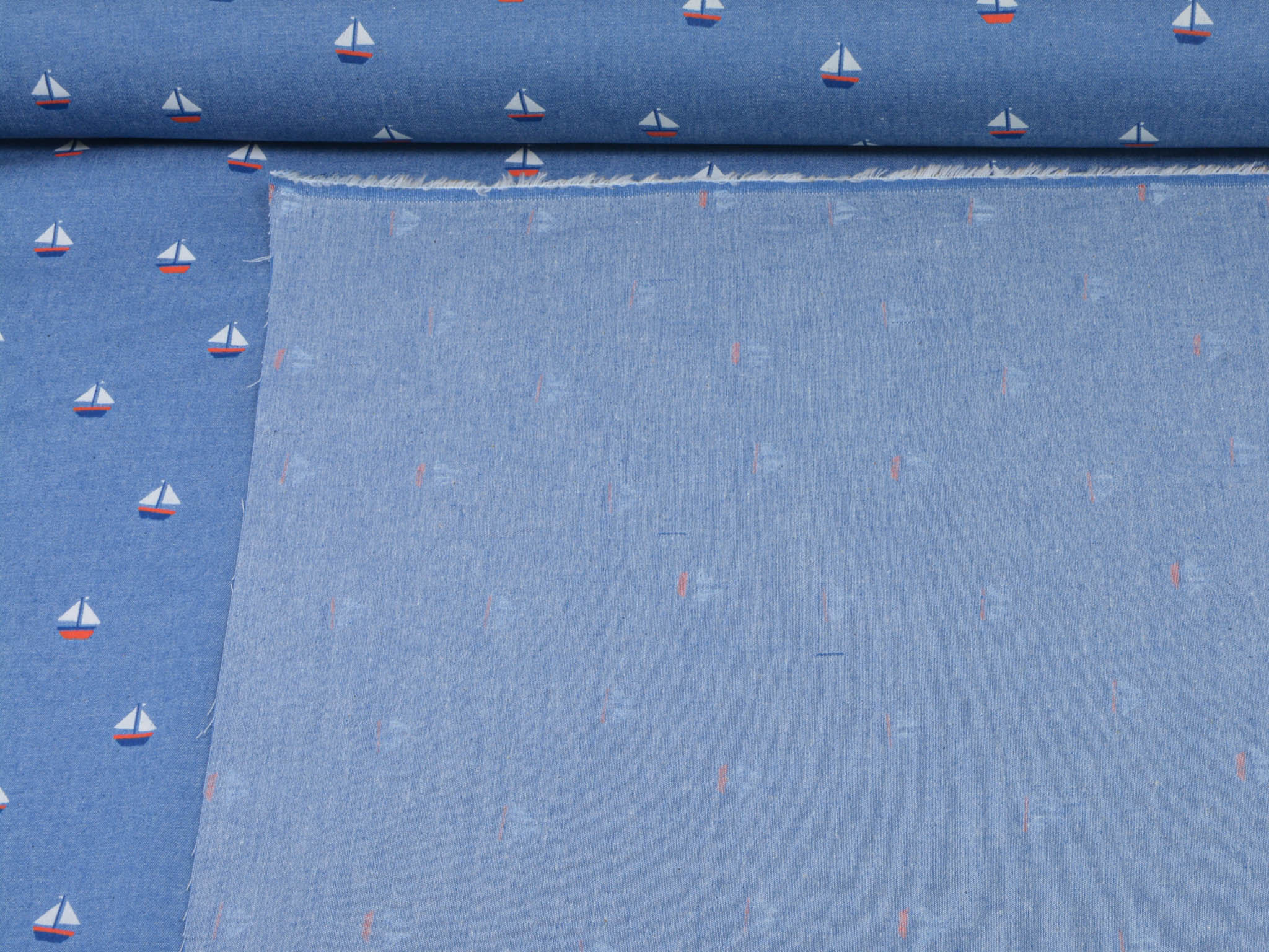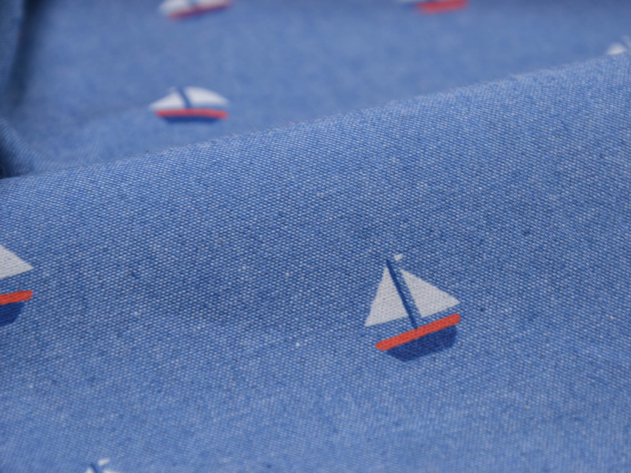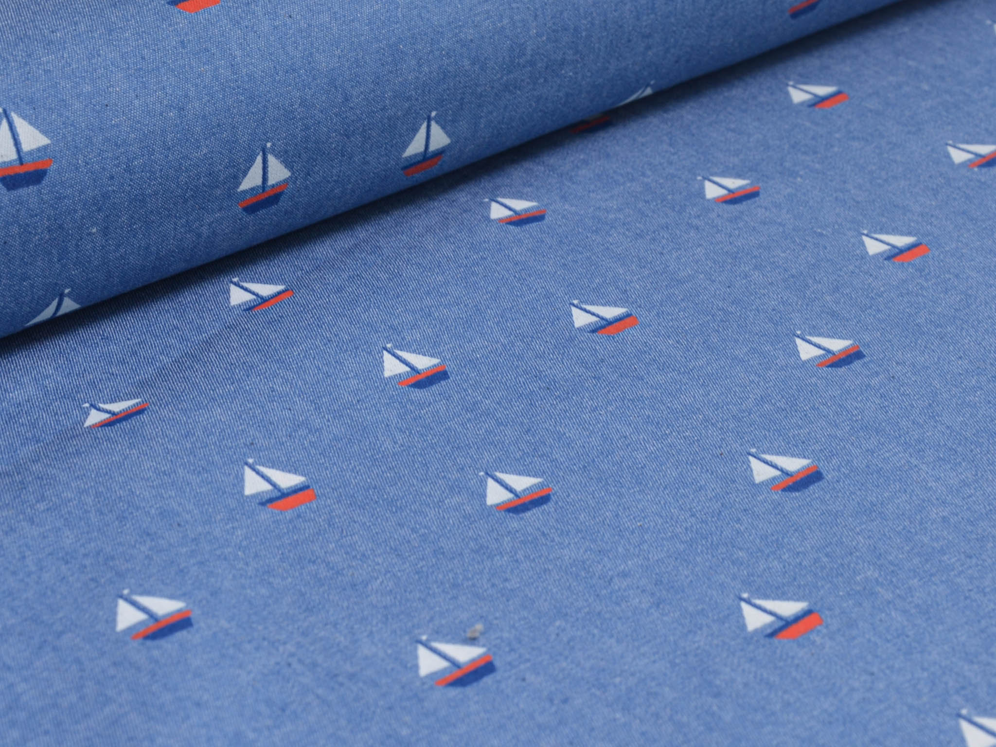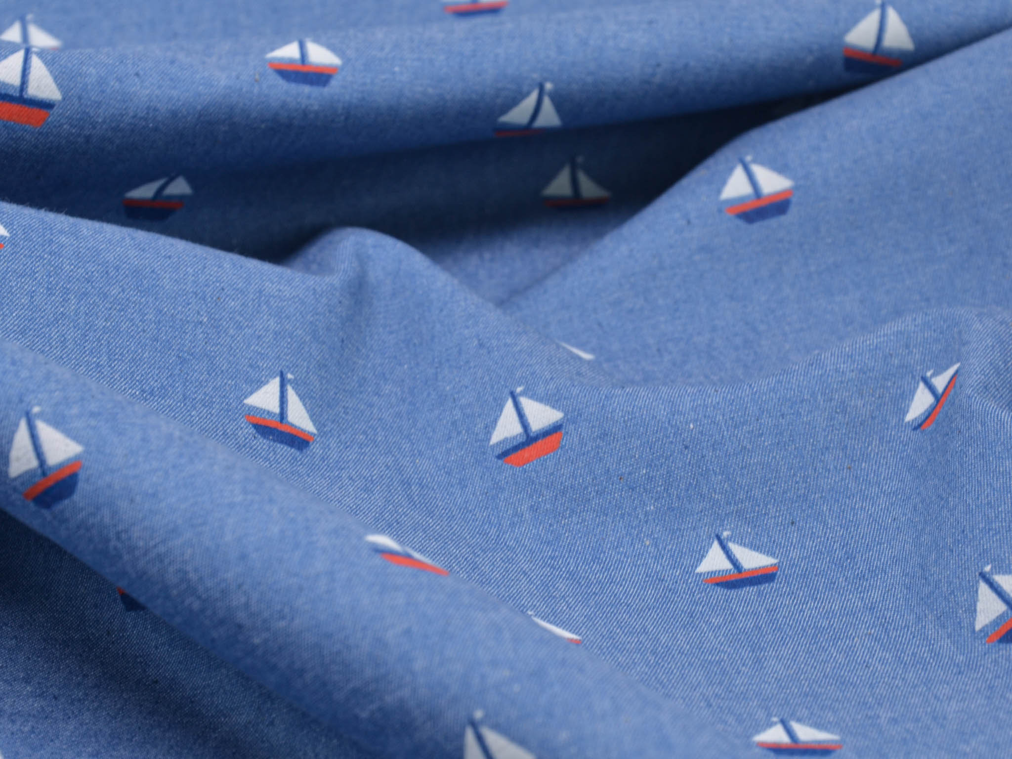 Denim Stoff in jeansblau aus 100% Baumwolle. Der Stoff zeigt kleine Segelboote. Der dünne Stoff lässt sich leicht zu Blusen, Röcken und Kleidern verarbeiten.