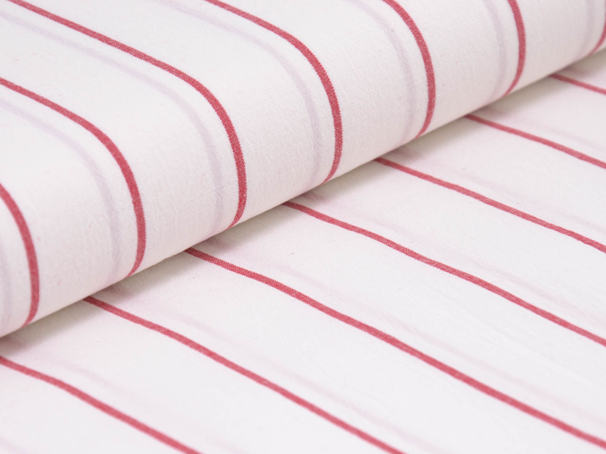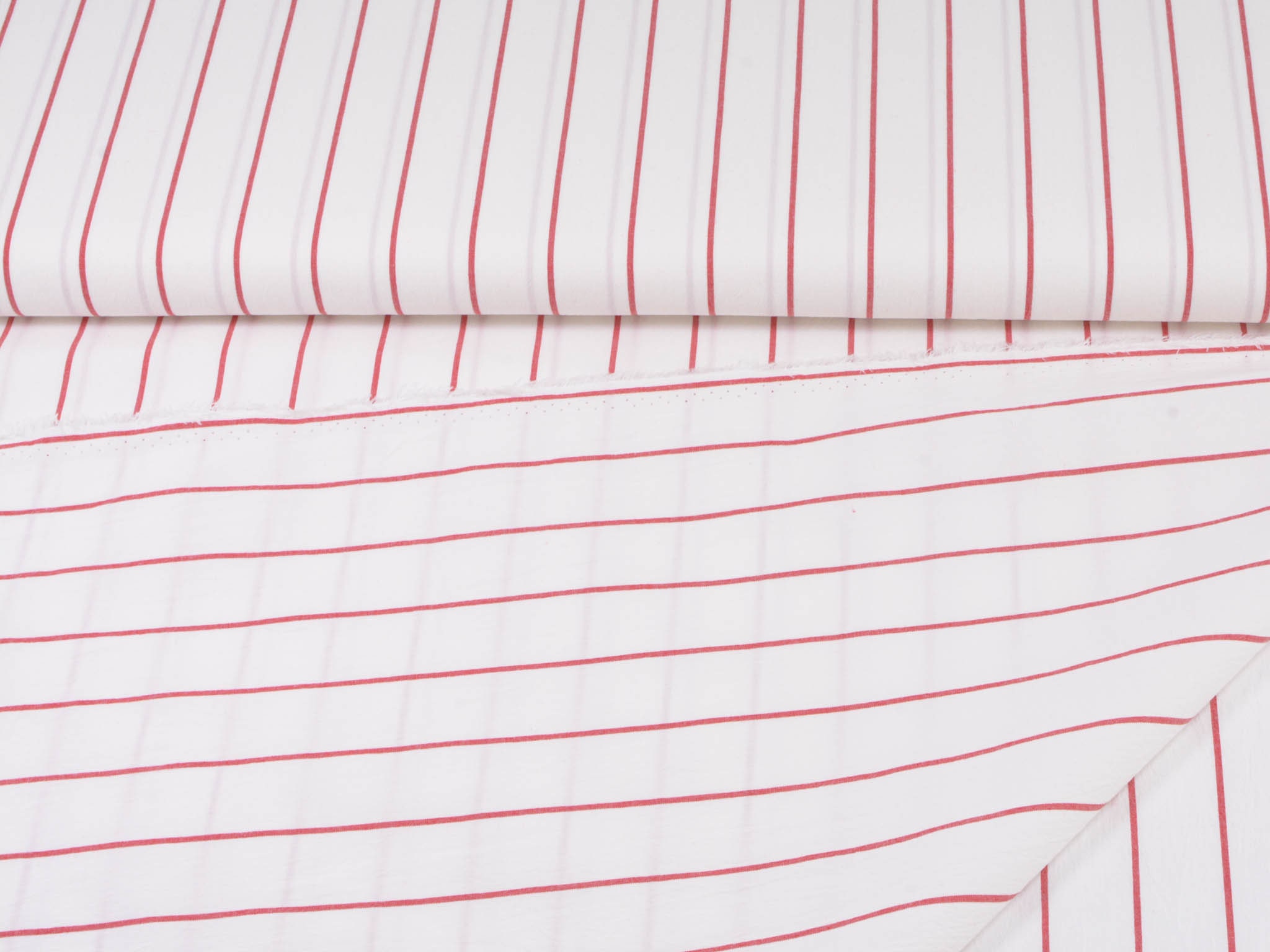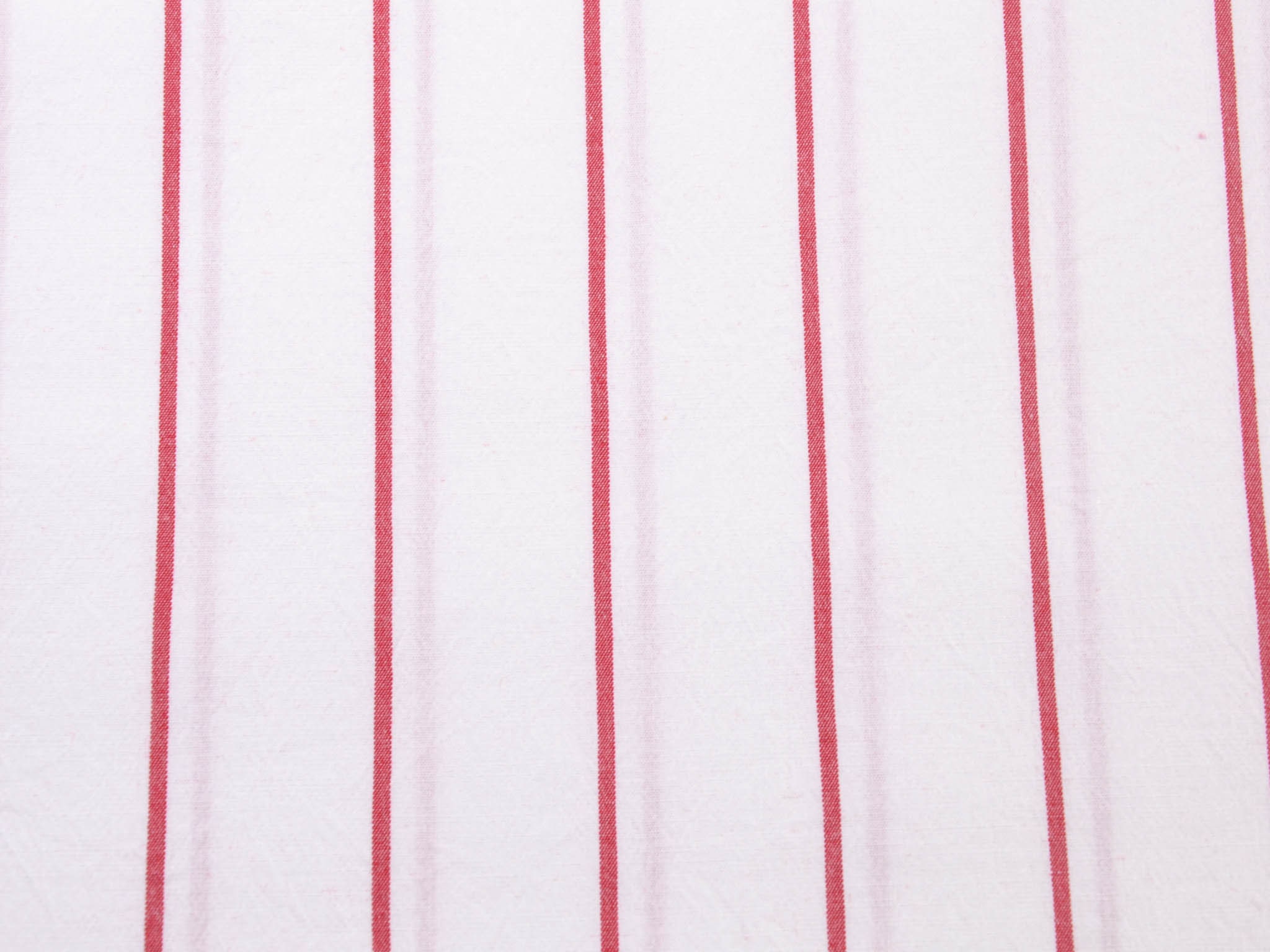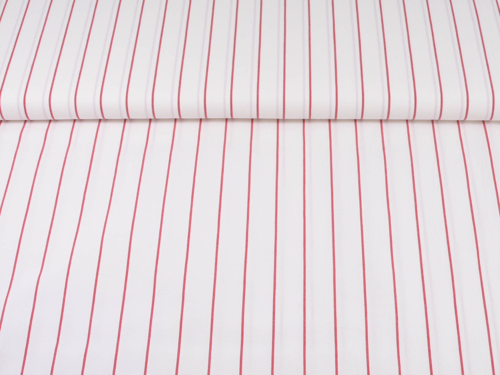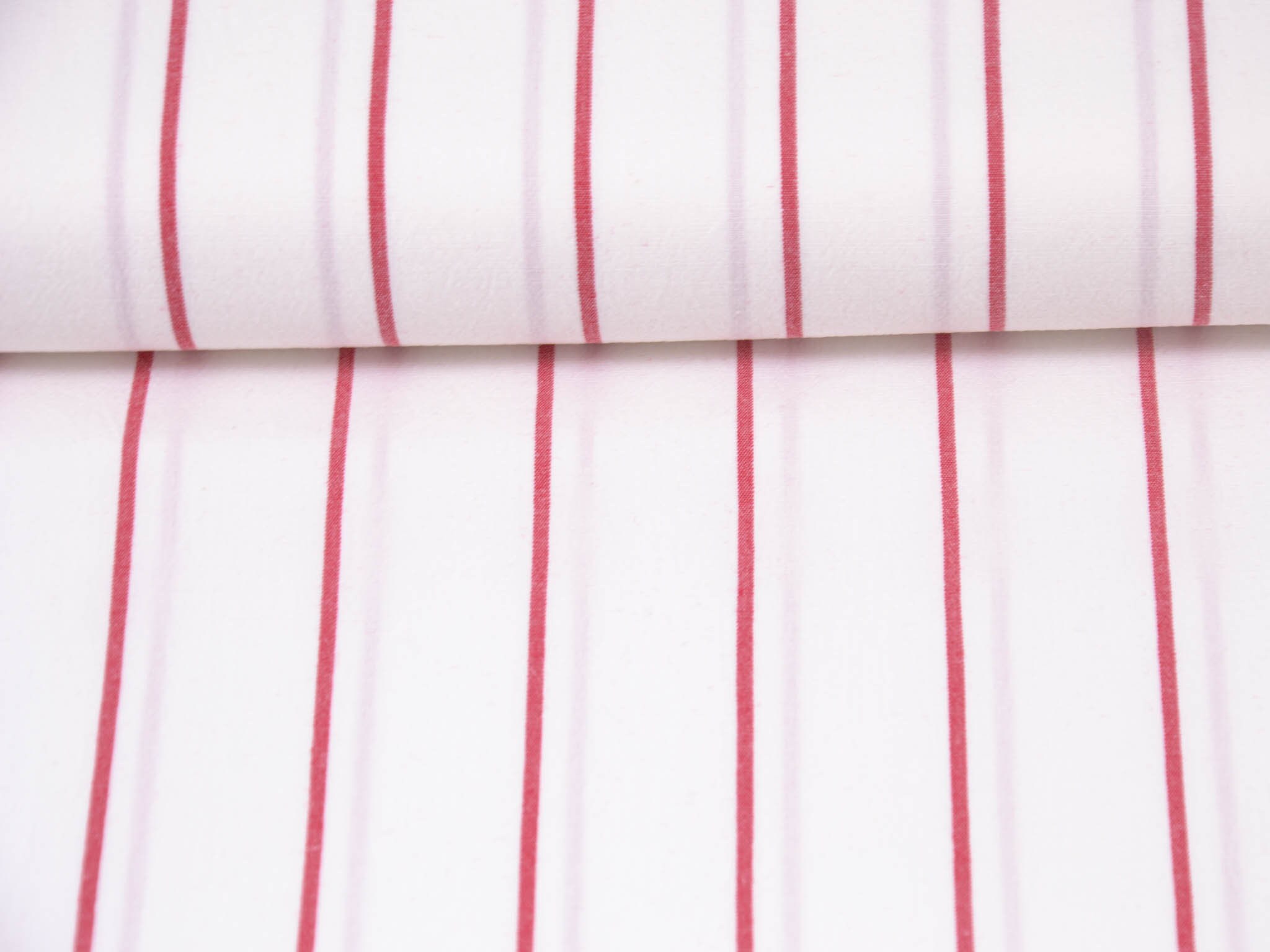 Weißer Baumwollstoff mit roten Streifen. Der Elastische Stoff eignet sich zum Nähen von Blusen, Röcken, Kleidern und vielem mehr.
