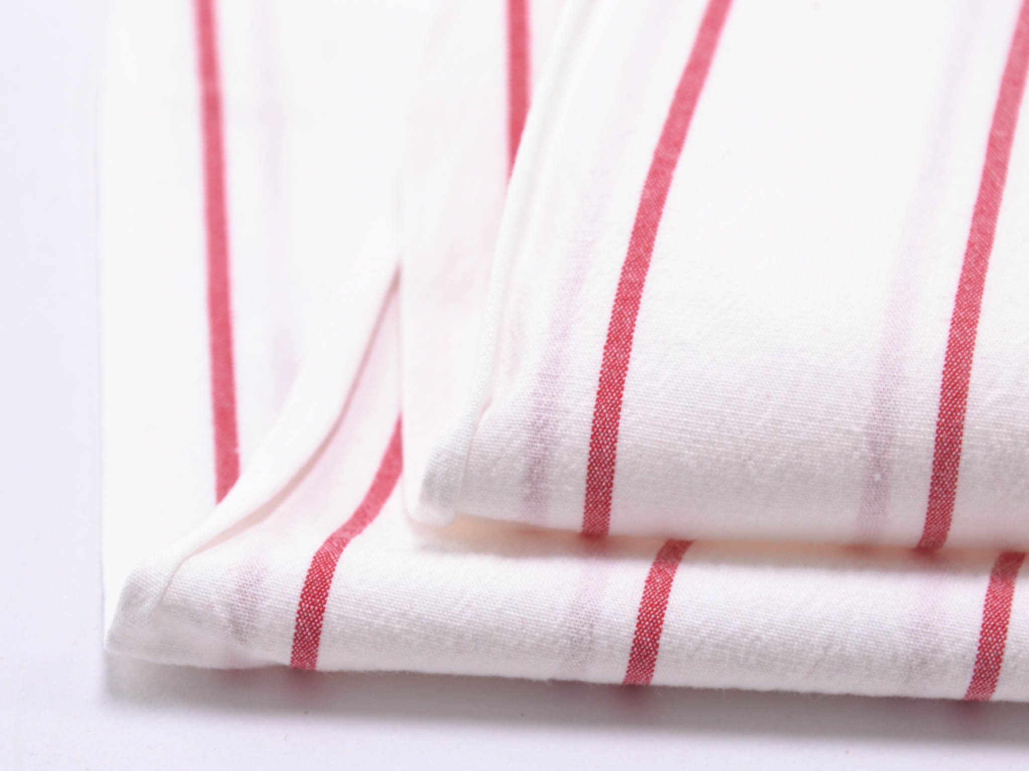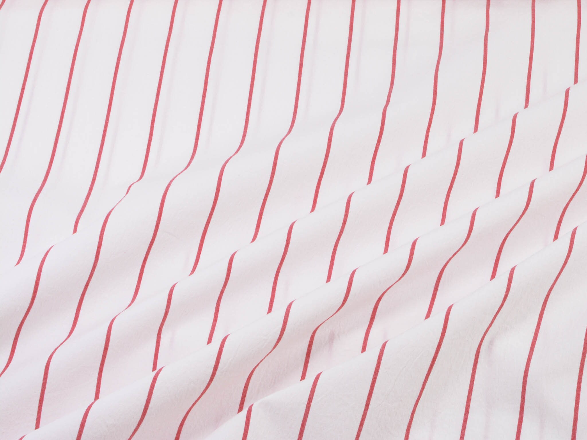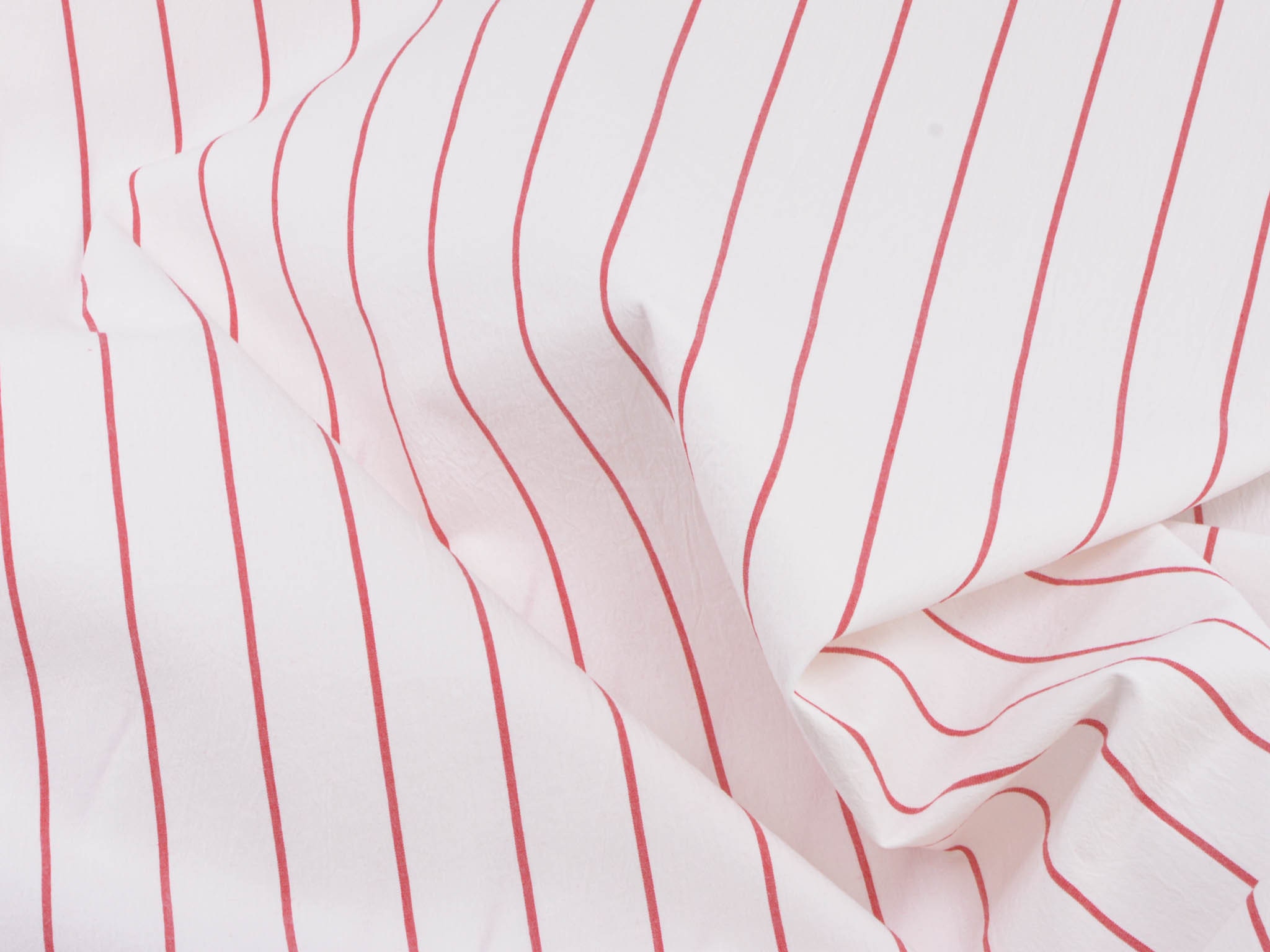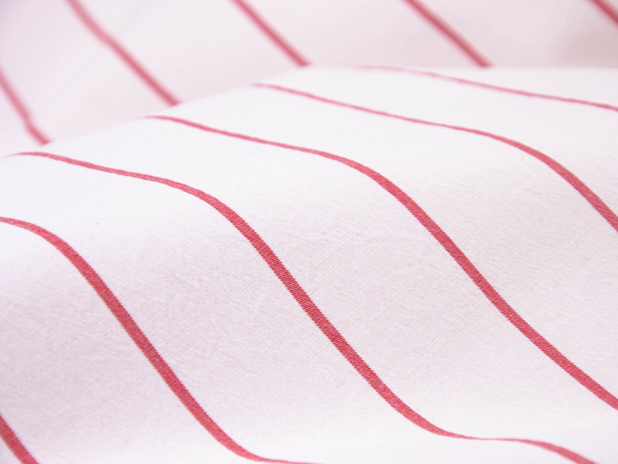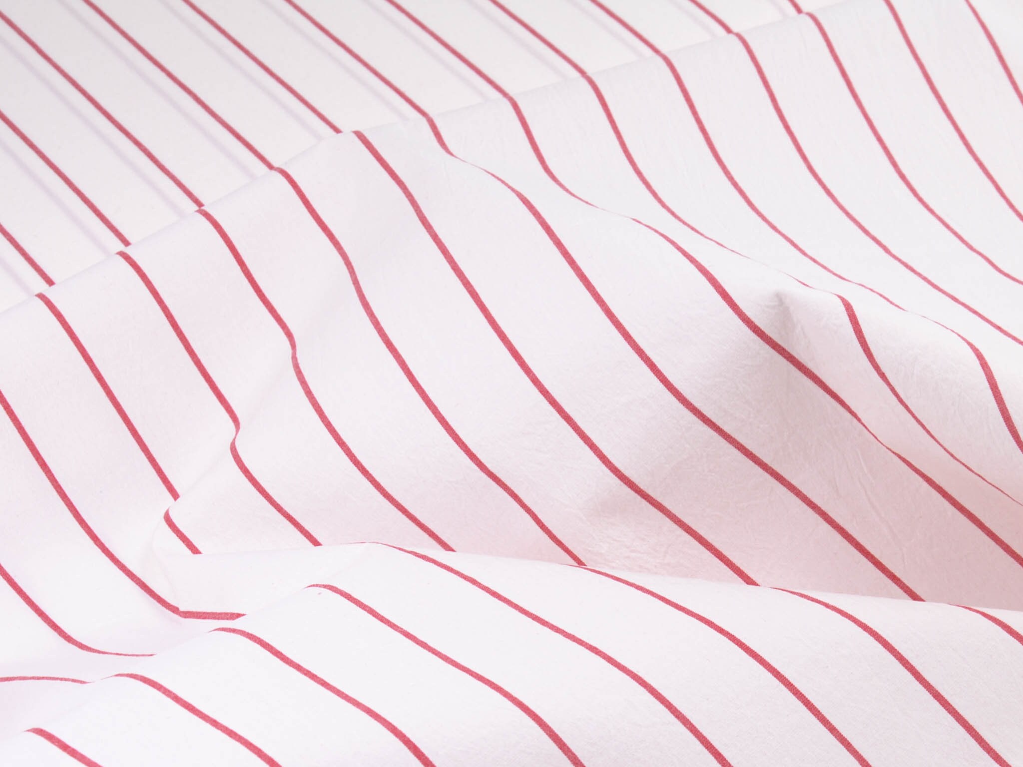 Weißer Baumwollstoff mit roten Streifen. Der Elastische Stoff eignet sich zum Nähen von Blusen, Röcken, Kleidern und vielem mehr.