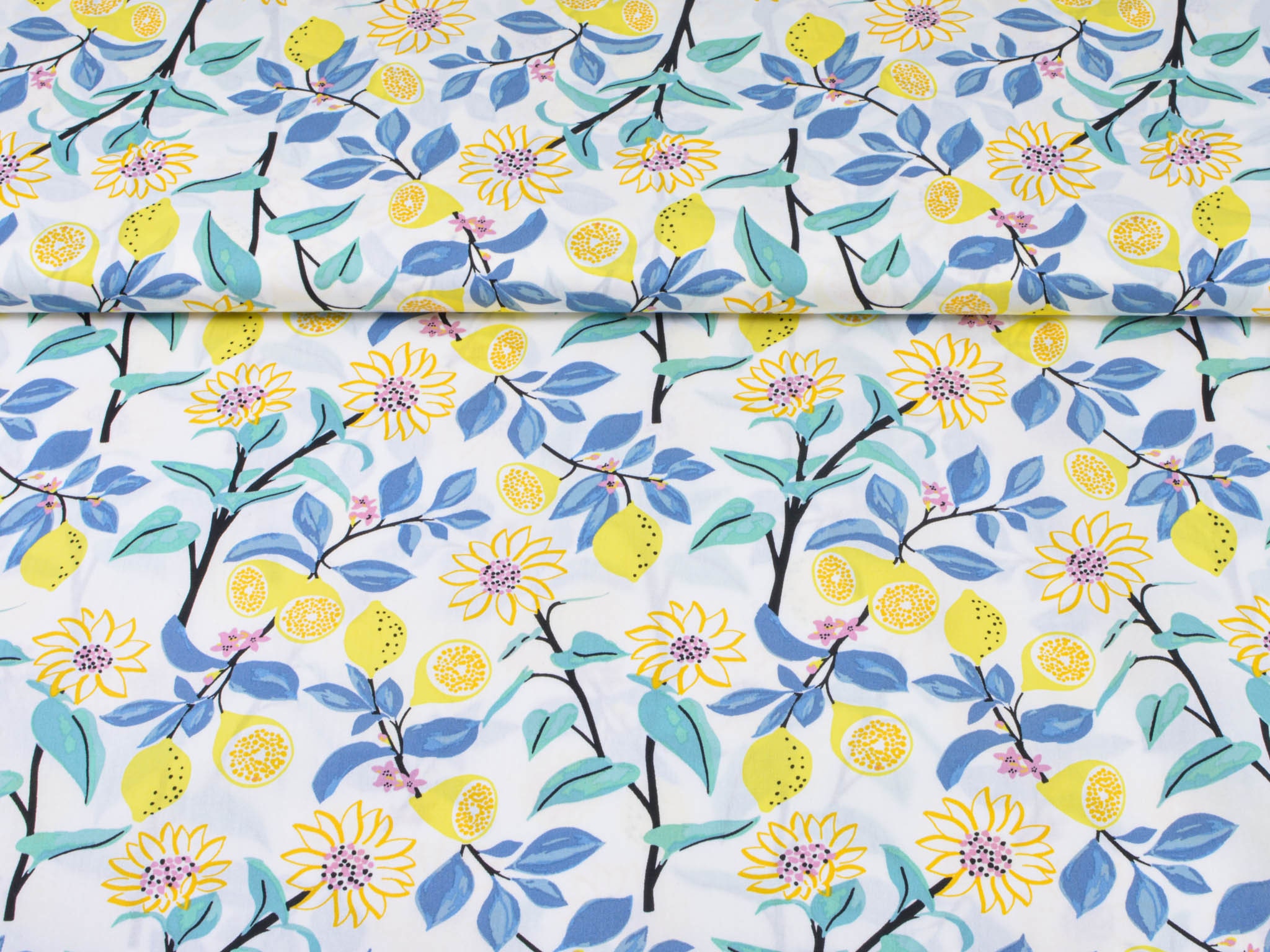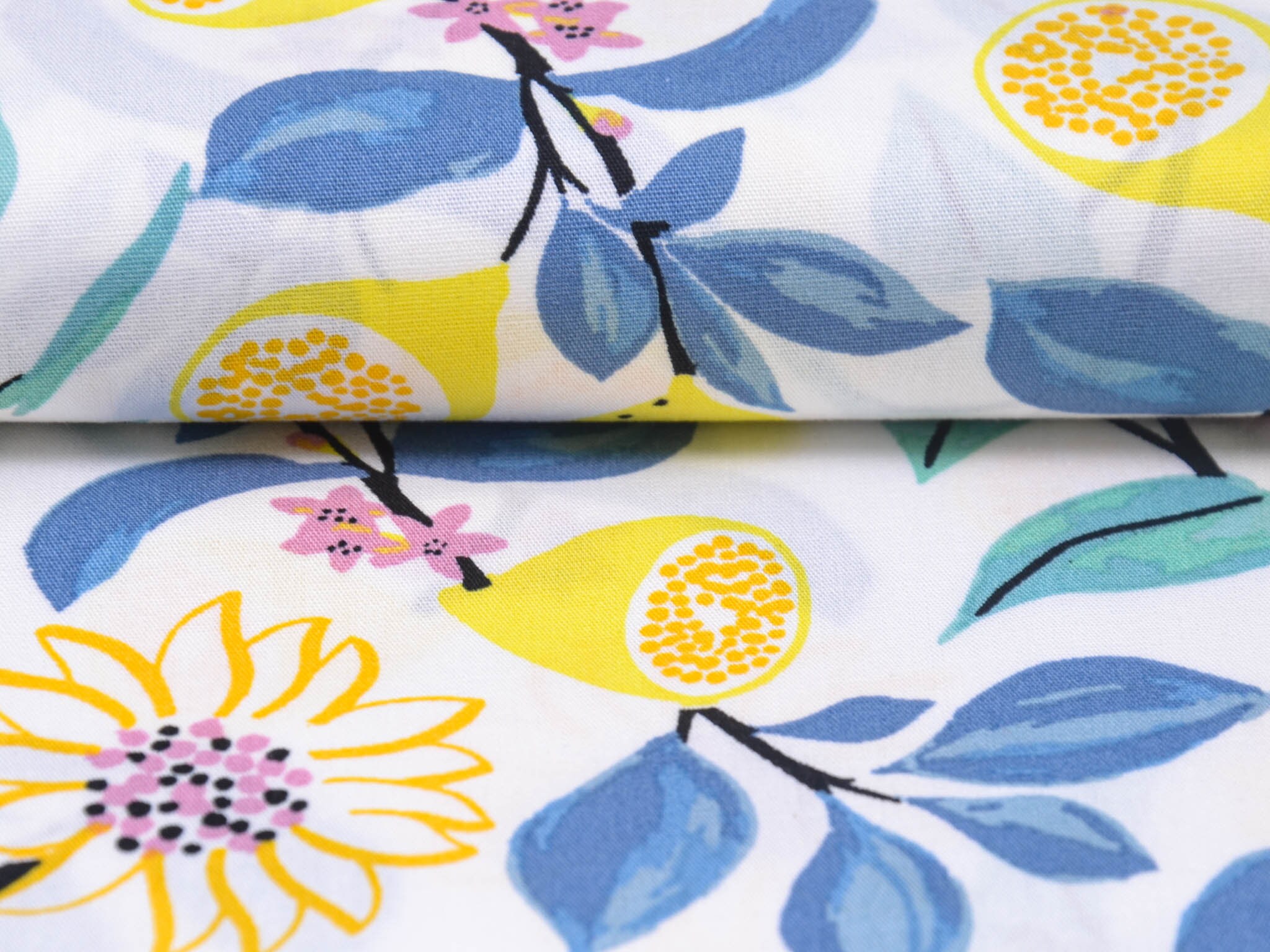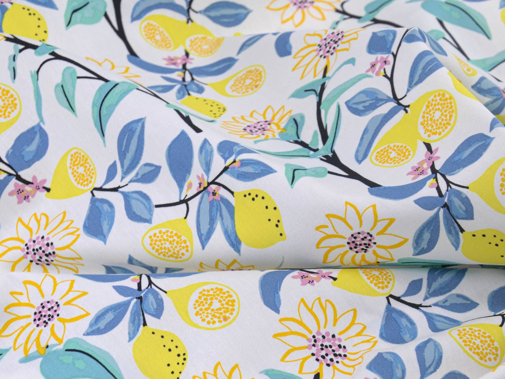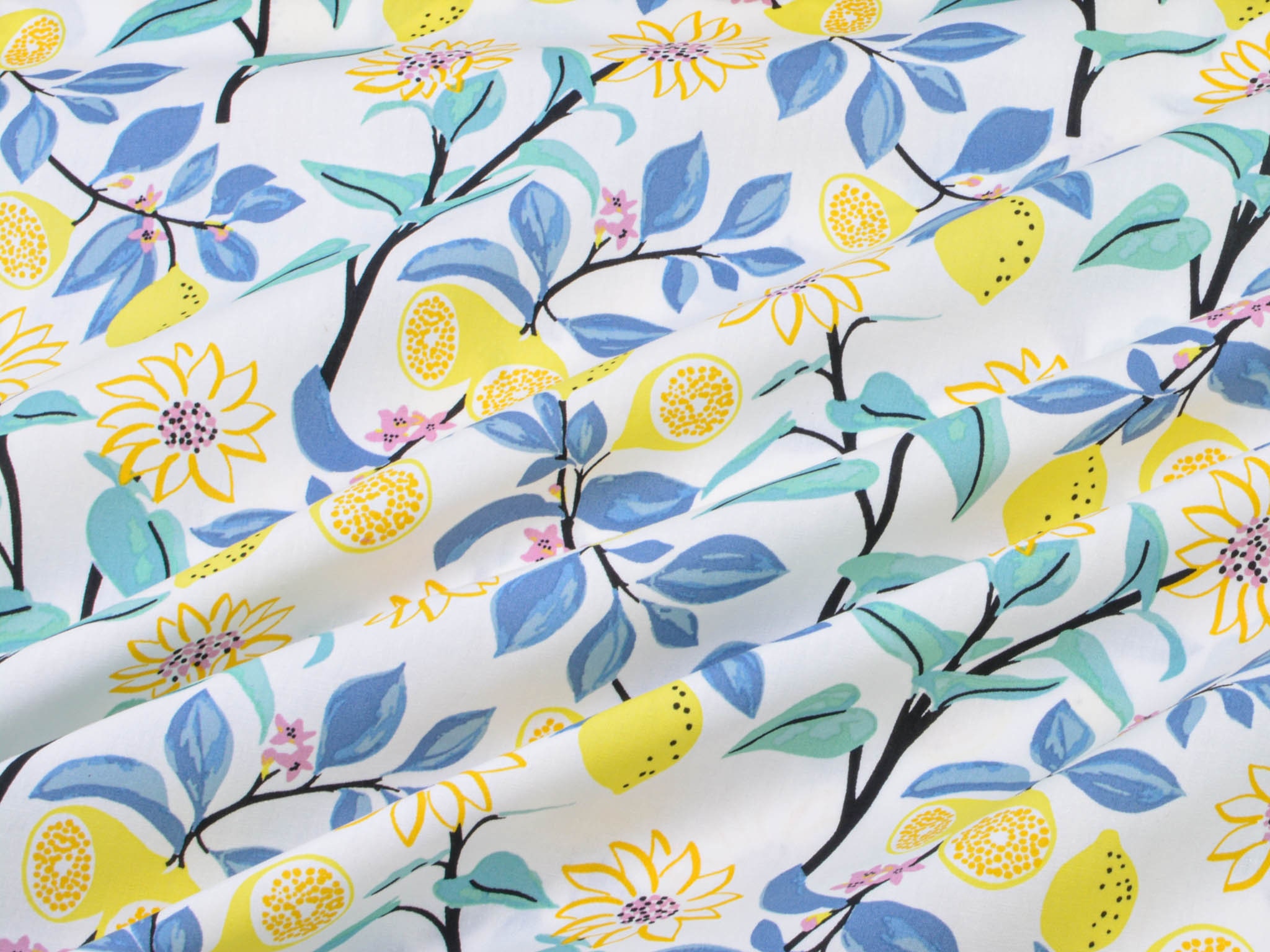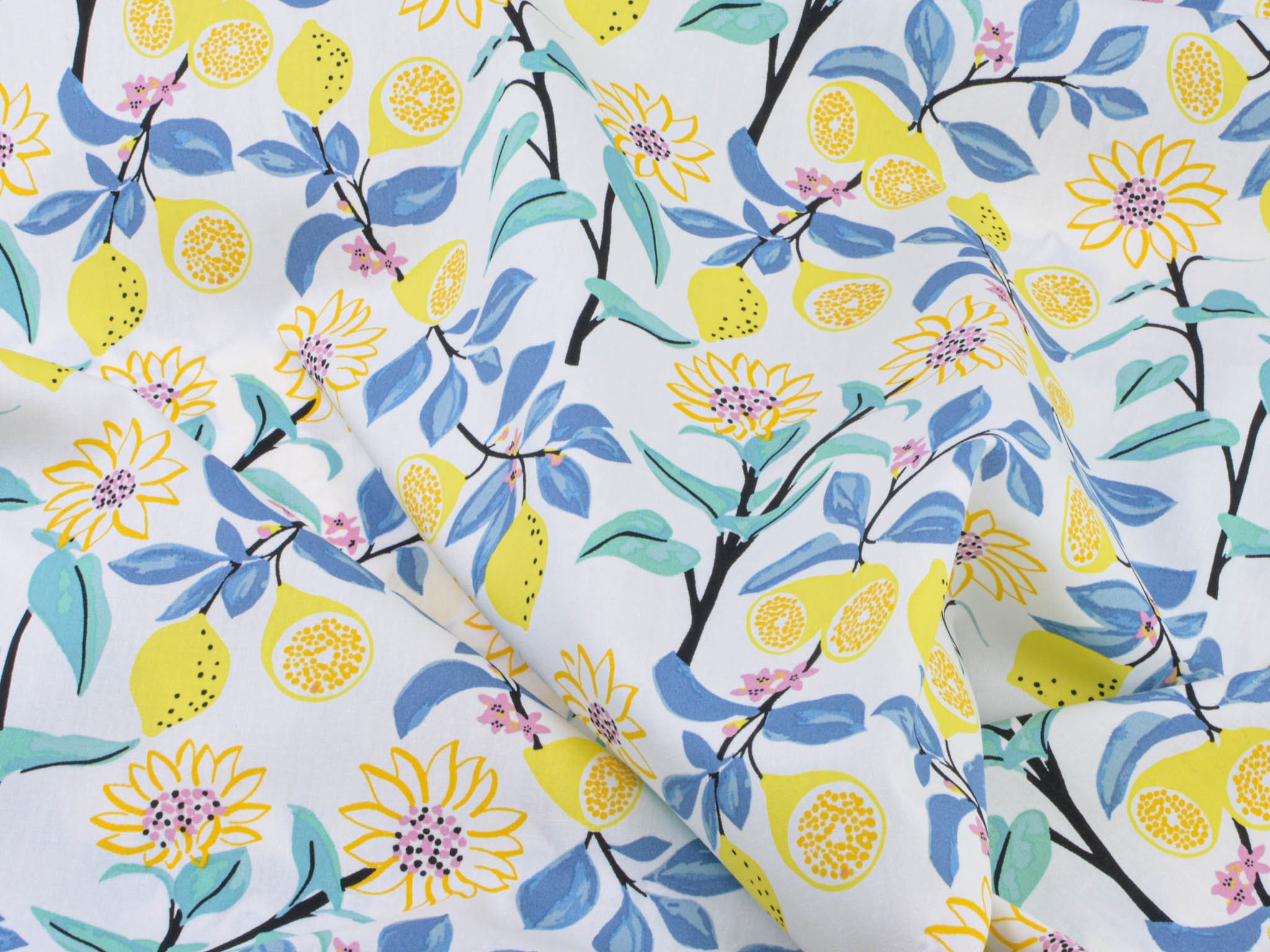 Cotton poplin with lemons and leaves. This poplin fabric is perfect for sewing summer dresses, blouses, skirts, cushions, storage containers, and so much more.
