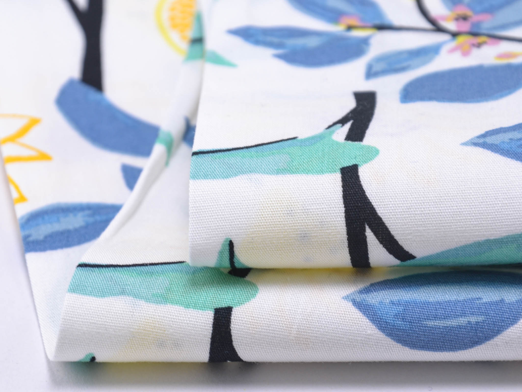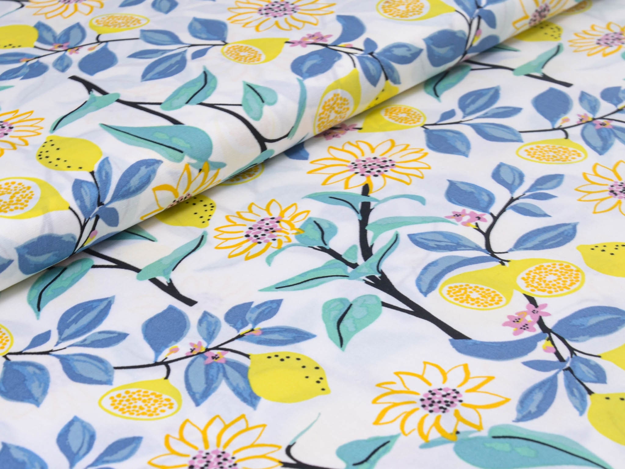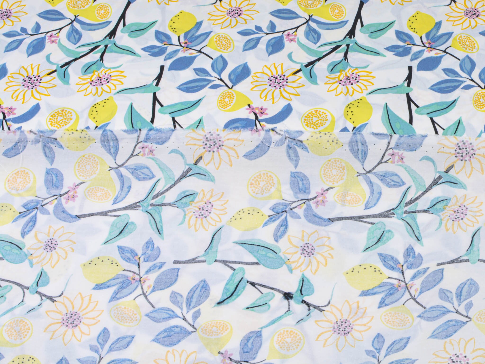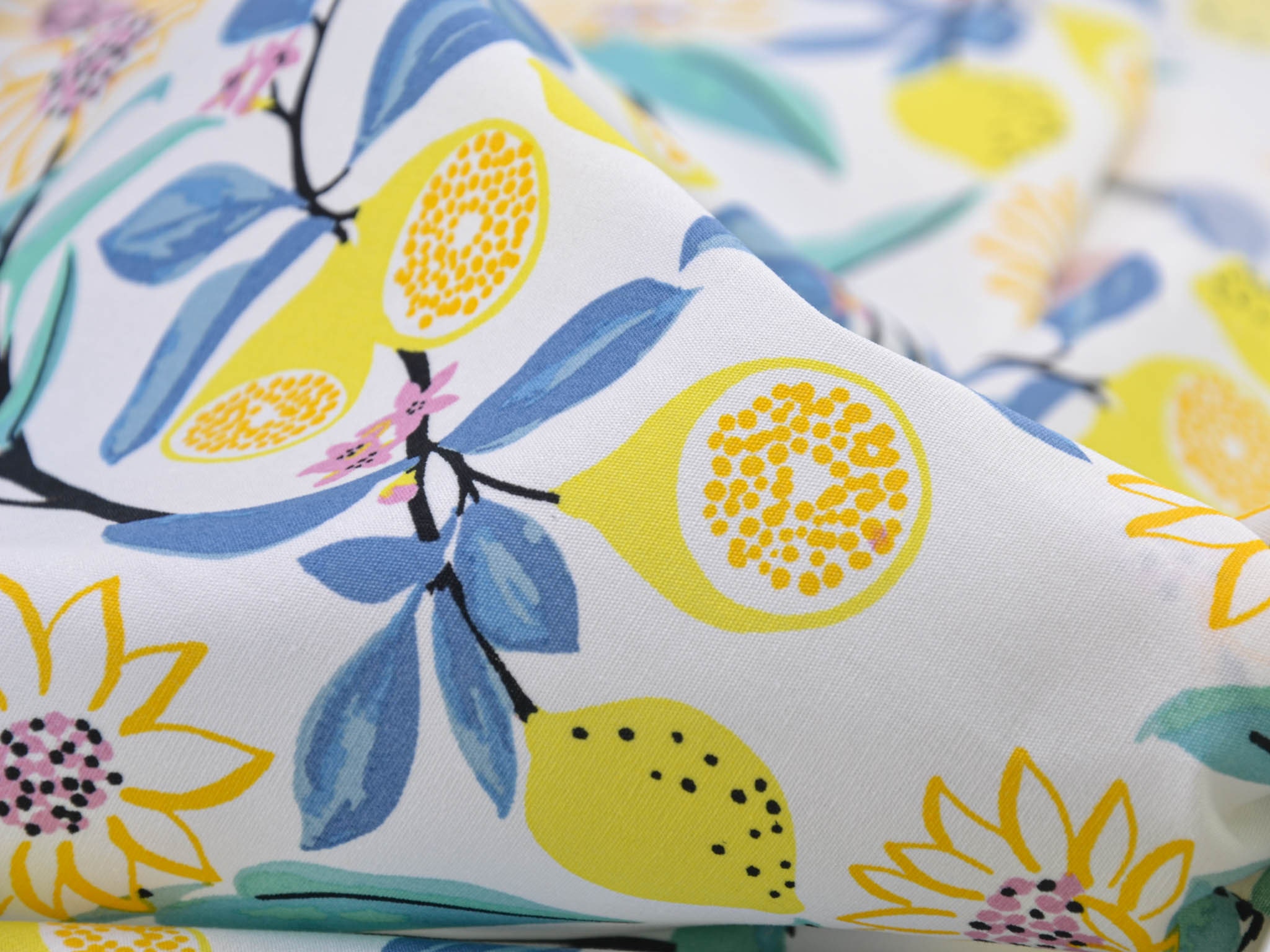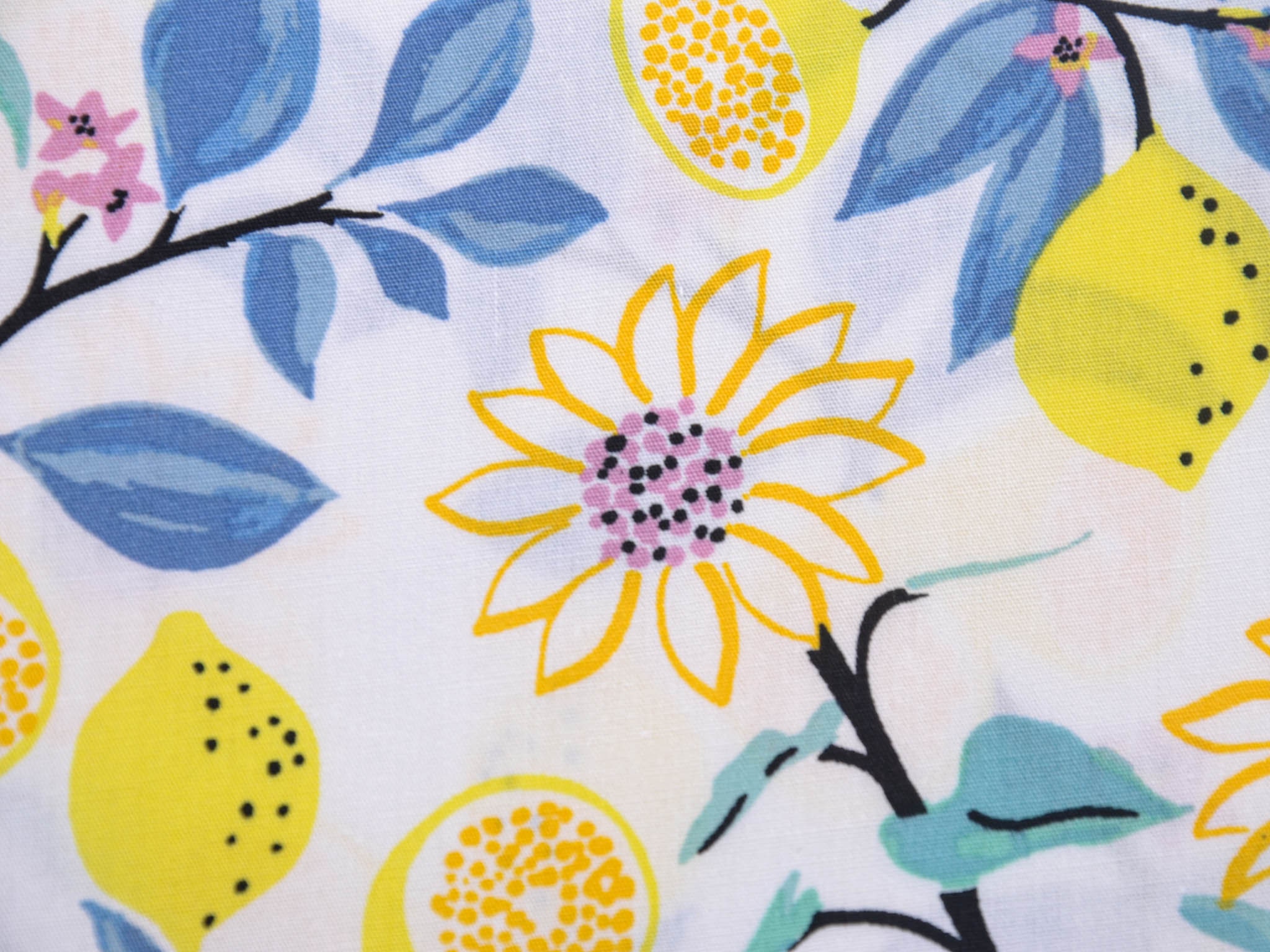 Cotton poplin with lemons and leaves. This poplin fabric is perfect for sewing summer dresses, blouses, skirts, cushions, storage containers, and so much more.