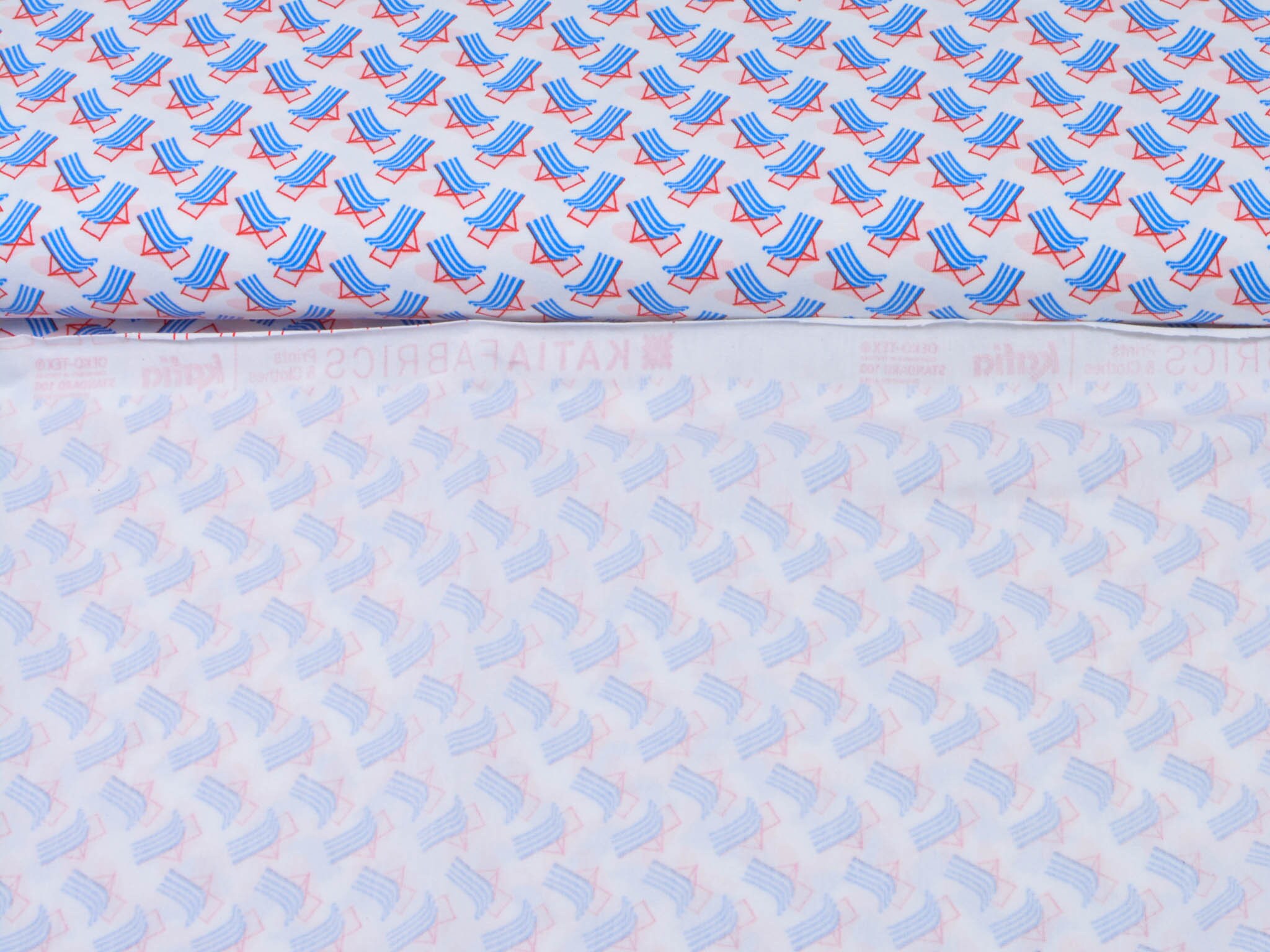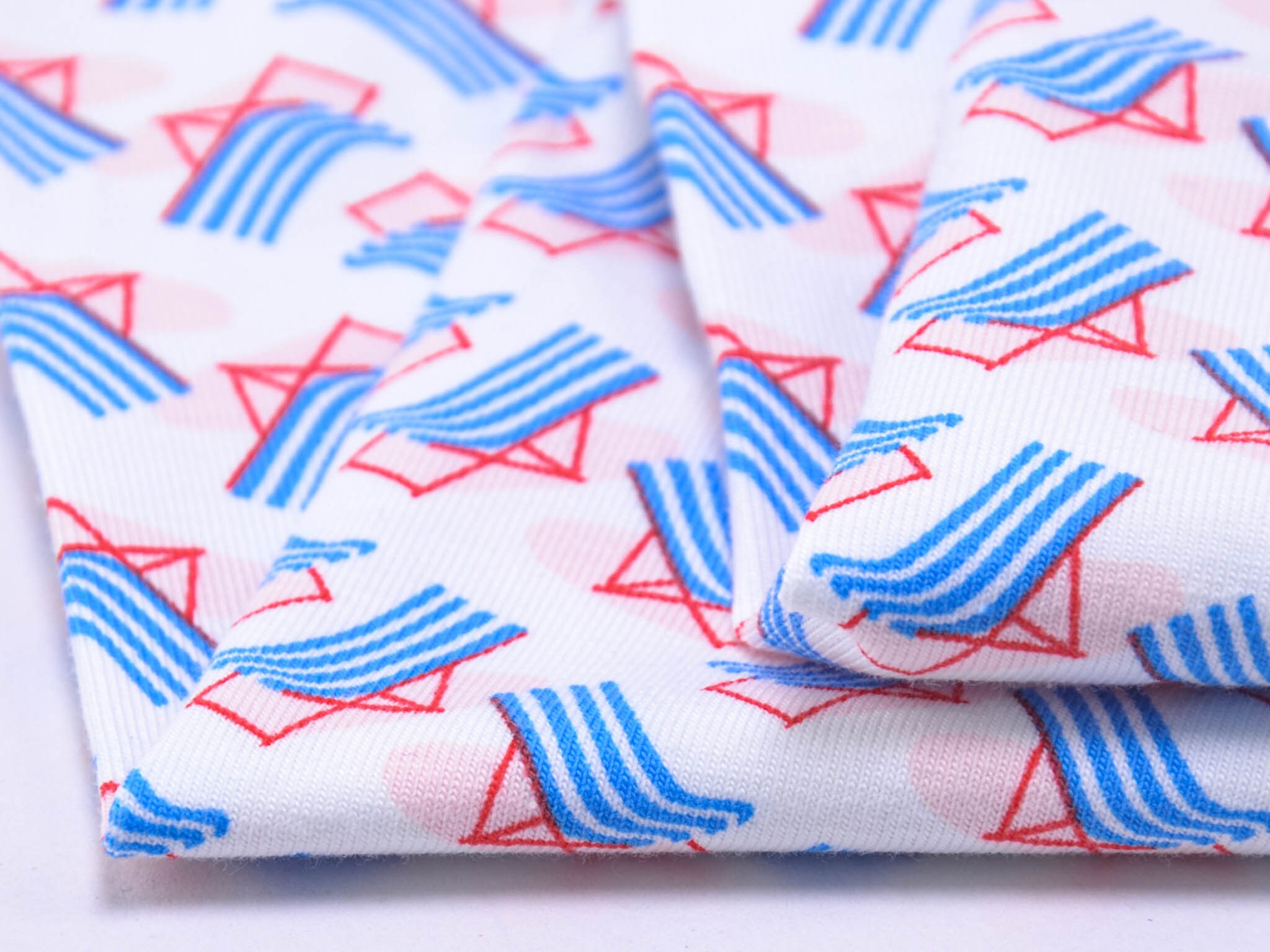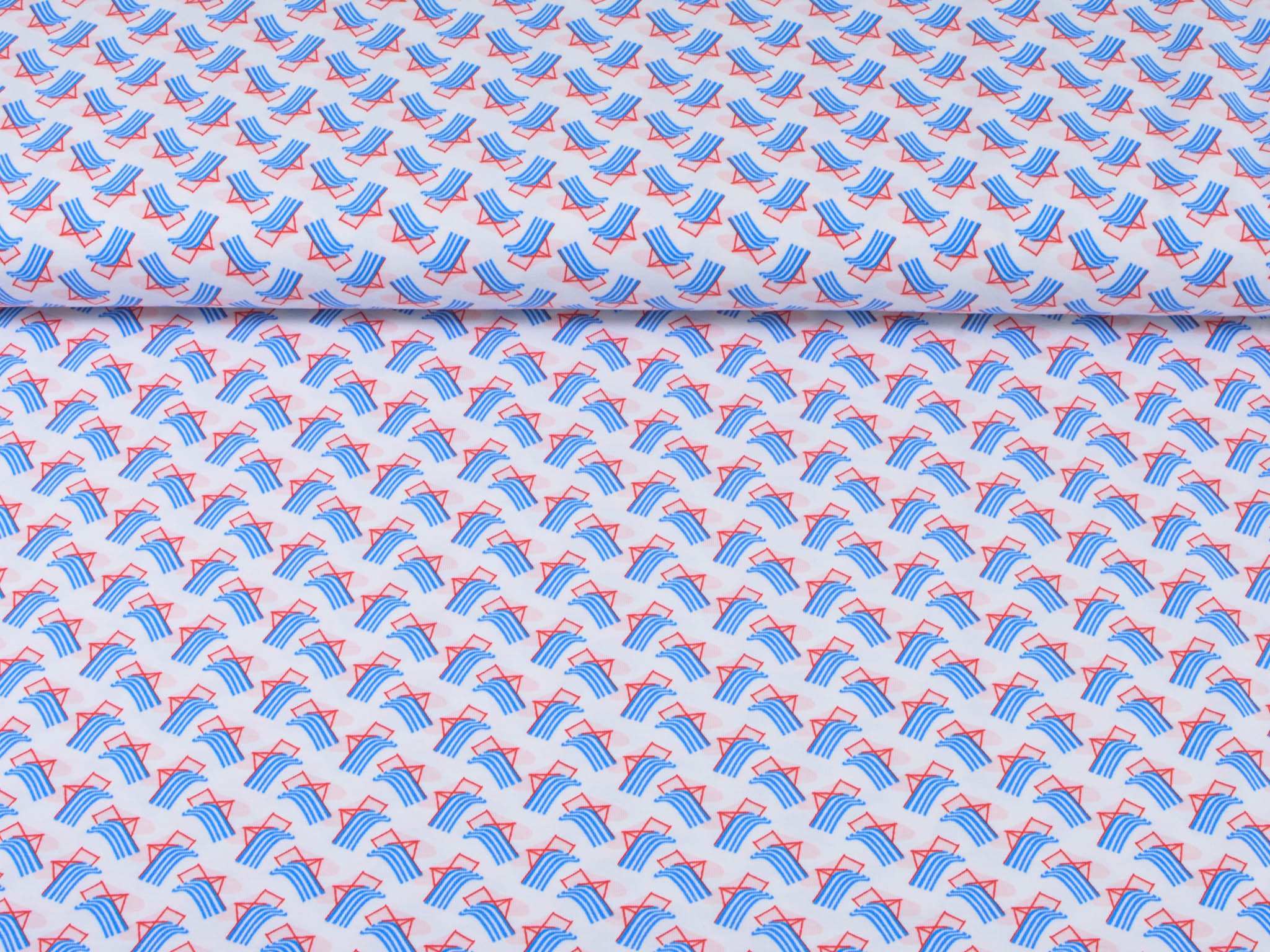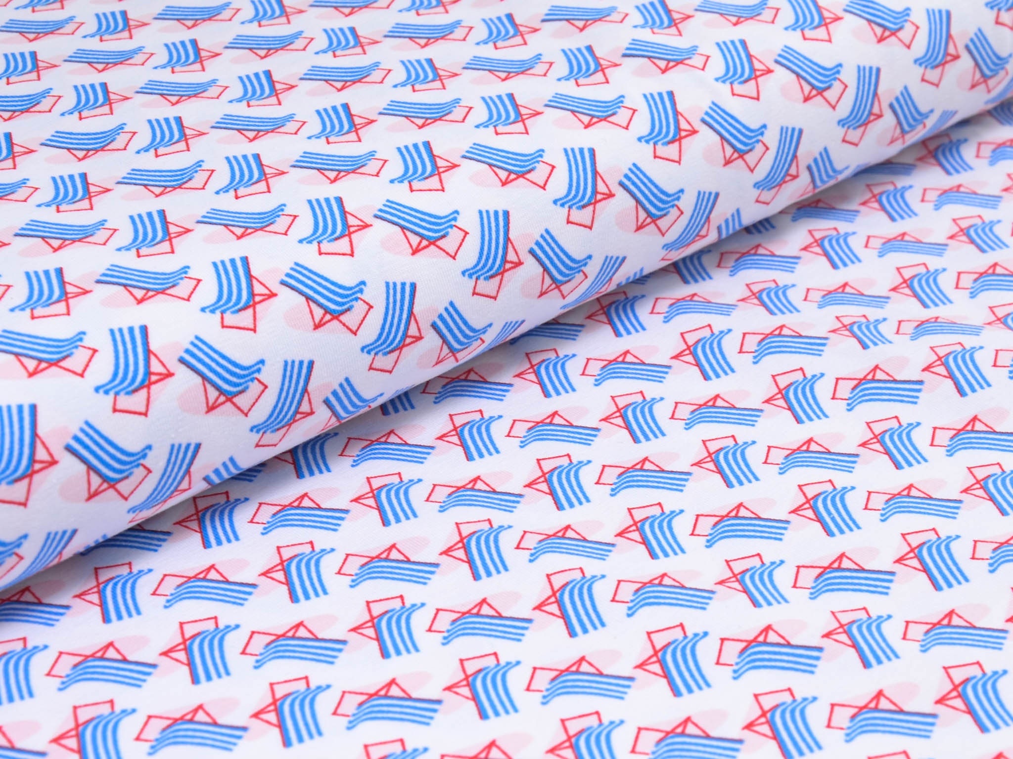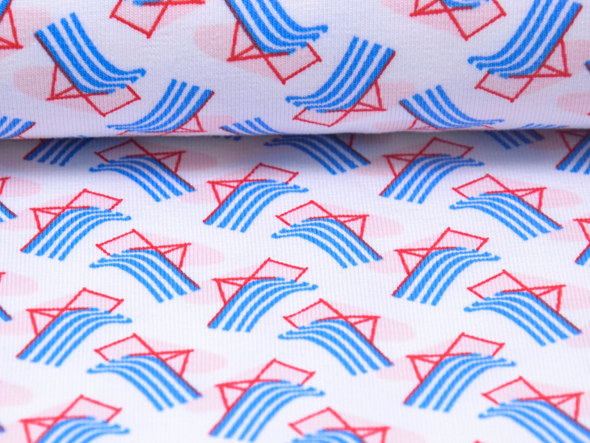 Jersey aus Baumwolle mit kleinen Liegestühlen in blau, rot und rosa. Der Stoff eignet sich perfekt zum Nähen von T-Shirts, Langarmshirts, Kleidern und vielem mehr.