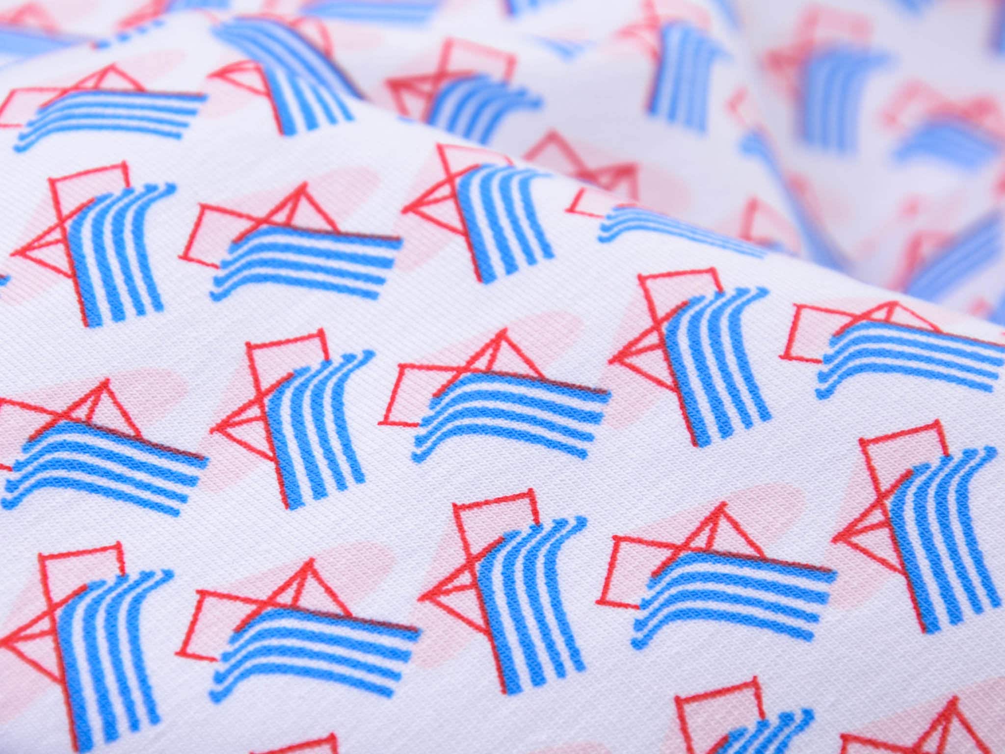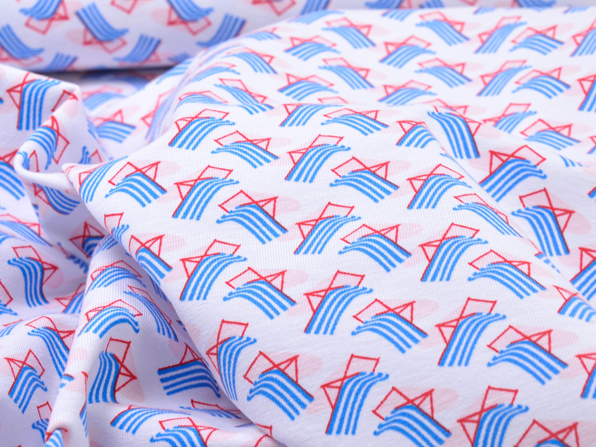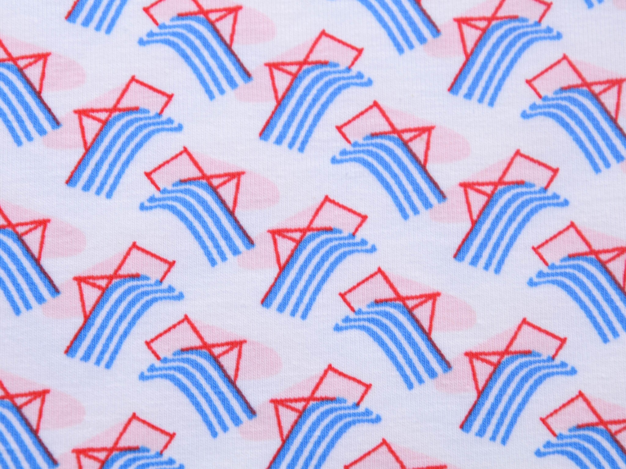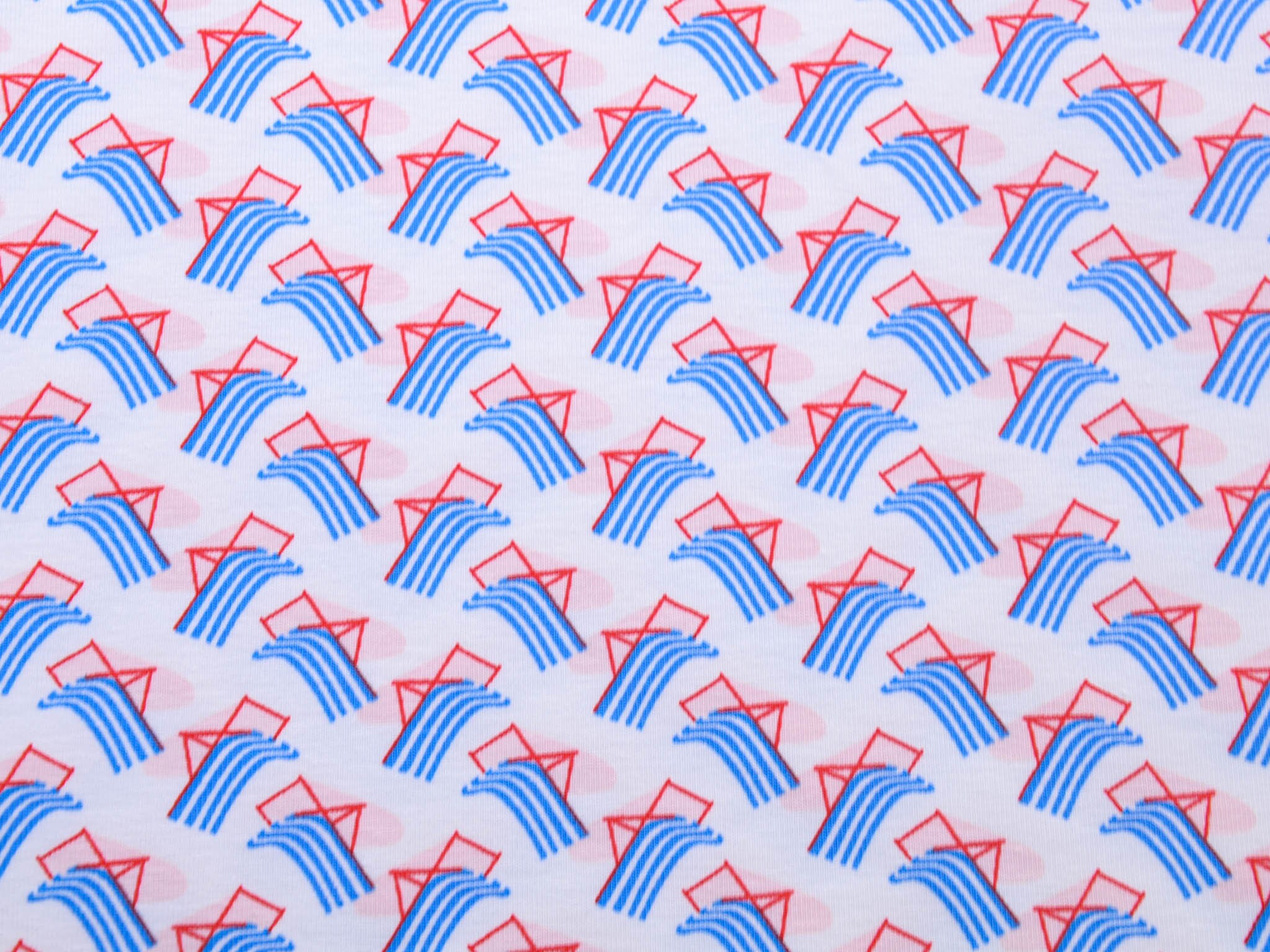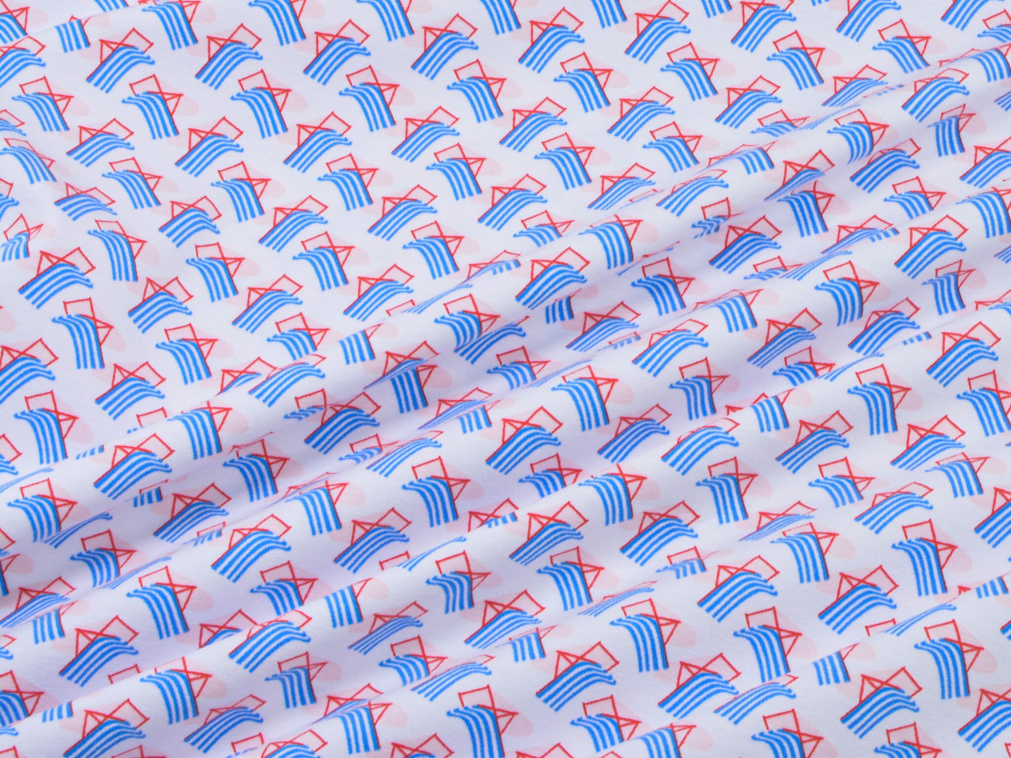Jersey aus Baumwolle mit kleinen Liegestühlen in blau, rot und rosa. Der Stoff eignet sich perfekt zum Nähen von T-Shirts, Langarmshirts, Kleidern und vielem mehr.