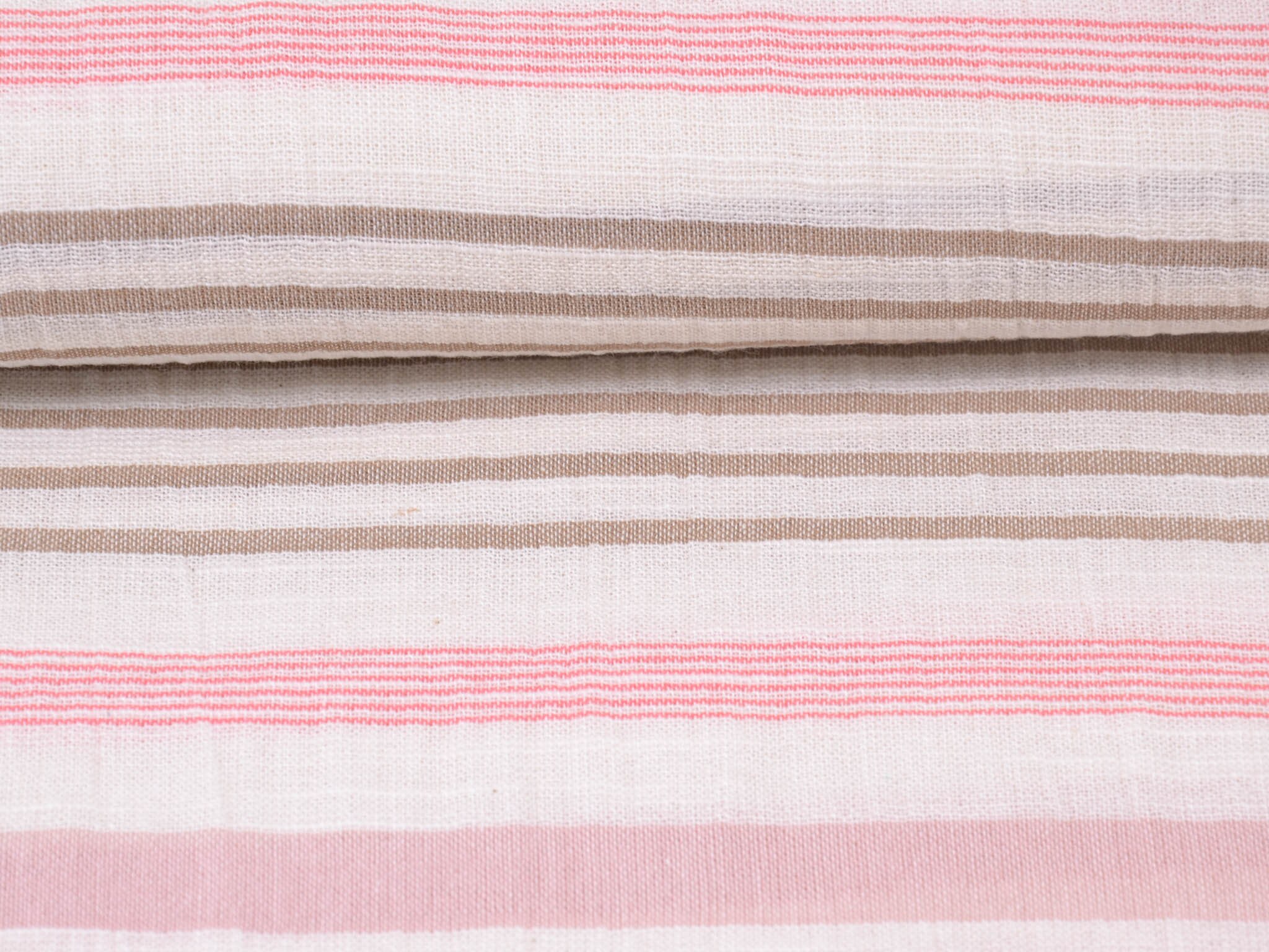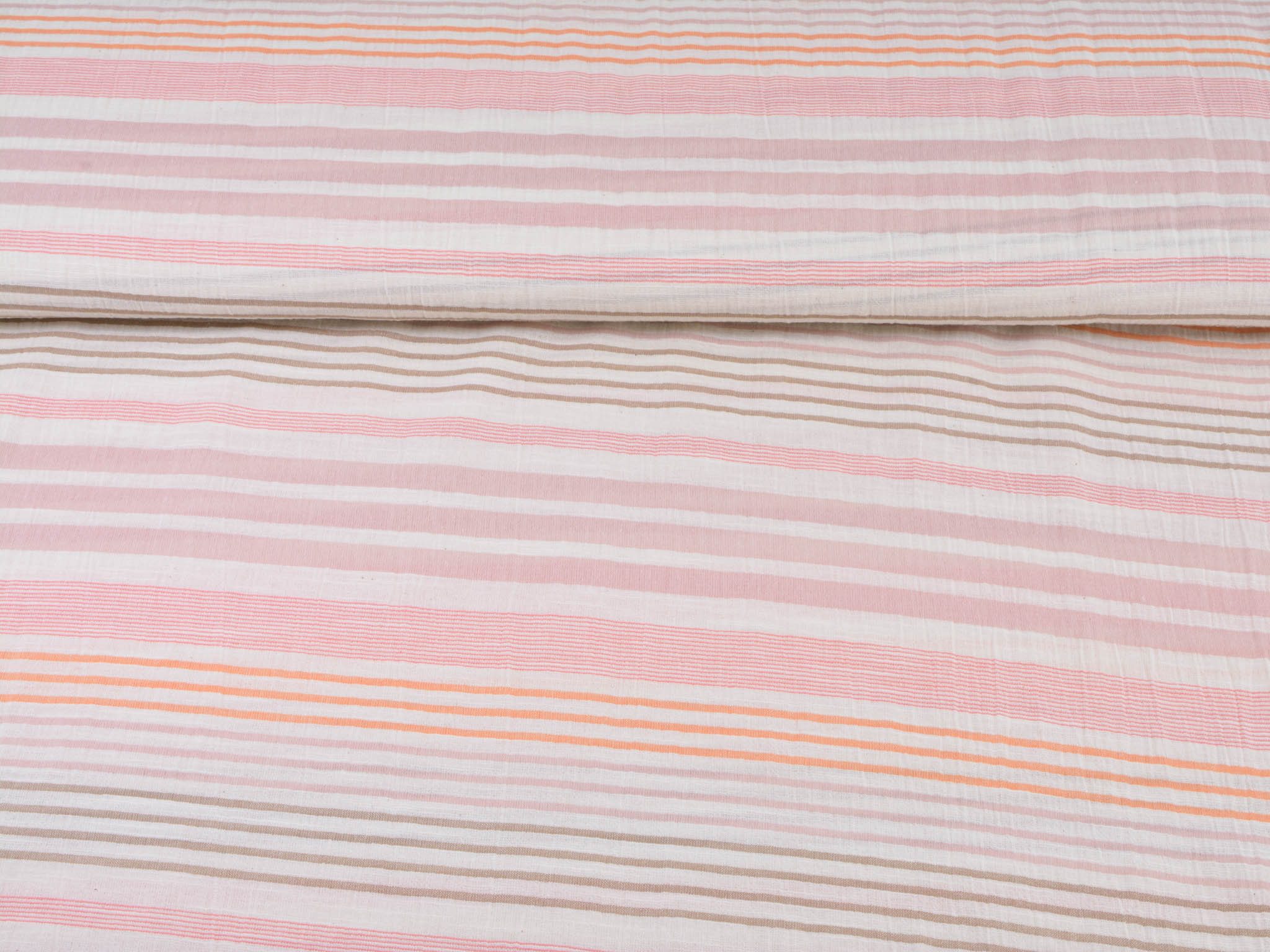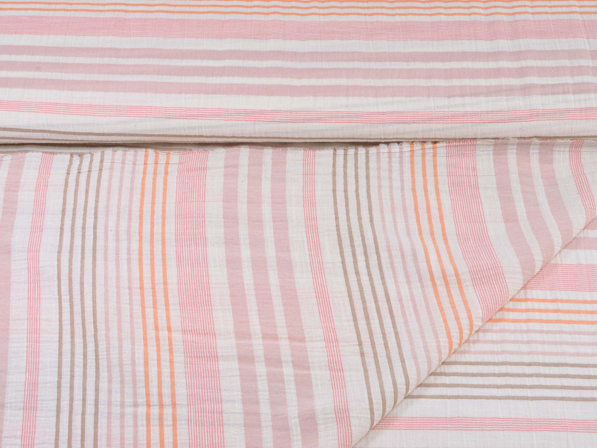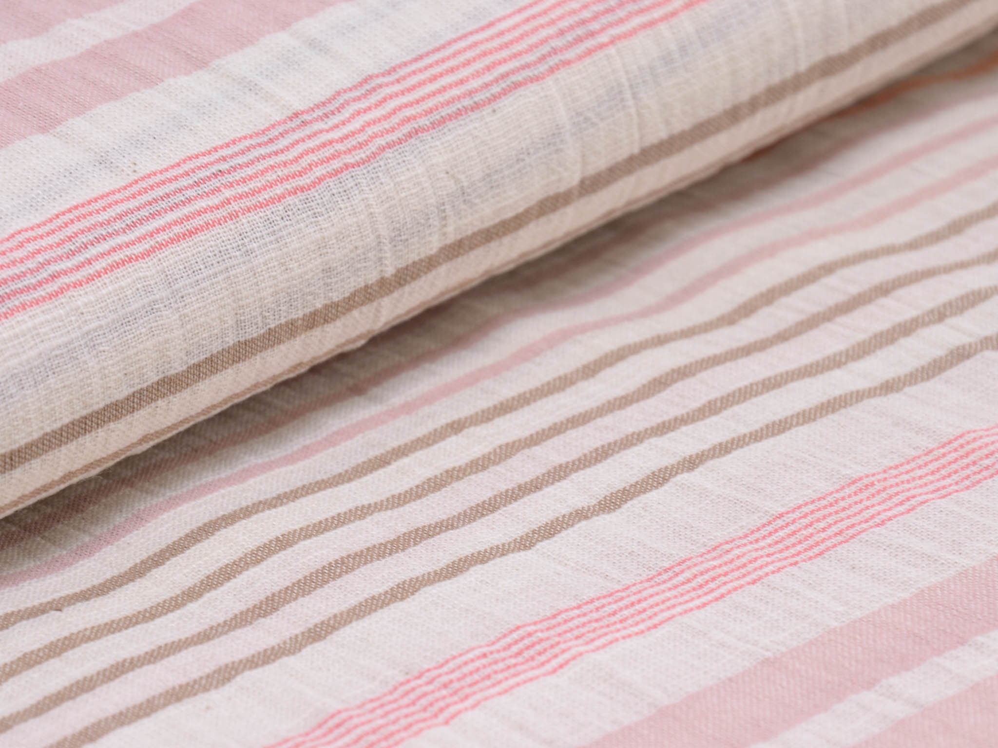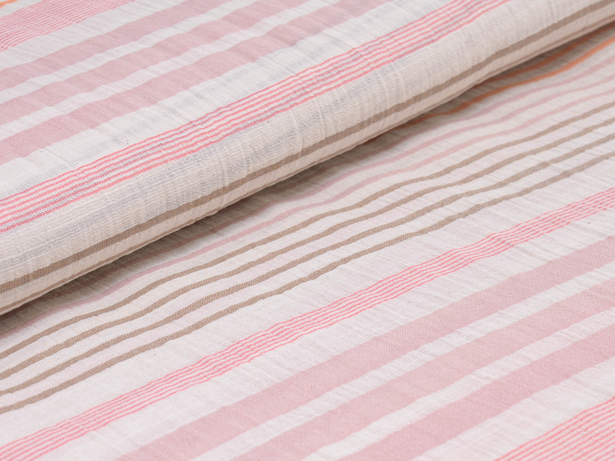 Gestreifter Stoff aus Viskose und Baumwolle. Der Stoff hat einen leichten Crinkle-Effekt, dadurch bekommt der Stoff eine natürliche Optik. Er eignet sich zum Nähen von Kleidern, Röcken, Schals, Blusen und vielem mehr.