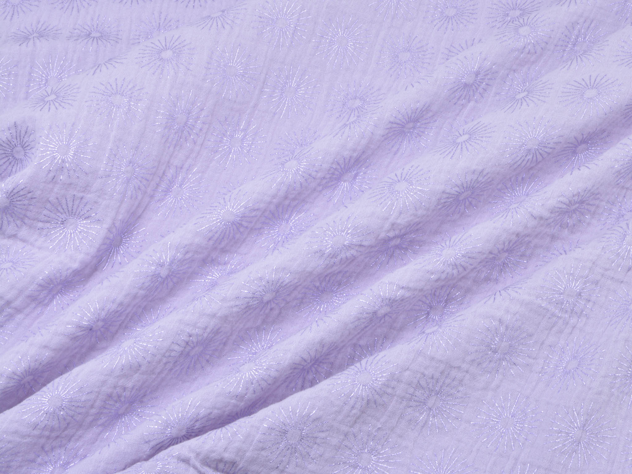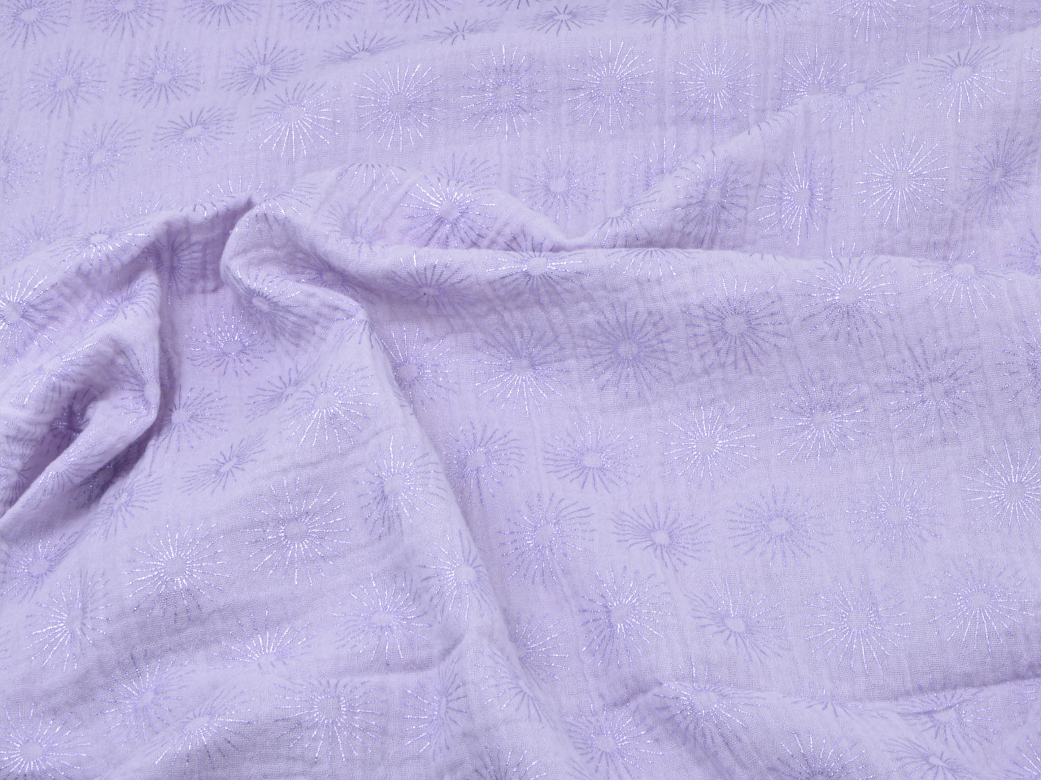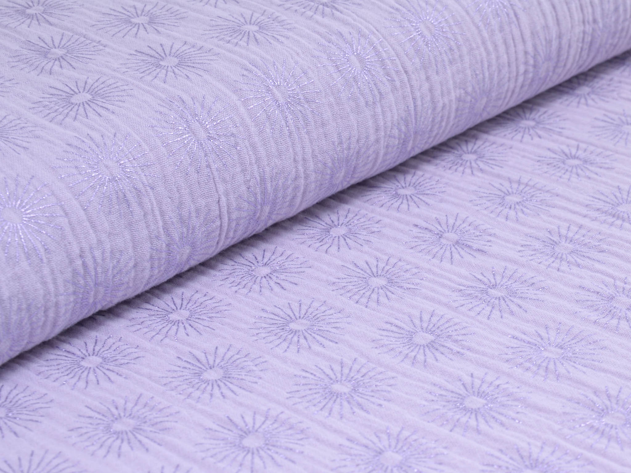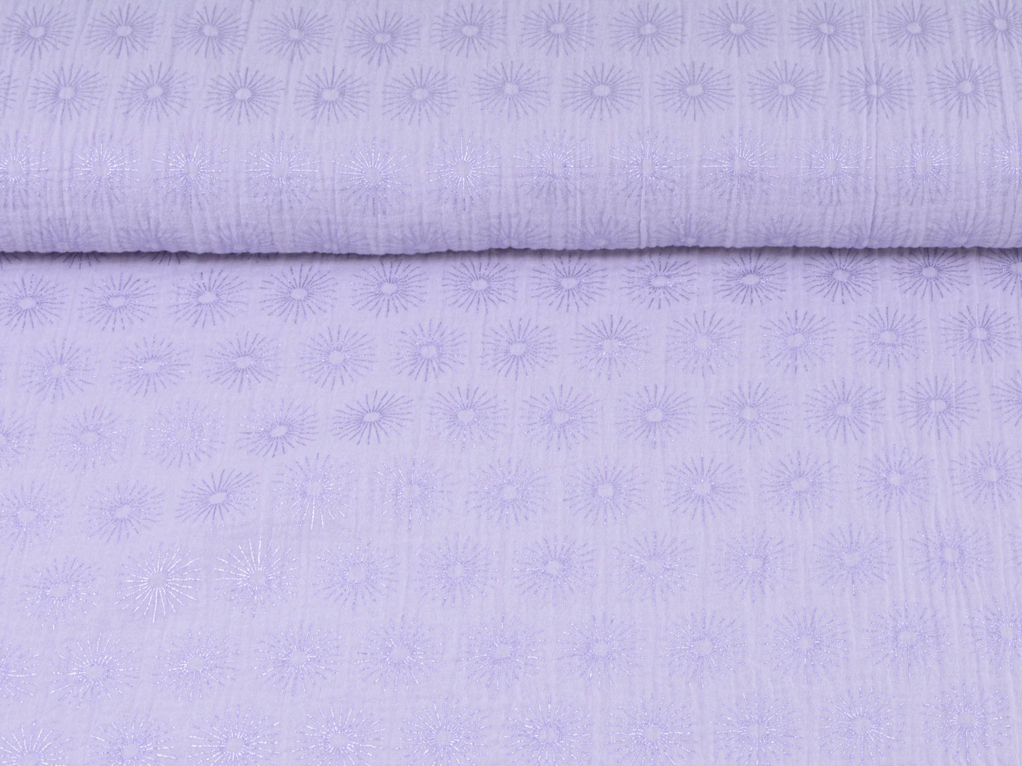 Hochwertiger Musselin aus Baumwolle. Musselin in flieder, lila mit glänzender Hot Foil Musterung. Der hautfreundliche, weiche Stoff ist perfekt zum Nähen von Kleidern, Röcken, Blusen, Halstüchern, Bettwäsche, Babybekleidung und so vielem mehr.