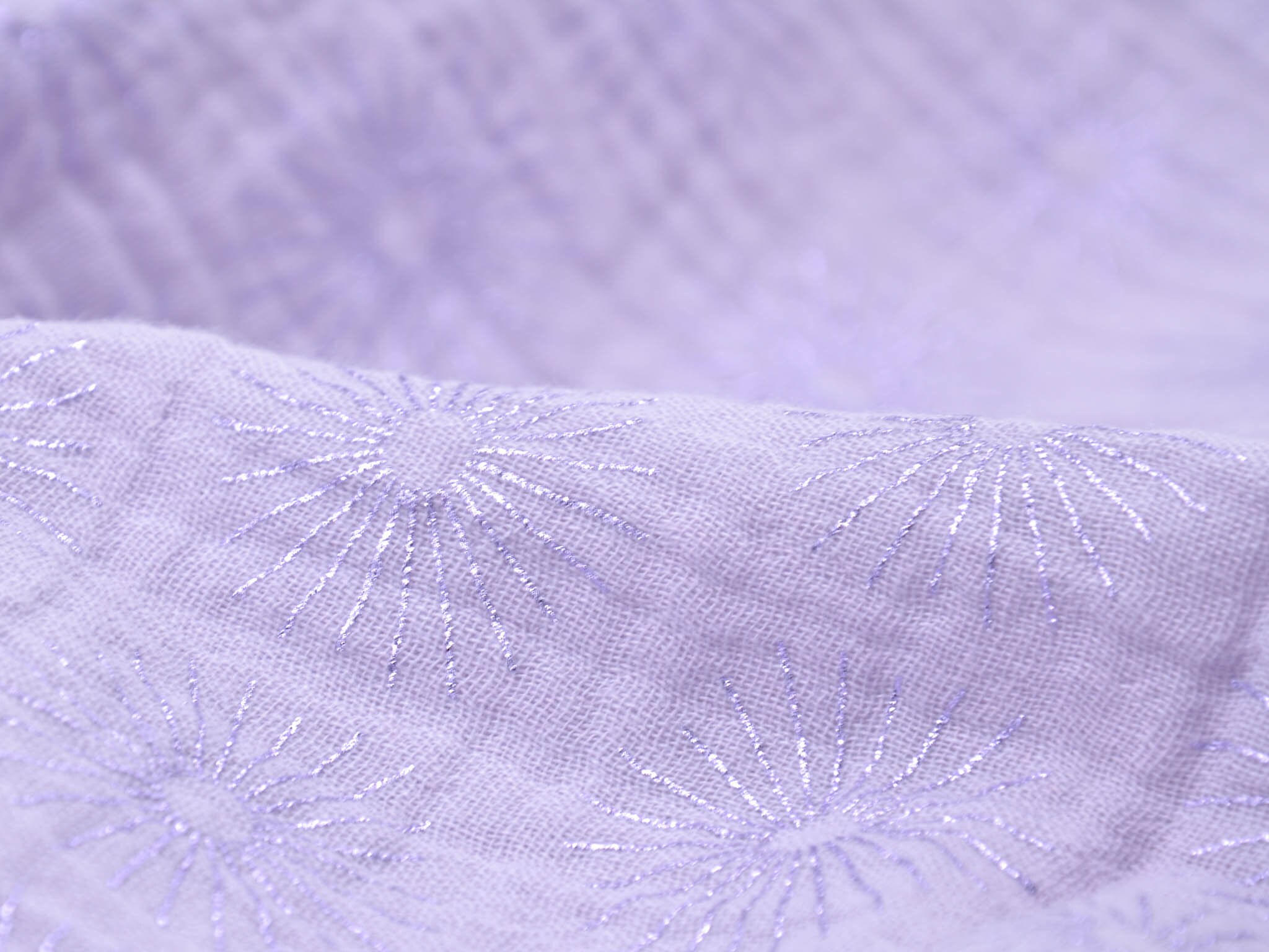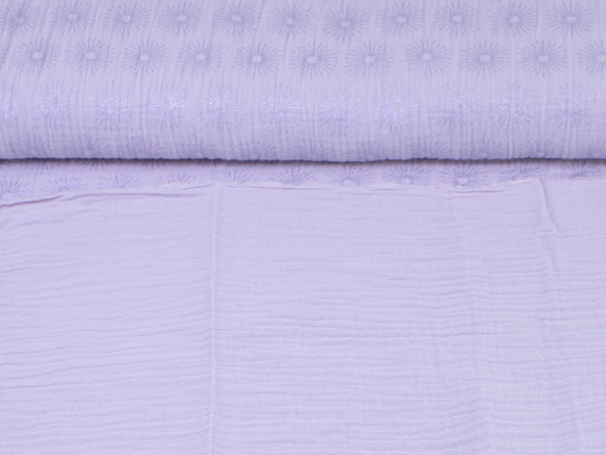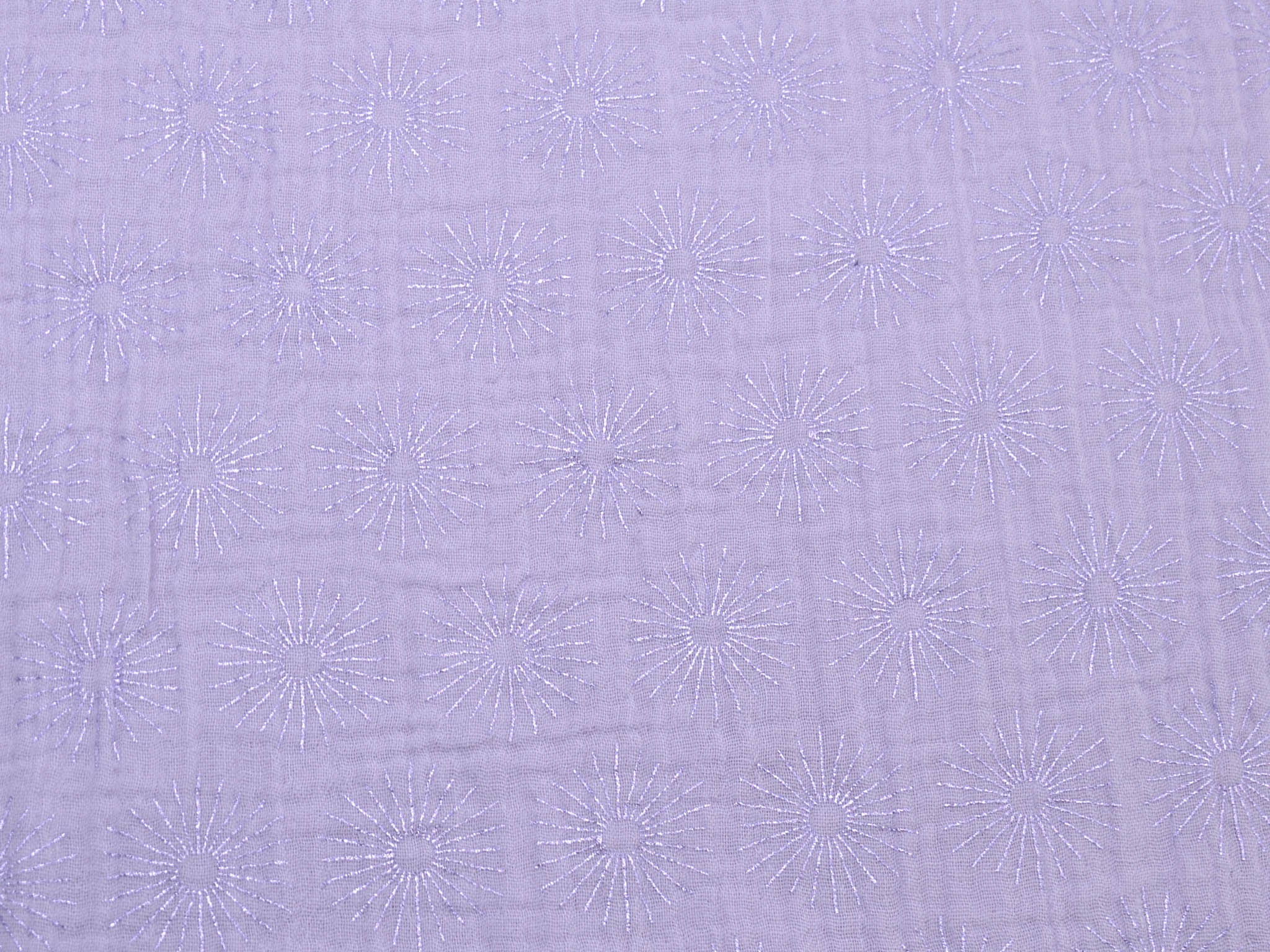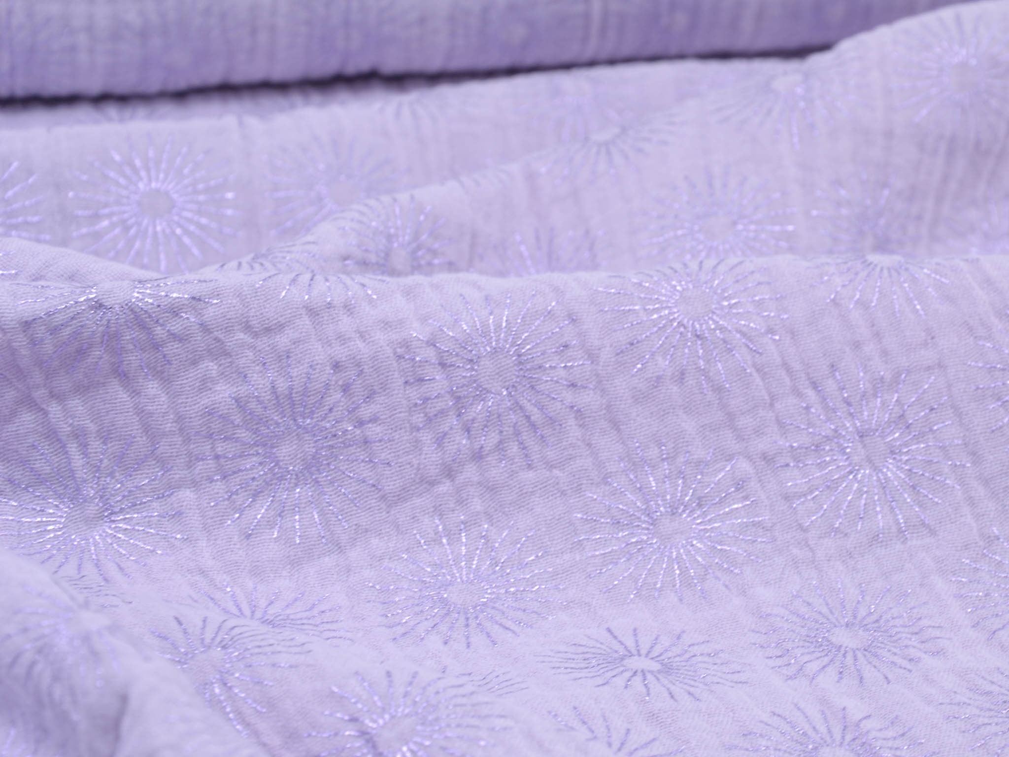 Hochwertiger Musselin aus Baumwolle. Musselin in flieder, lila mit glänzender Hot Foil Musterung. Der hautfreundliche, weiche Stoff ist perfekt zum Nähen von Kleidern, Röcken, Blusen, Halstüchern, Bettwäsche, Babybekleidung und so vielem mehr.