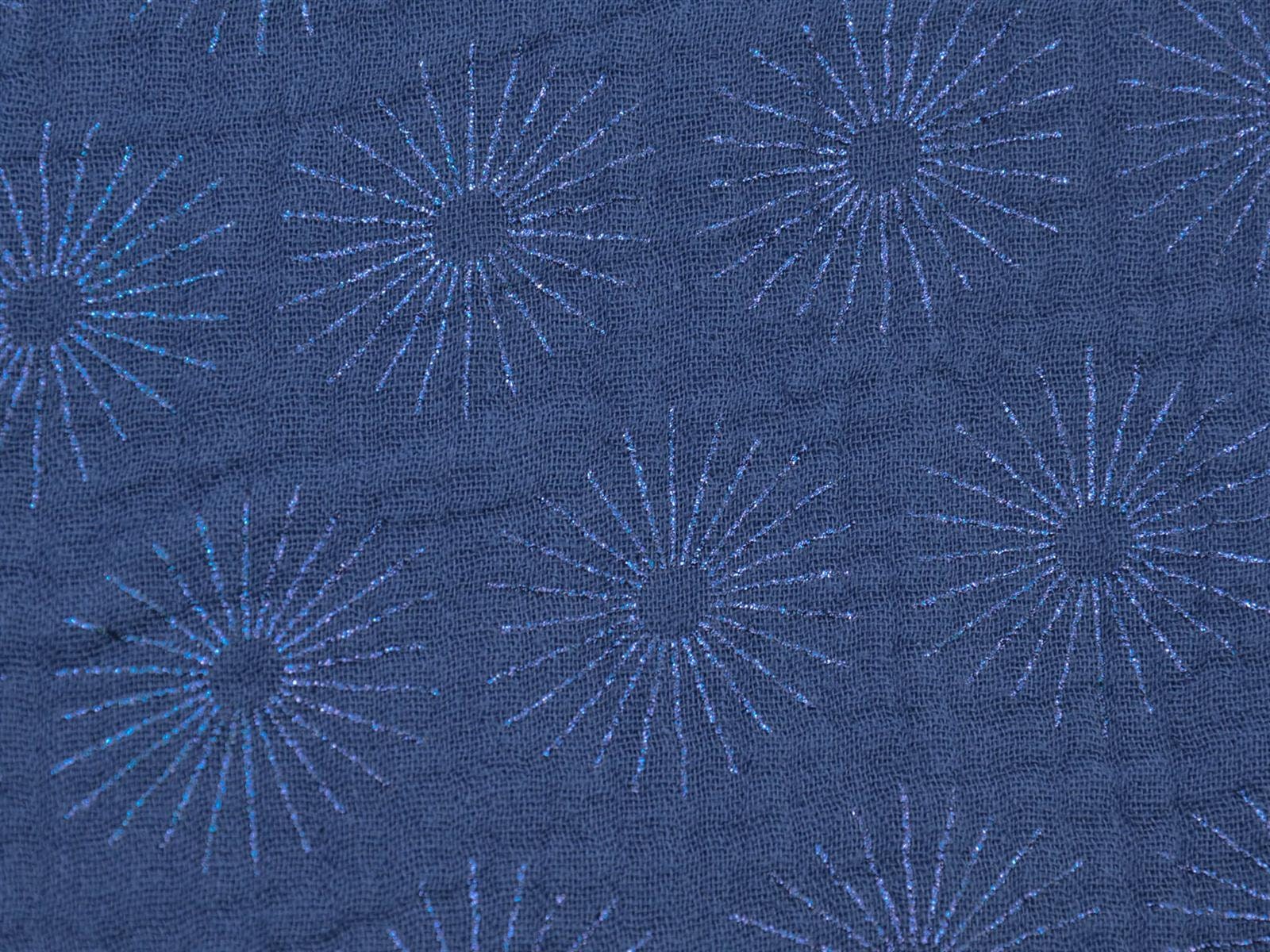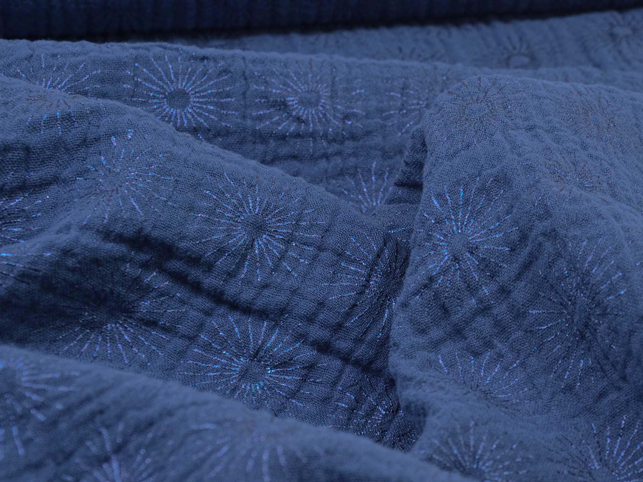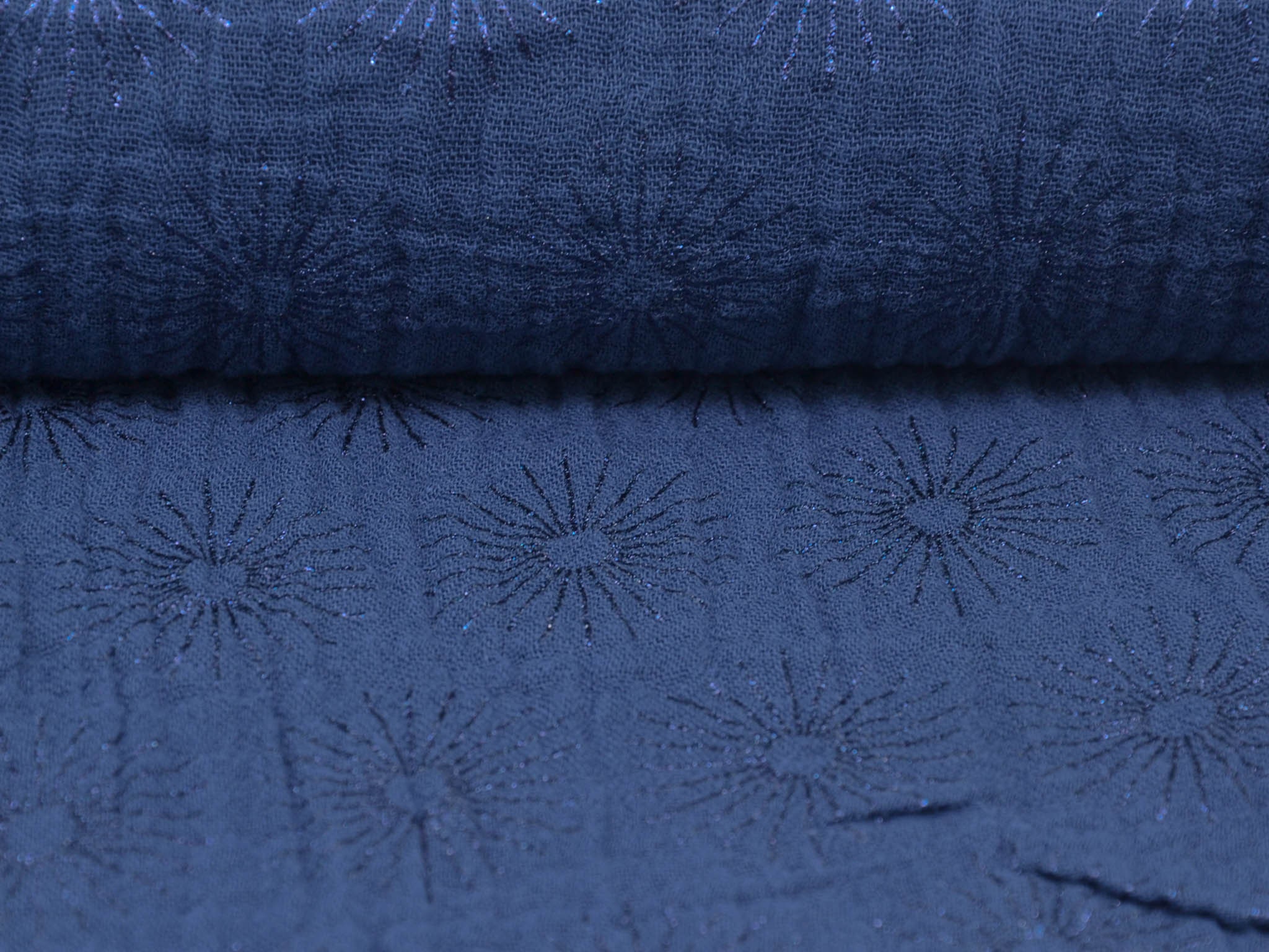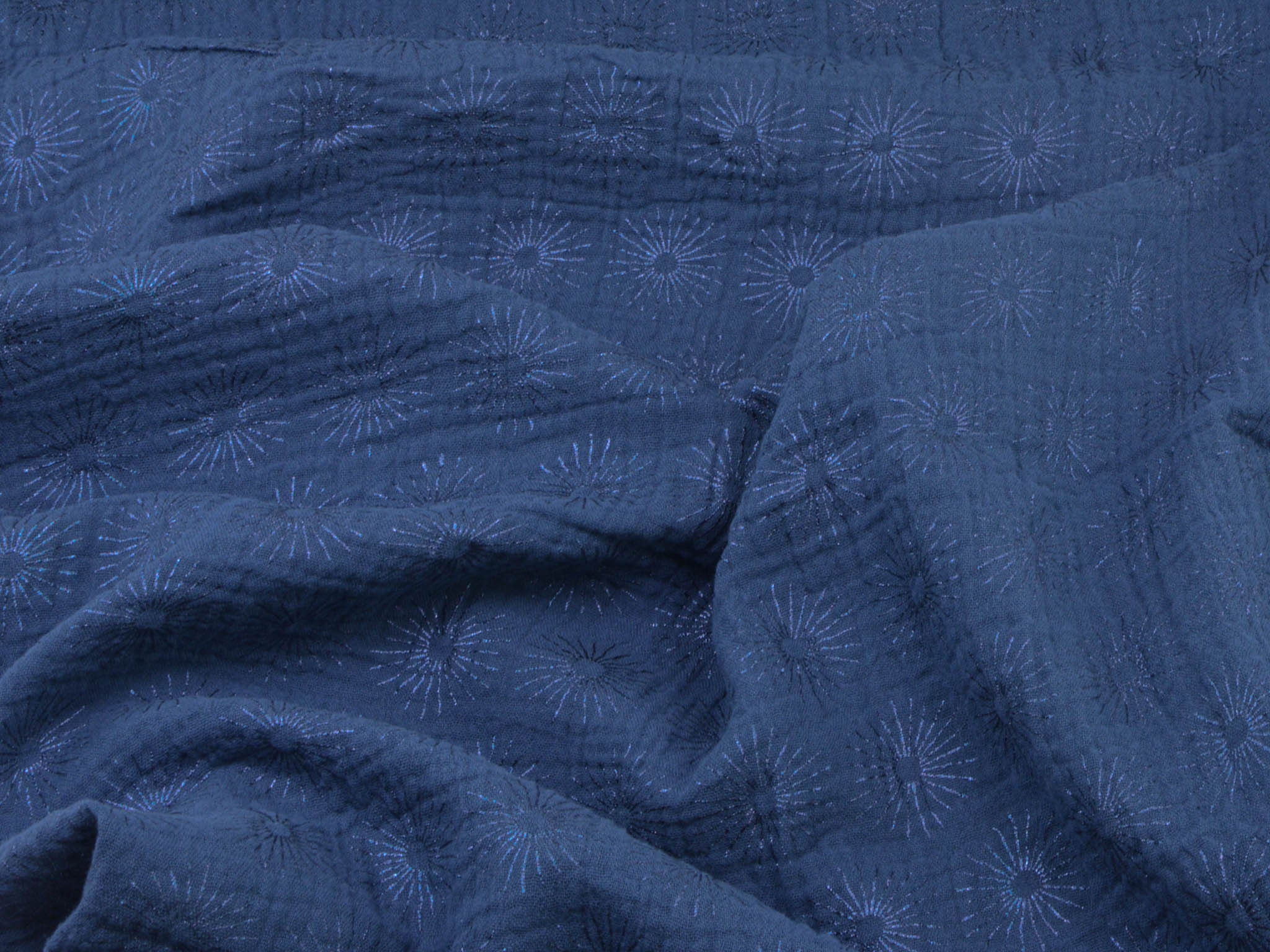 Hochwertiger Musselin aus Baumwolle. Blauer Musselin mit Sonnen in glitzernd. Der hautfreundliche, weiche Stoff ist perfekt zum Nähen von Kleidern, Röcken, Blusen, Halstüchern, Bettwäsche, Babybekleidung und so vielem mehr.