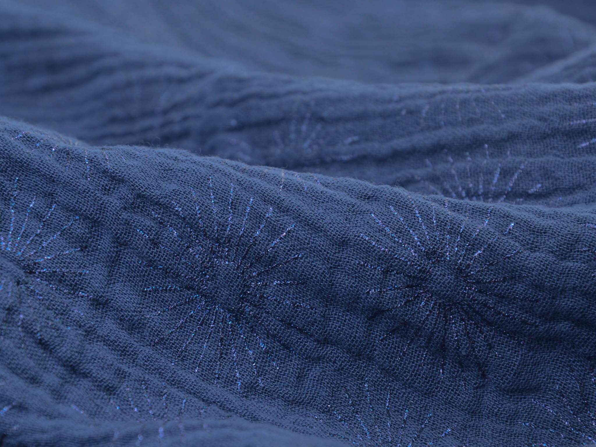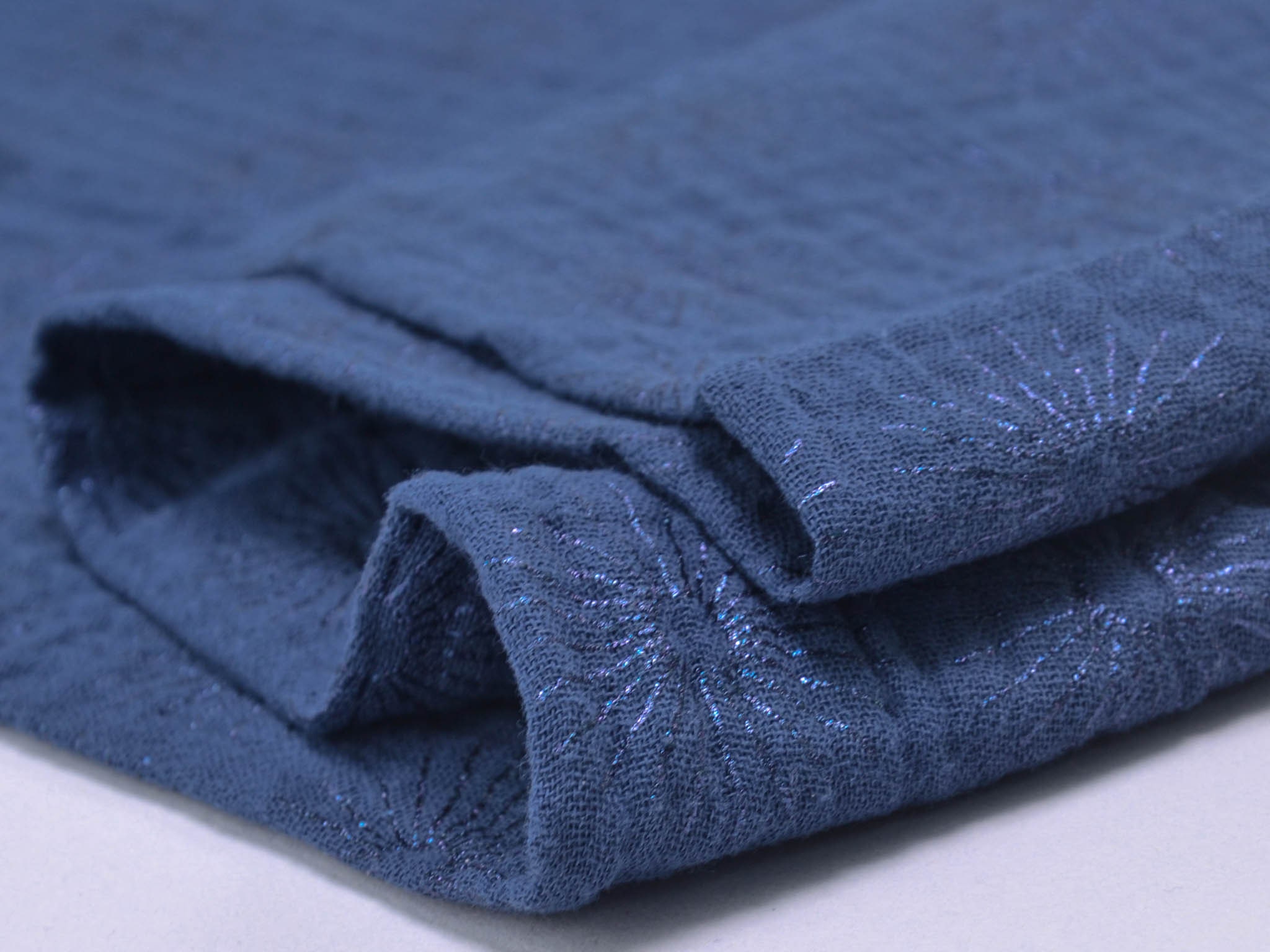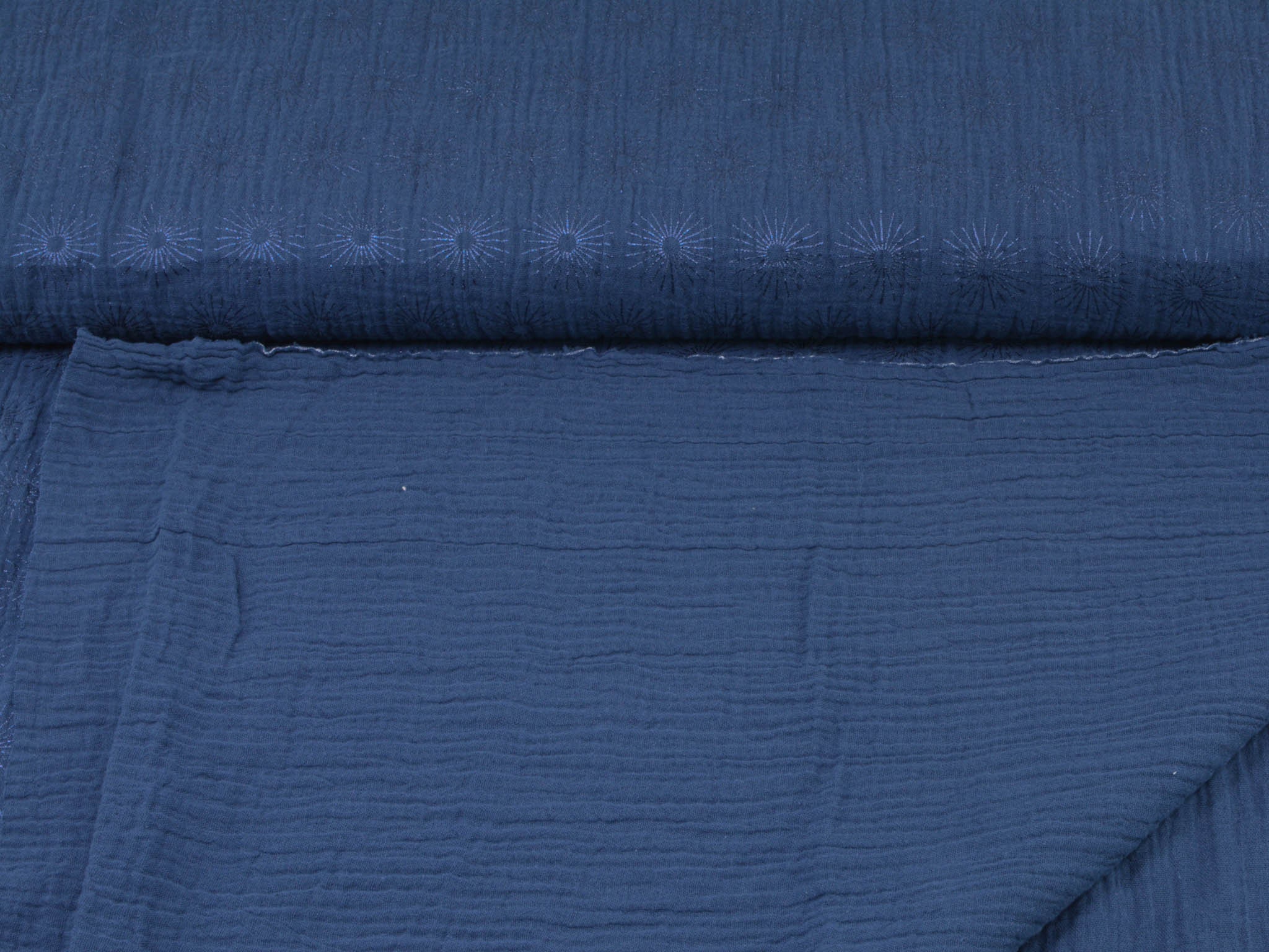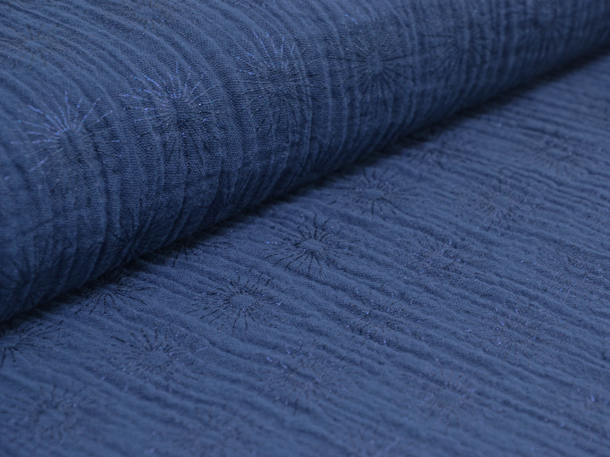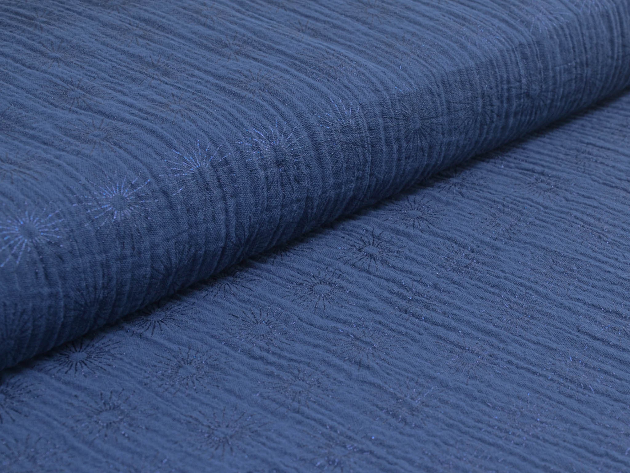 Hochwertiger Musselin aus Baumwolle. Blauer Musselin mit Sonnen in glitzernd. Der hautfreundliche, weiche Stoff ist perfekt zum Nähen von Kleidern, Röcken, Blusen, Halstüchern, Bettwäsche, Babybekleidung und so vielem mehr.