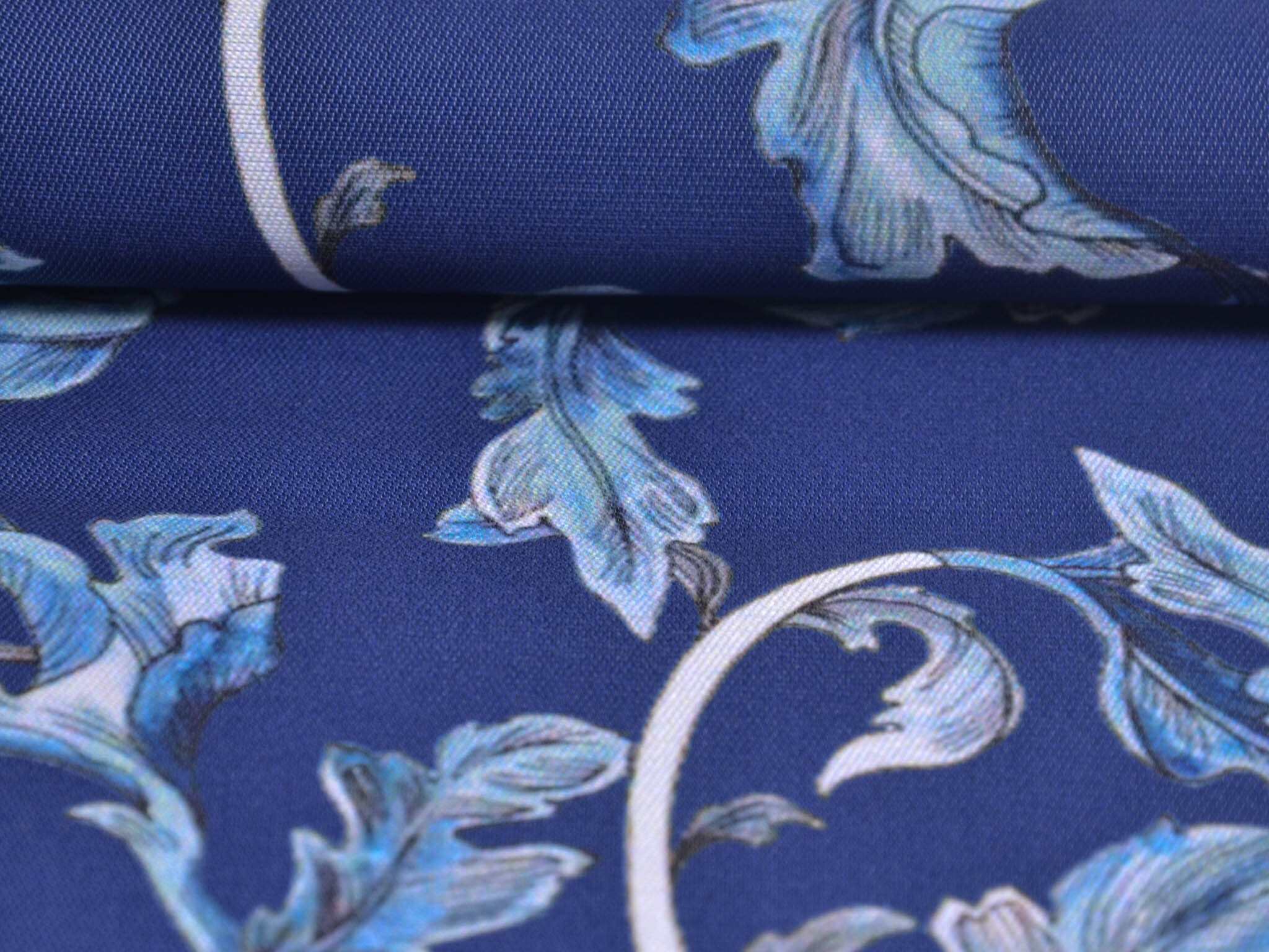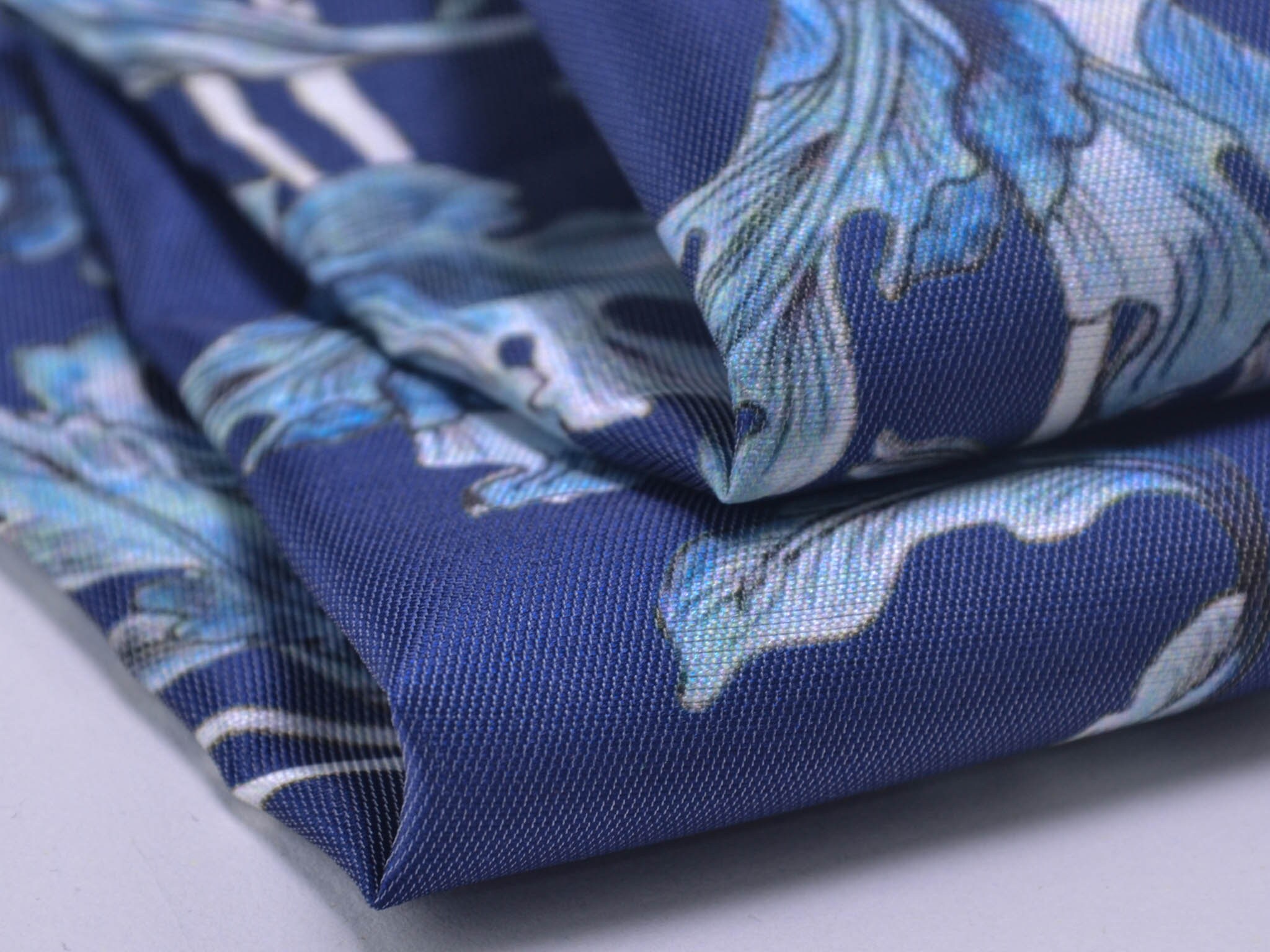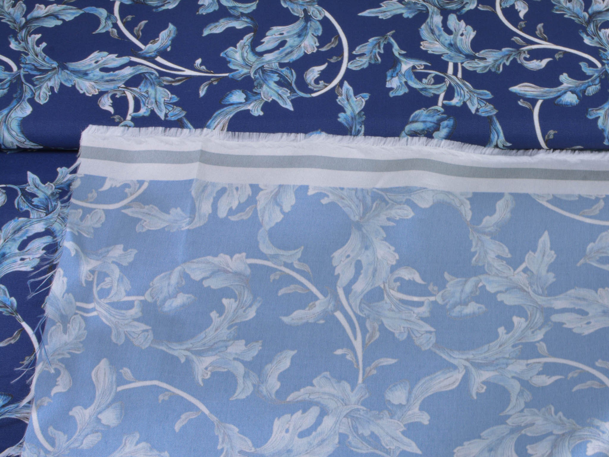 Designer Stoff aus Italien. Die hochwertige Seiden-Polyester-Mischung hat einen edle Glanz und ist gemustert in blau.
