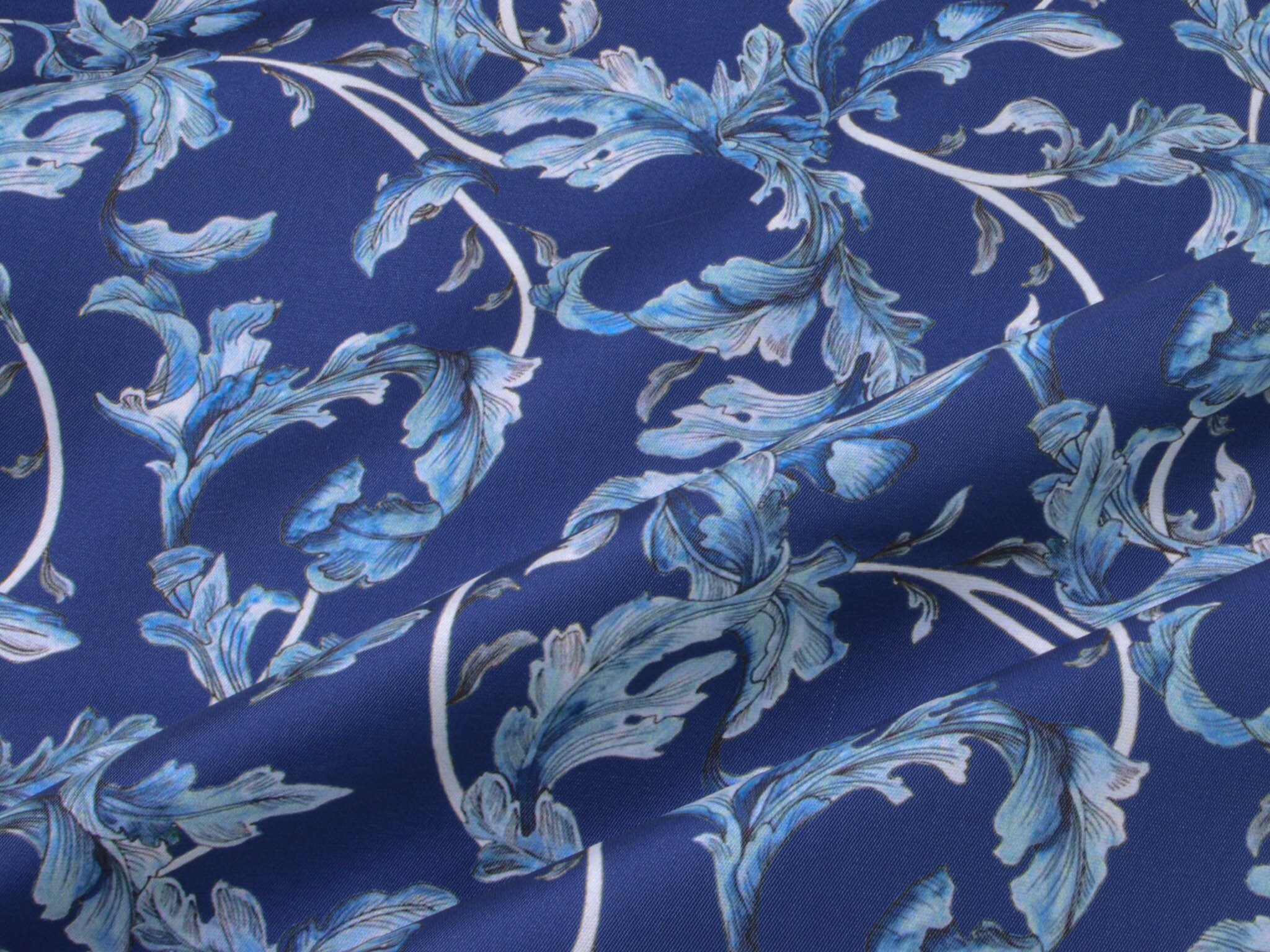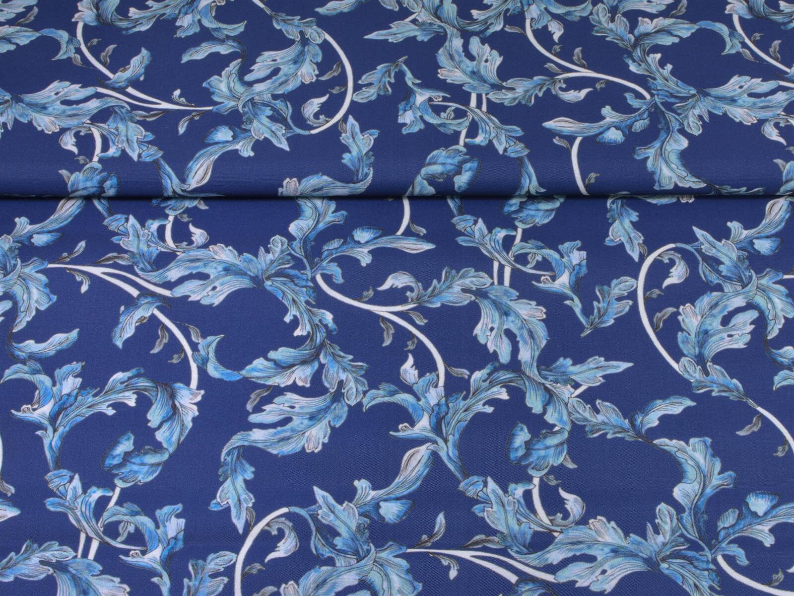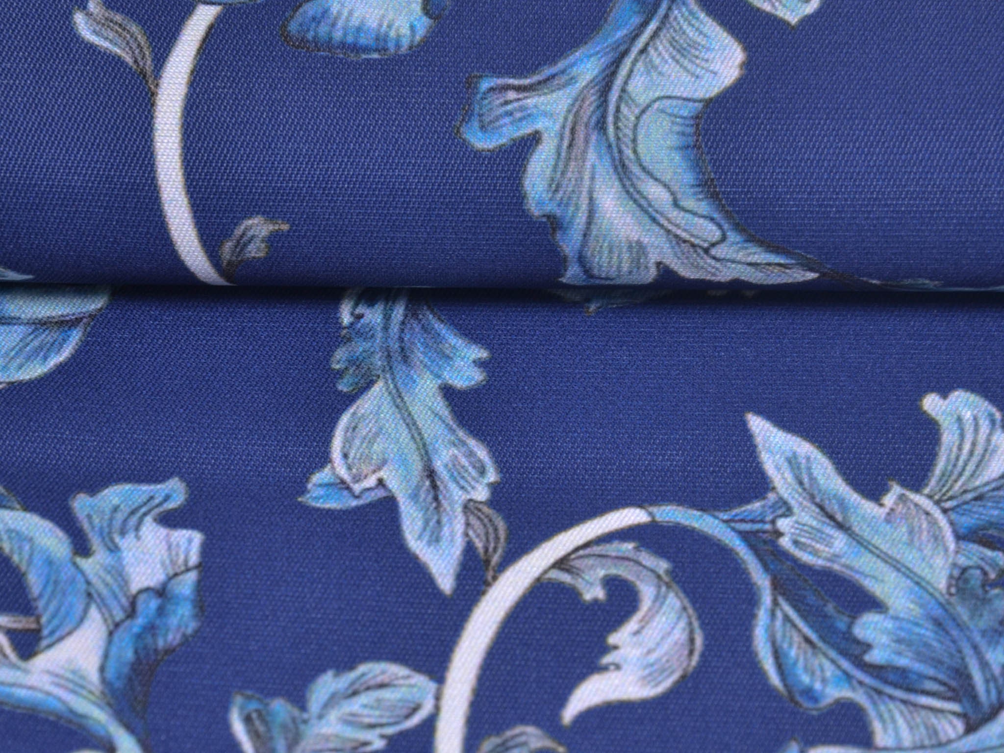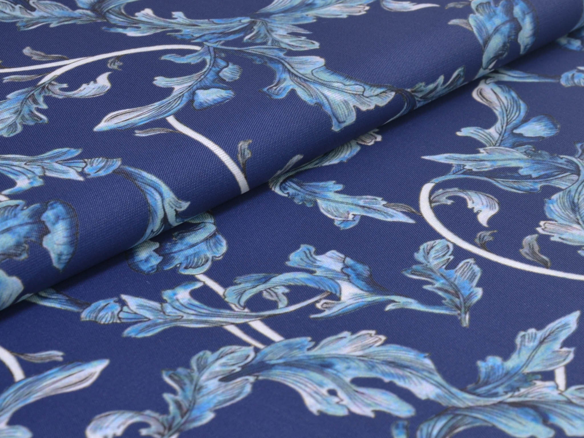 Designer Stoff aus Italien. Die hochwertige Seiden-Polyester-Mischung hat einen edle Glanz und ist gemustert in blau.