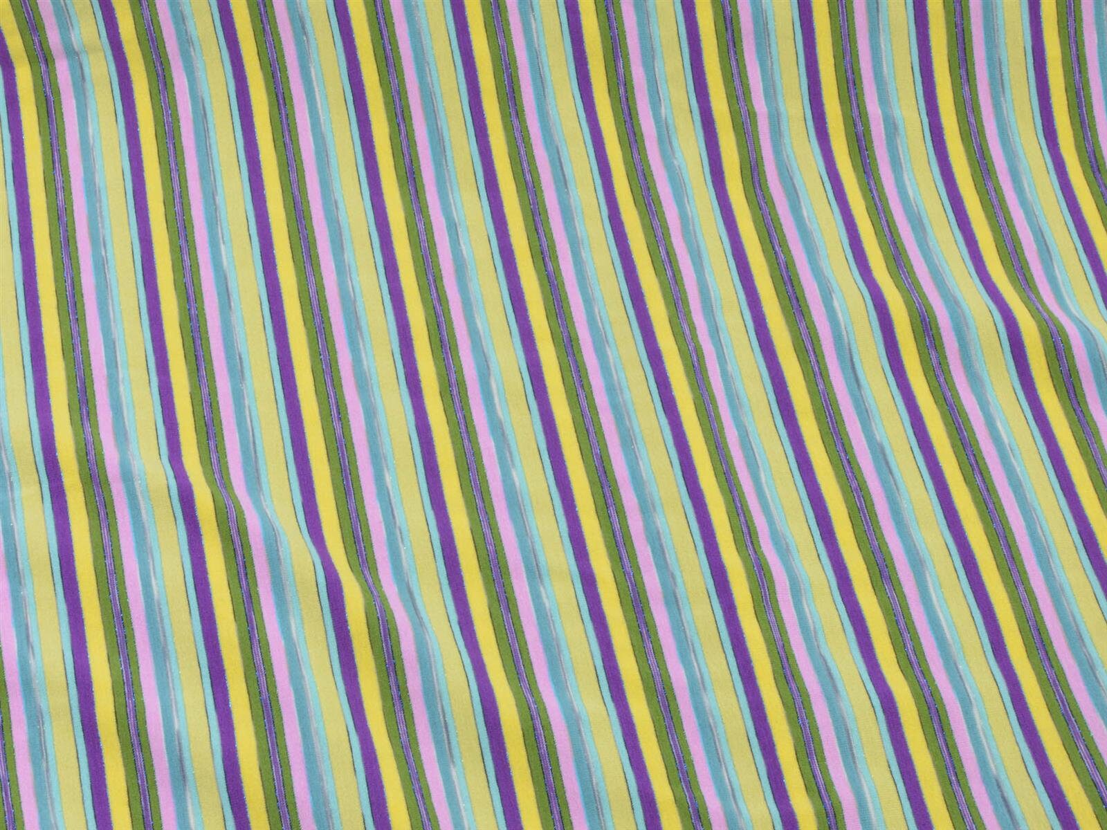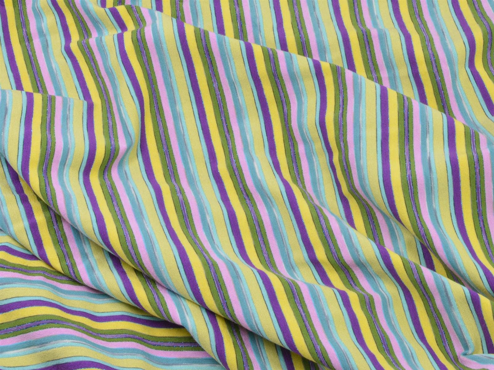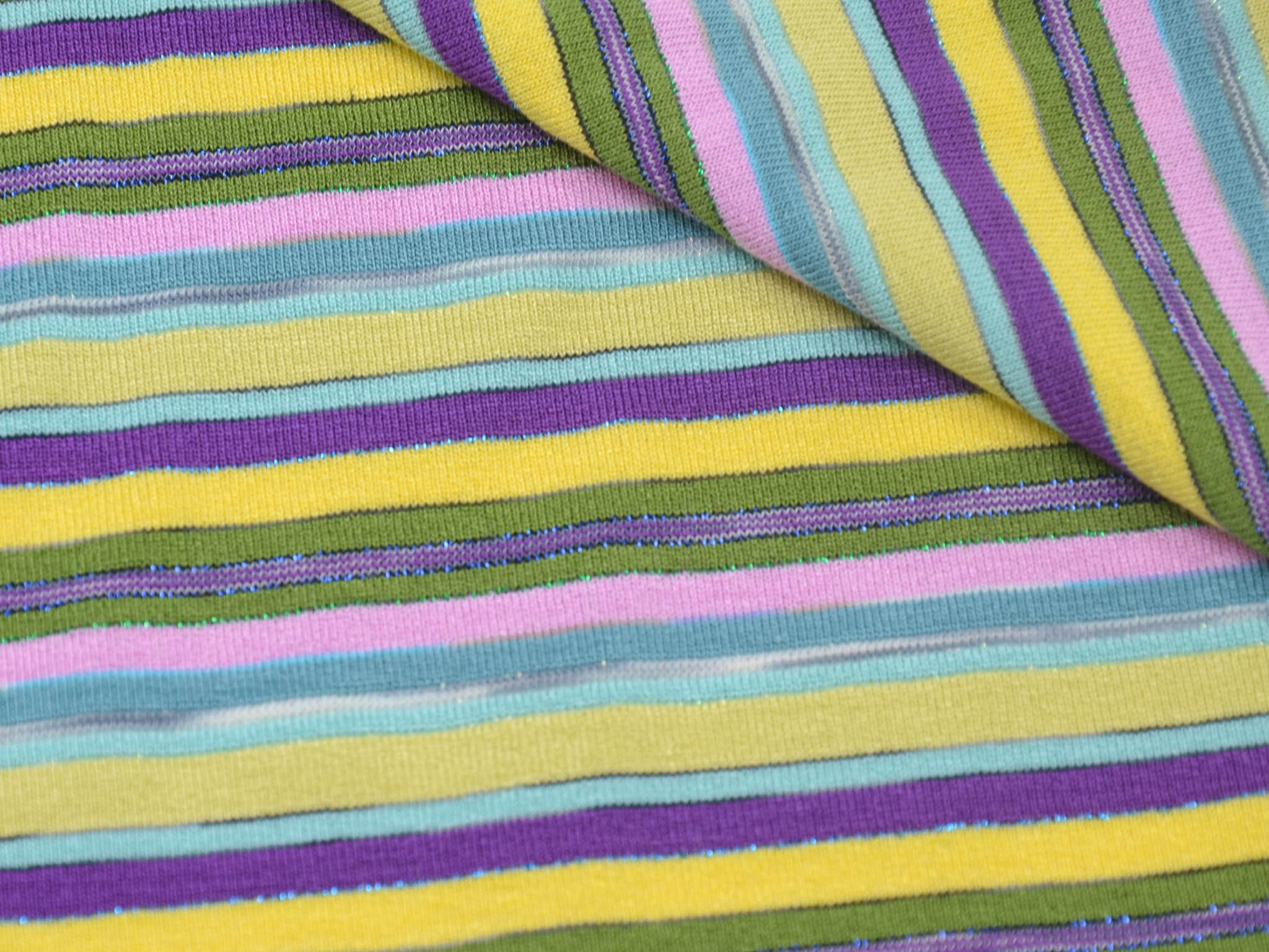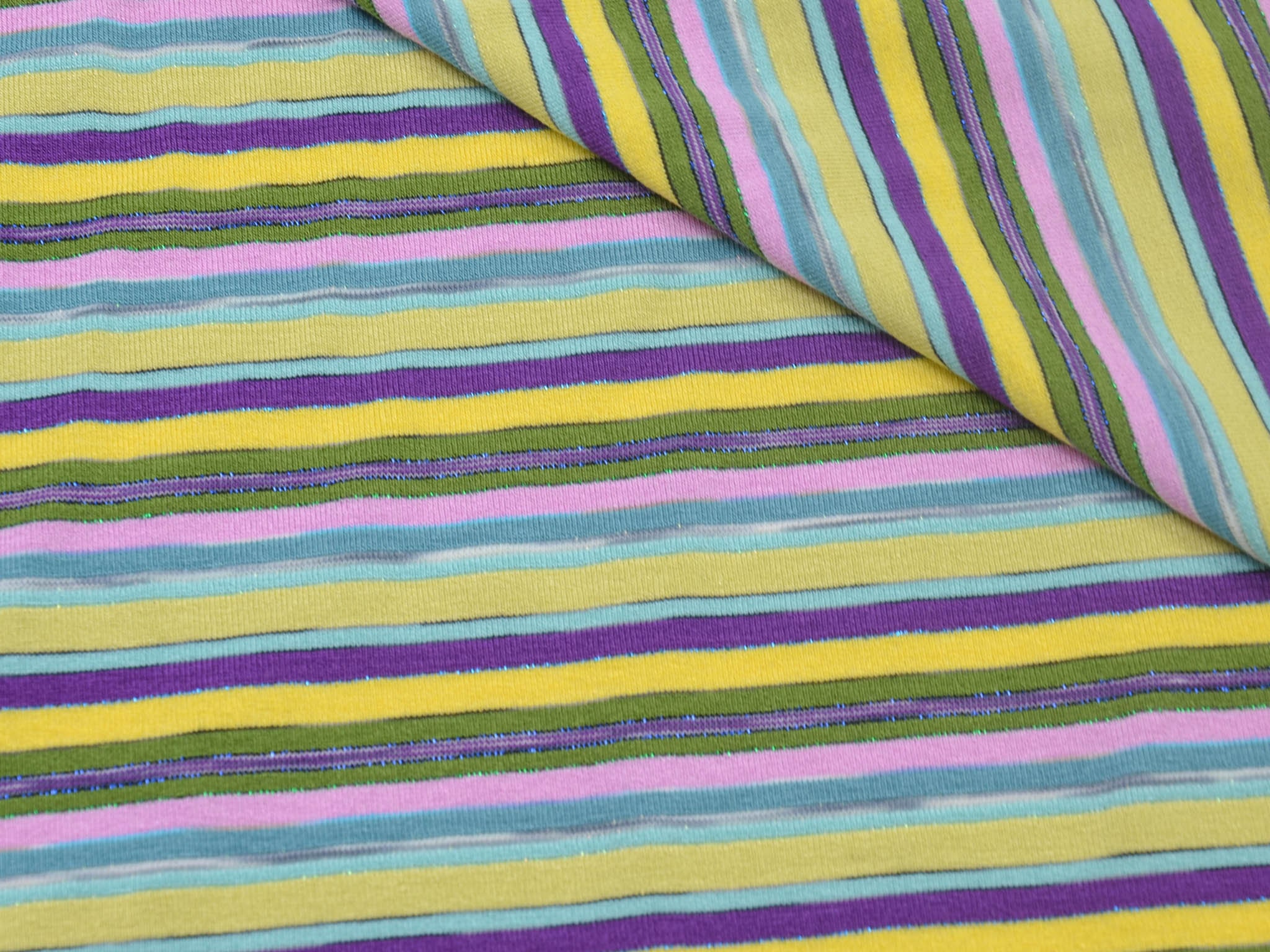 Cotton jersey with shimmering stripes in purple, green, yellow, and blue. Each stripe is approximately 0.5 cm wide. The fabric is thin and stretchy. It's perfect for sewing T-shirts, shorts, dresses, skirts, and much more.