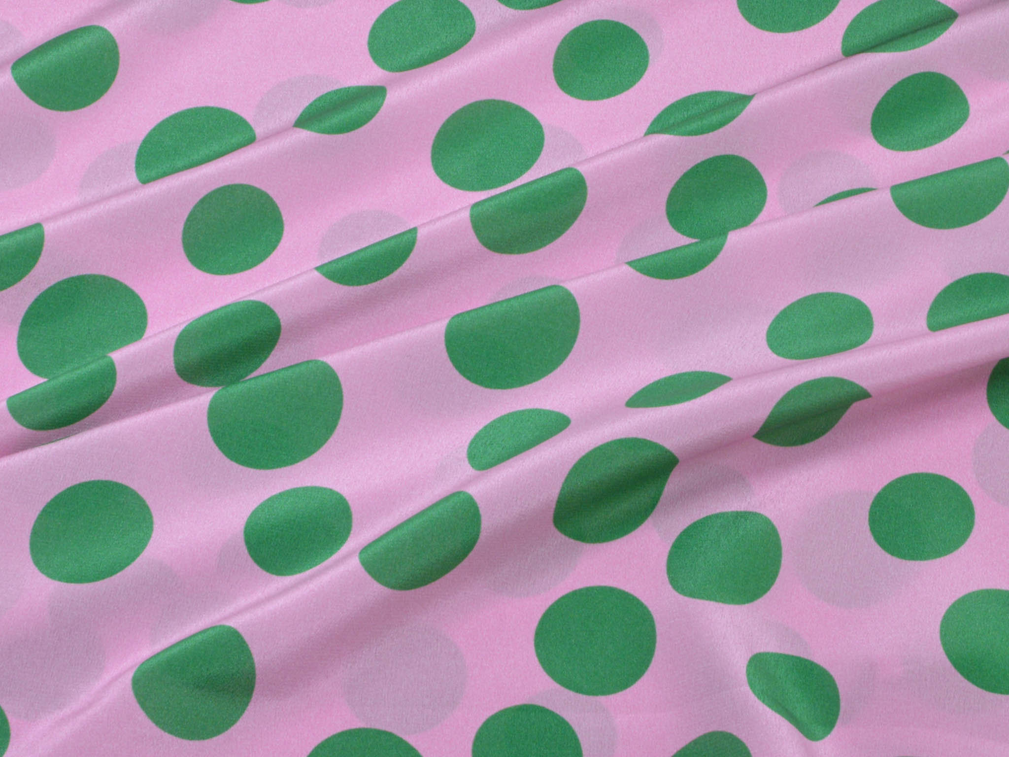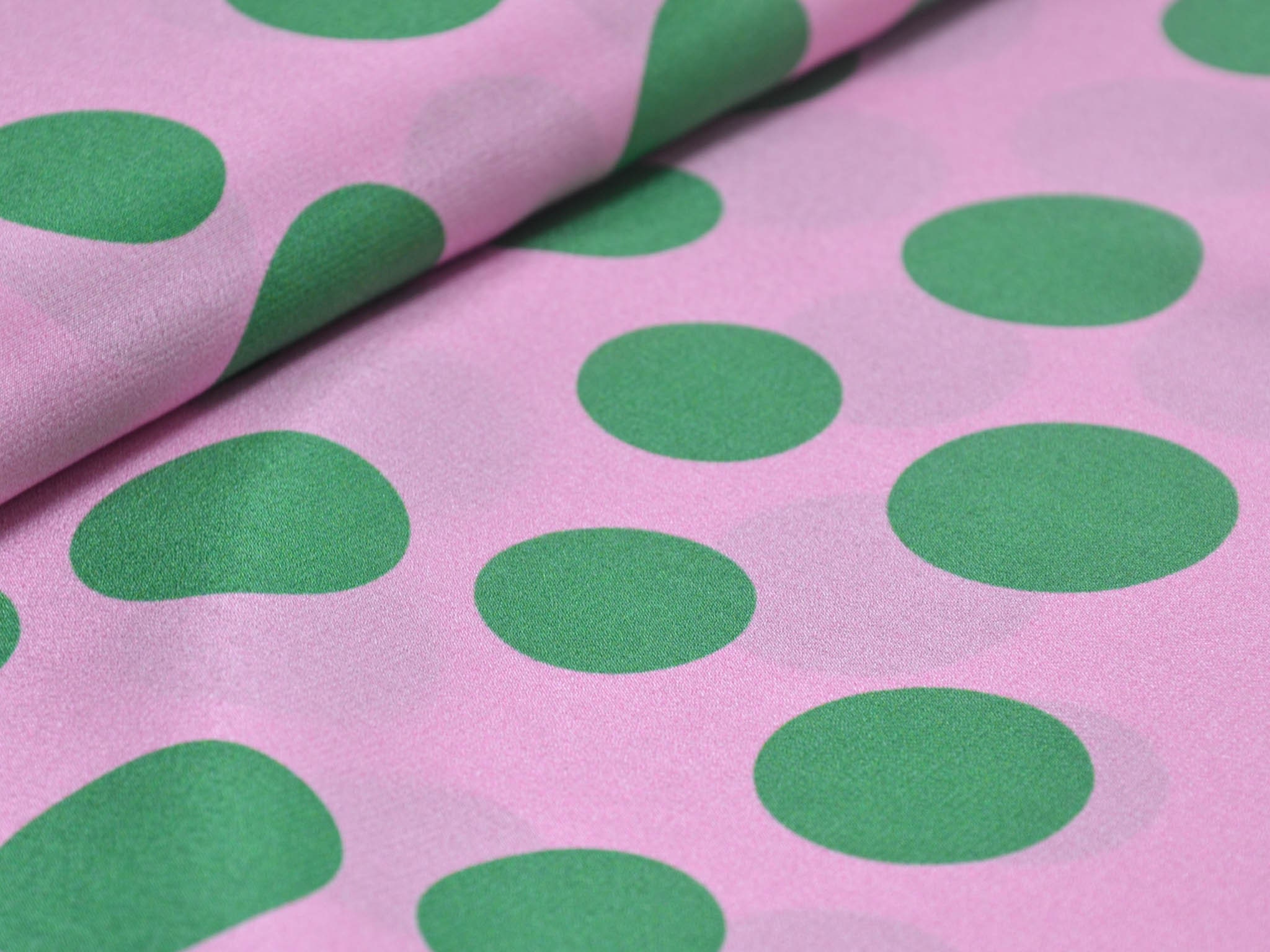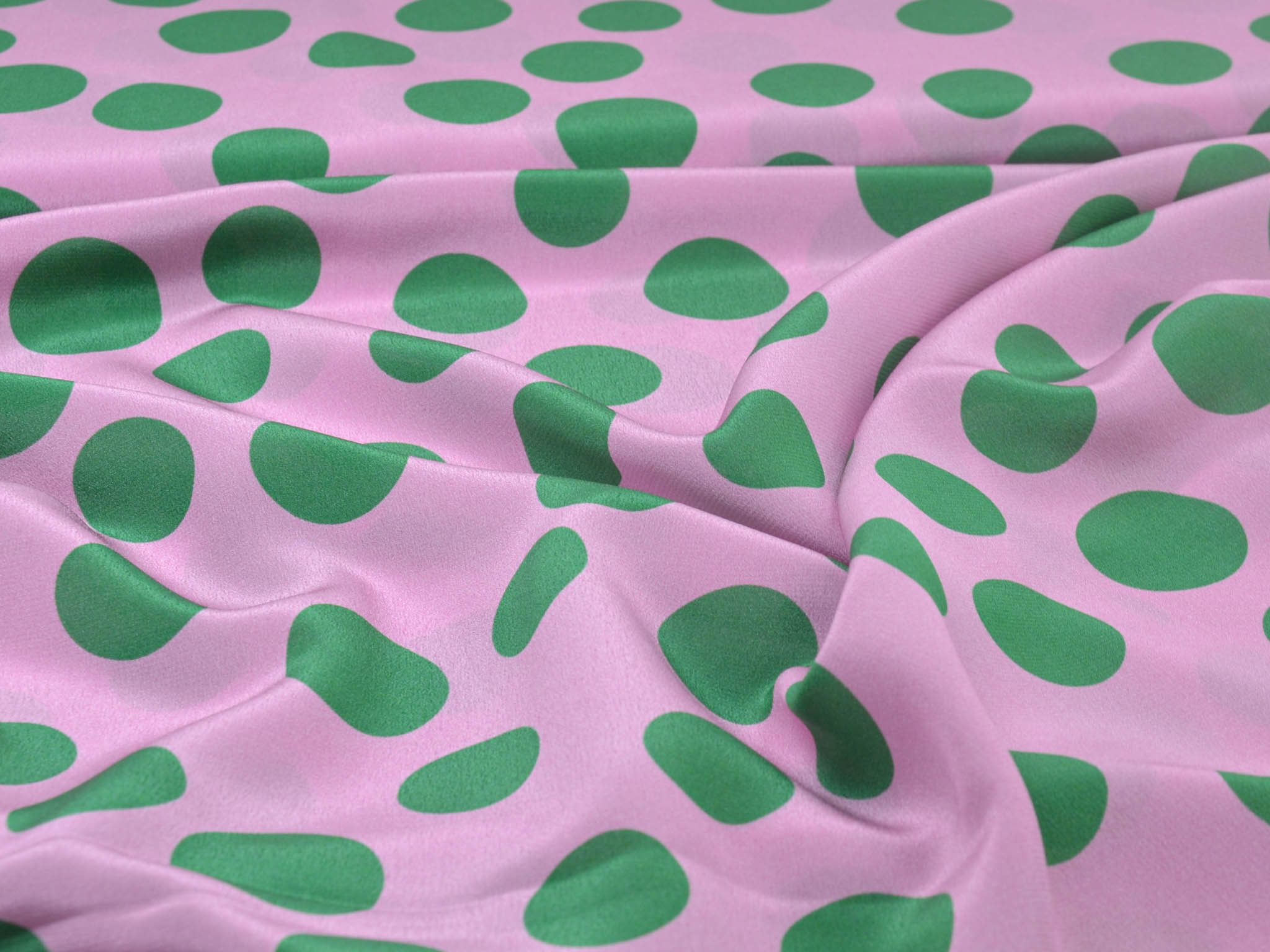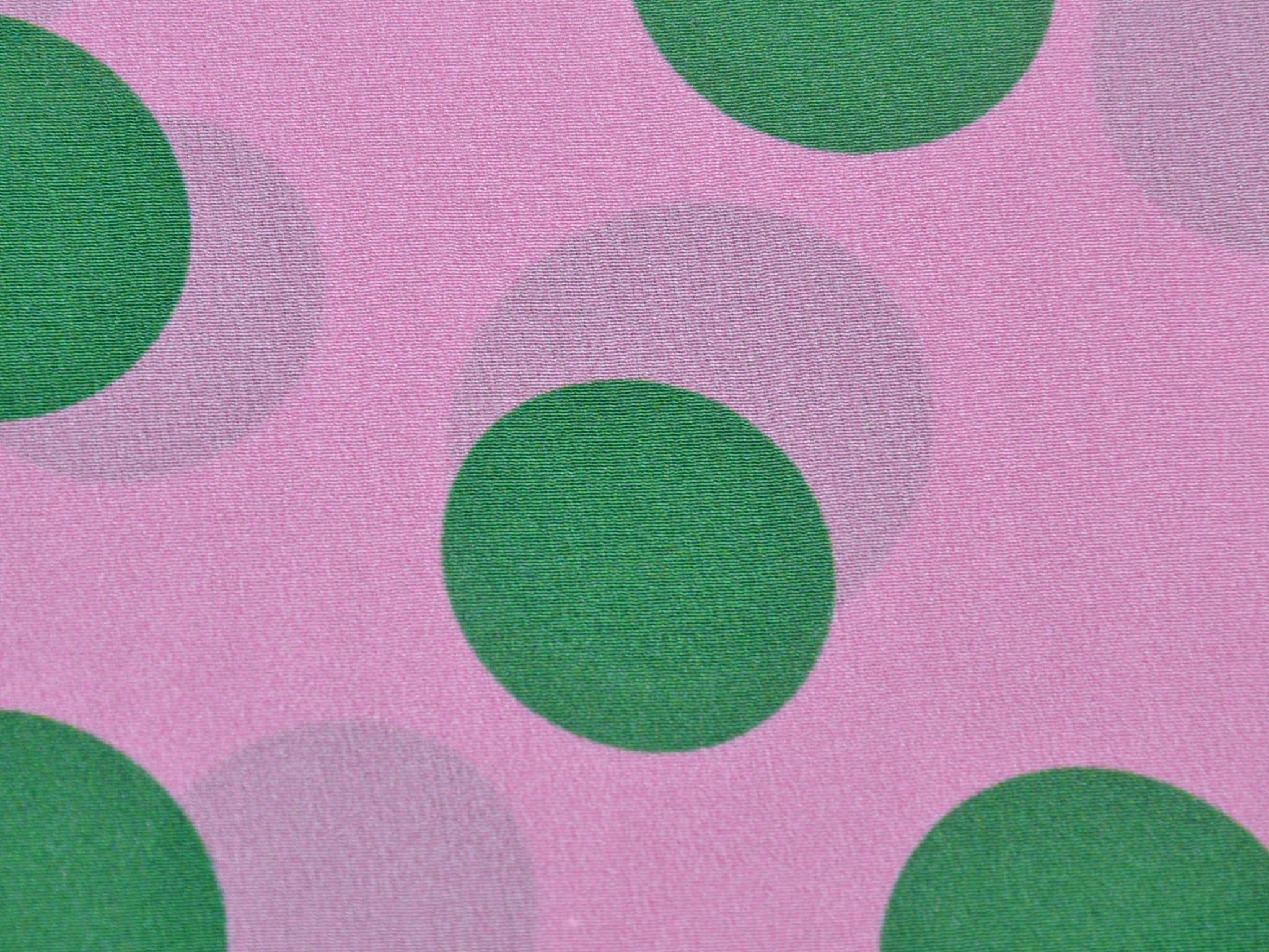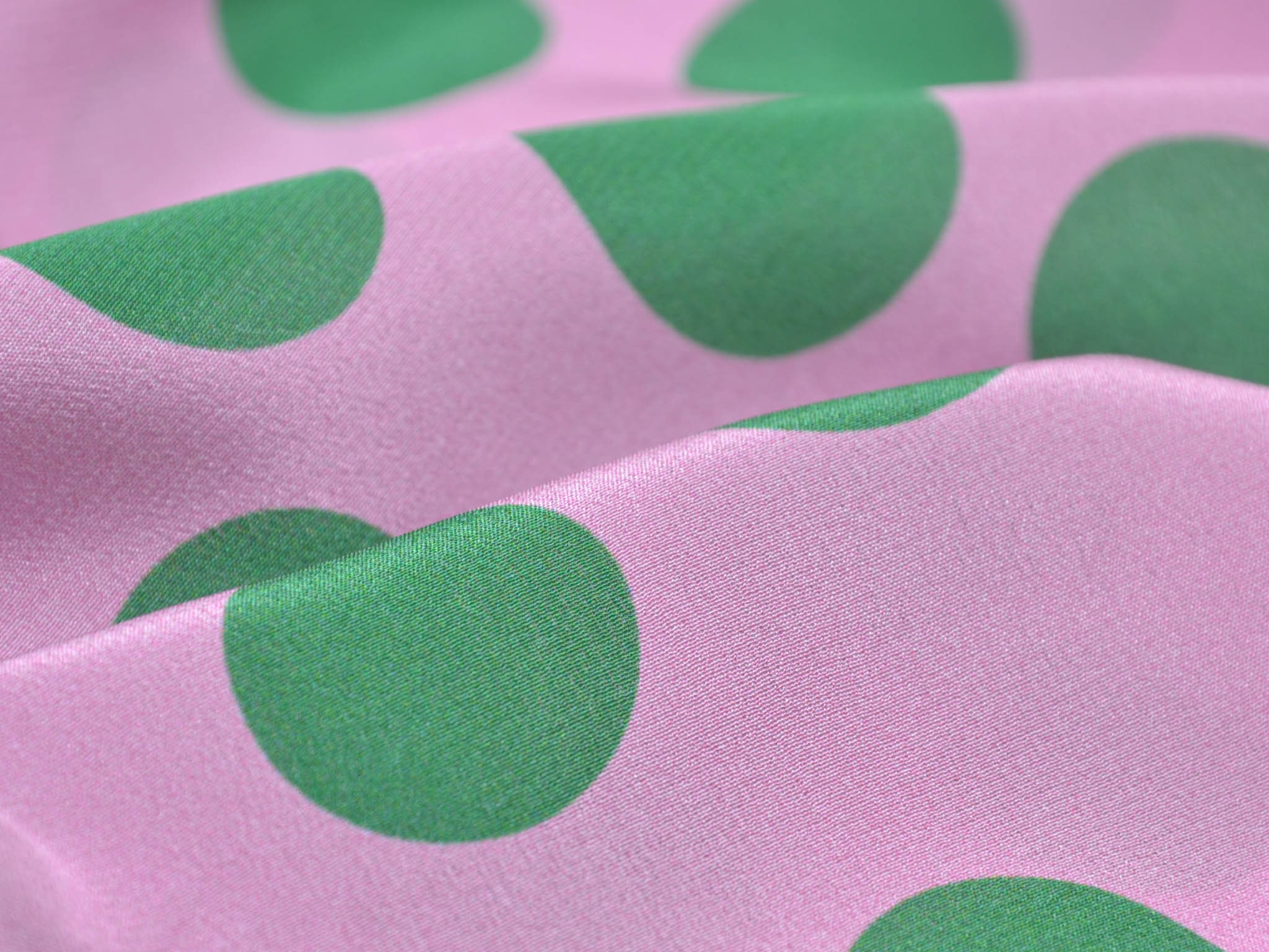 Reine Seide in rosa mit grünen Punkten. Der leichte Stoff eignet sich perfekt zum Nähen von Schals, Blusen, Kleidern und Röcken. Da der Stoff leicht transparent ist, empfehlen wir ihn zu unterfüttern.