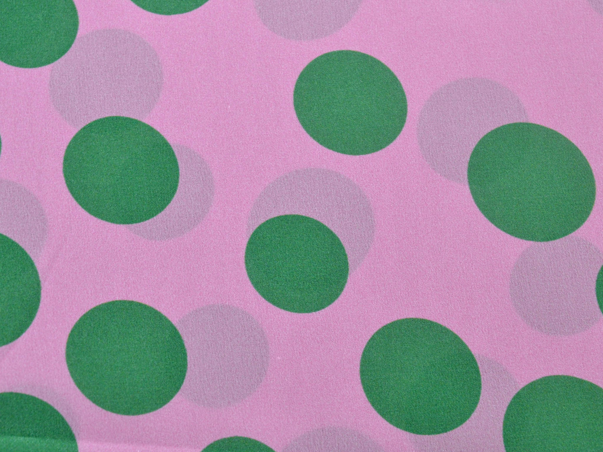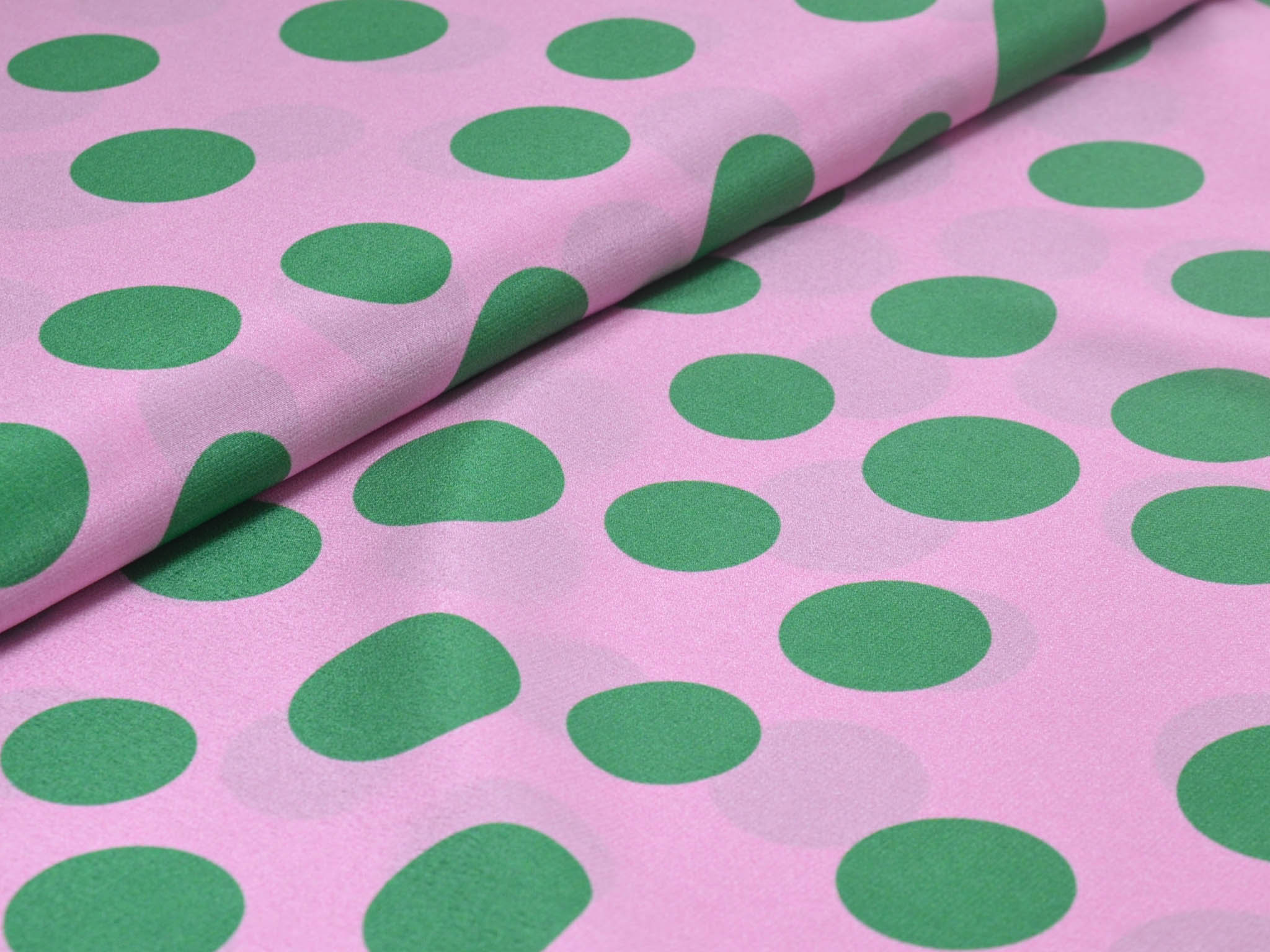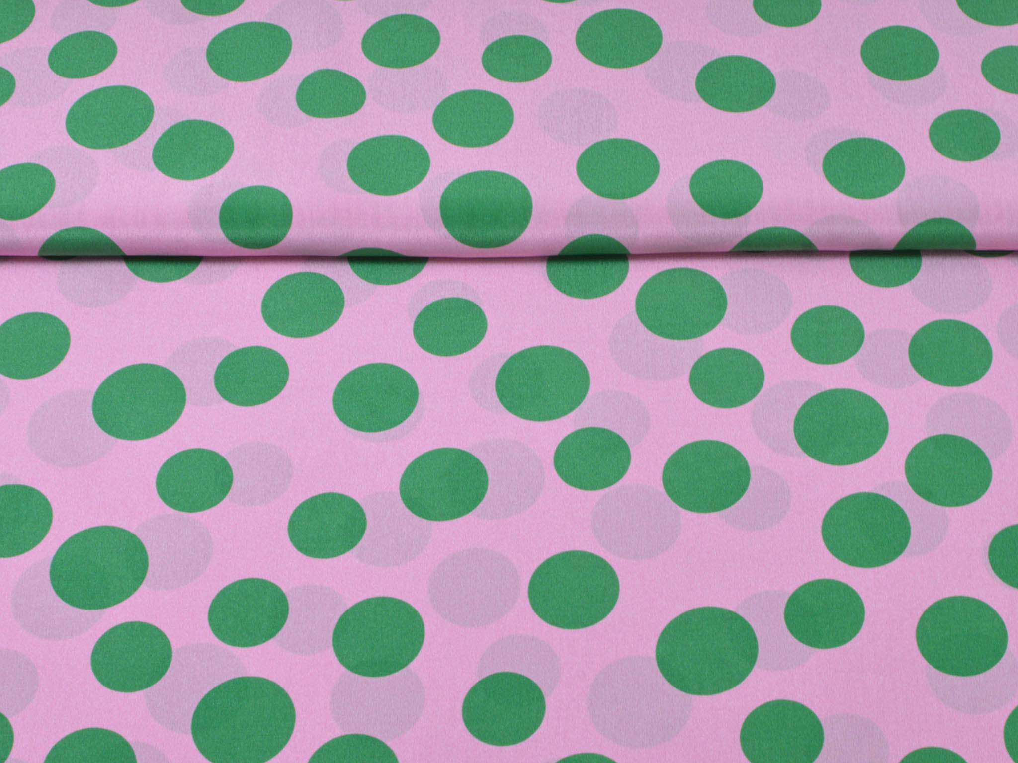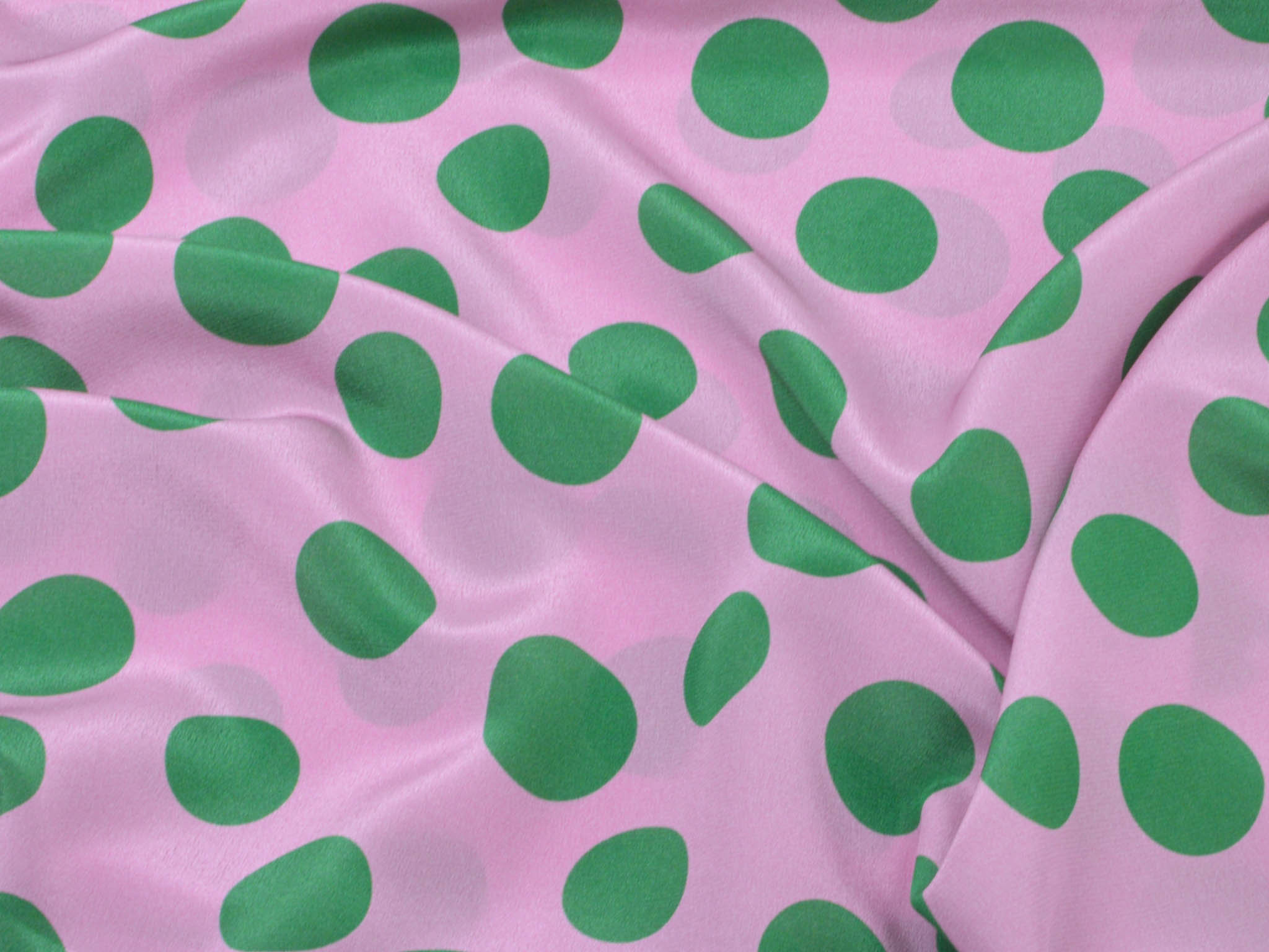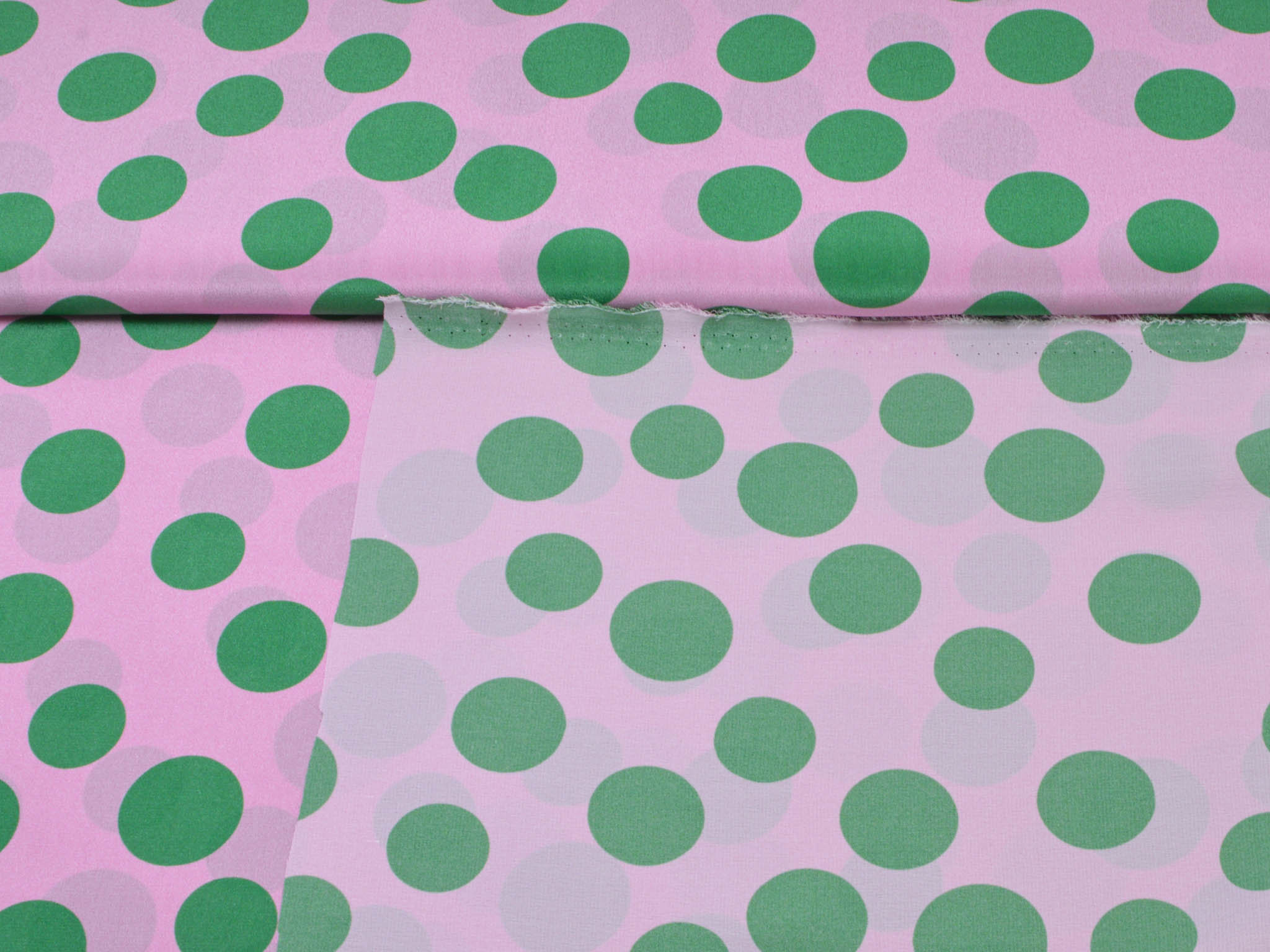 Reine Seide in rosa mit grünen Punkten. Der leichte Stoff eignet sich perfekt zum Nähen von Schals, Blusen, Kleidern und Röcken. Da der Stoff leicht transparent ist, empfehlen wir ihn zu unterfüttern.