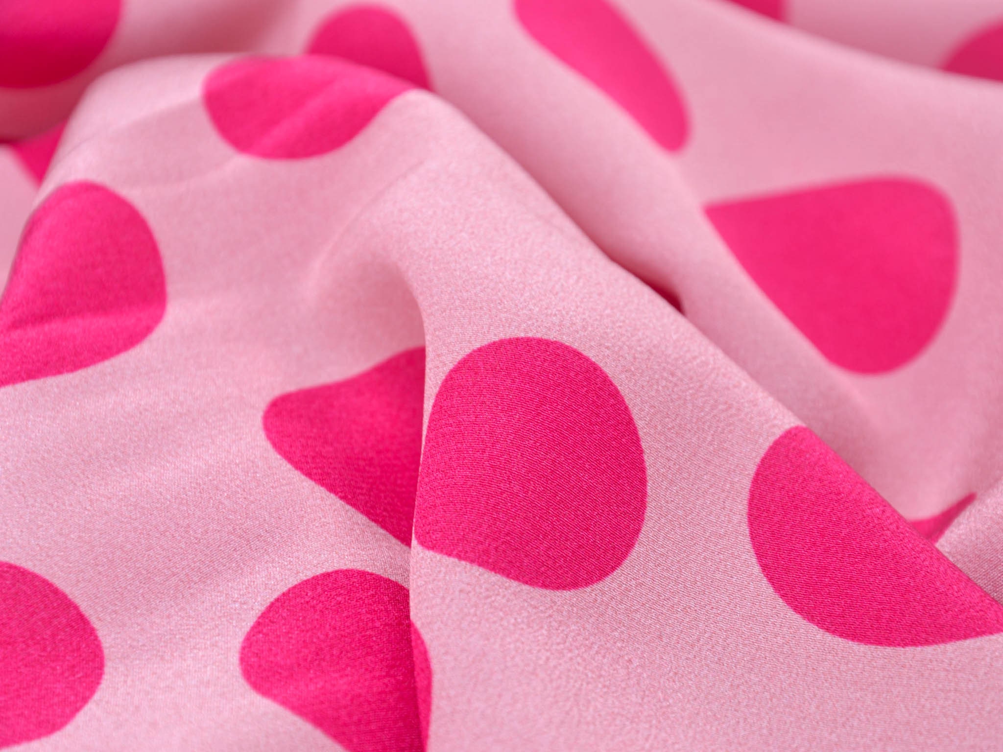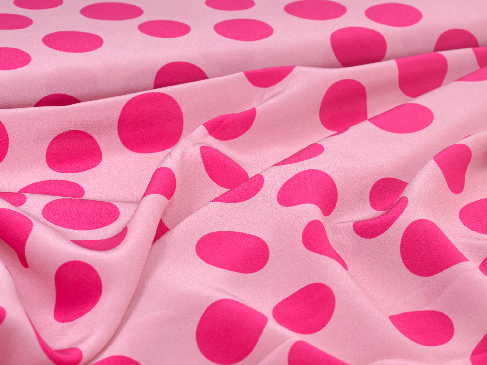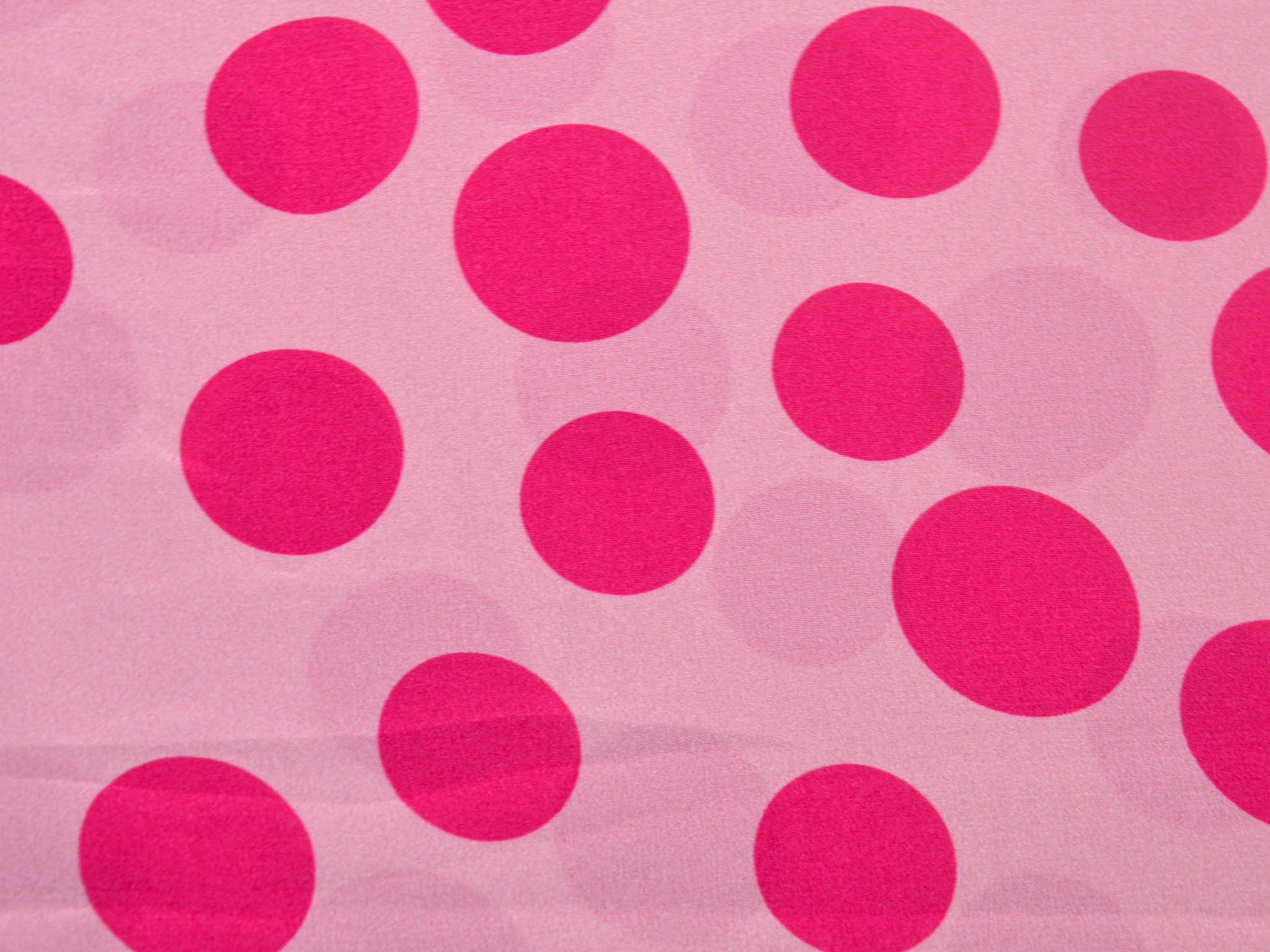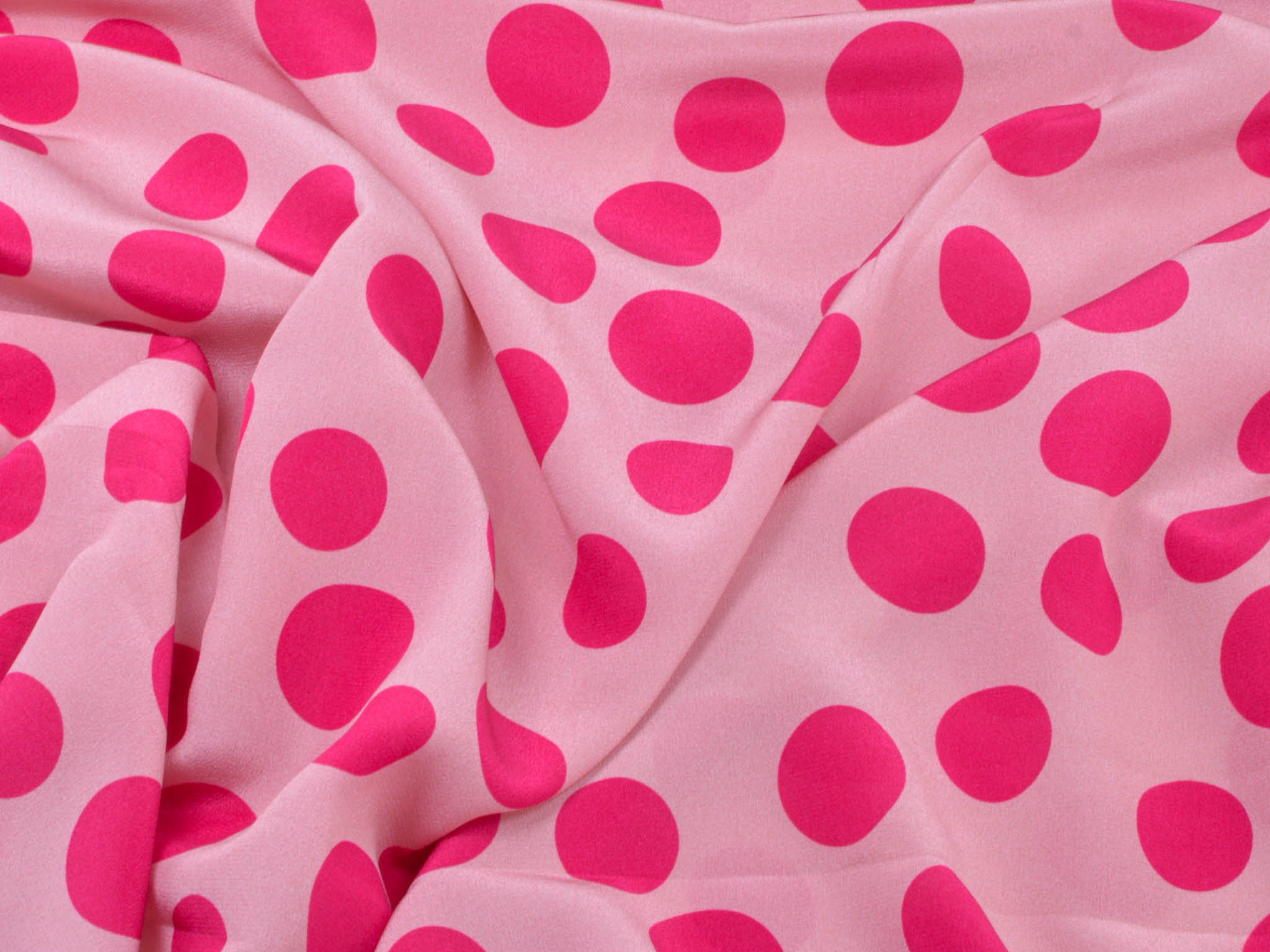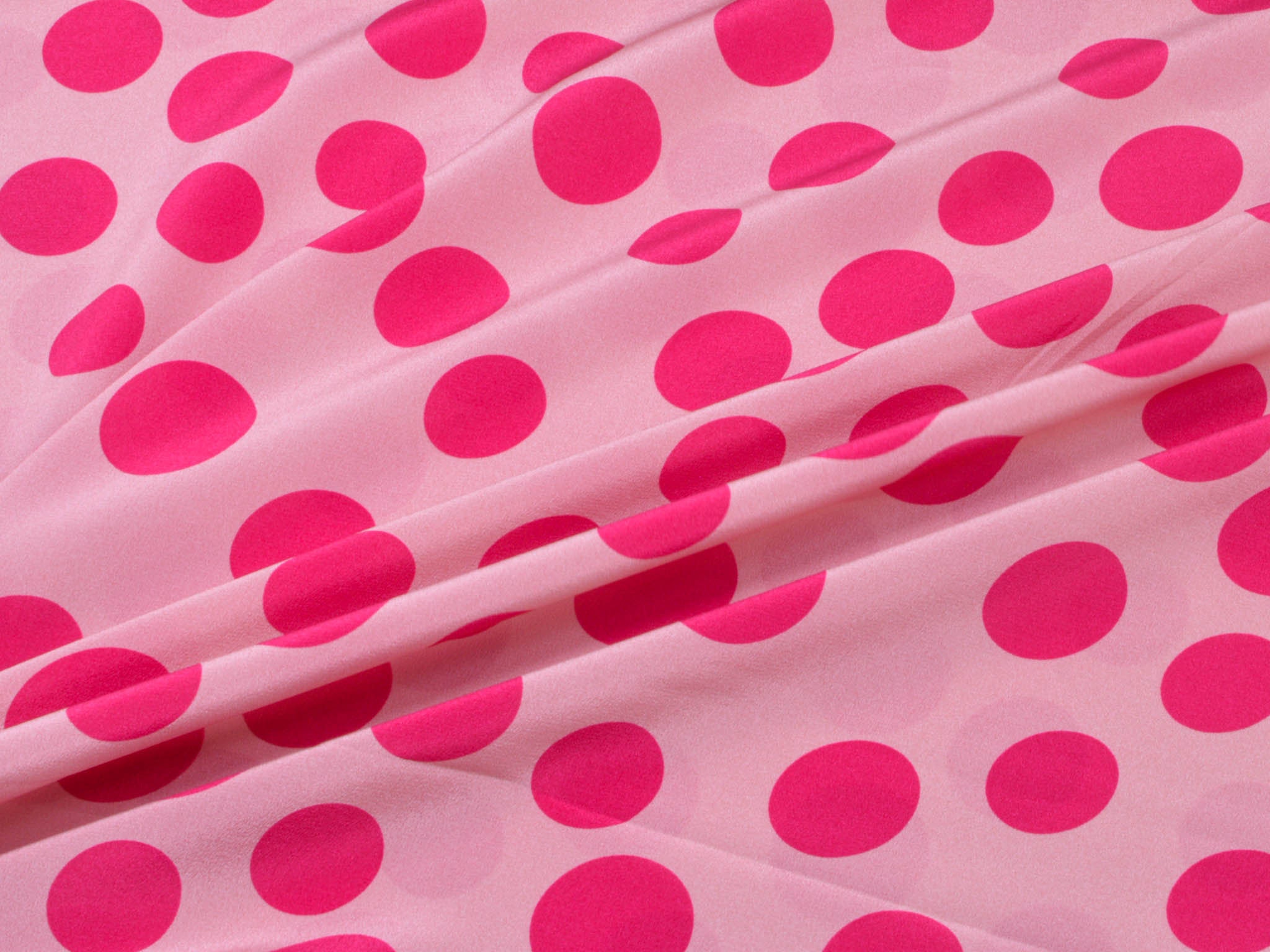 Pure silk in pink with pink dots. This lightweight fabric is perfect for sewing scarves, blouses, dresses, and skirts. Because the fabric is slightly transparent, we recommend lining it.