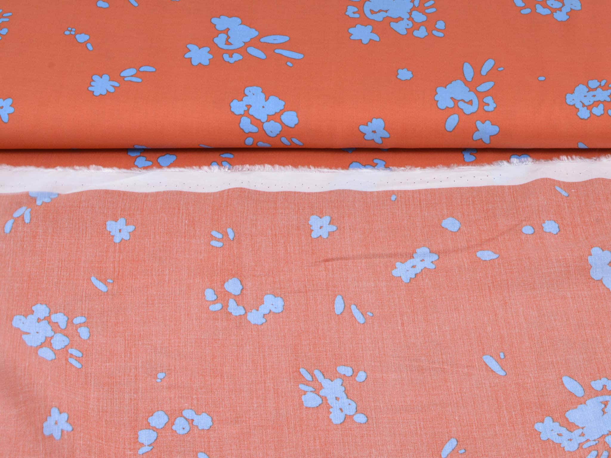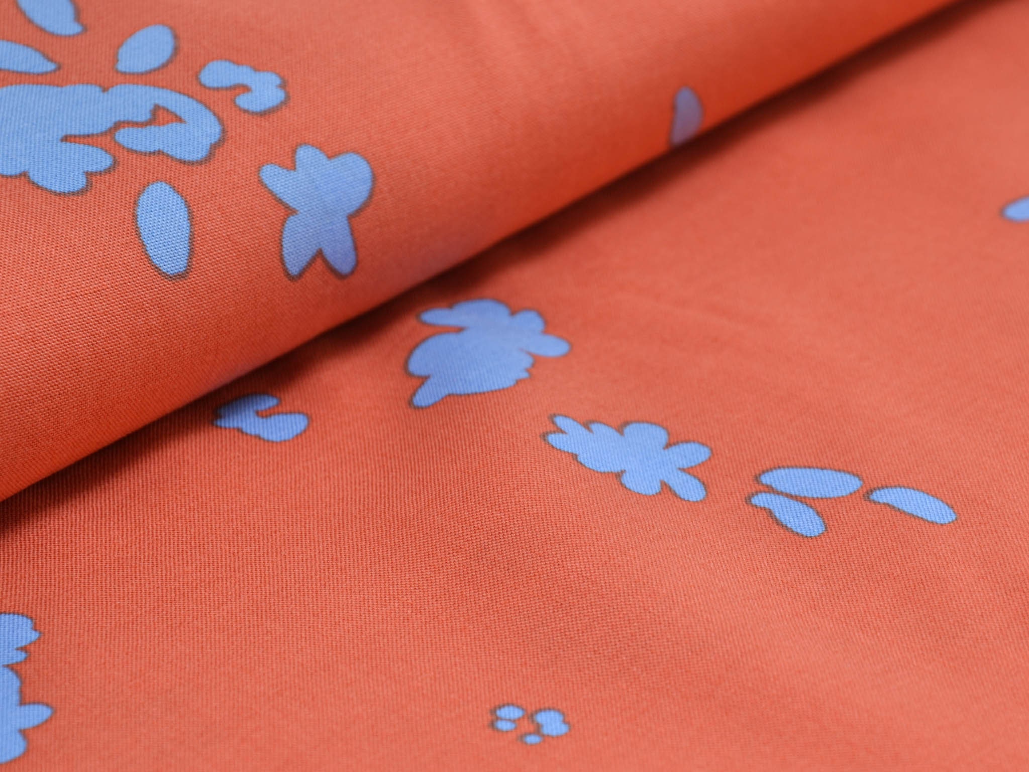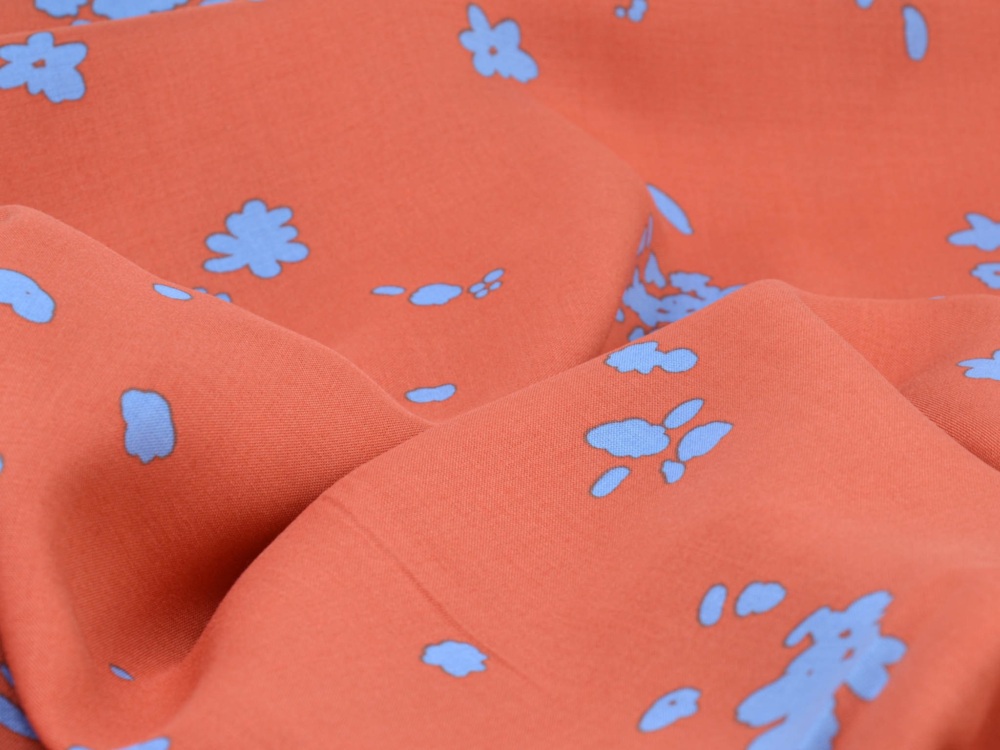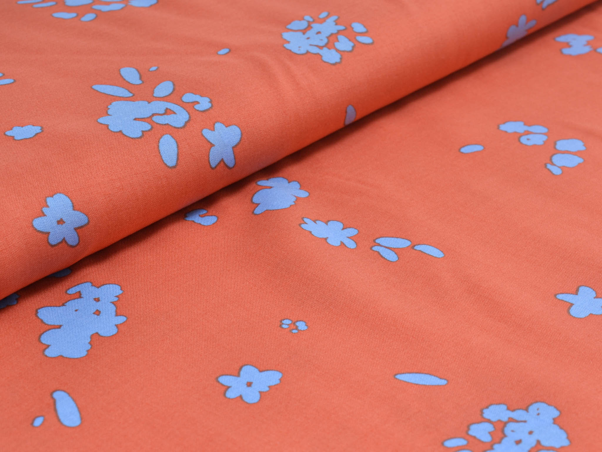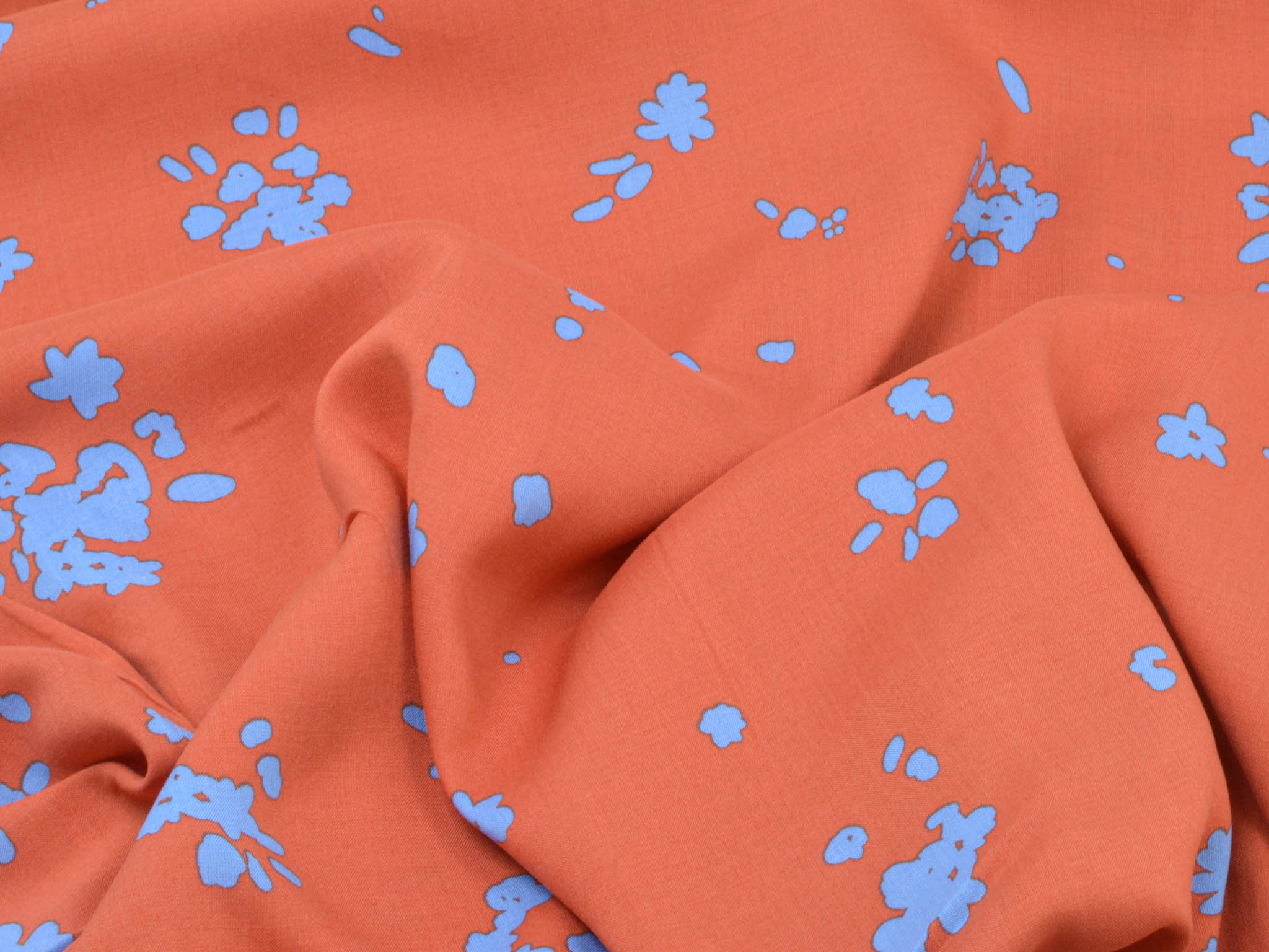 Blusen- und Kleiderstoff aus Viskose von Fibre Mood. Der orangene Stoff hat blaue Blumen und passt perfekt zum Modell Ruba aus der Fibre Mood 23.