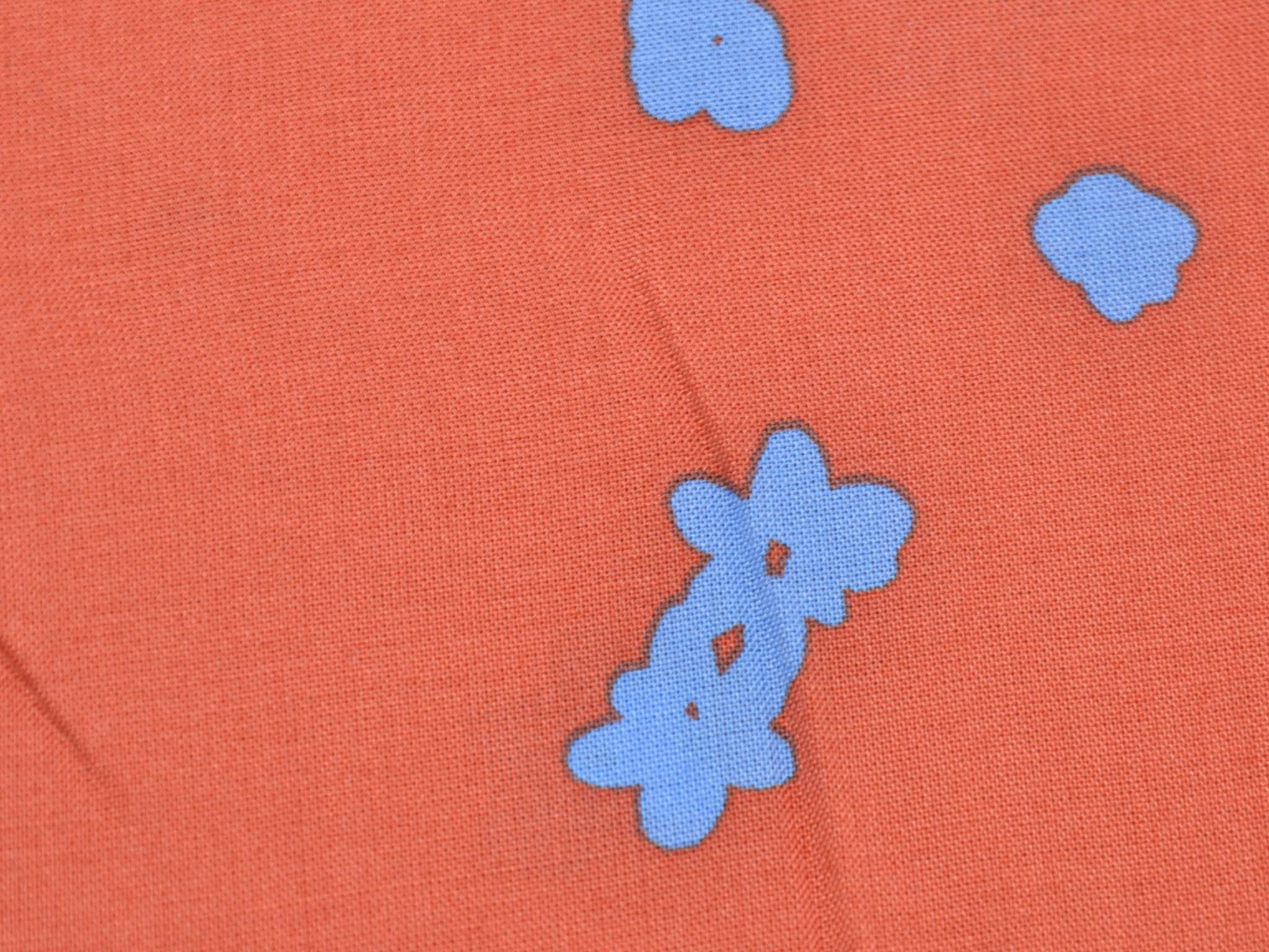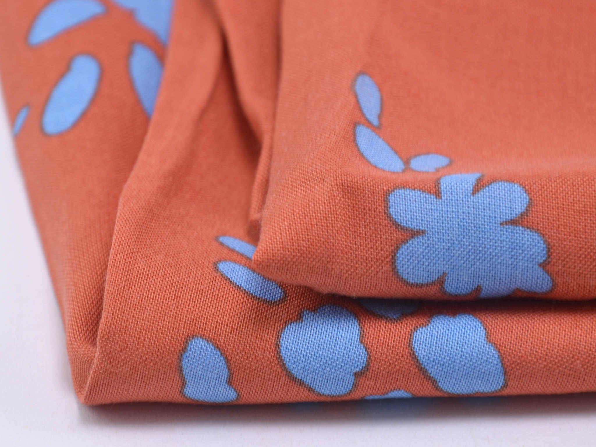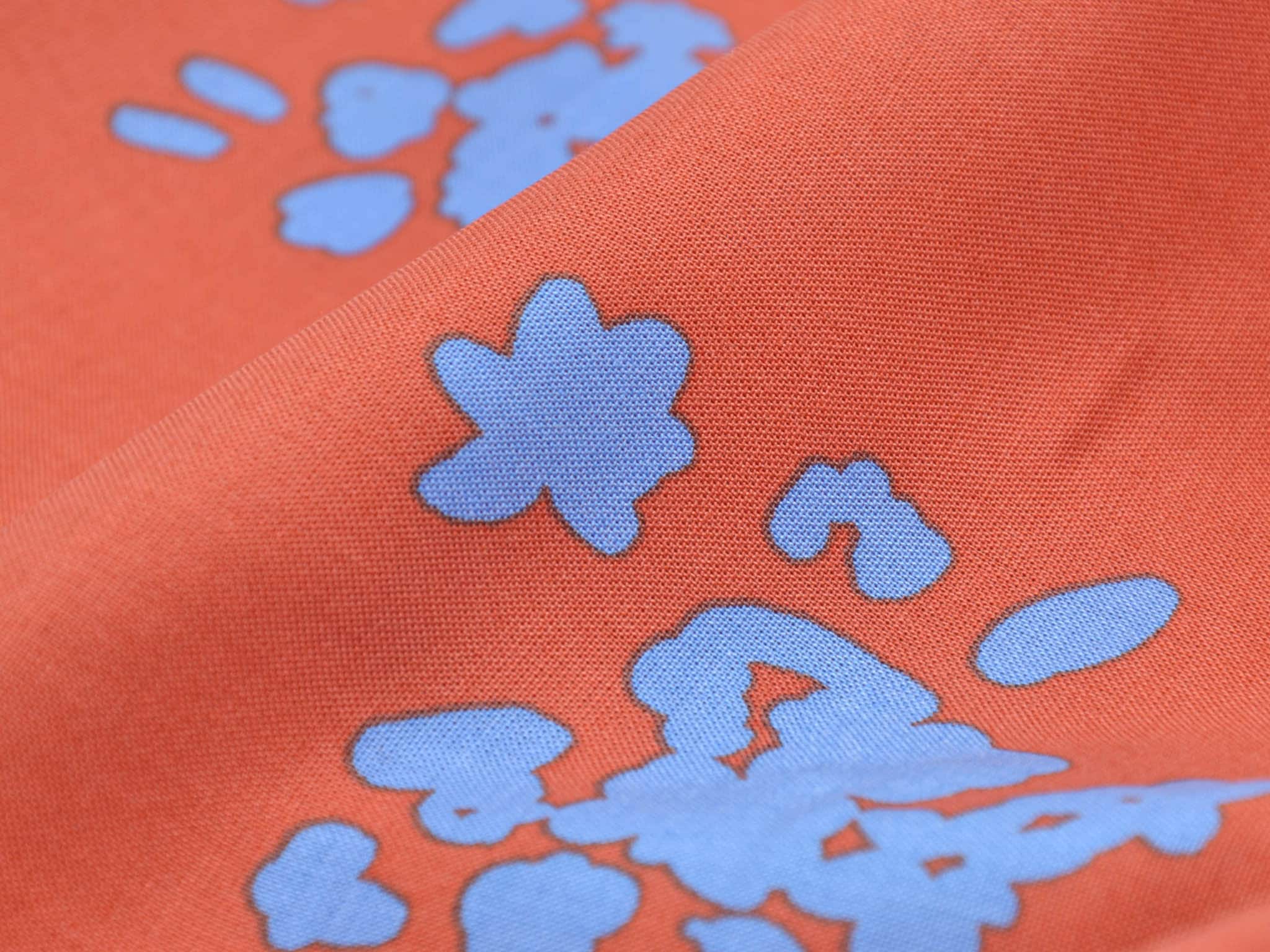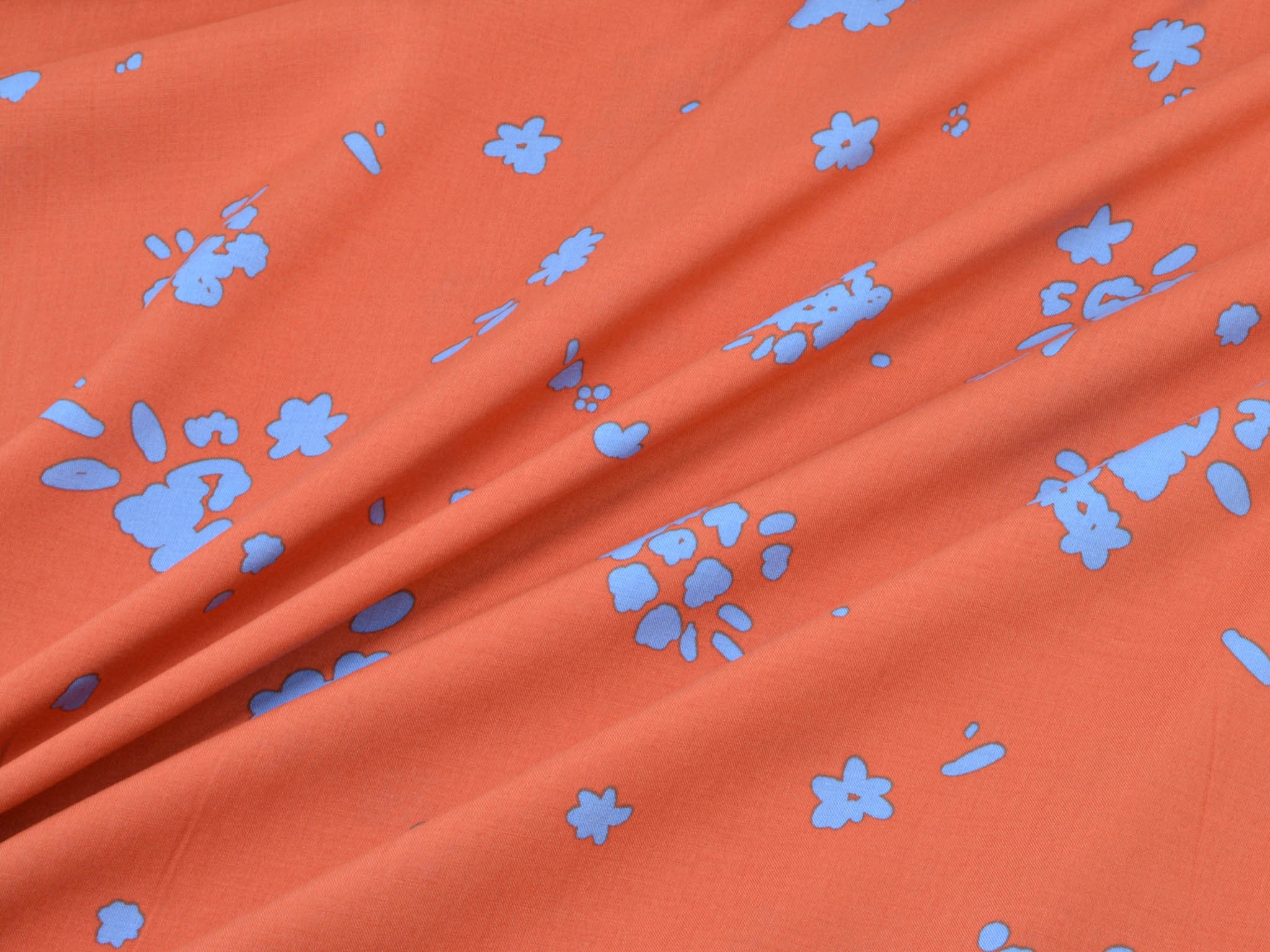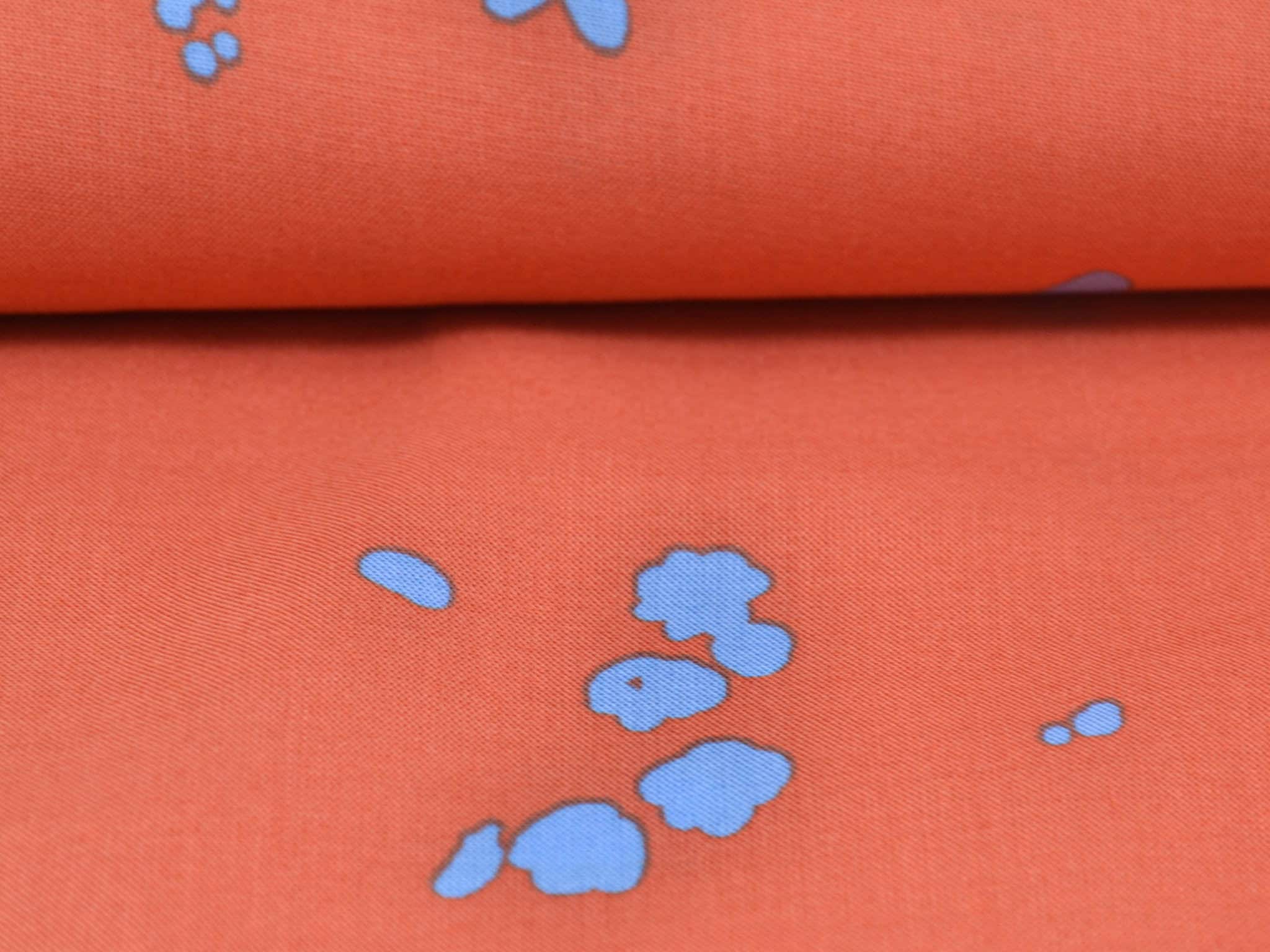 Blusen- und Kleiderstoff aus Viskose von Fibre Mood. Der orangene Stoff hat blaue Blumen und passt perfekt zum Modell Ruba aus der Fibre Mood 23.