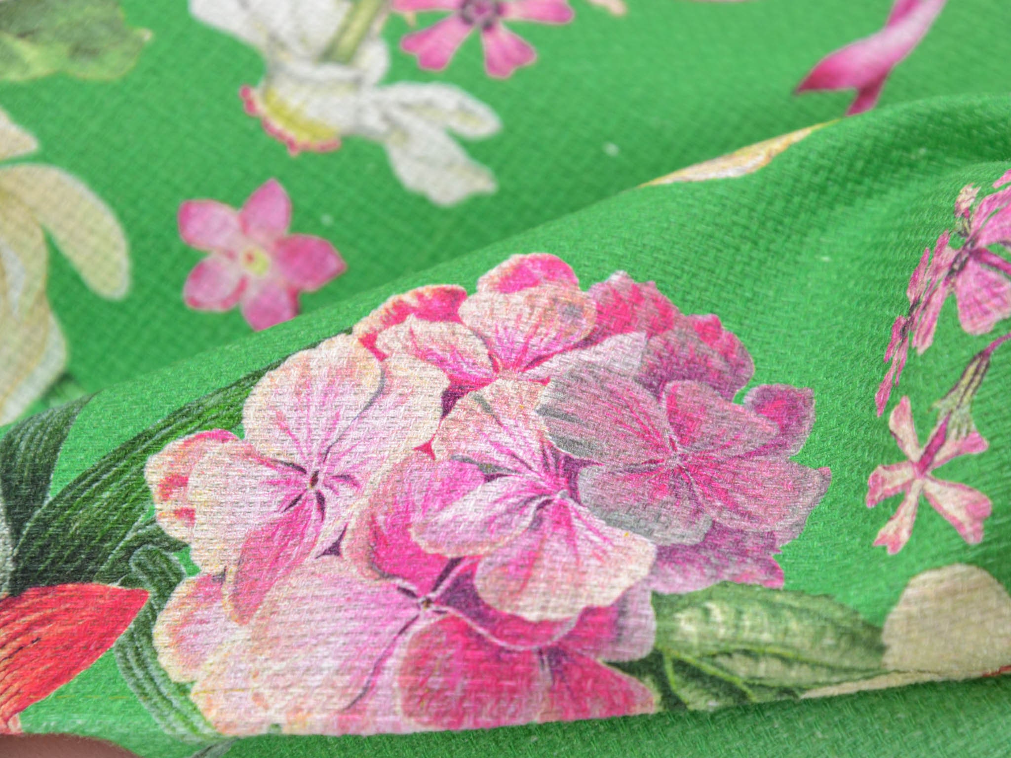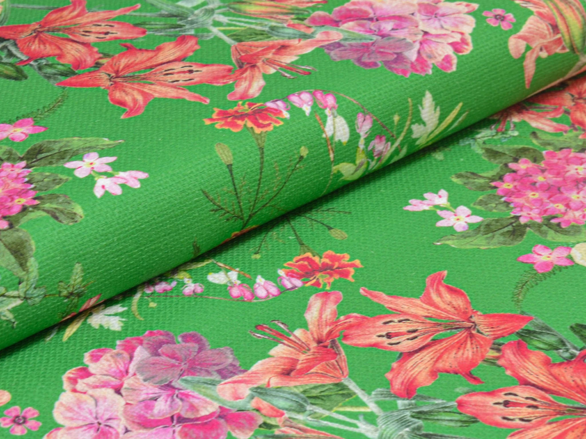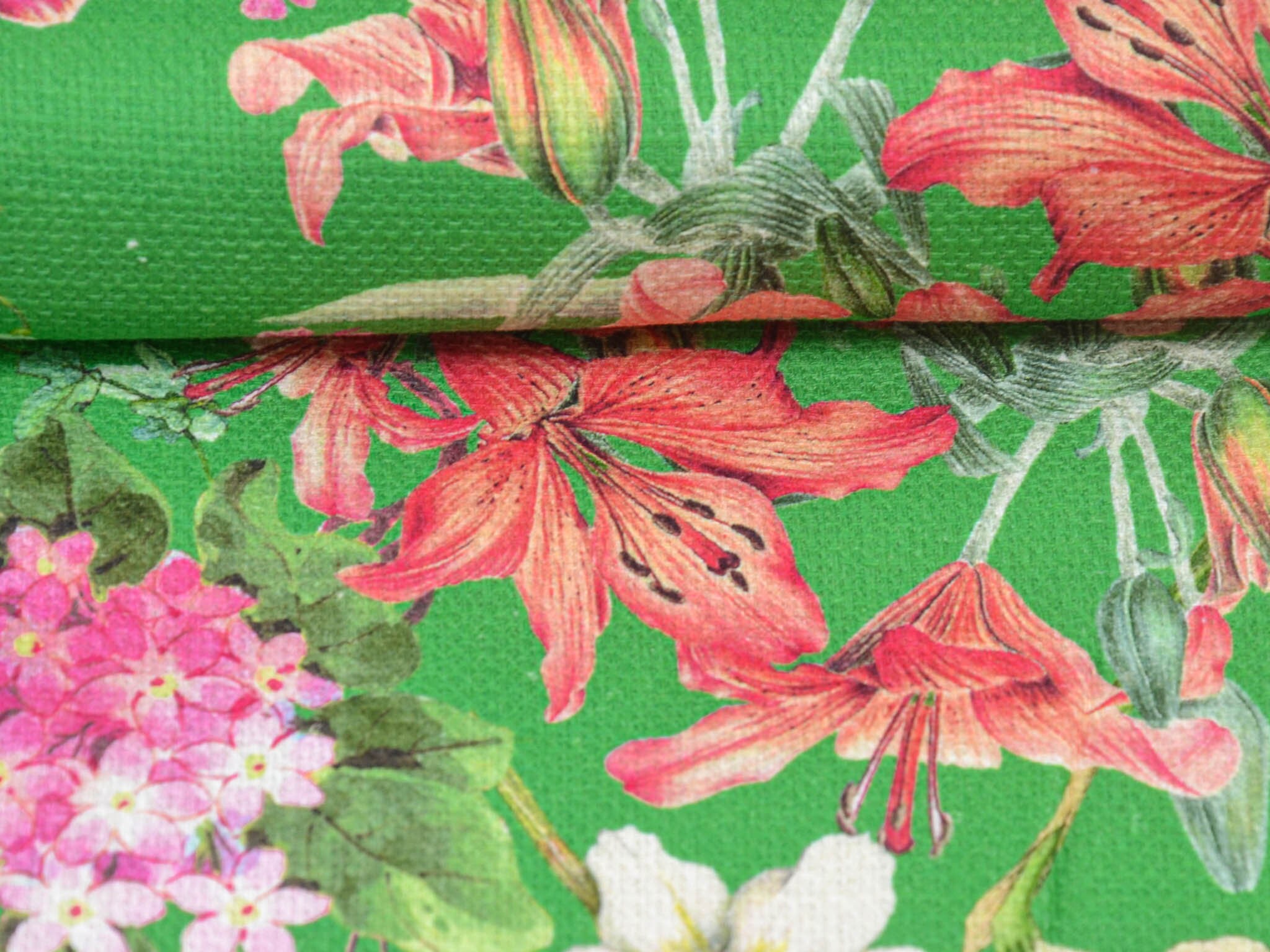 Hochwertiger Leinenstoff aus Italien. Der grüne Stoff zeigt große Blumen in pink, rosa, weiß. Geeignet für Röcke, Kleider, Hosen, Jacken und vieles mehr.